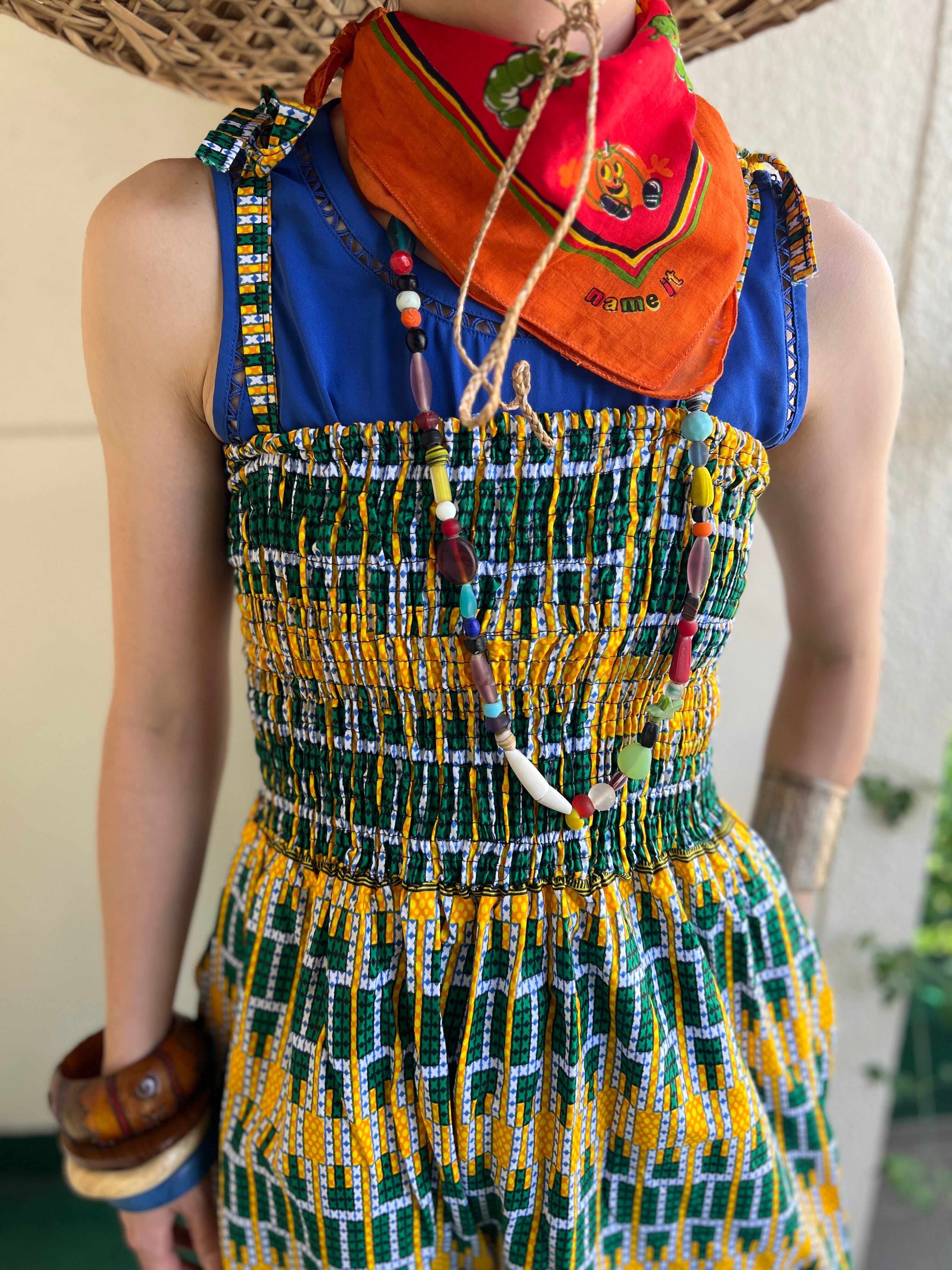 裾がゴムで肩が紐で調節可能な、幅広い背丈の方が着用可能なフリーサイズです。