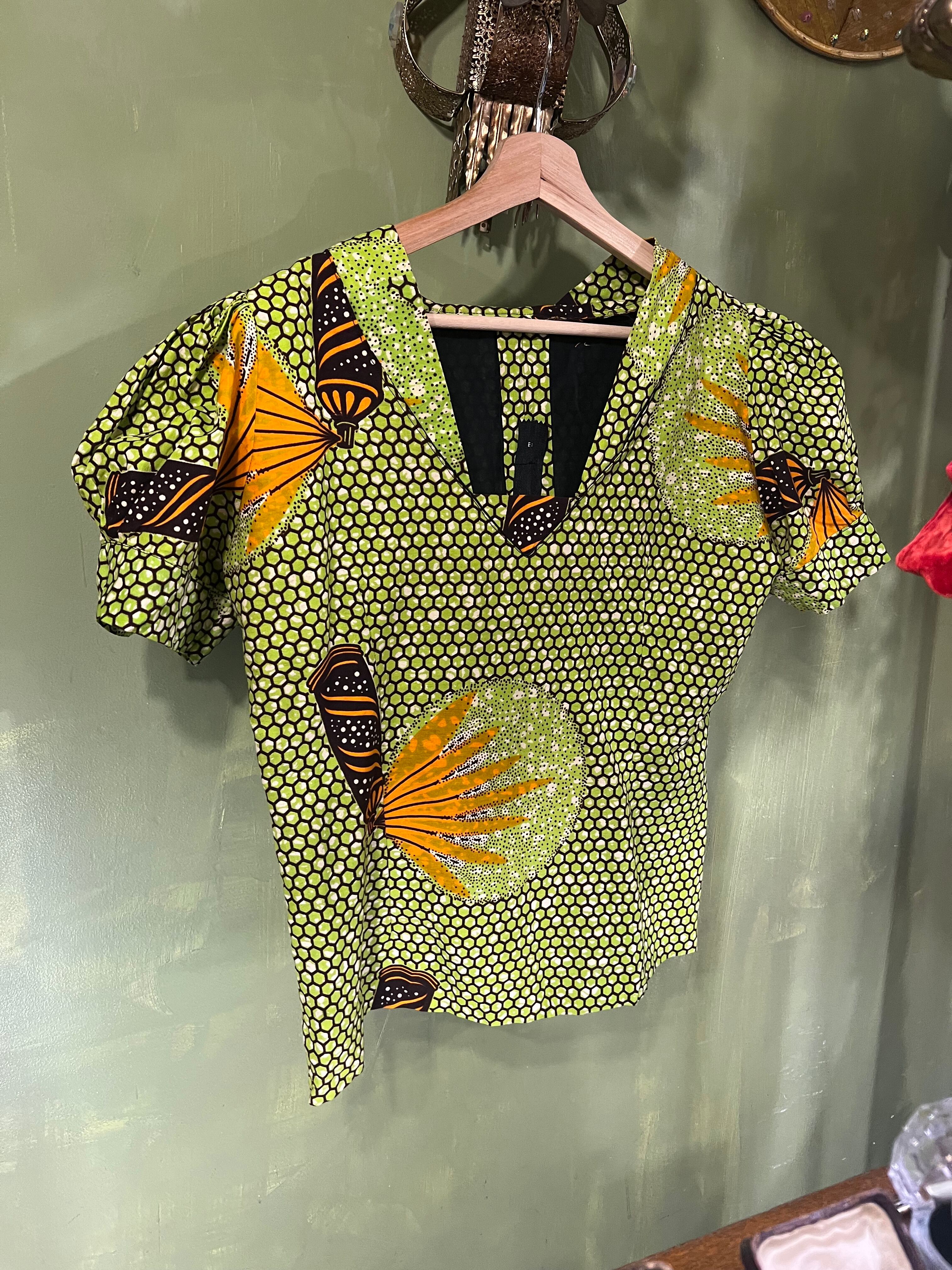 ヴィンテージ アフリカンバティック 黄緑 スプレー柄 コットントップスになります。
