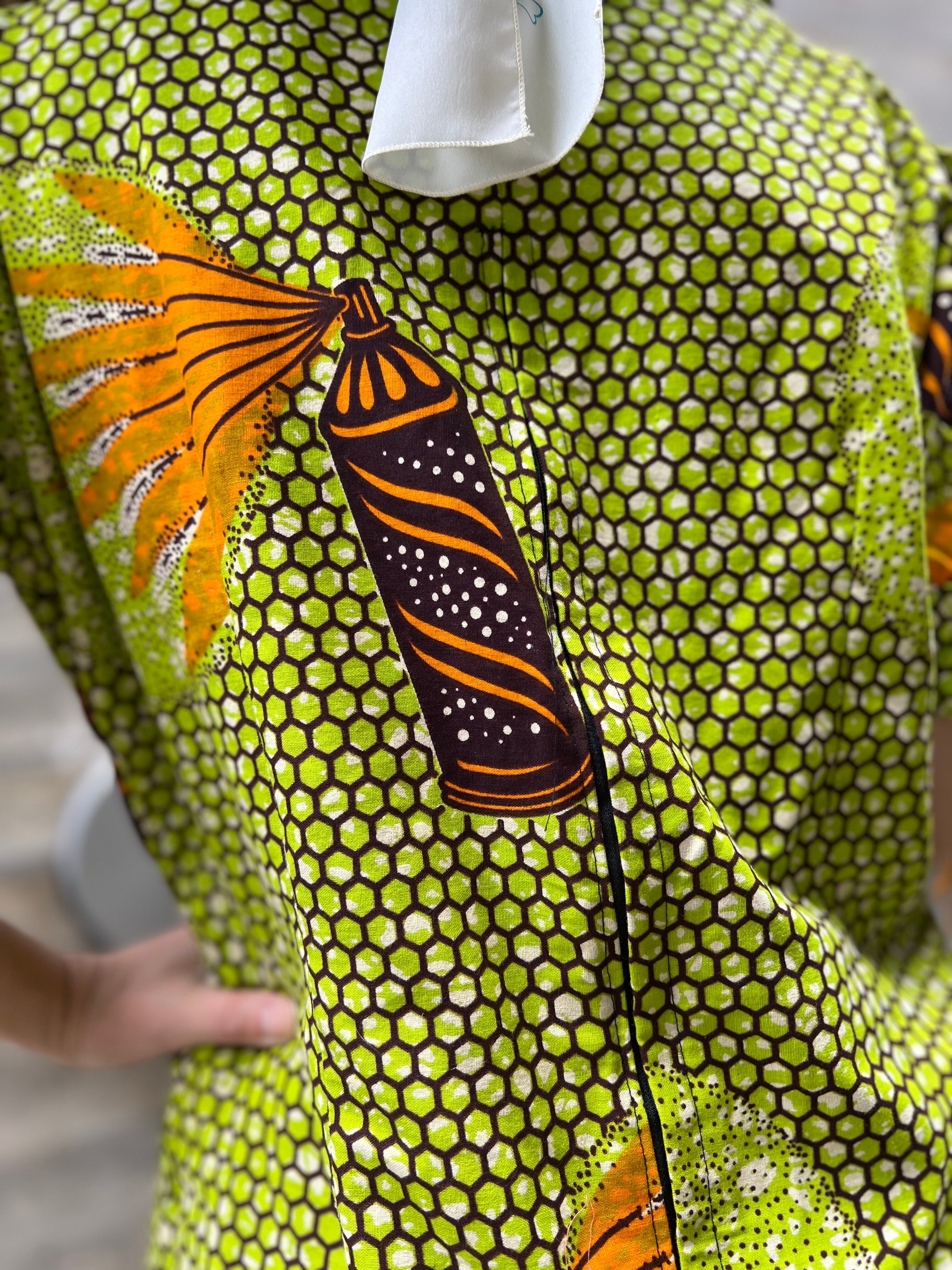 アフリカンでは珍しい発色の鮮やかな黄緑色の色使い。ブラウン、オレンジ、ホワイトの配色の