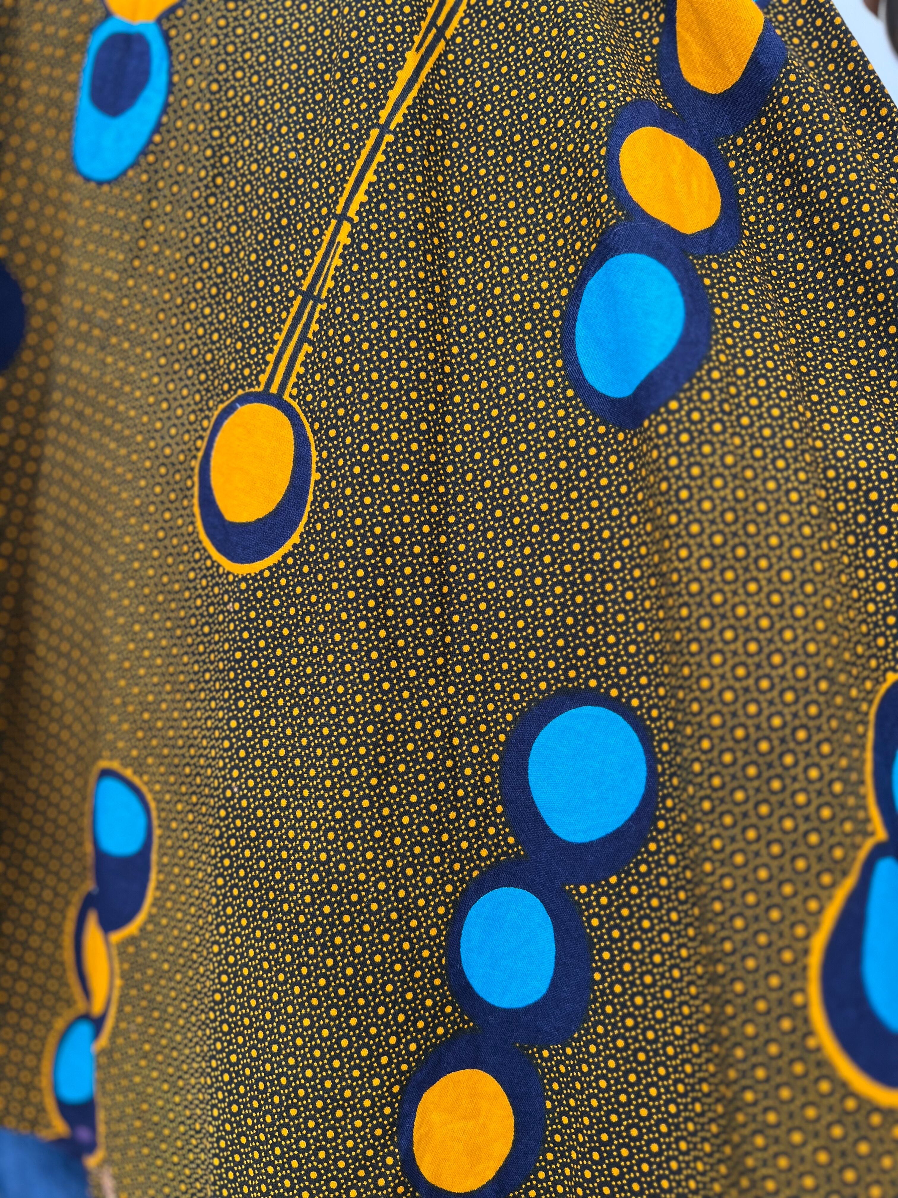 マスタードの細かな柄に発色のよいターコイズやネイビー、マスタードイエローのモダン柄。
