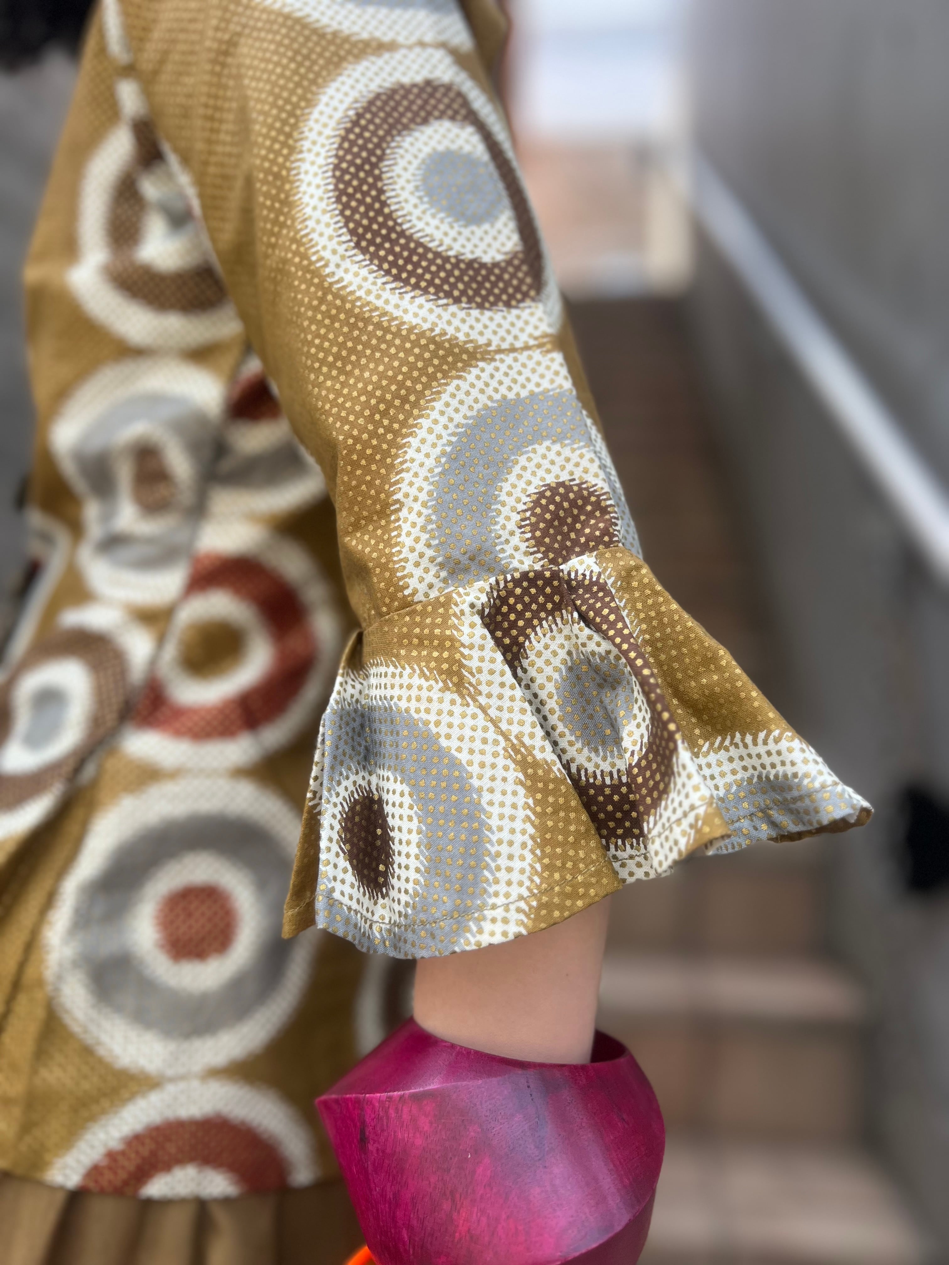アフリカンバティックのゴールドトップスになります。(黄土色のような色味です。)