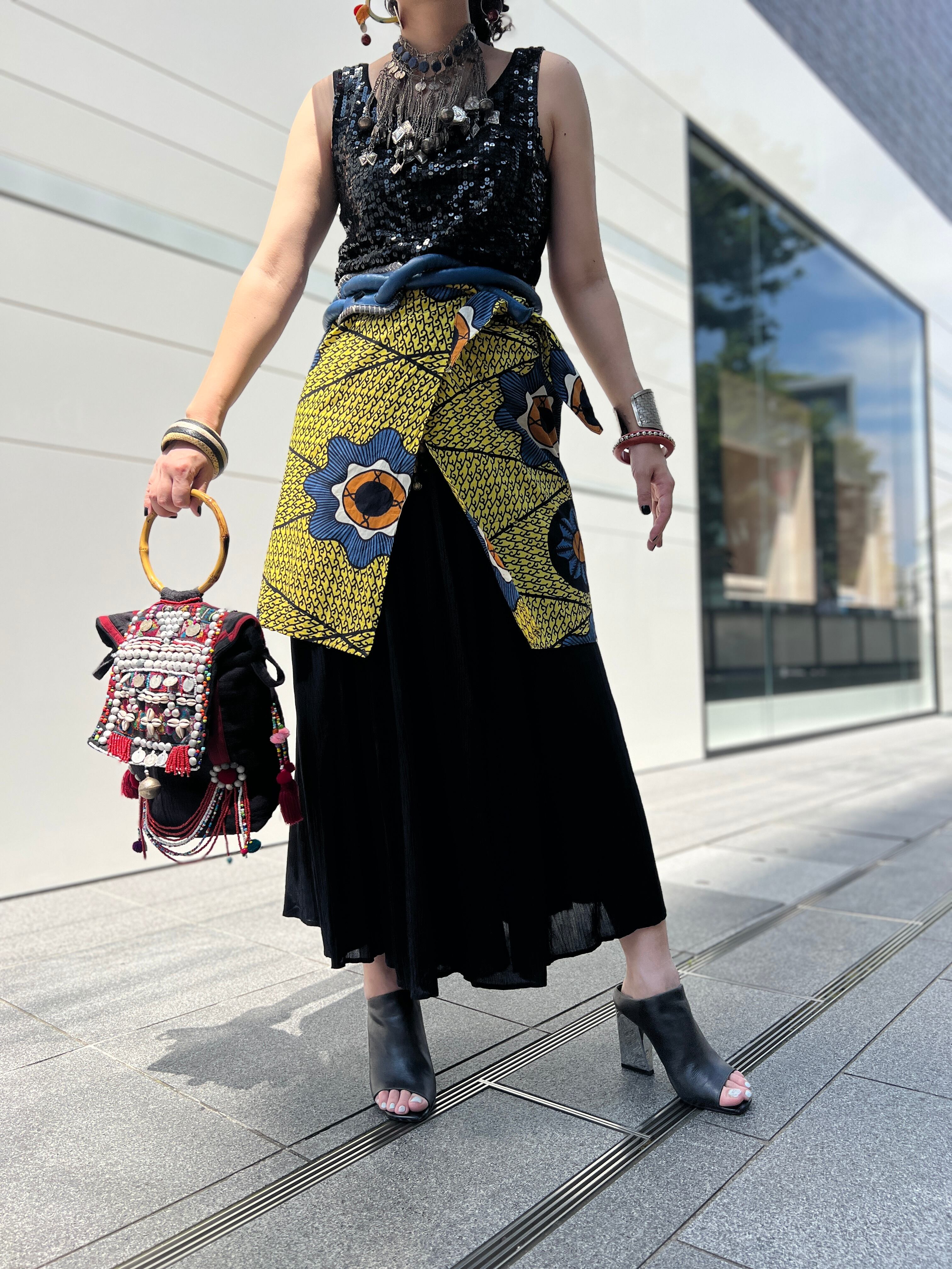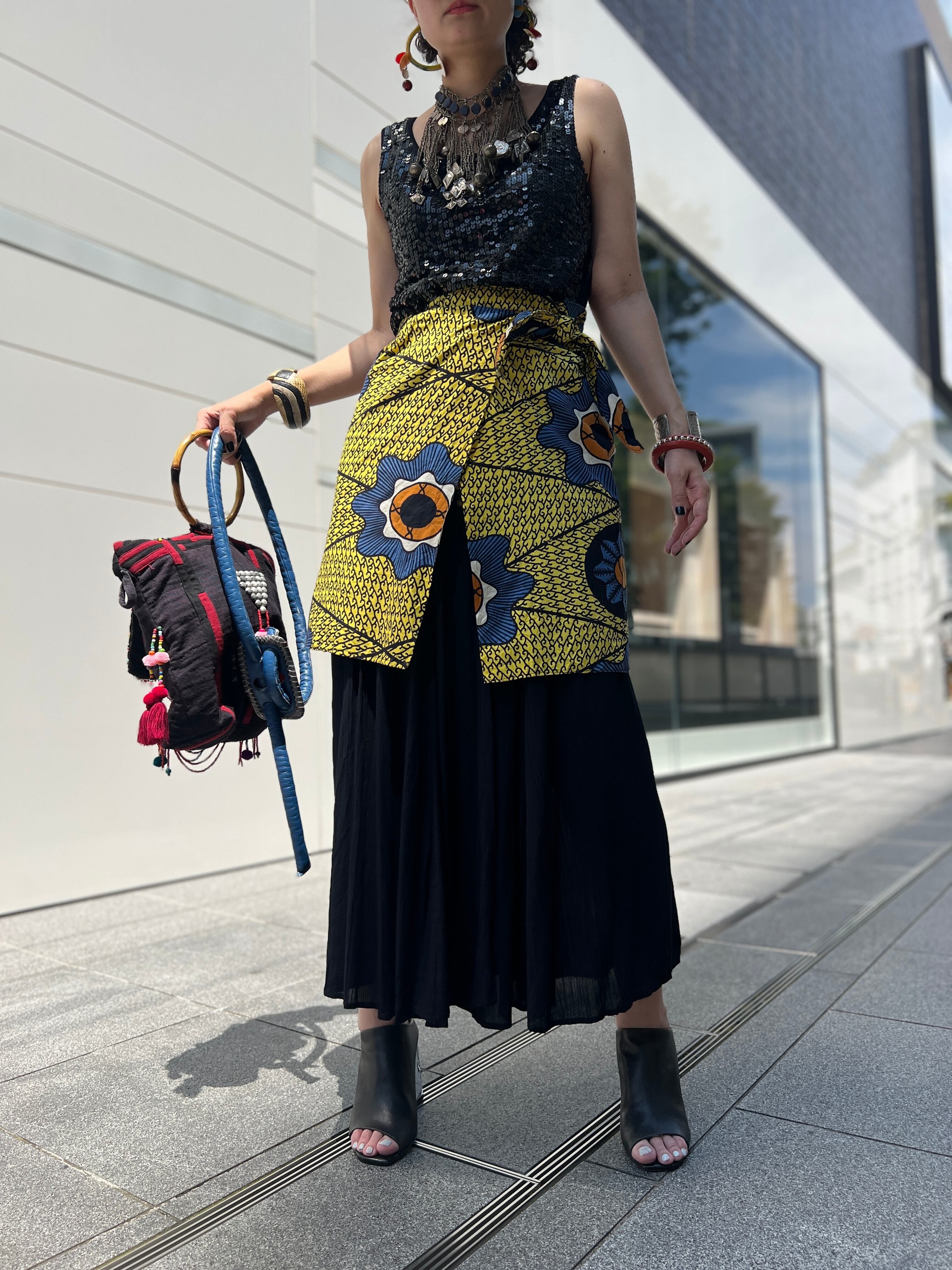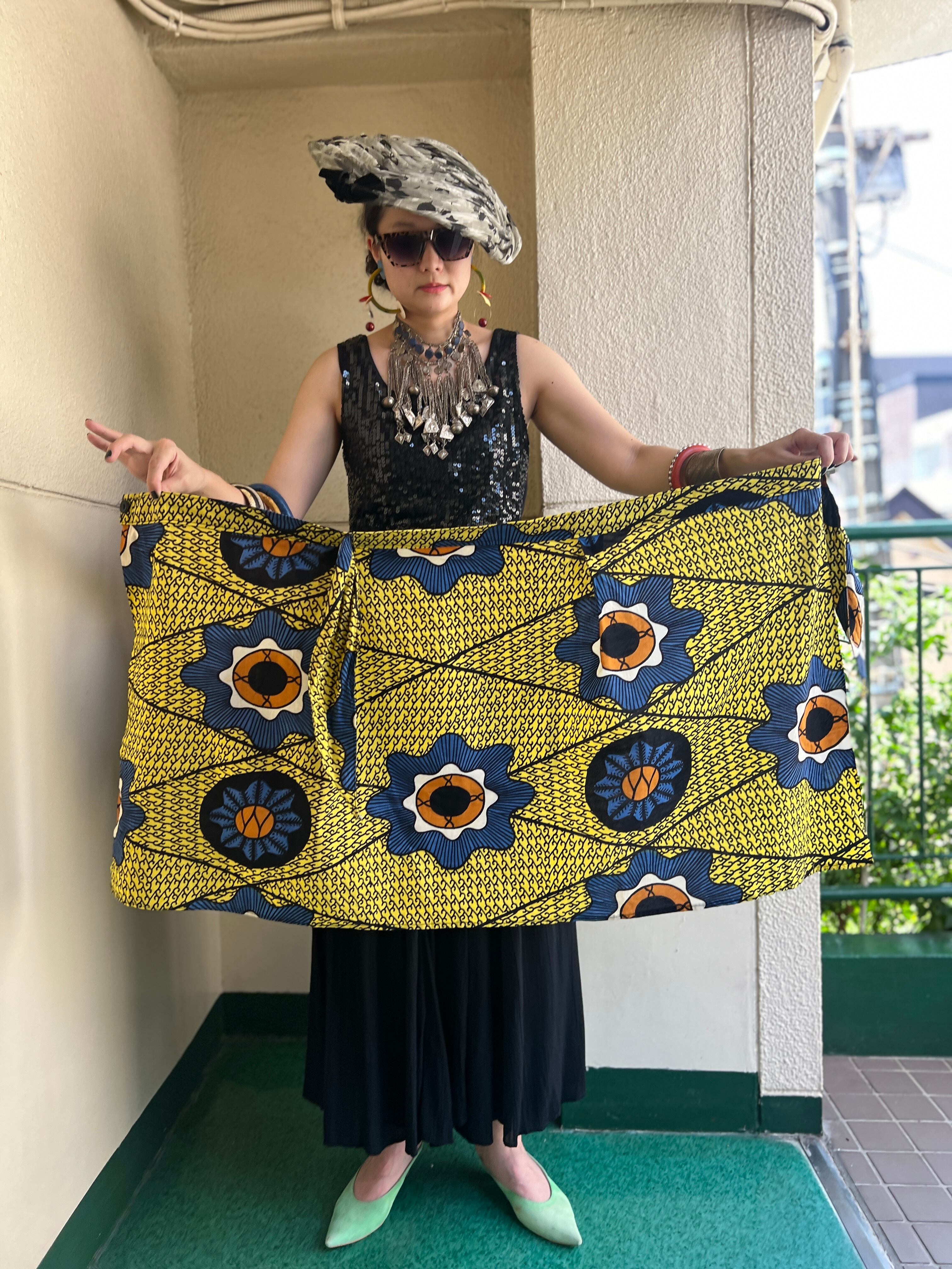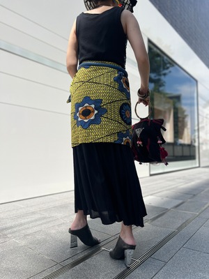 着画のように、ボタンを使わずラップスカートのようにウエストで紐を結んでフリーサイズで着用できます