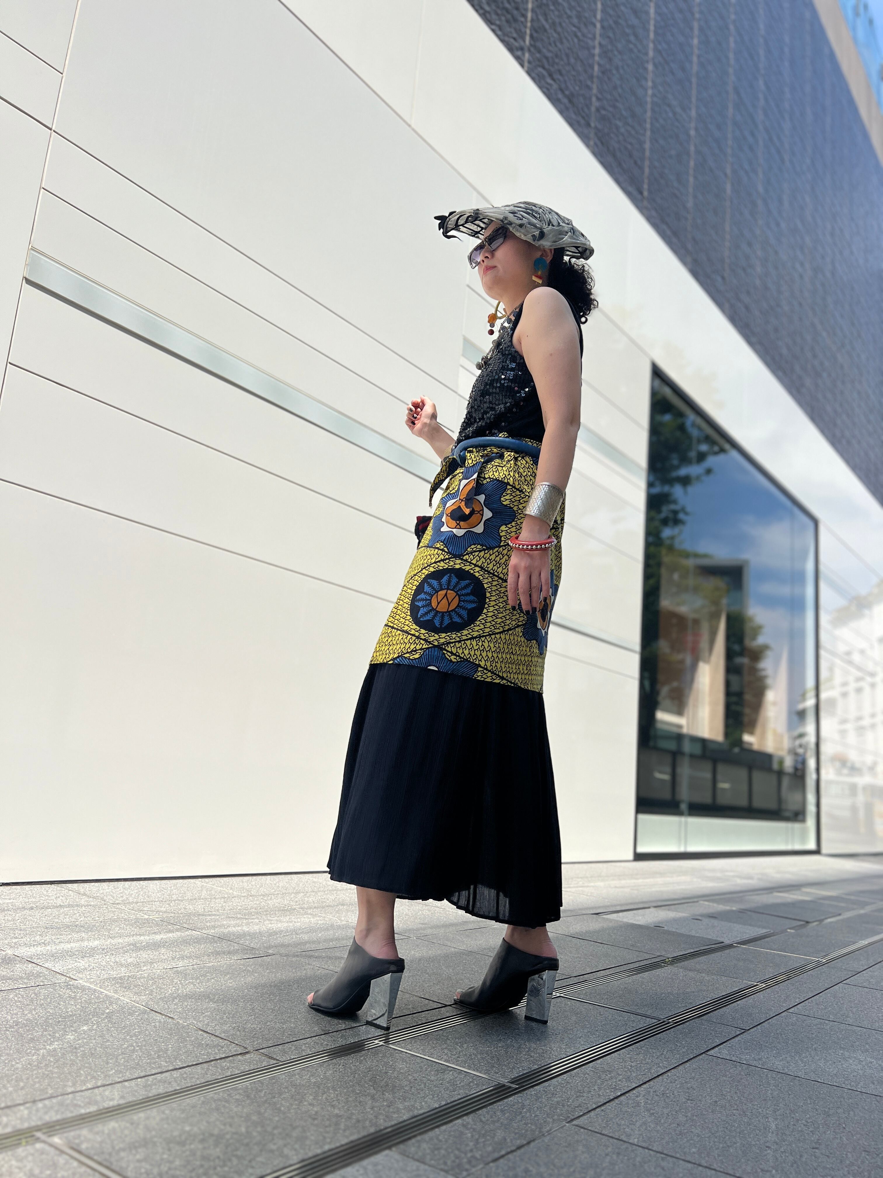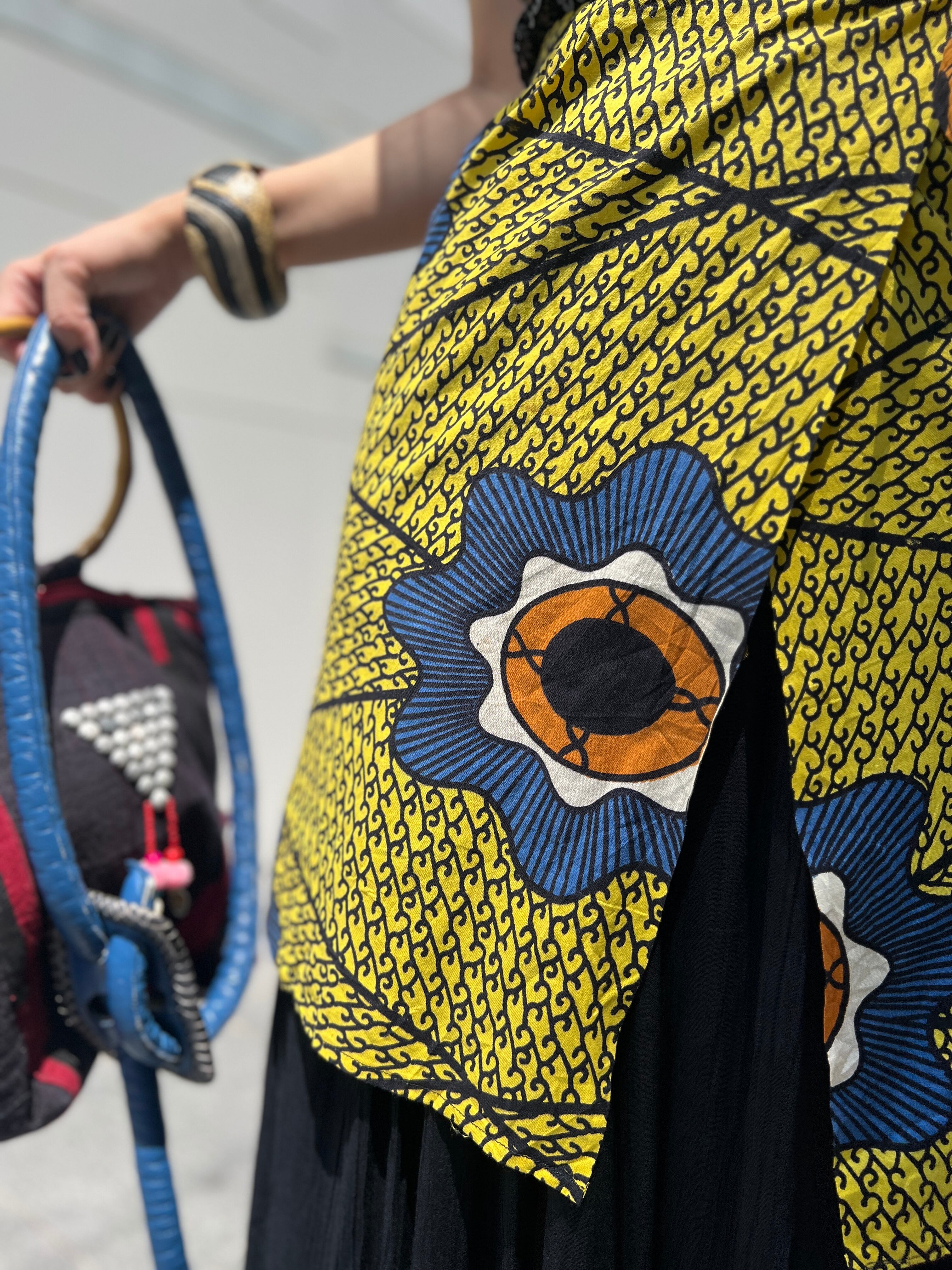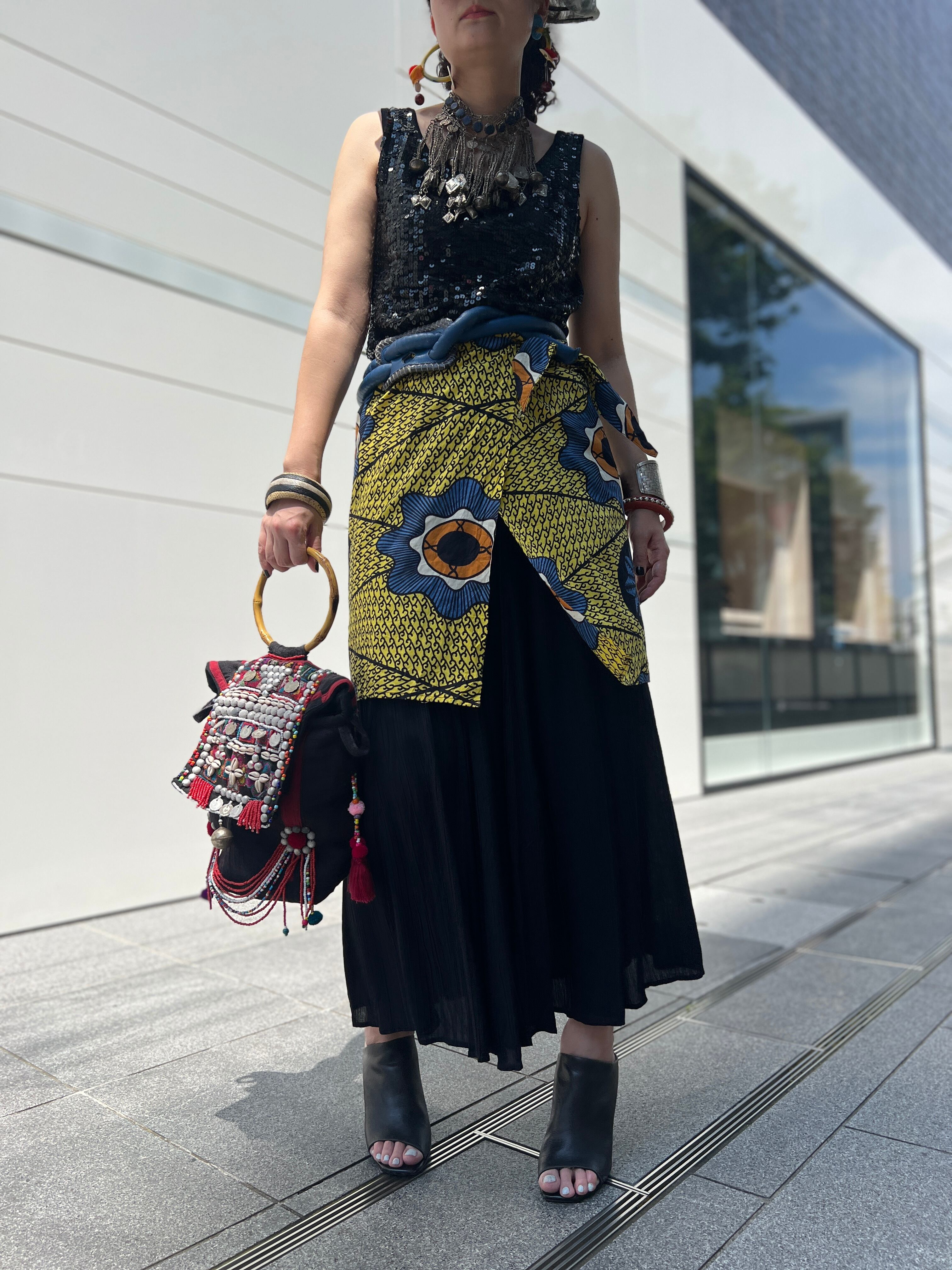 着画のように、ボタンを使わずラップスカートのようにウエストで紐を結んでフリーサイズで着用できます