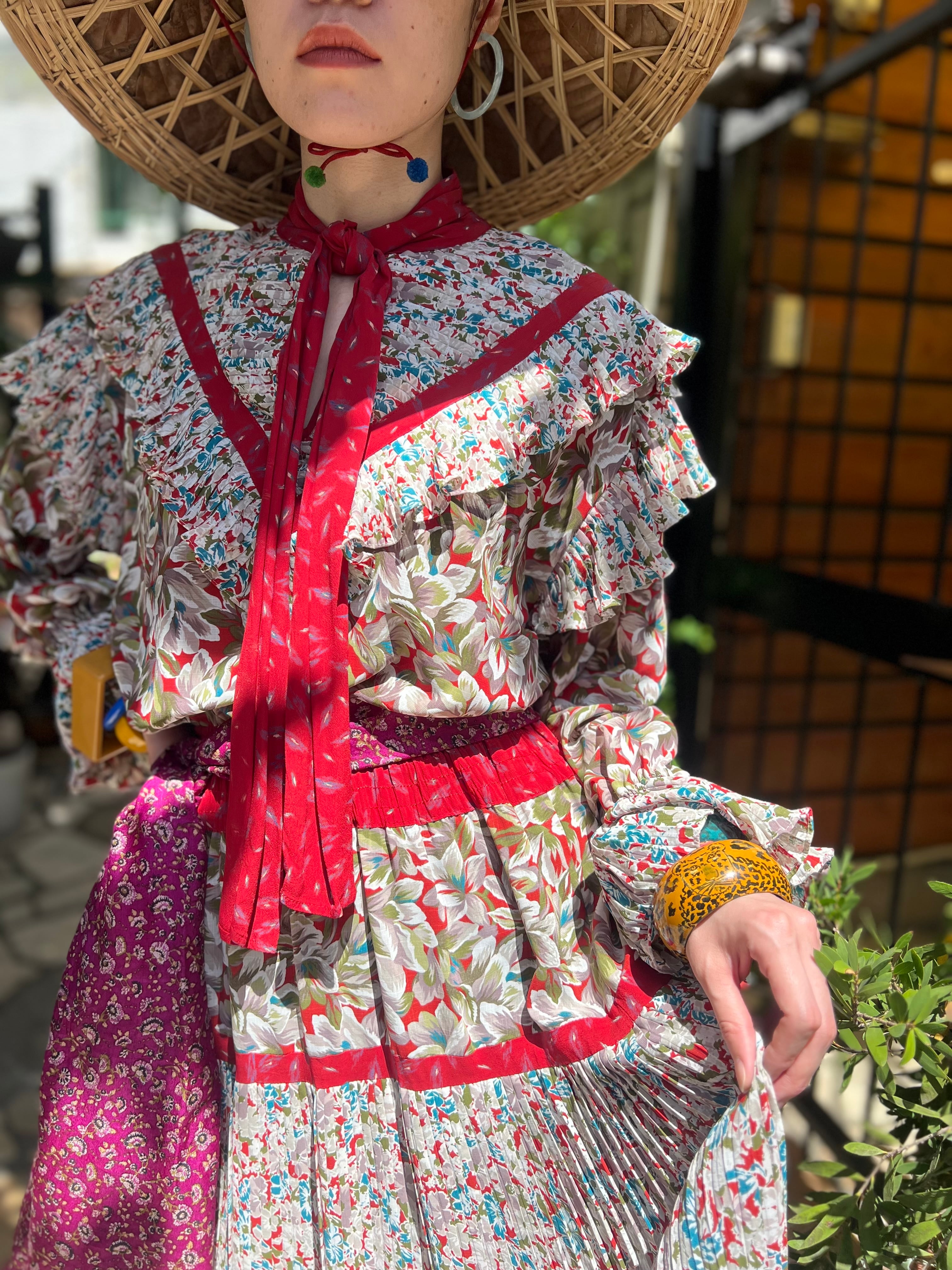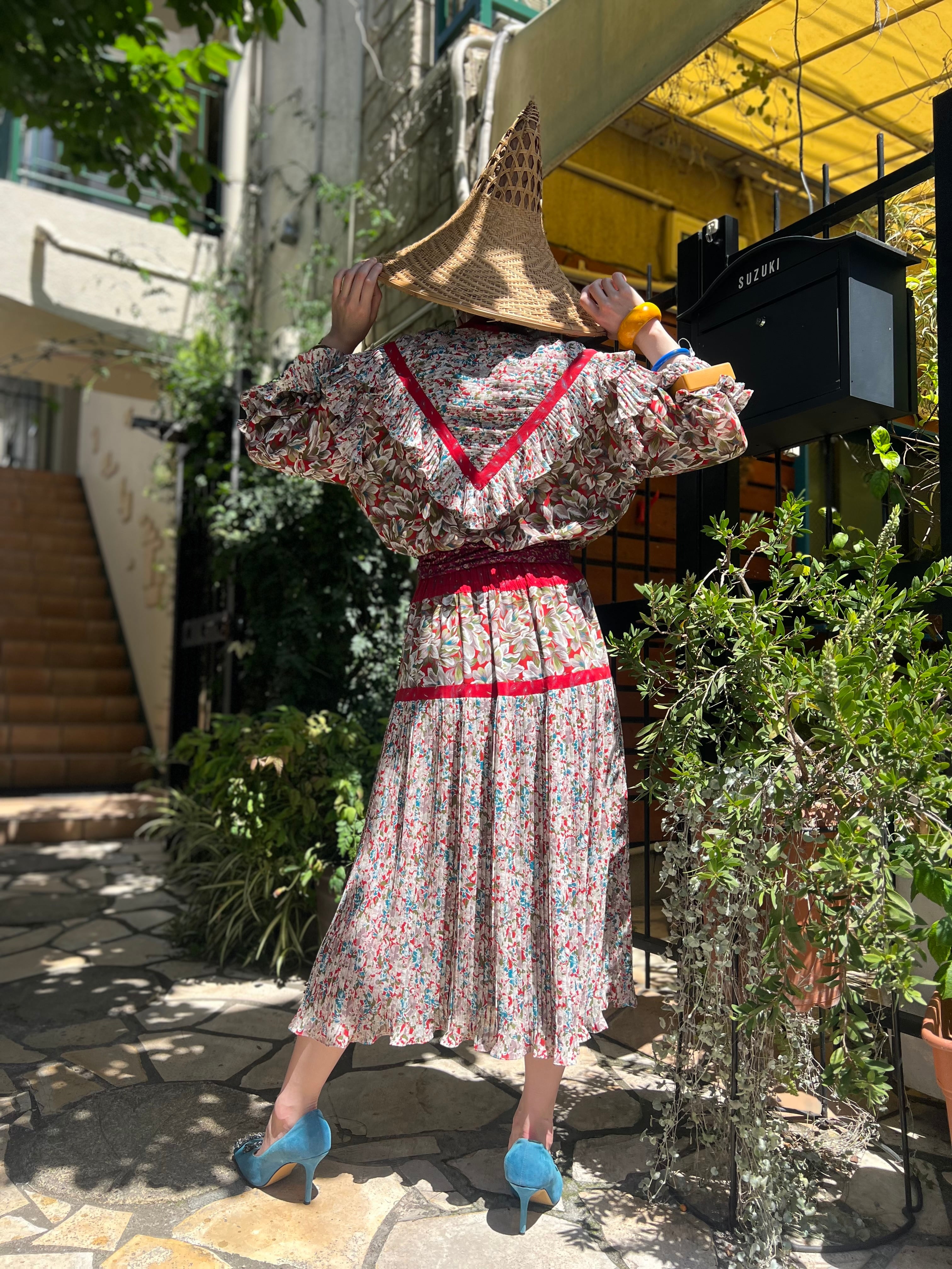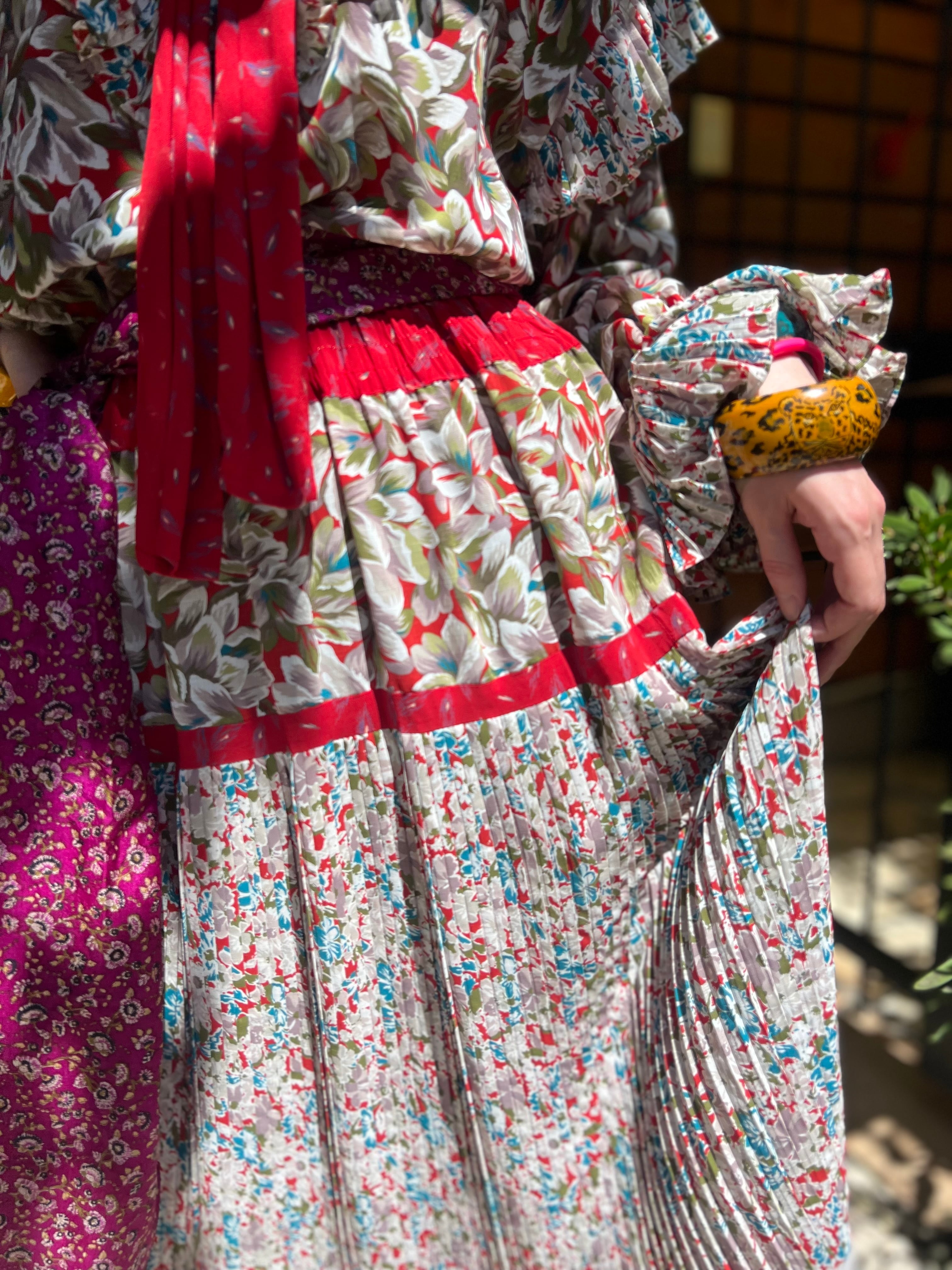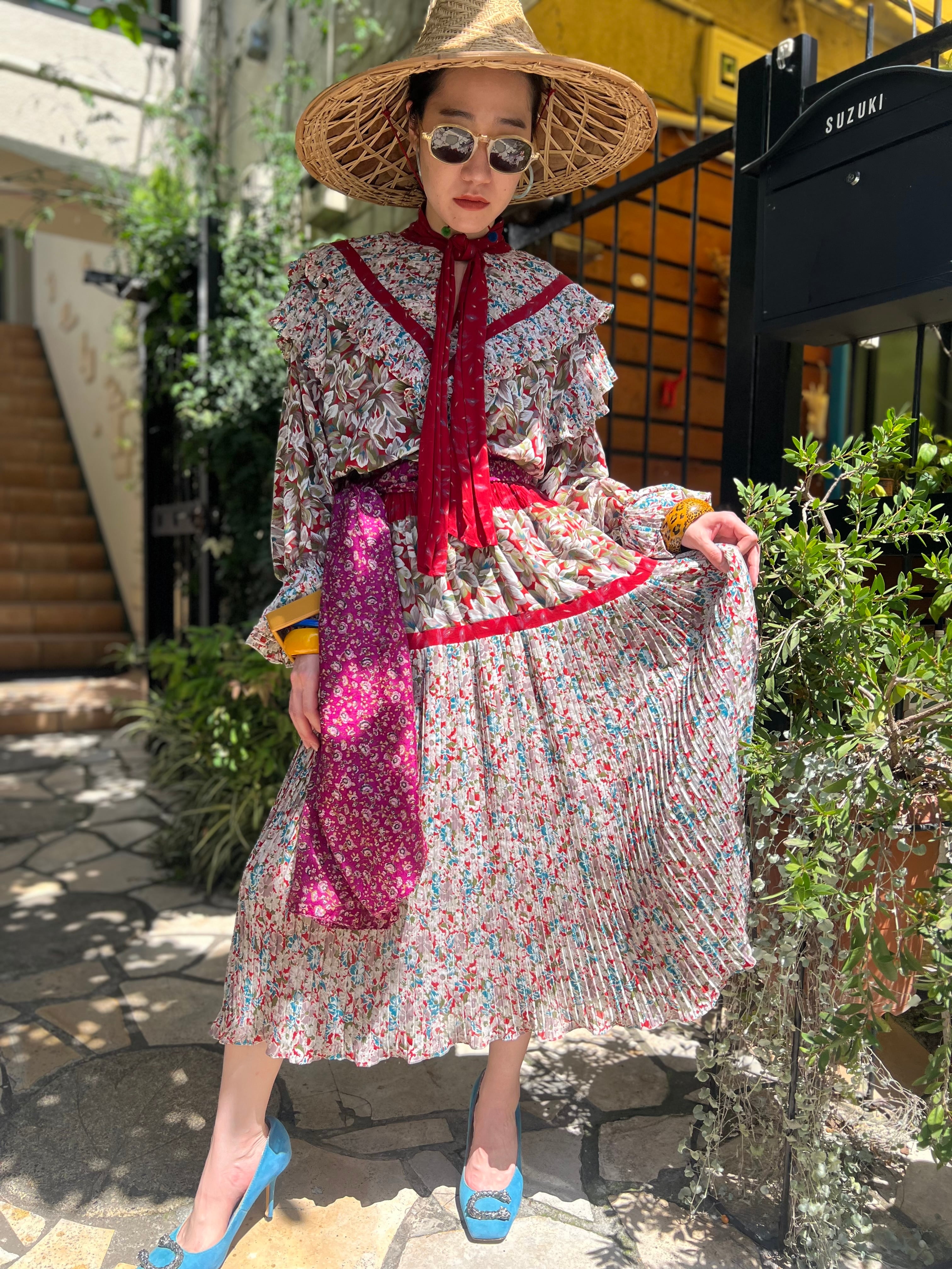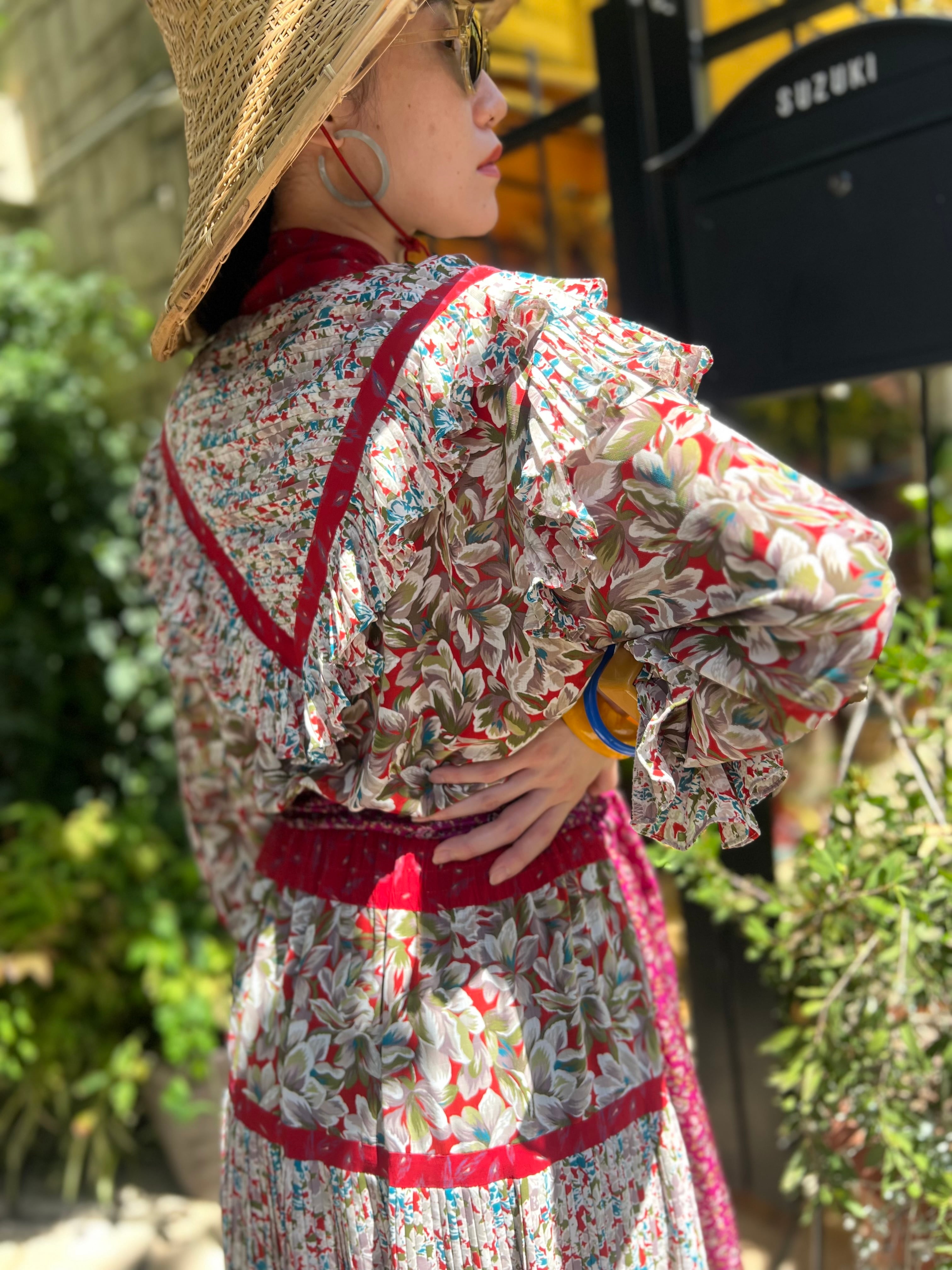 大きな襟のプリーツ使いや、襟やウエストなど部分的な赤が効いた色使いも素晴らしいお品です。