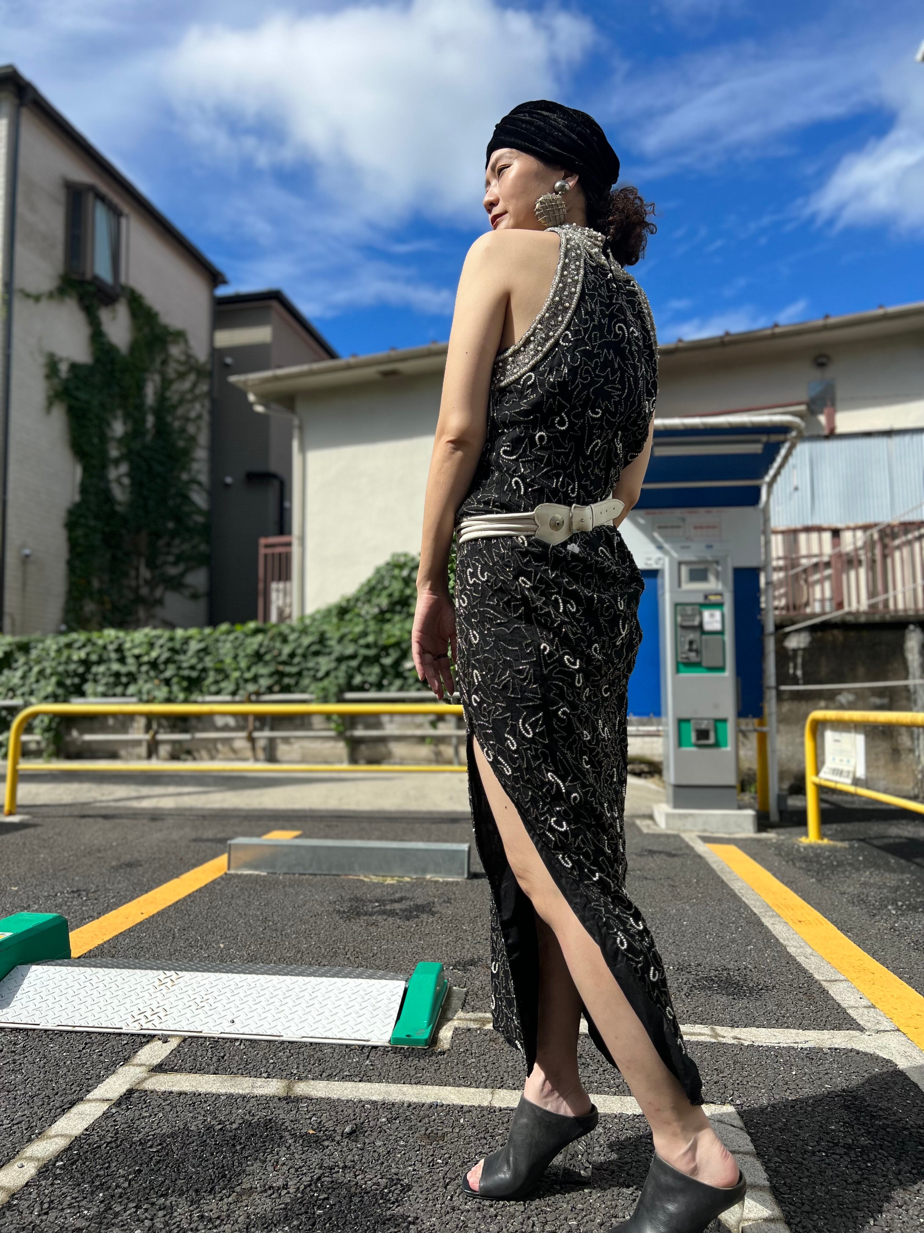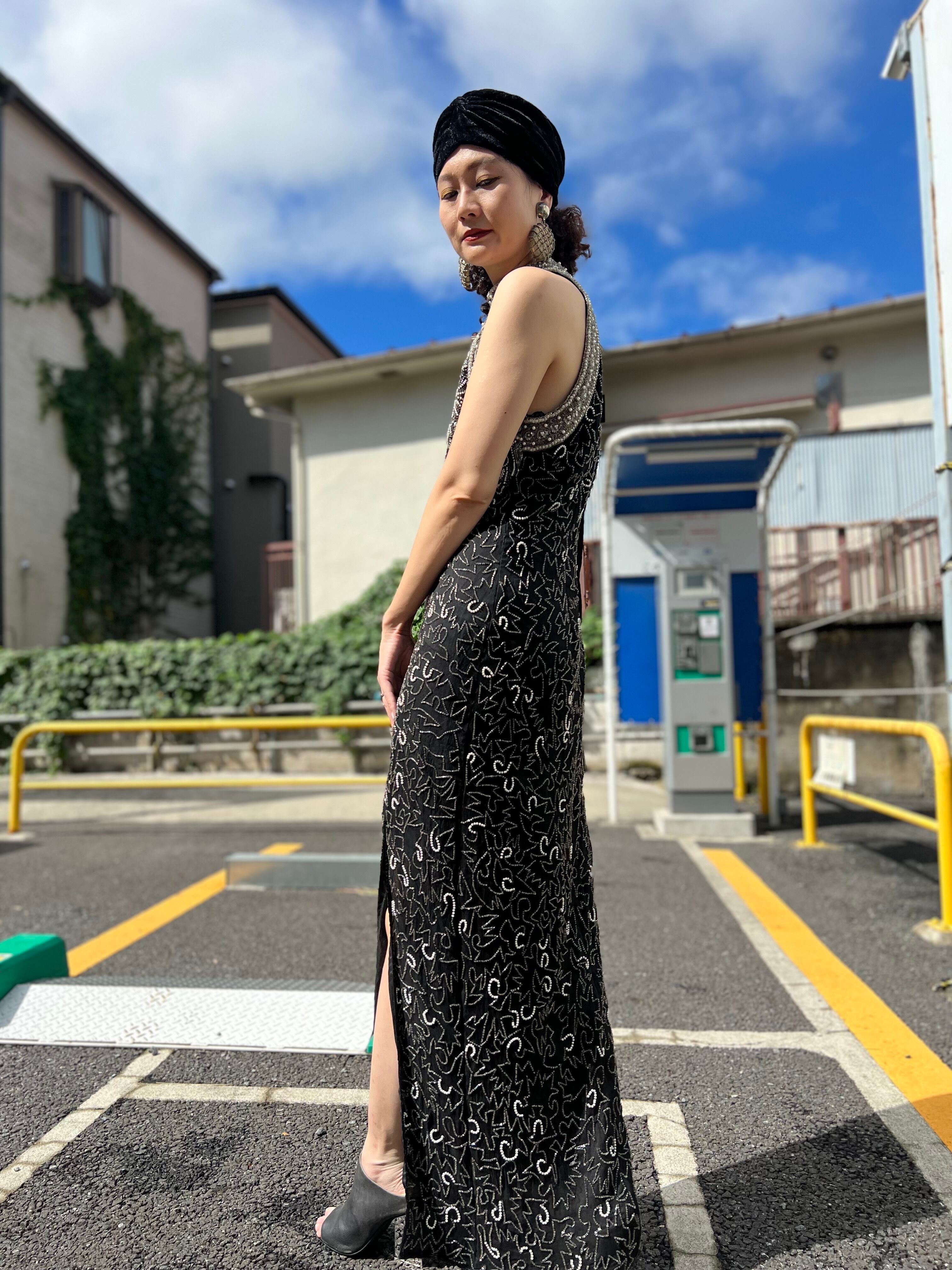 80年代 ニューヨーク ブラック × シルバー ビーズ × パール シルク ノースリーブ ドレスになります。