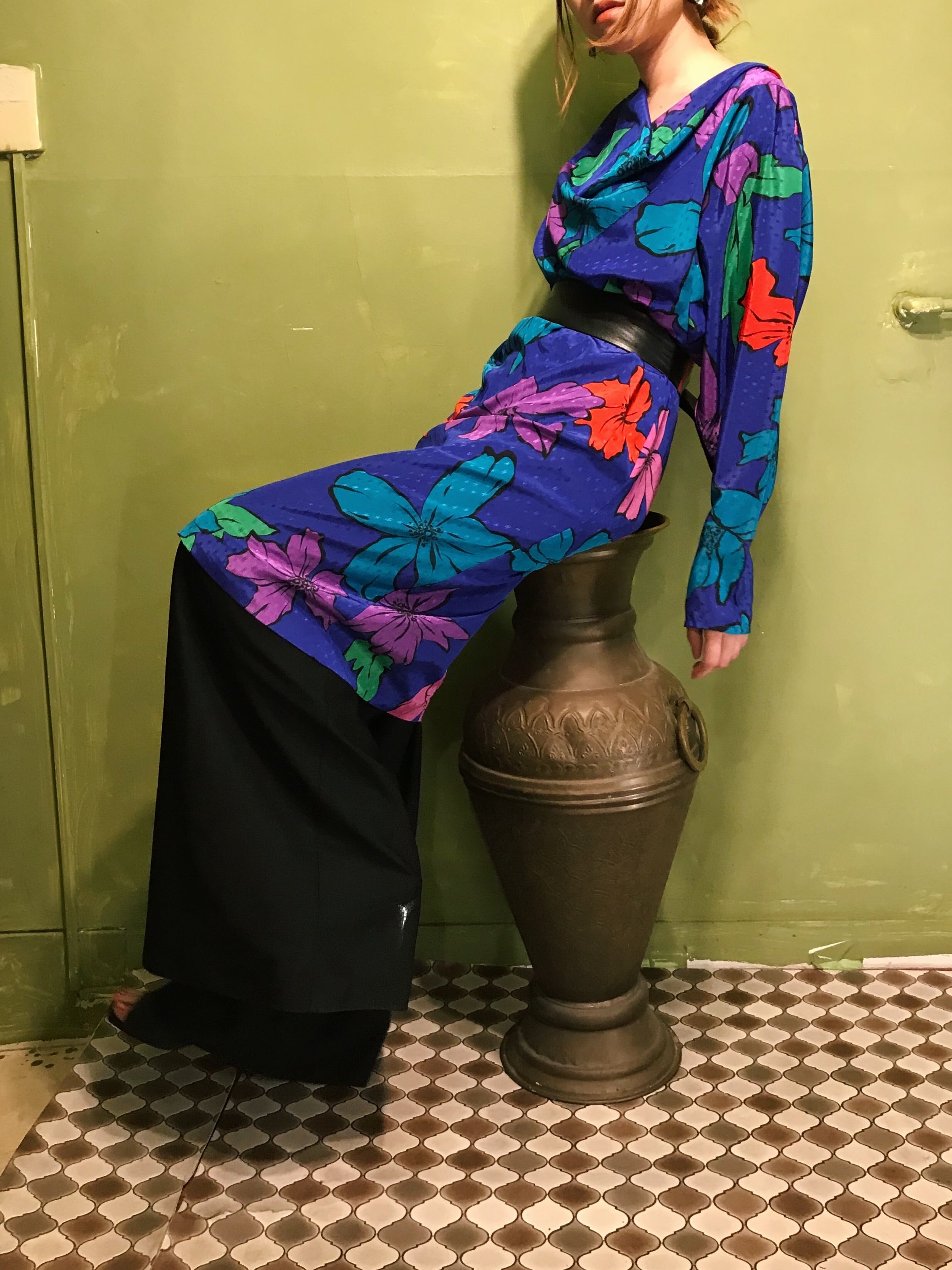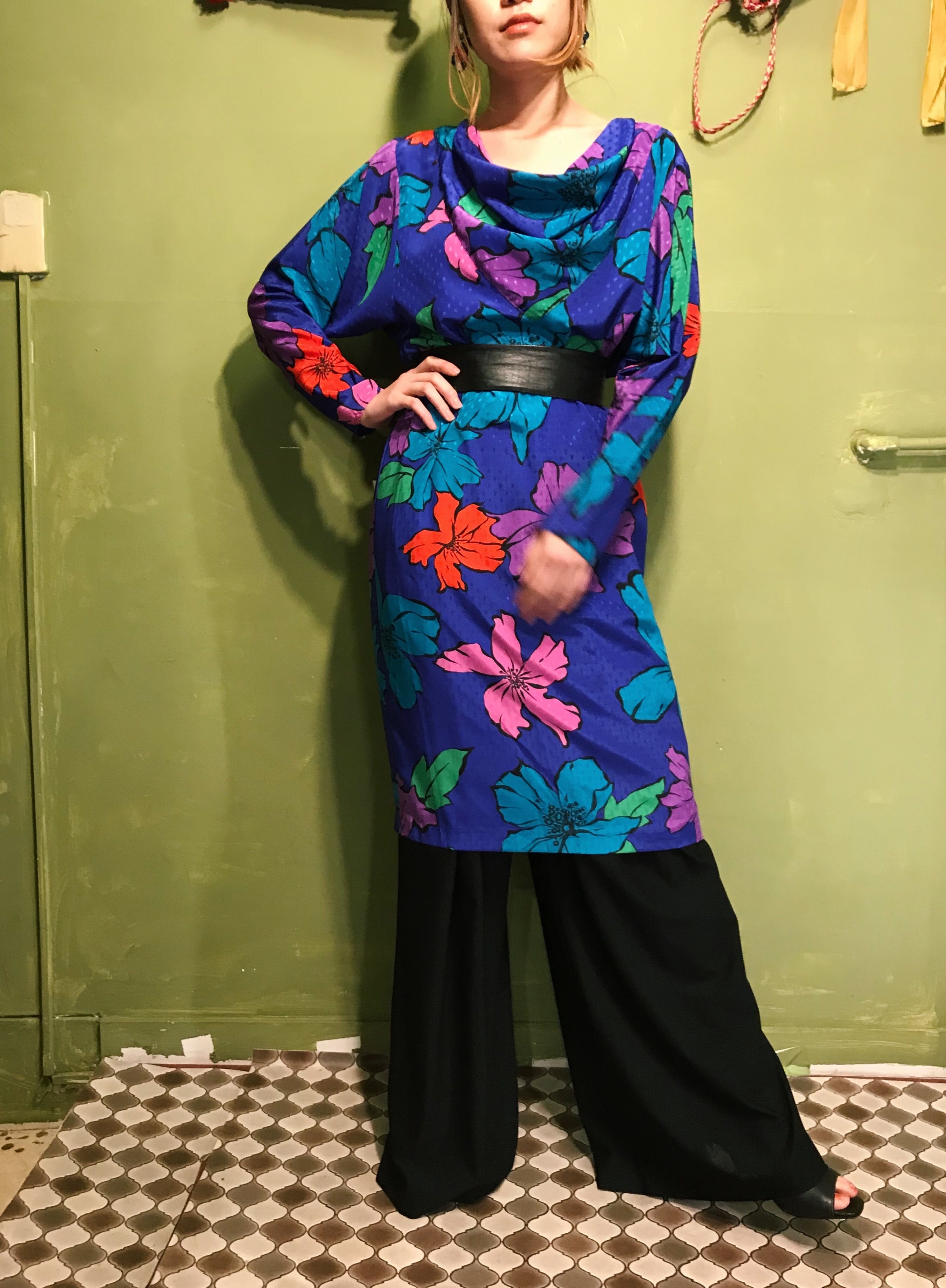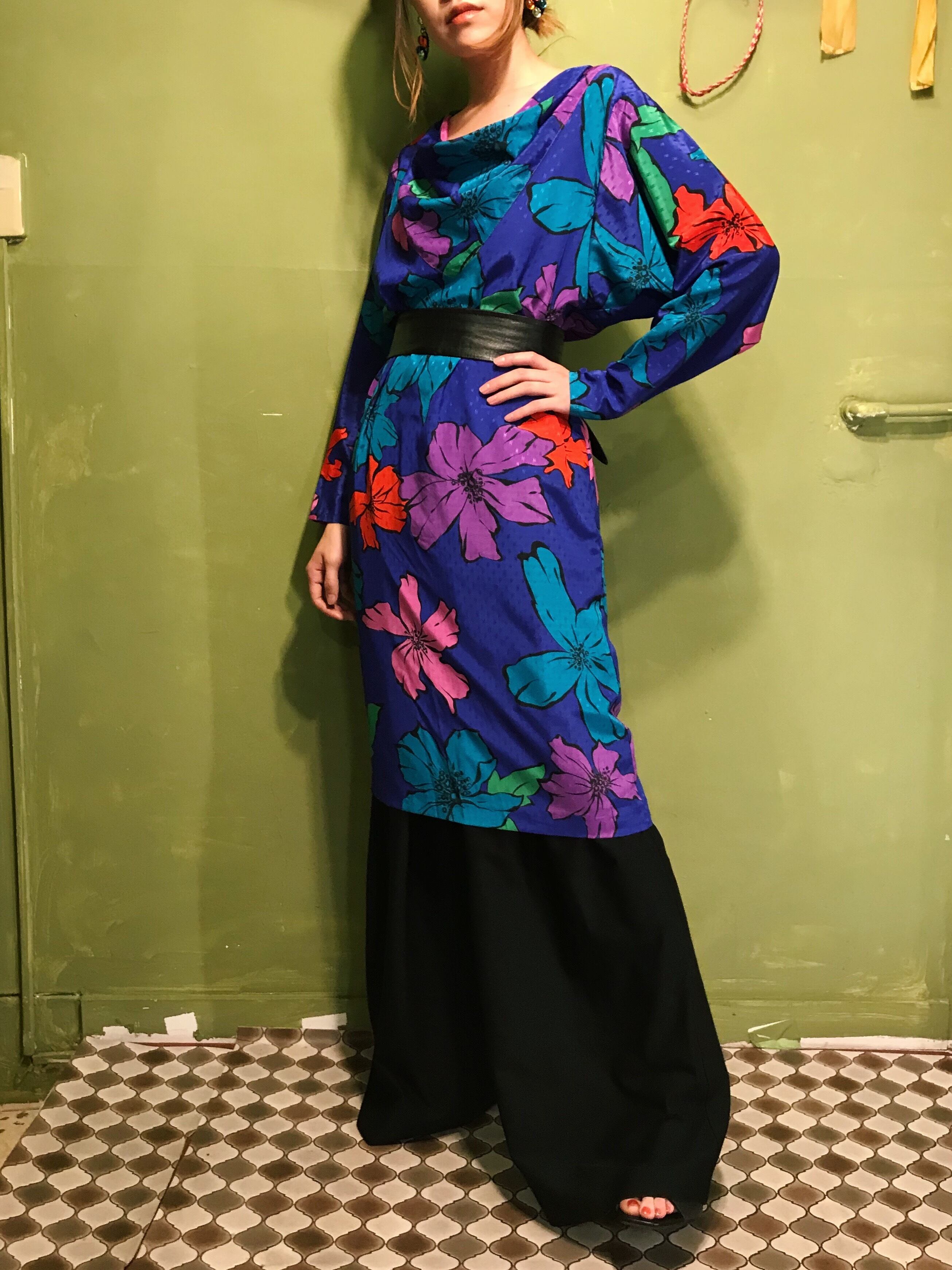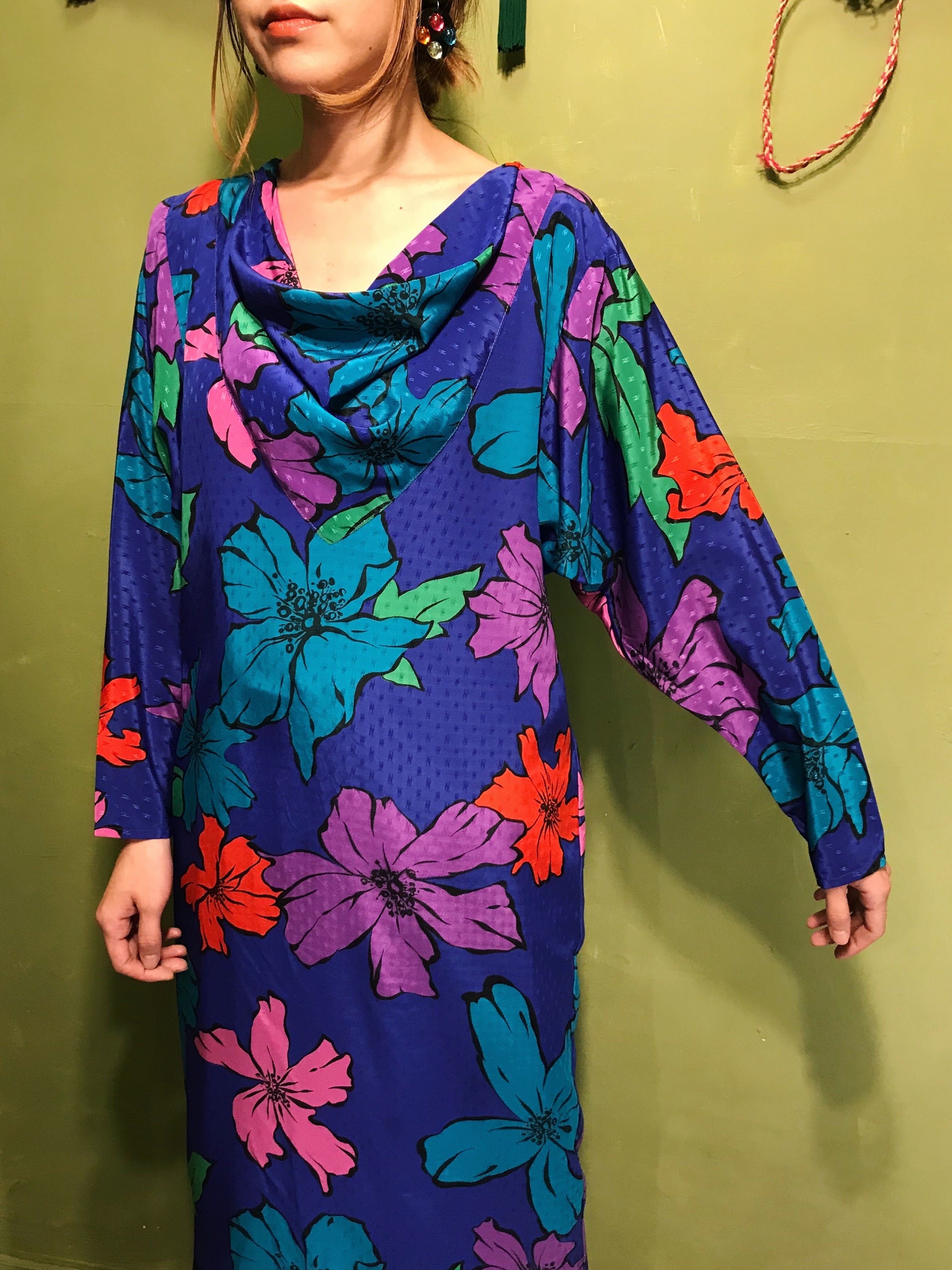 80年代ブルー × マルチカラー 花柄 ポリ ドレープカラー ワンピースになります。