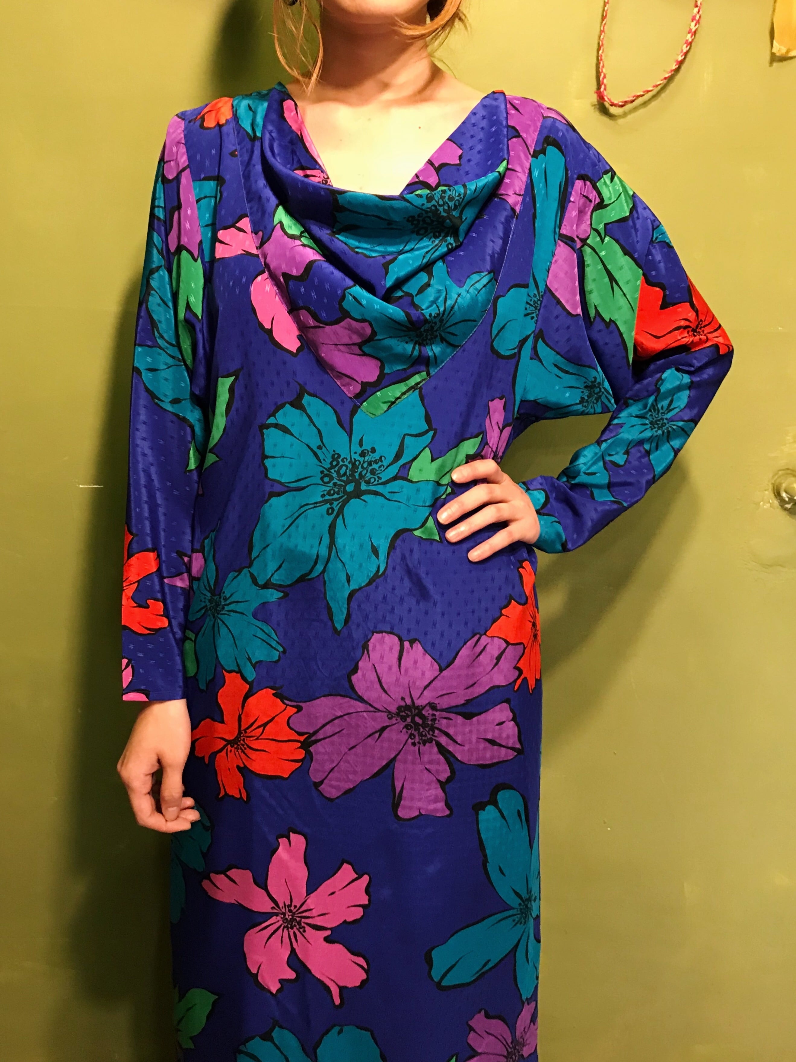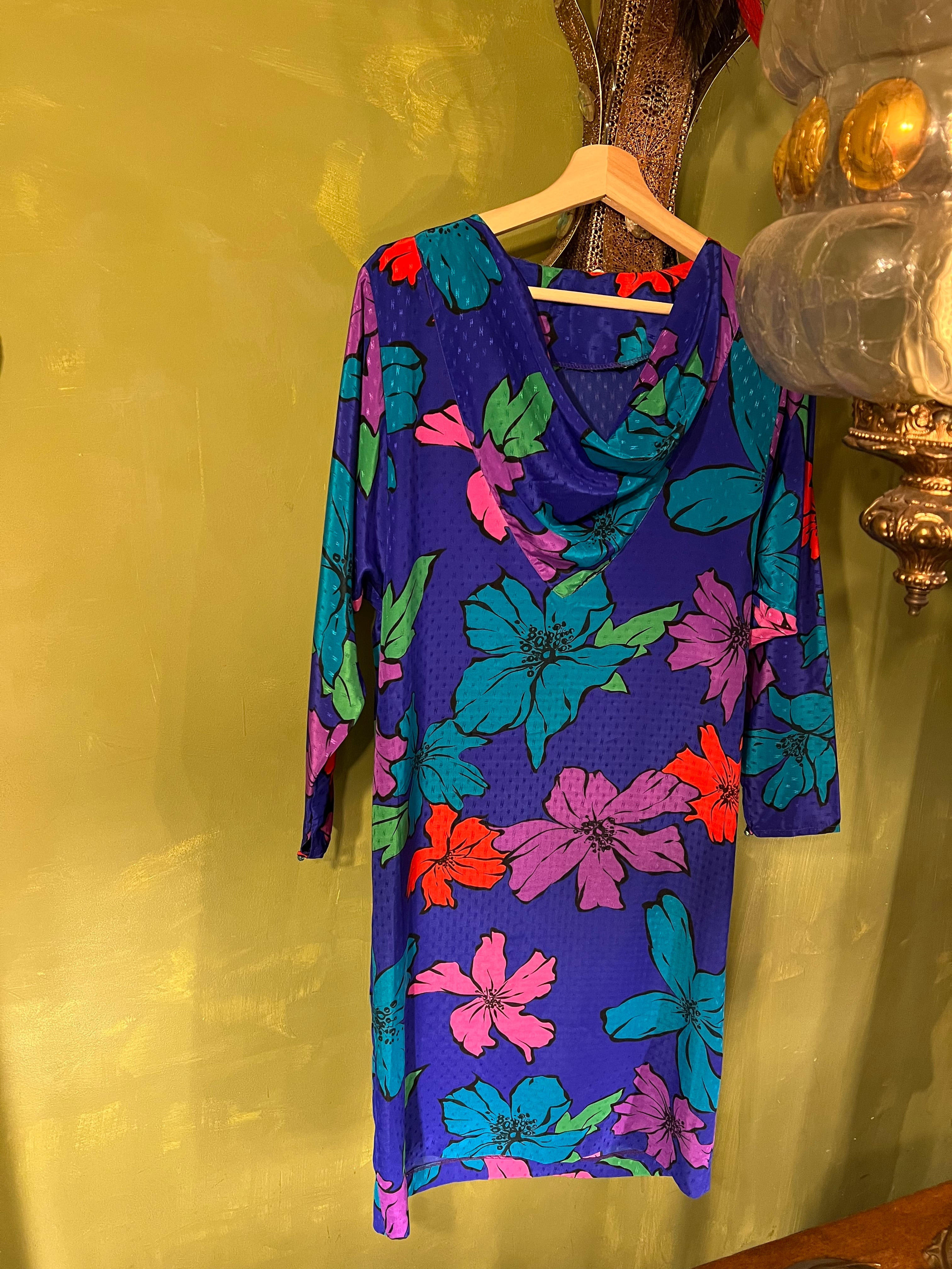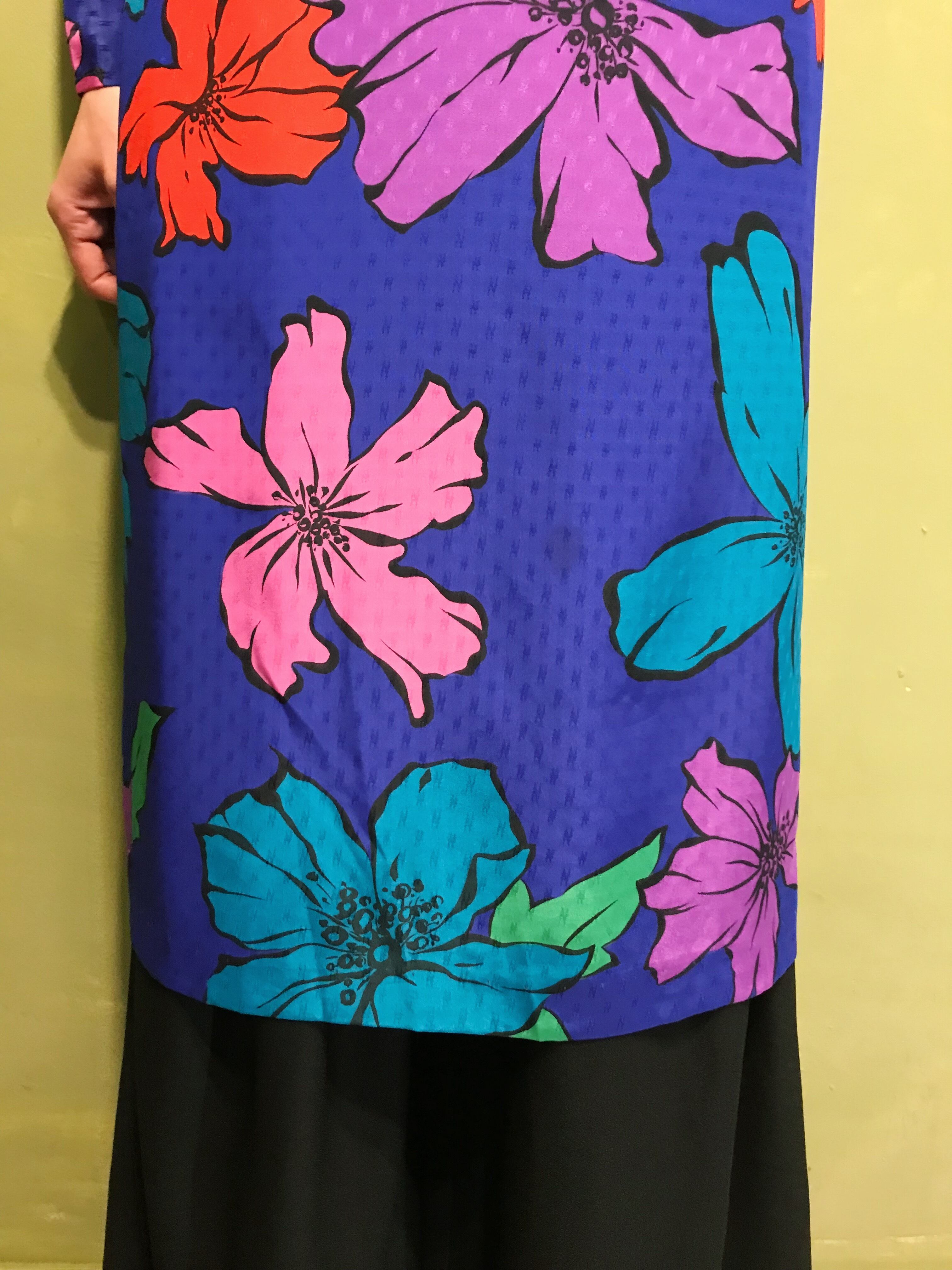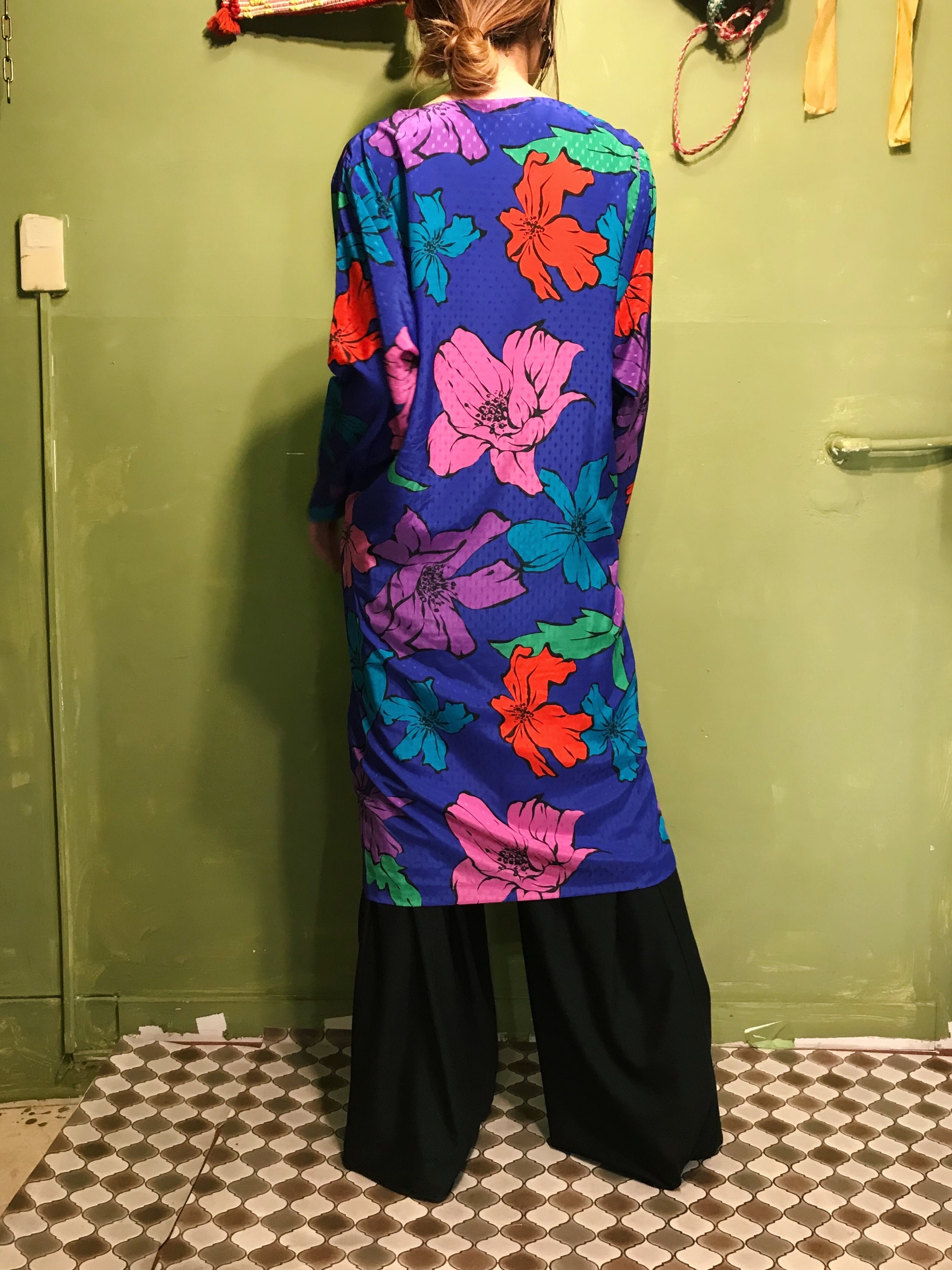 80年代ブルー × マルチカラー 花柄 ポリ ドレープカラー ワンピースになります。