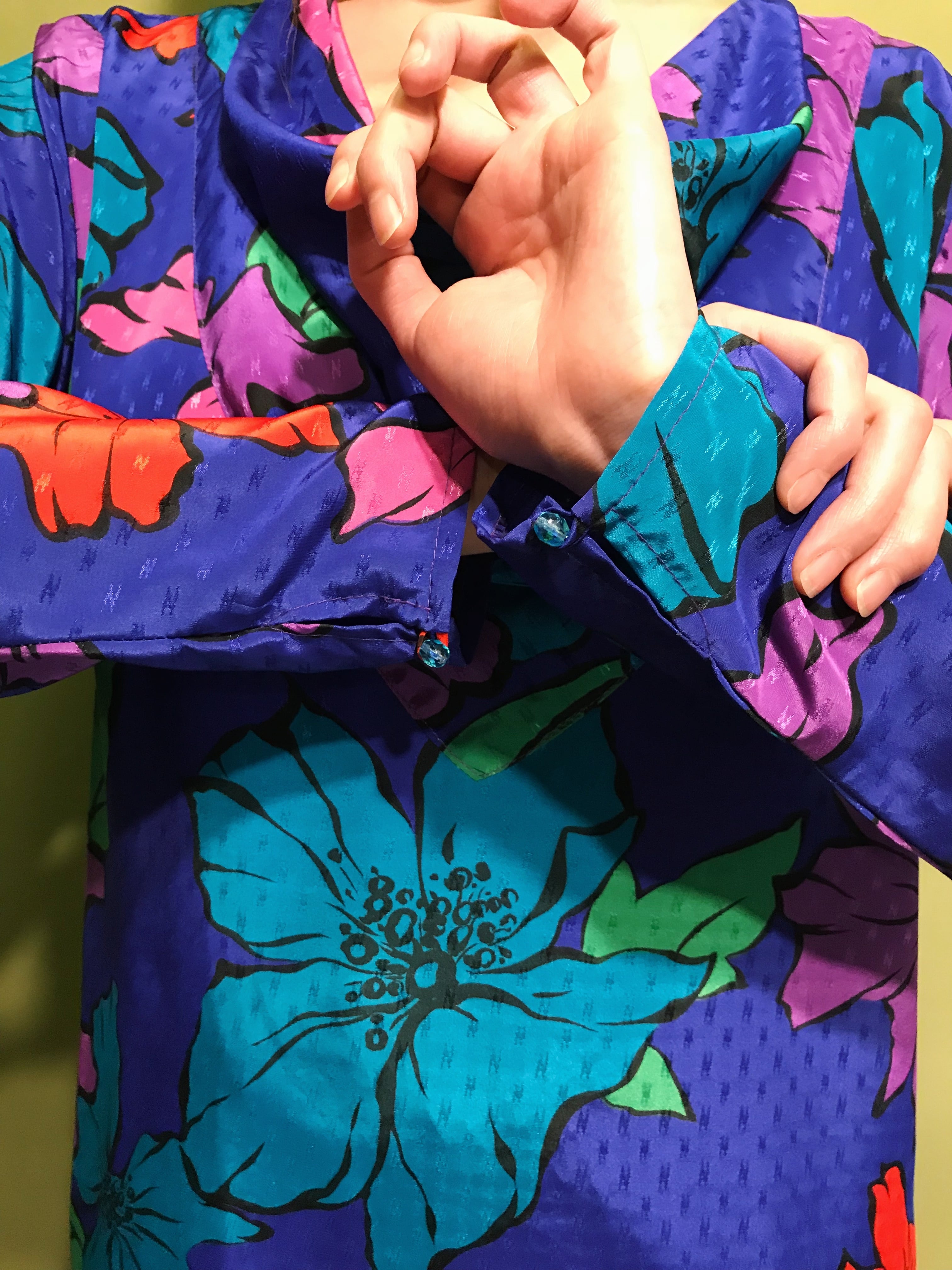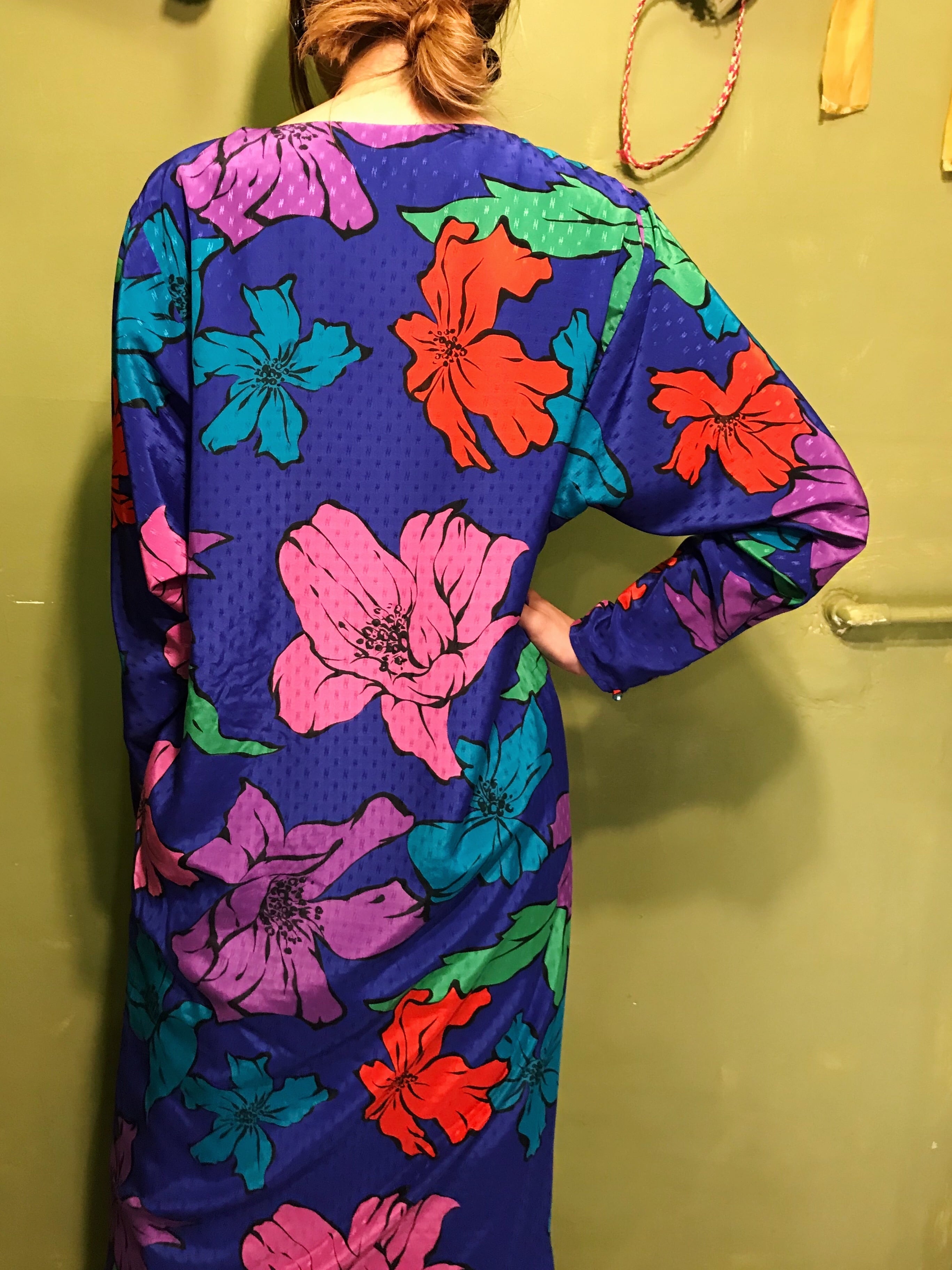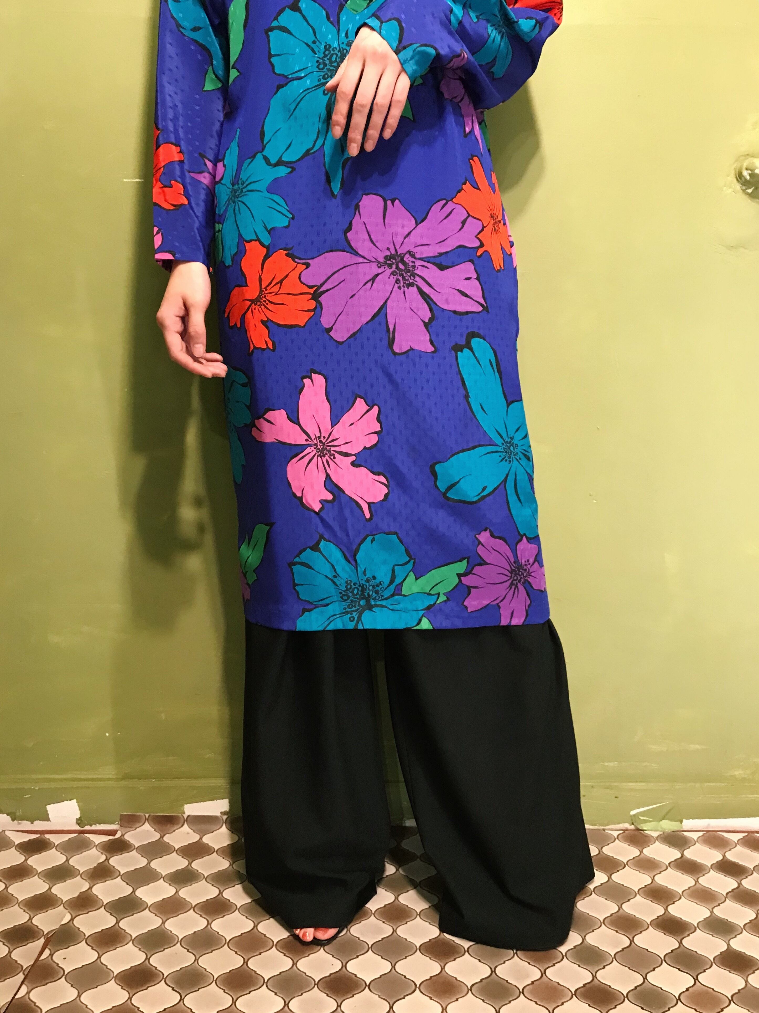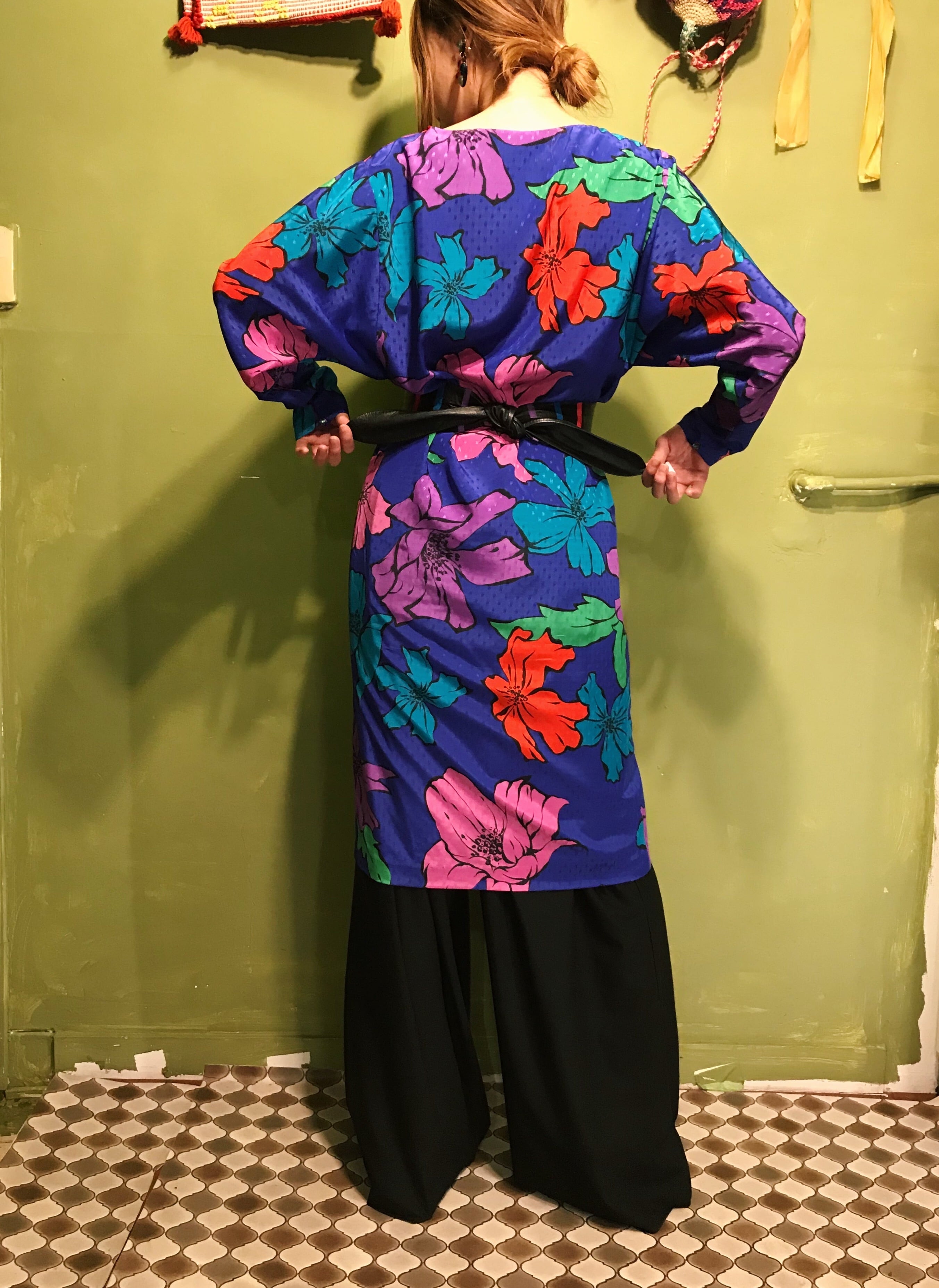 80年代ブルー × マルチカラー 花柄 ポリ ドレープカラー ワンピースになります。
