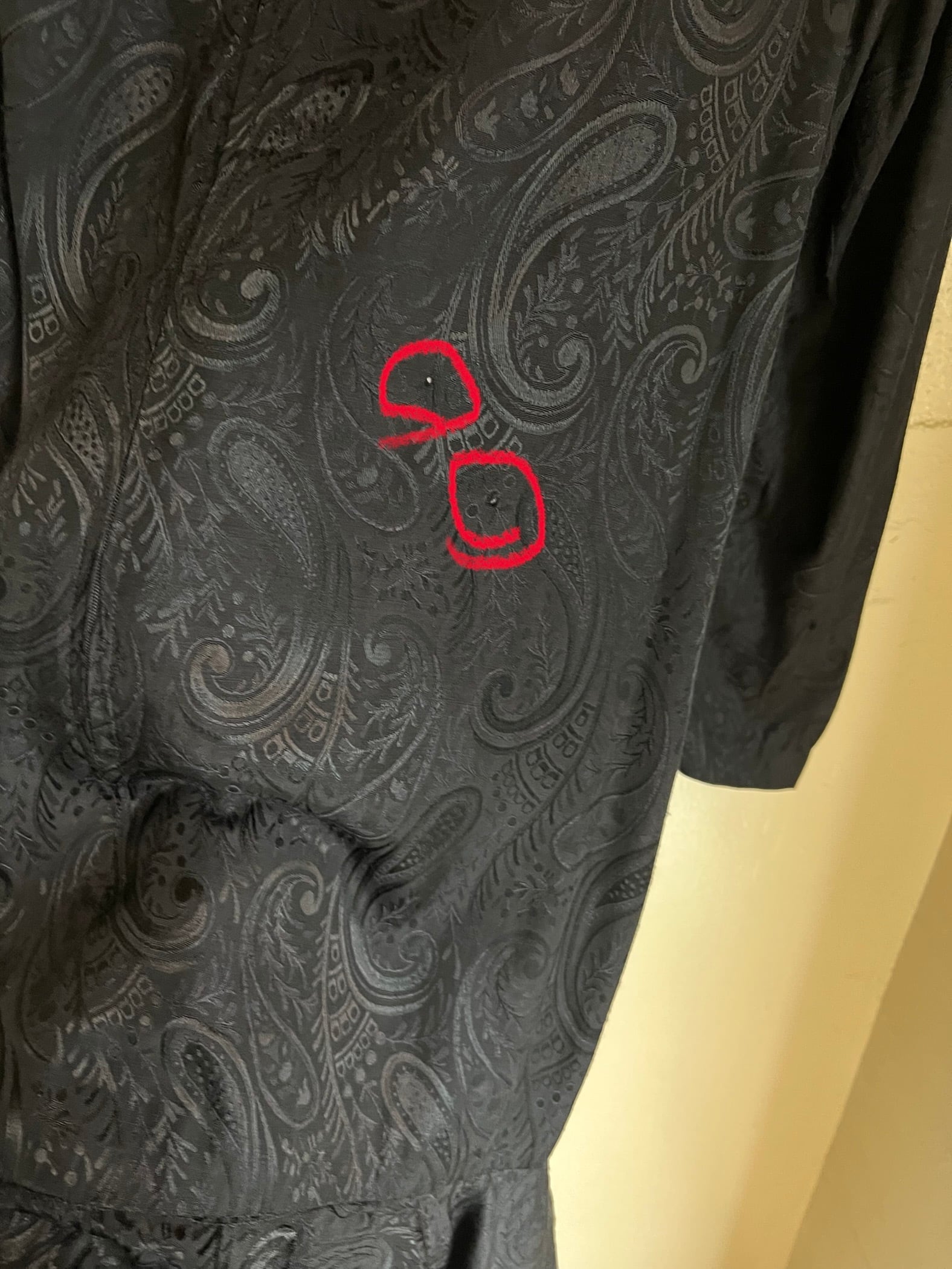 右腰、右ももあたりに小さな穴がございますが、インナーやスリップを黒にしていただくと、織柄入りの生地でそれ程目立ちません。