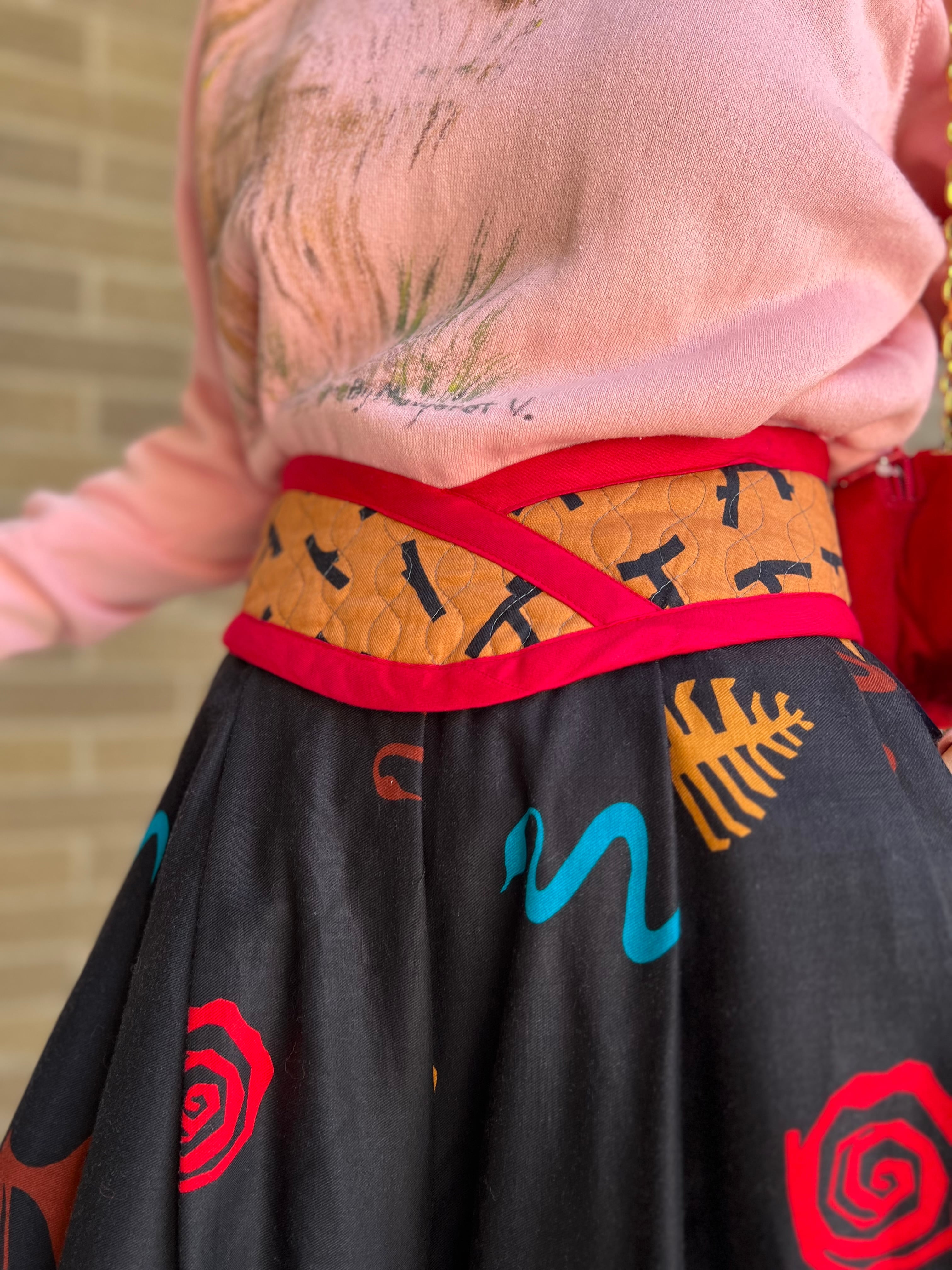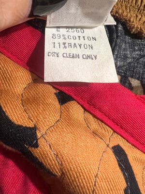 裾のブルーと赤のコントラストが素敵なパイピング、ウエストにも赤いパイピングが効いたキルティングベルトがついた非常に凝ったデザインです。