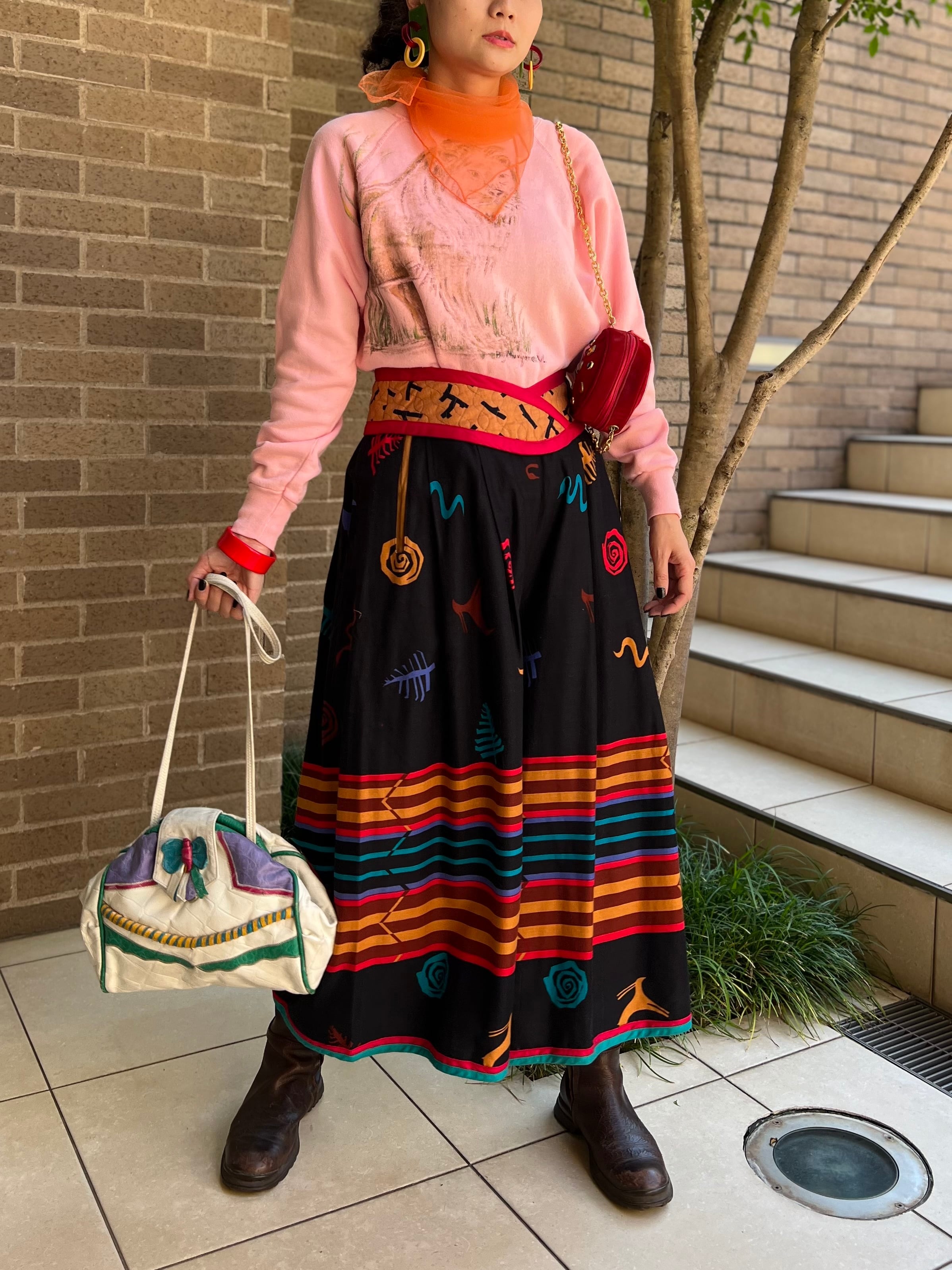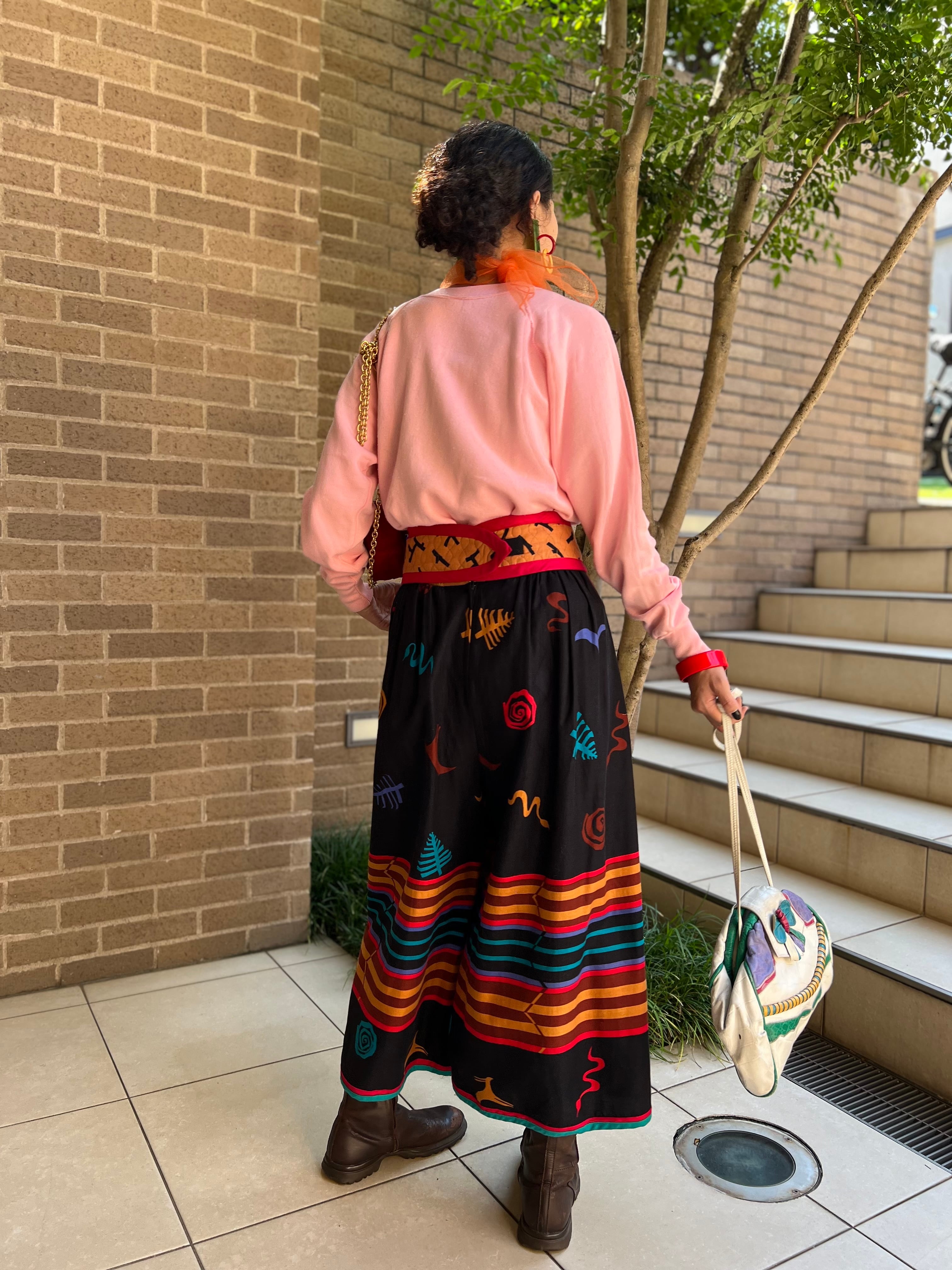 ブラックベースに、蛇やうさぎなどのアニマル、他にもぐるぐるのモチーフやいくつかの柄のミックスしたこのブランドらしい遊び心が効いたテキスタイル。