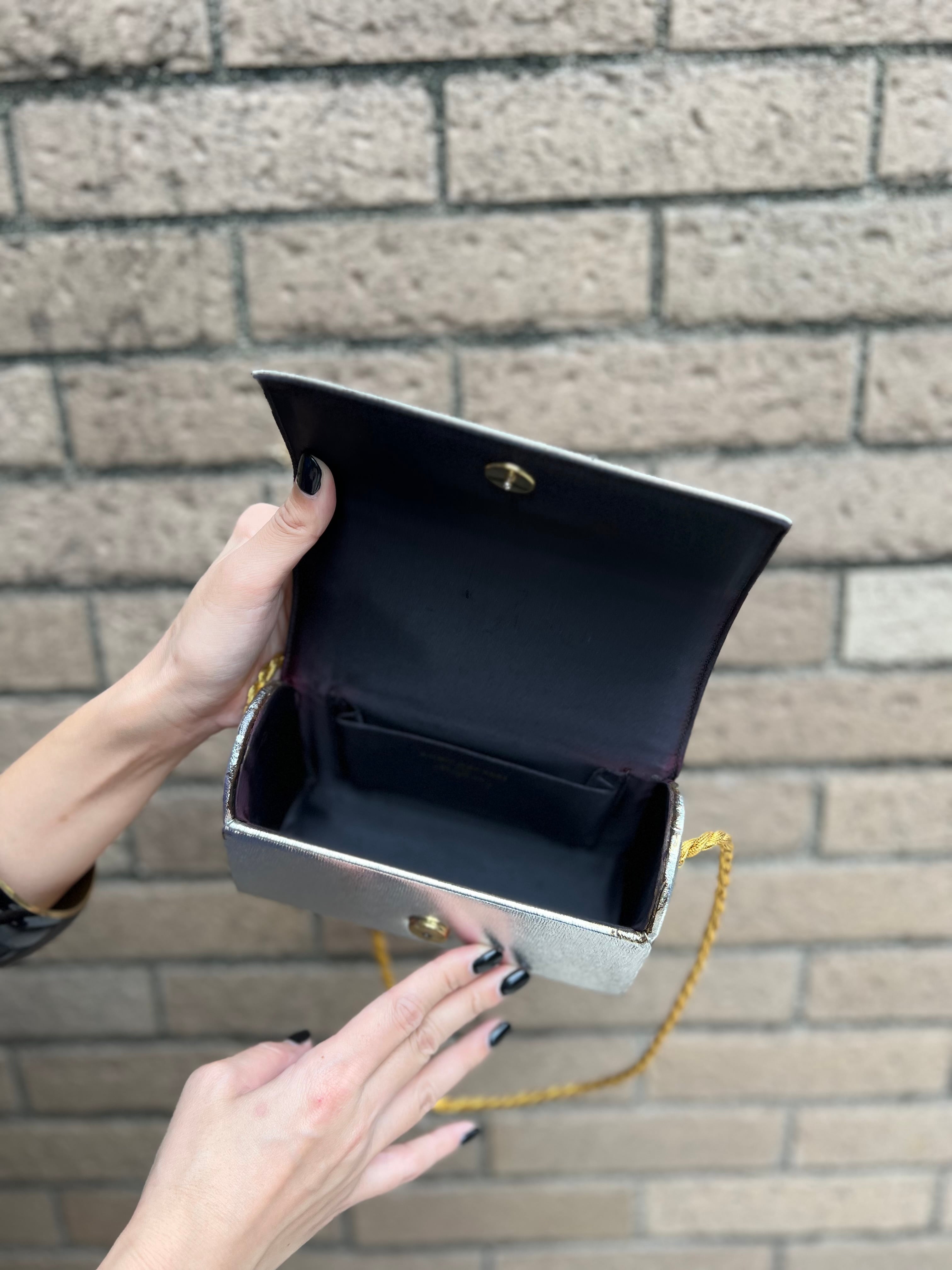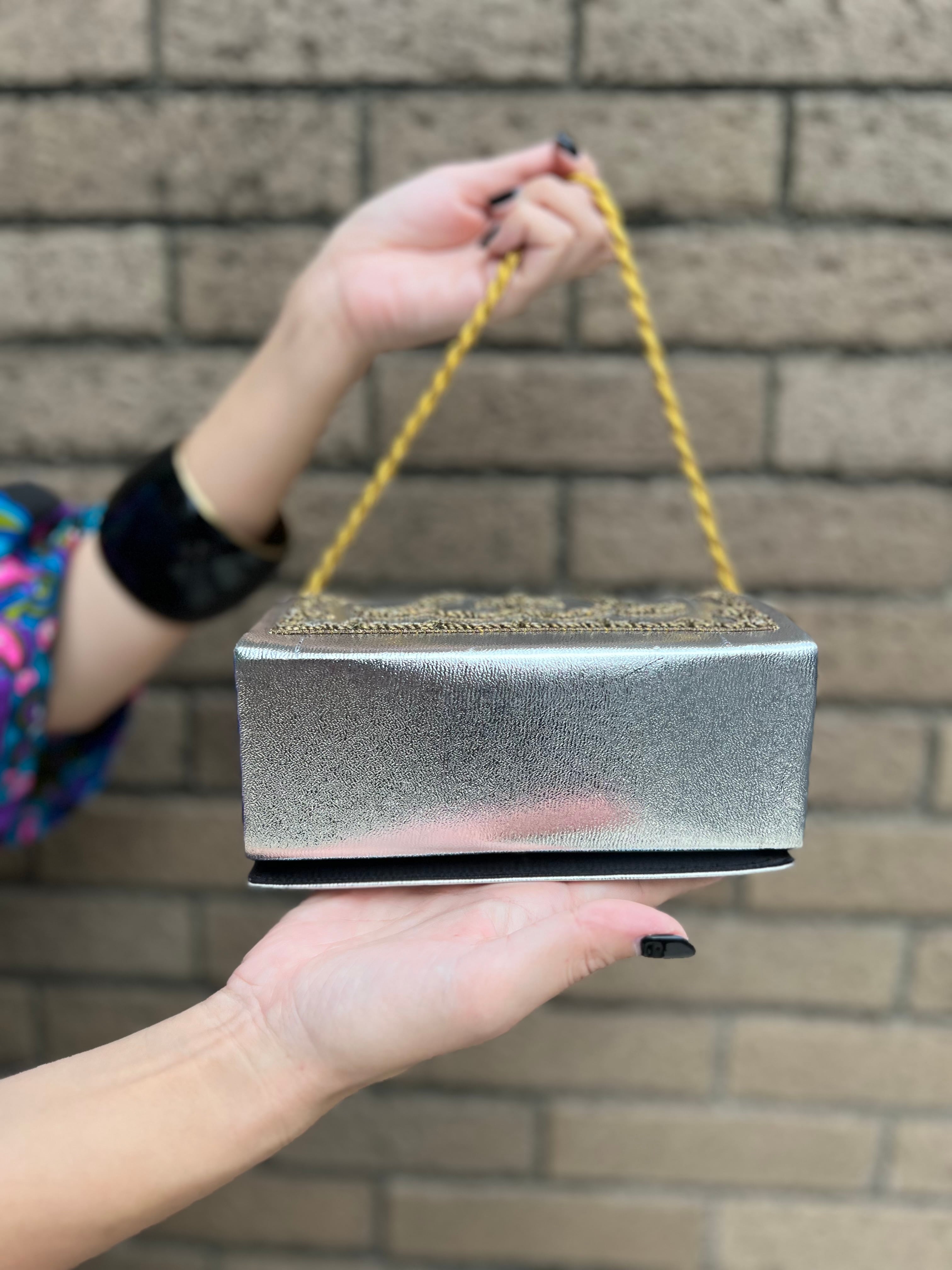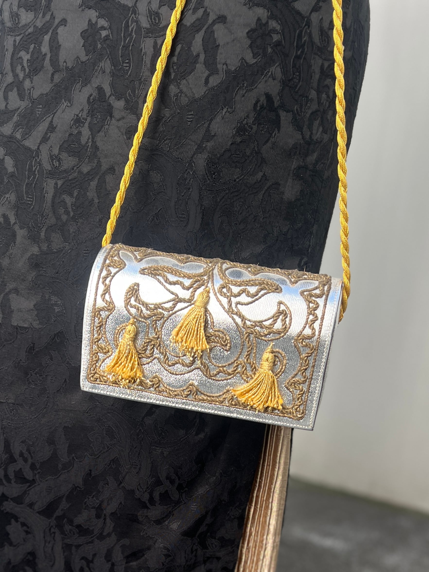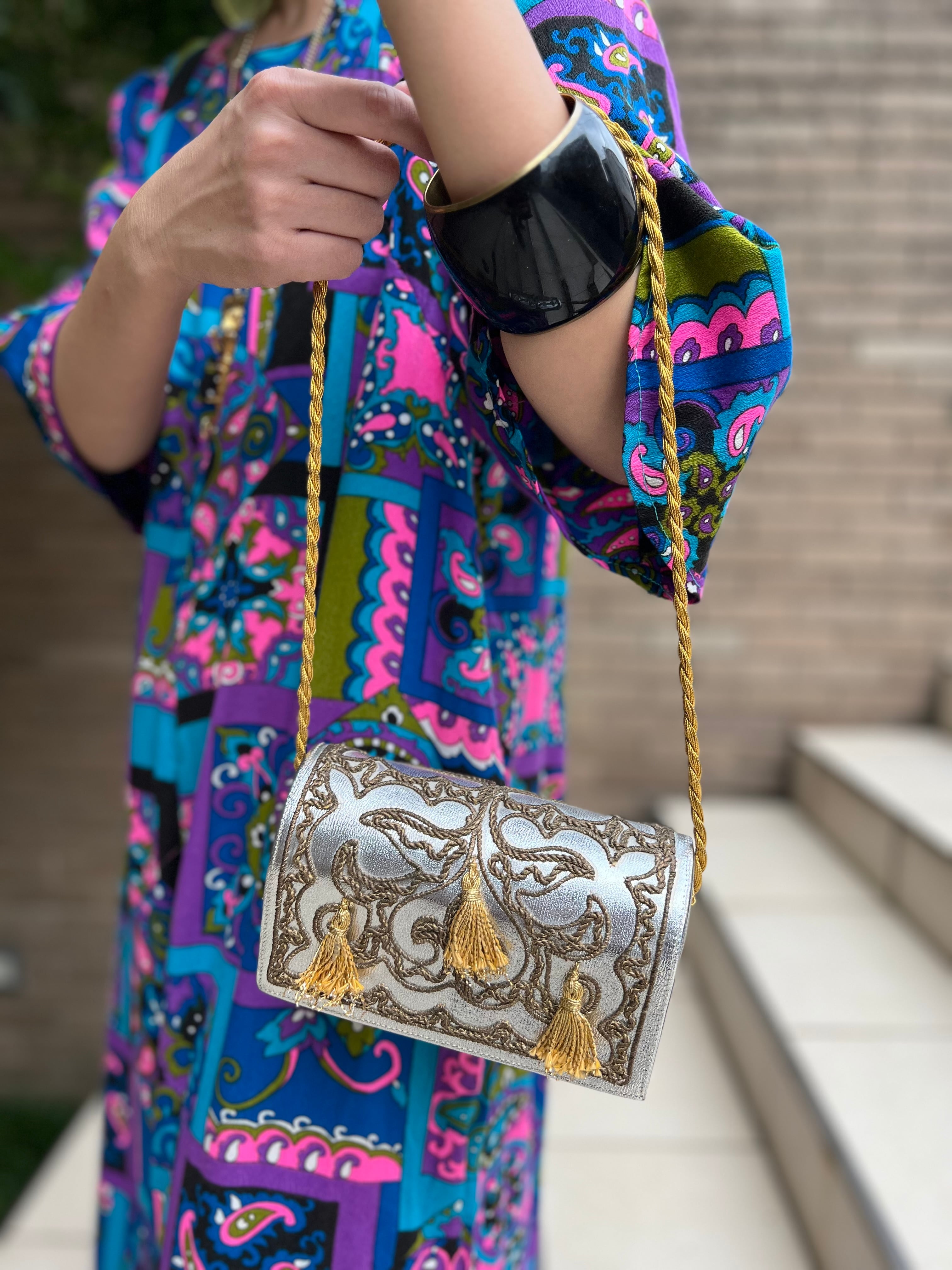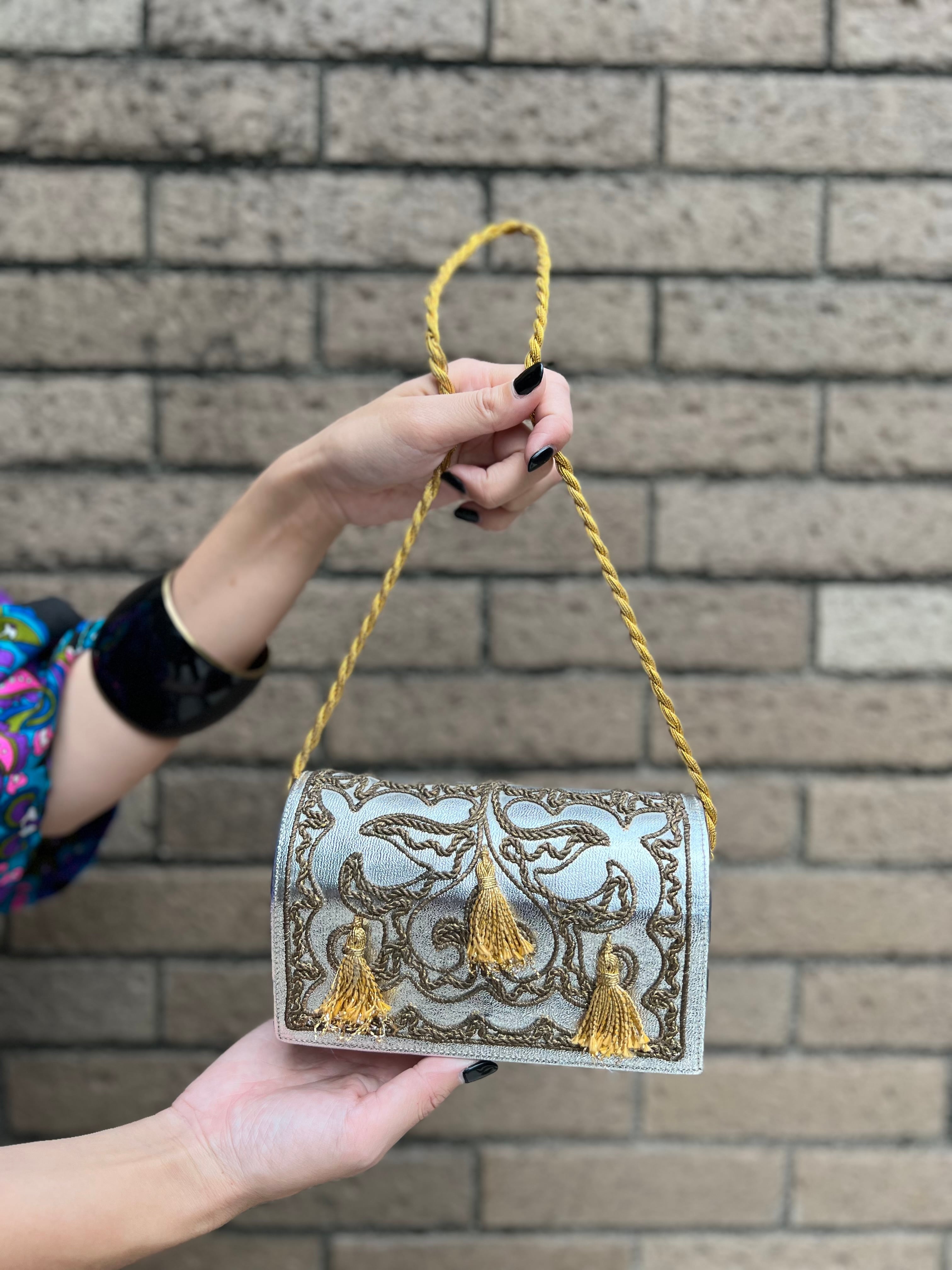 フォルムのよいメタリックシルバーのバッグに、ゴールドのコード刺繍装飾やタッセル つきのお品です。