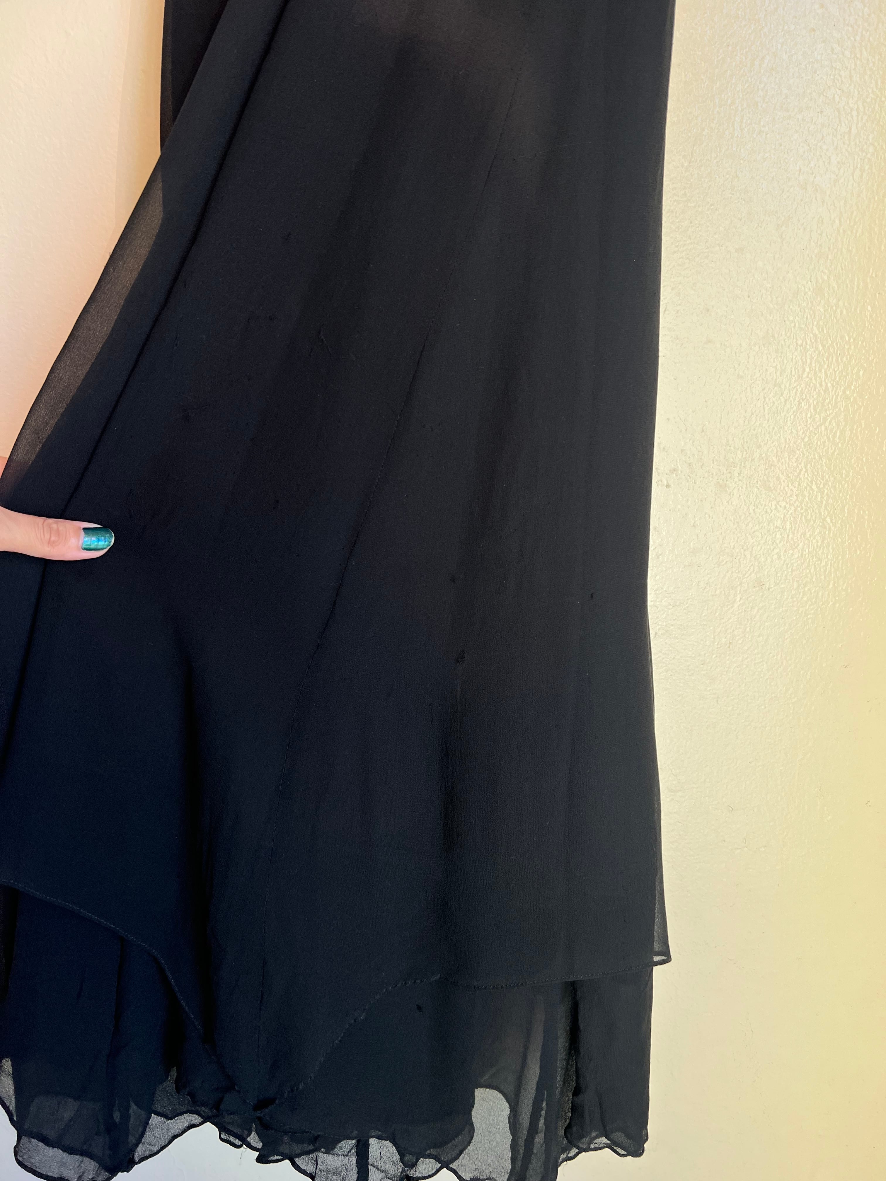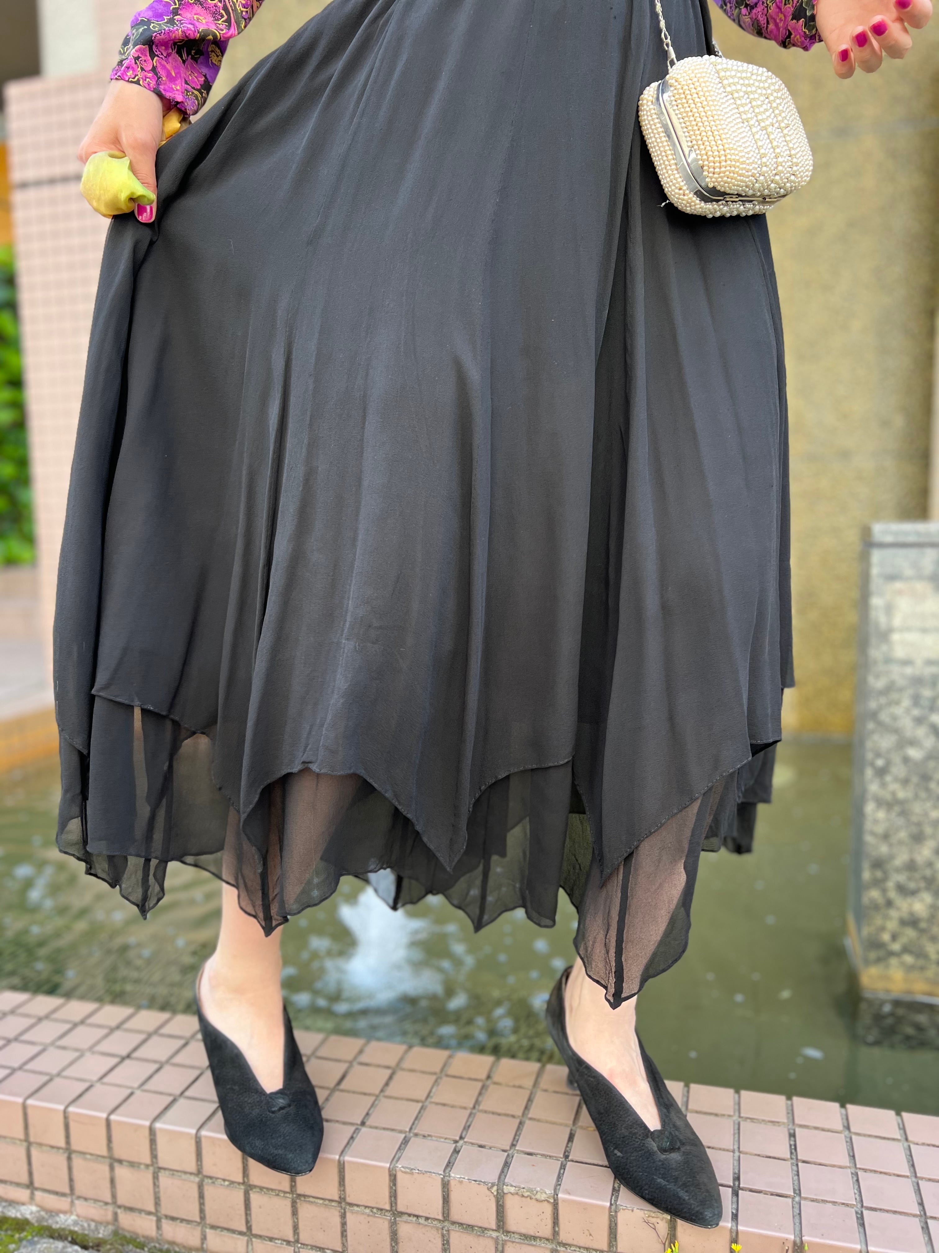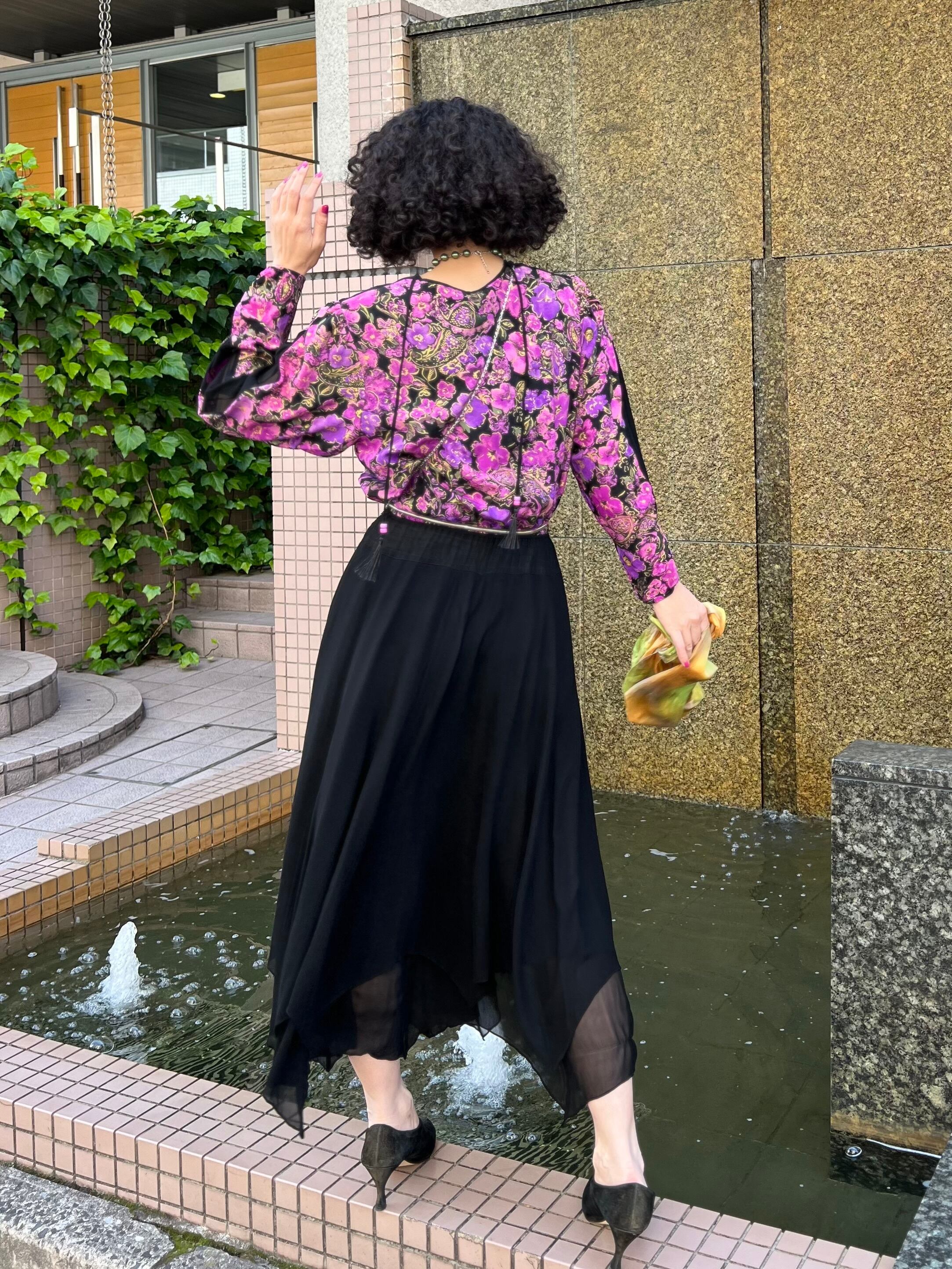 ブラックの裾が花びらのように見える、裾がジグザグのカットで、裏地の裾にも共布のシルクのギザギザの生地がついた素敵な一枚です。