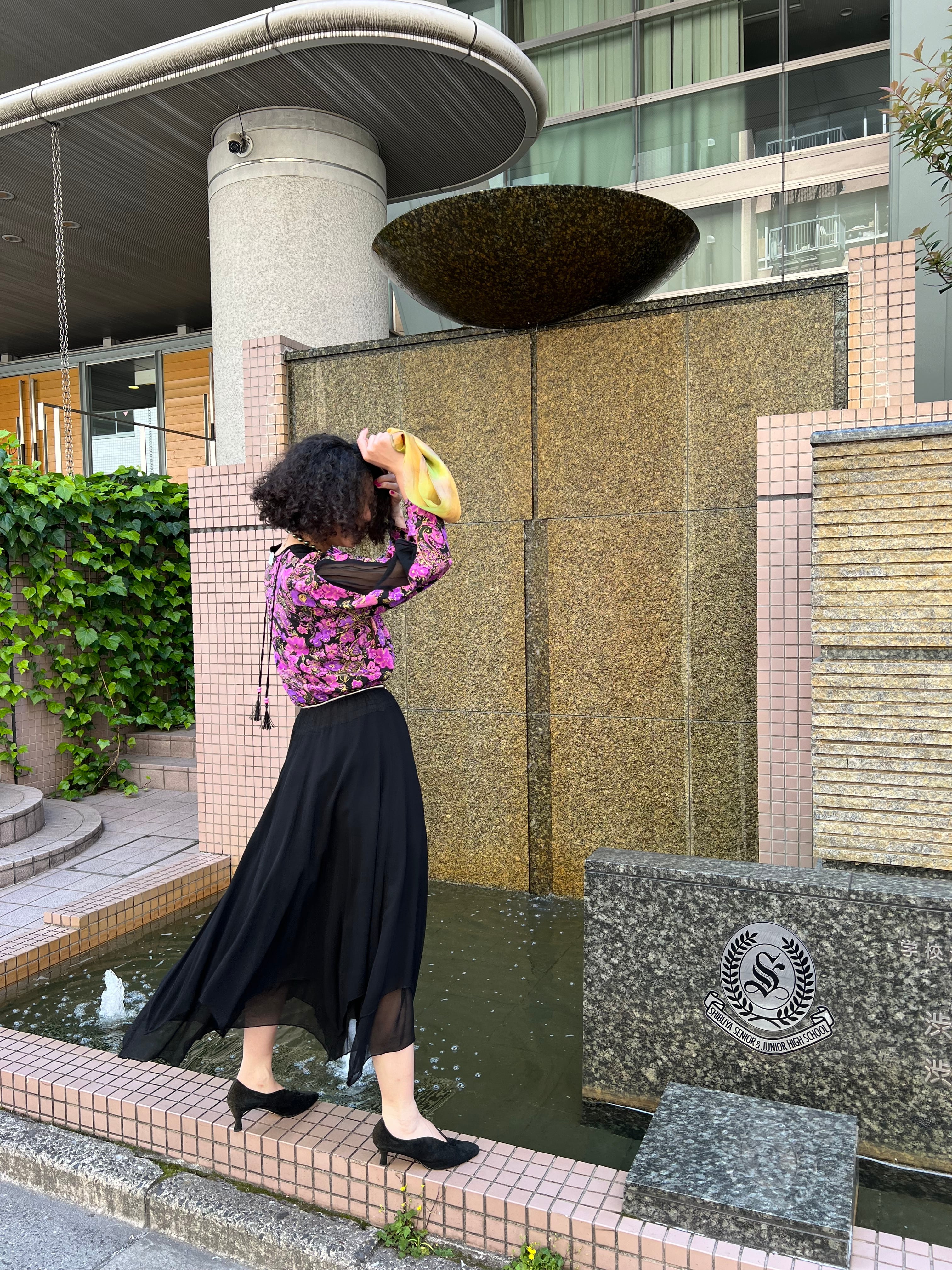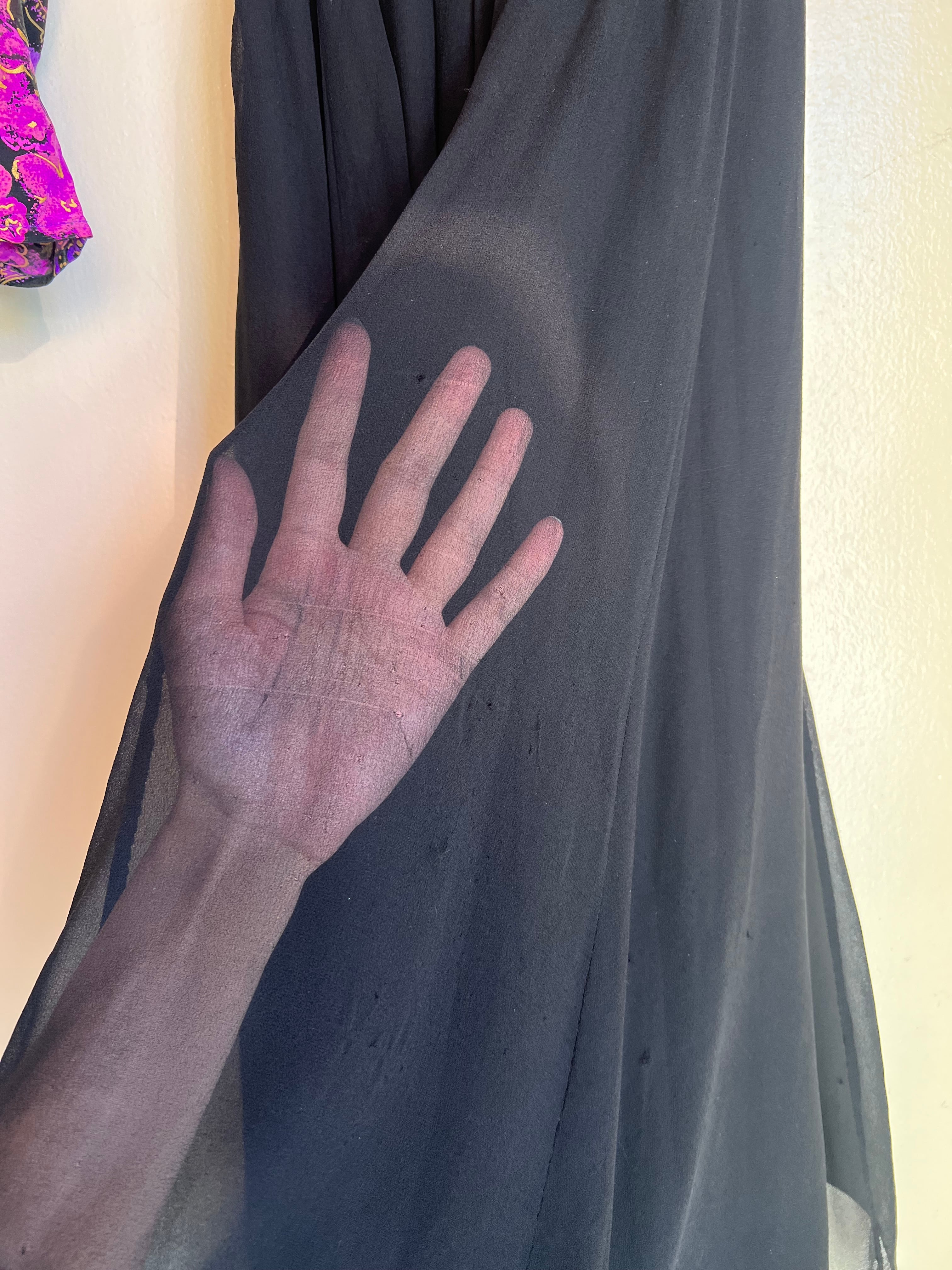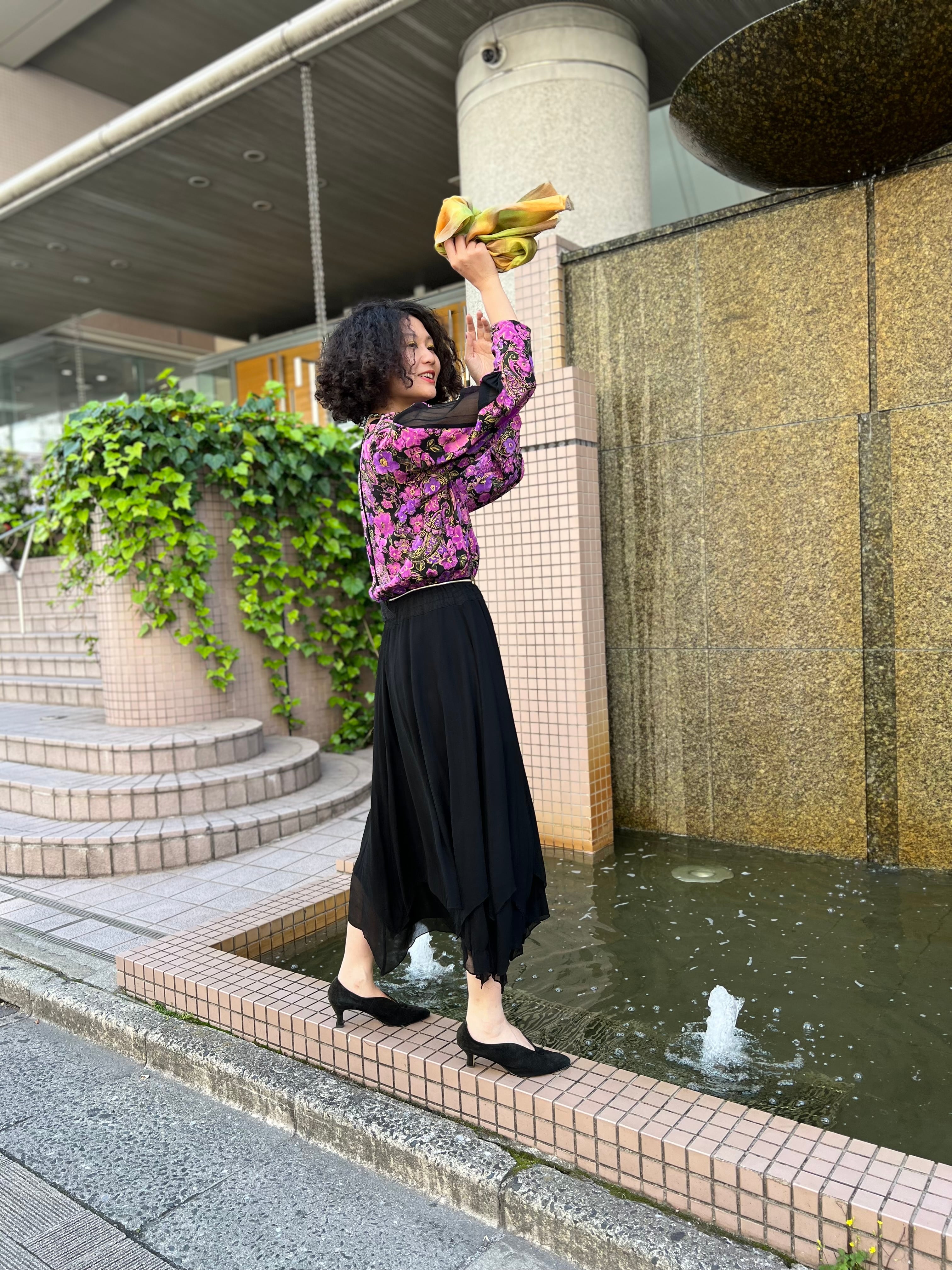ブラックの裾が花びらのように見える、裾がジグザグのカットで、裏地の裾にも共布のシルクのギザギザの生地がついた素敵な一枚です。