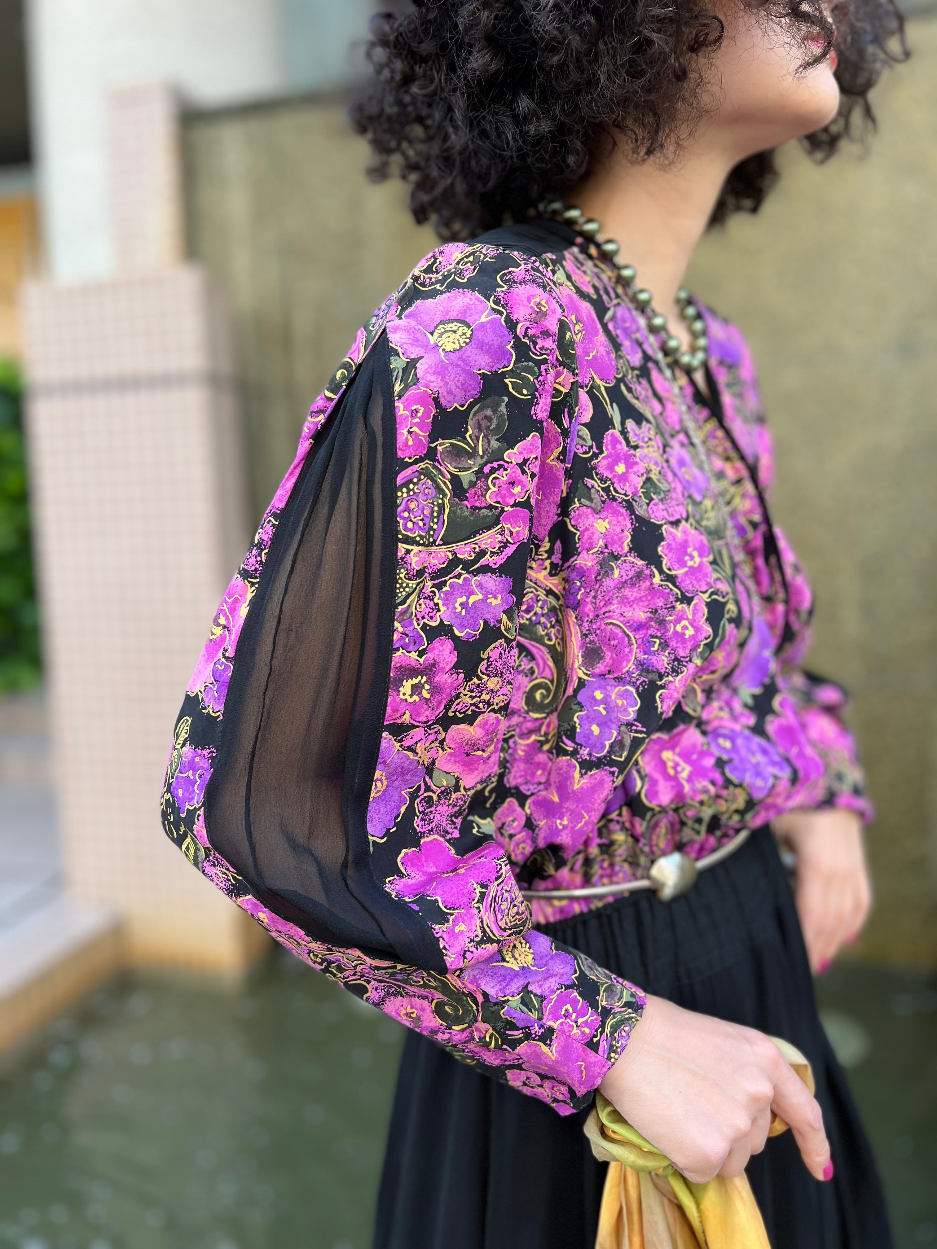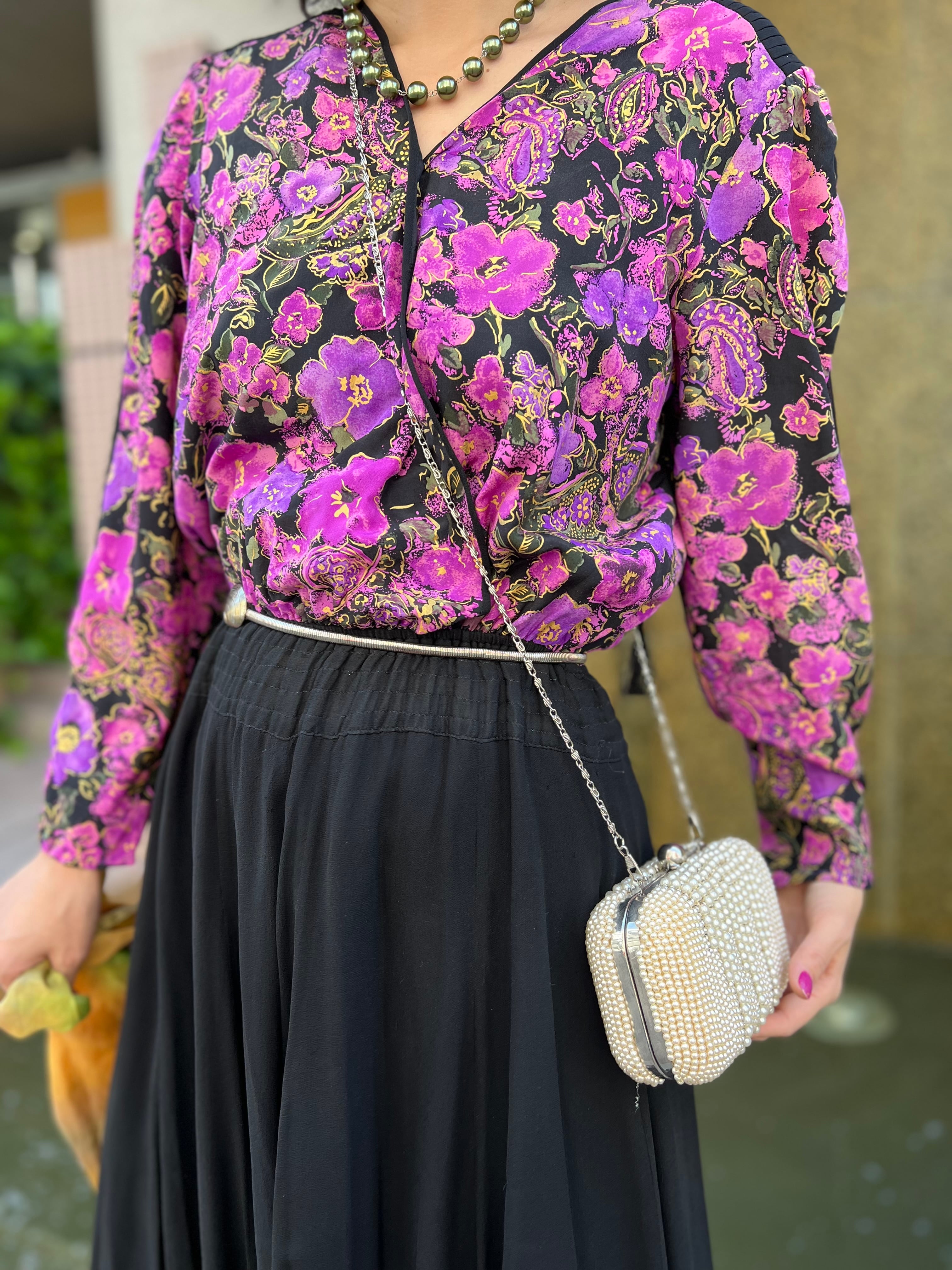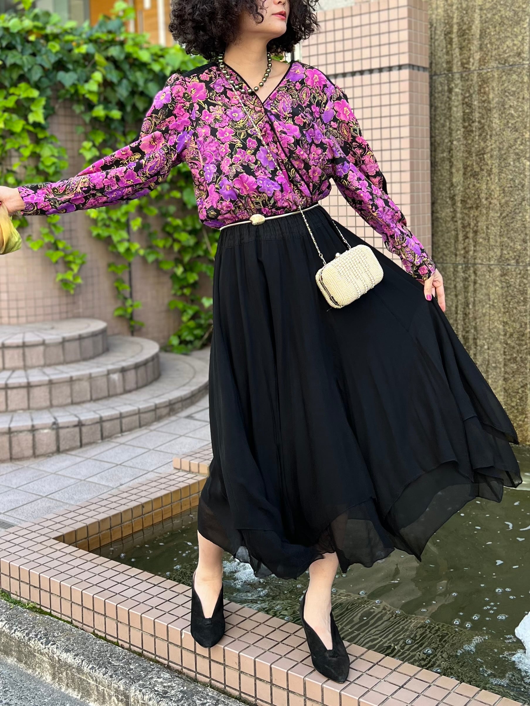 80年代ダイアンのブラック × パープル 花柄 シルクワンピースになります。