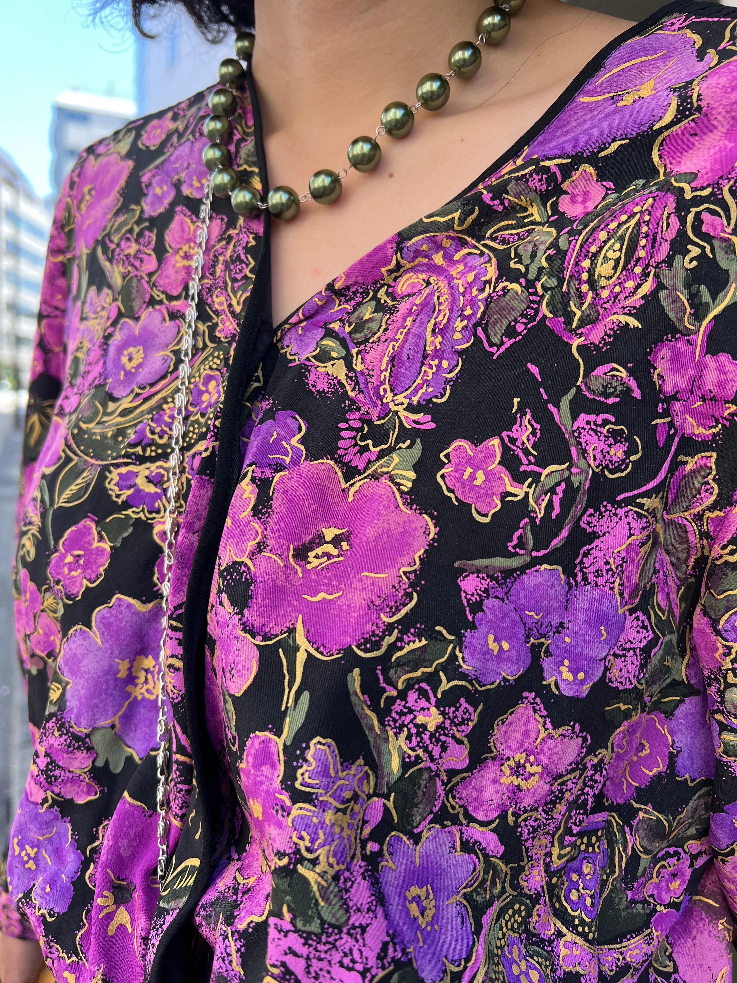 80s Diane freis purple × black cache-coeur silk dress ( ダイアンフレイス パープル × ブラック 花柄 シルク ワンピース )