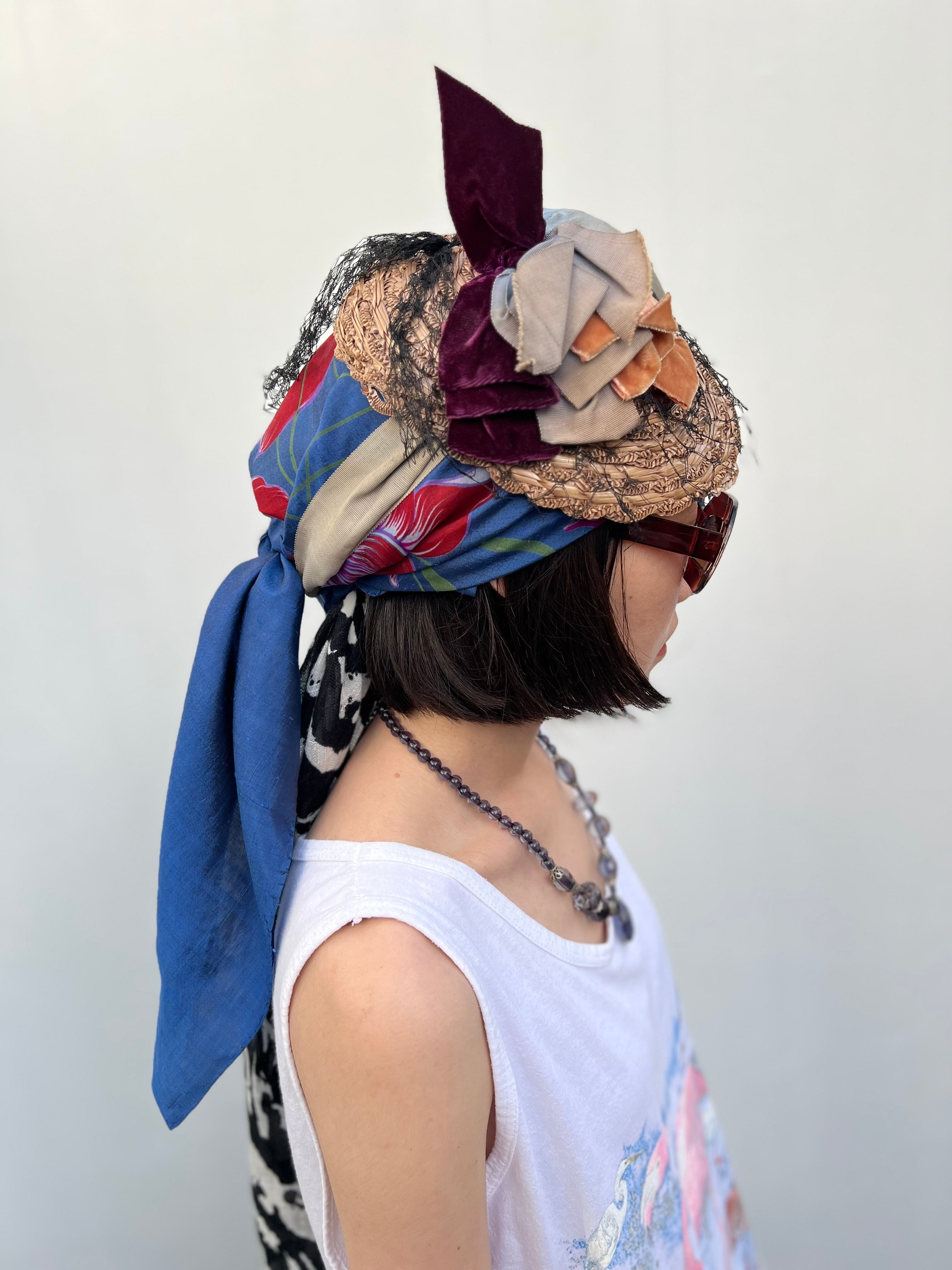 Vintage Thai silk navy × floral scarf ( ヴィンテージ タイシルク ネイビー × 花柄 スカーフ )