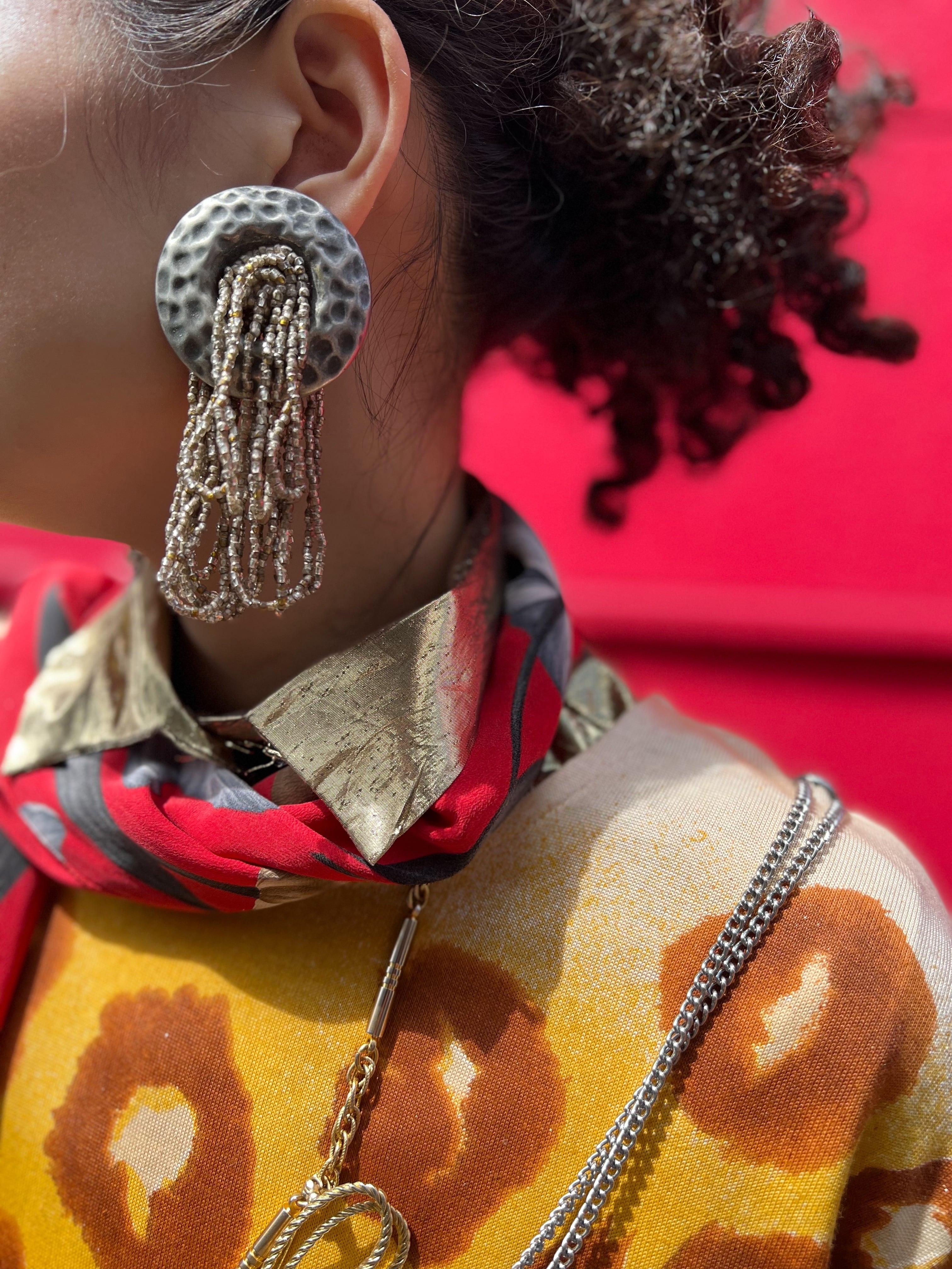 ヴィンテージ レッド × グレー ブラウン 花柄 シルクスカーフになります。