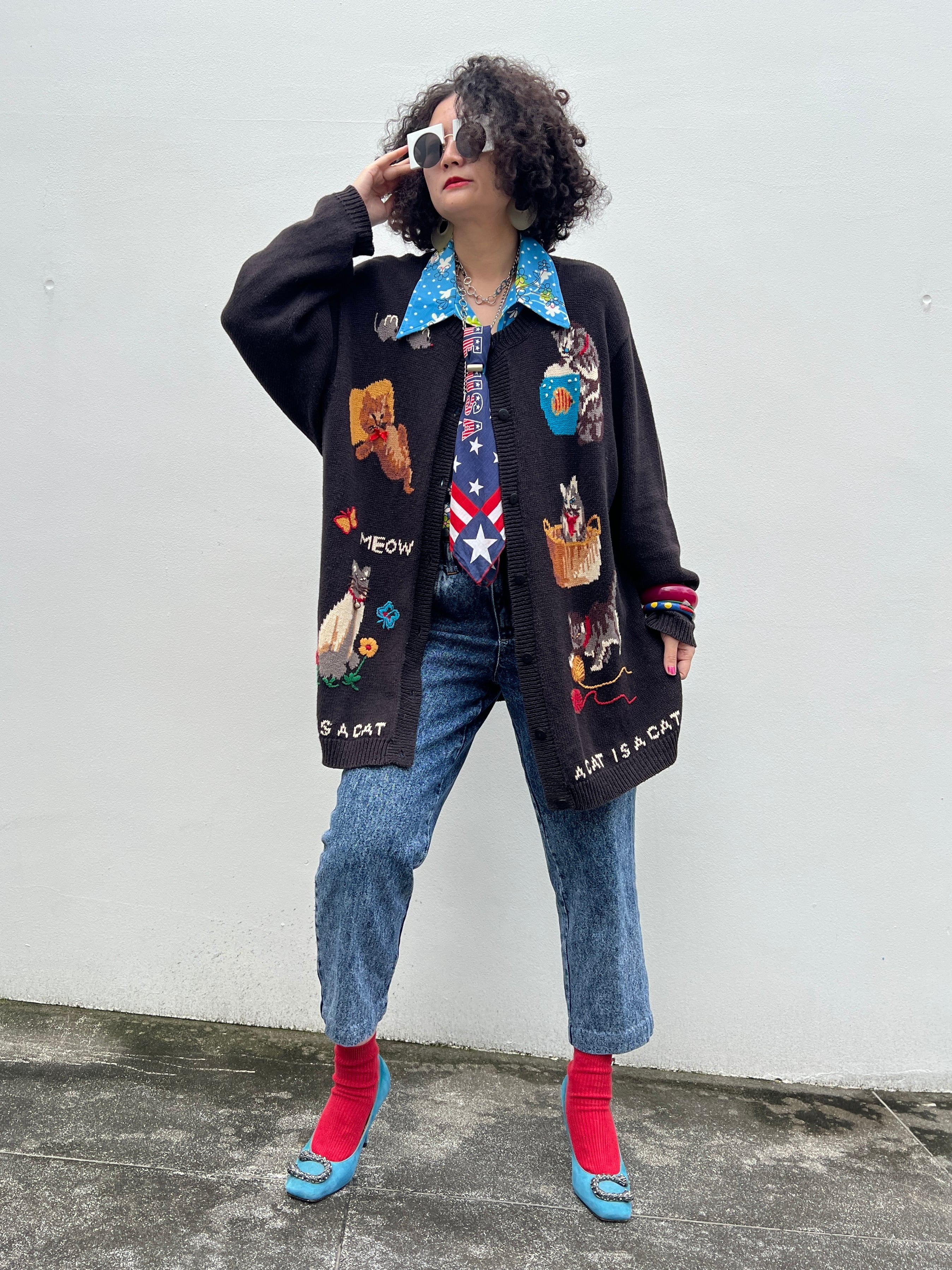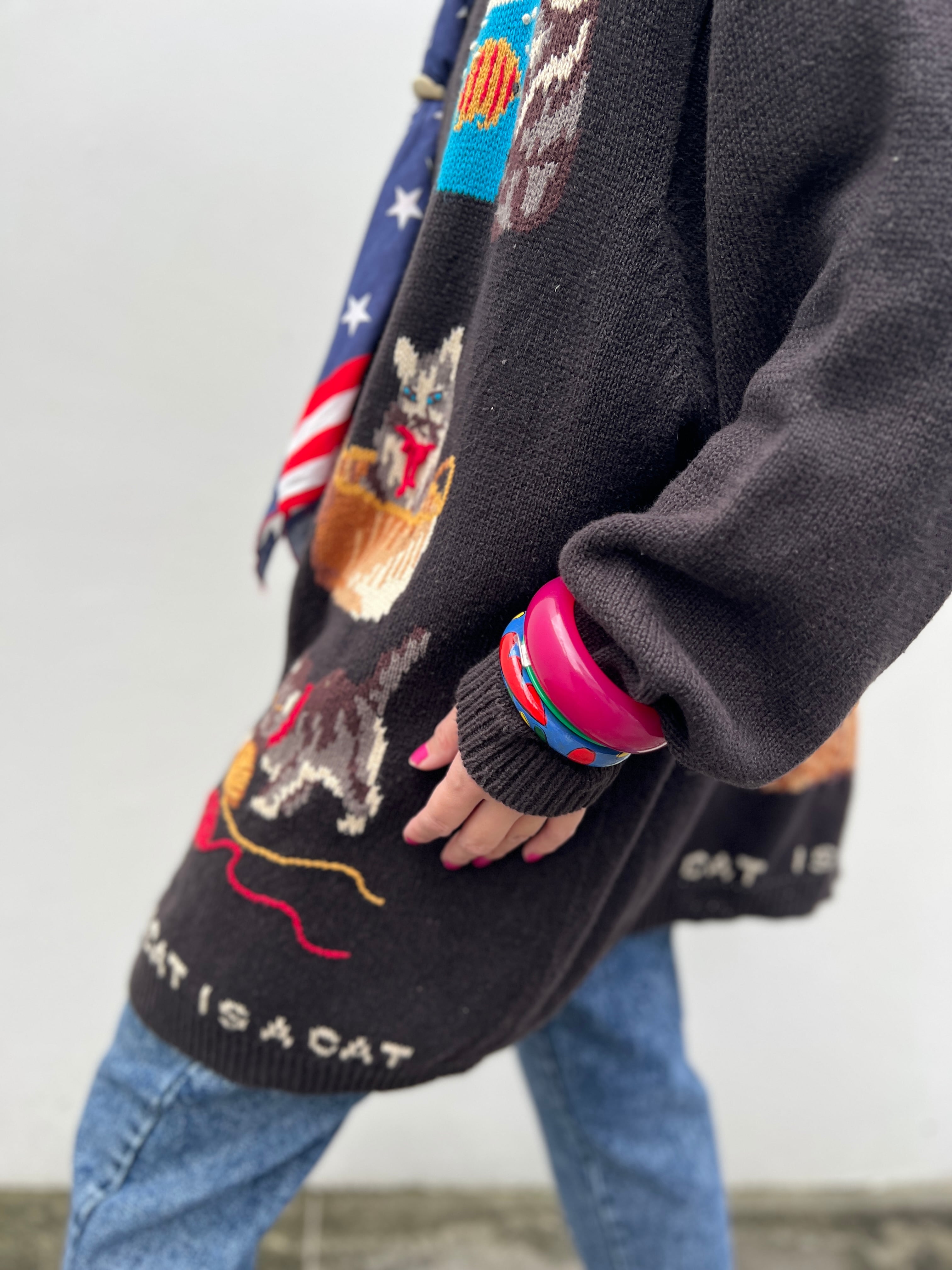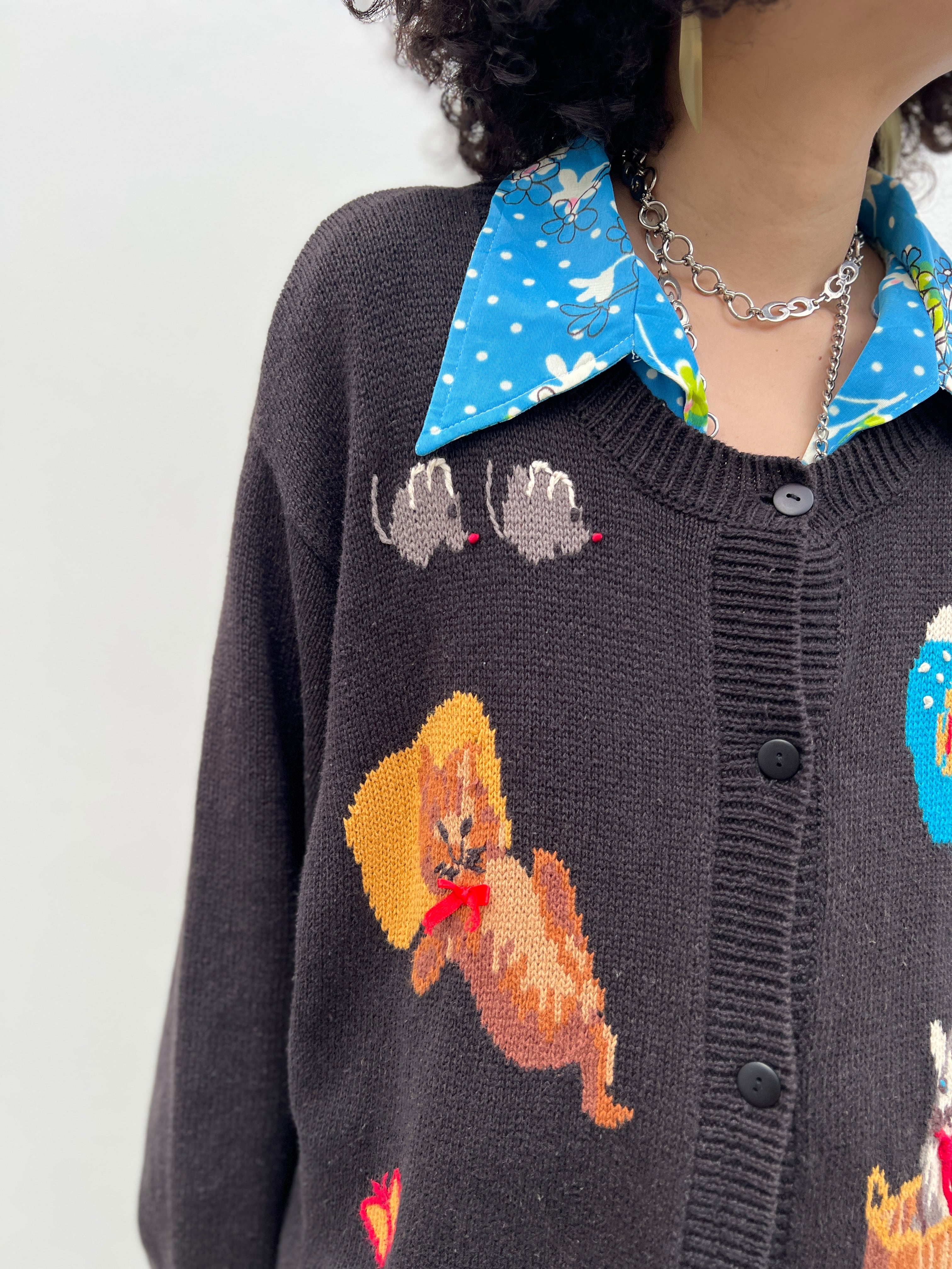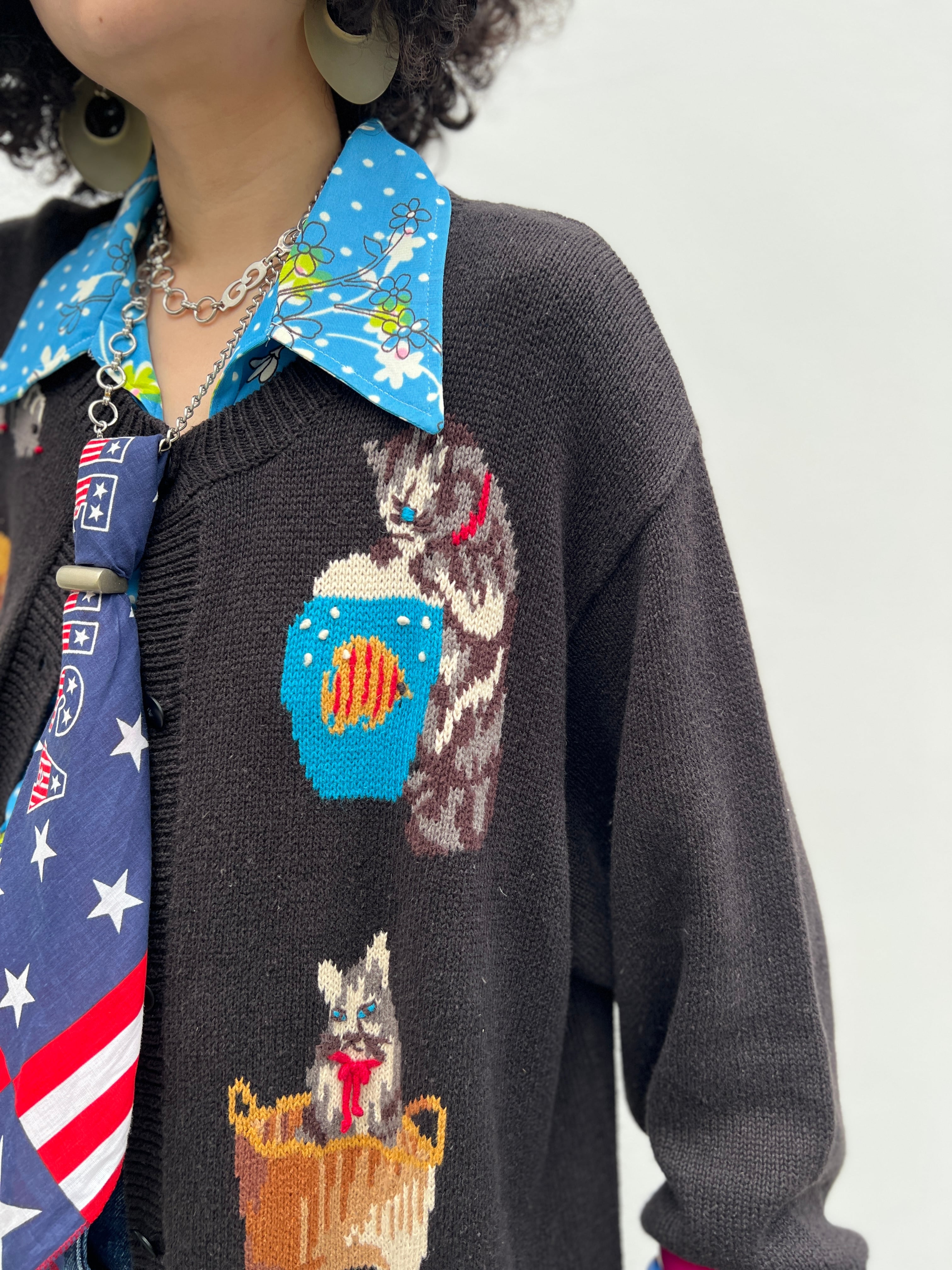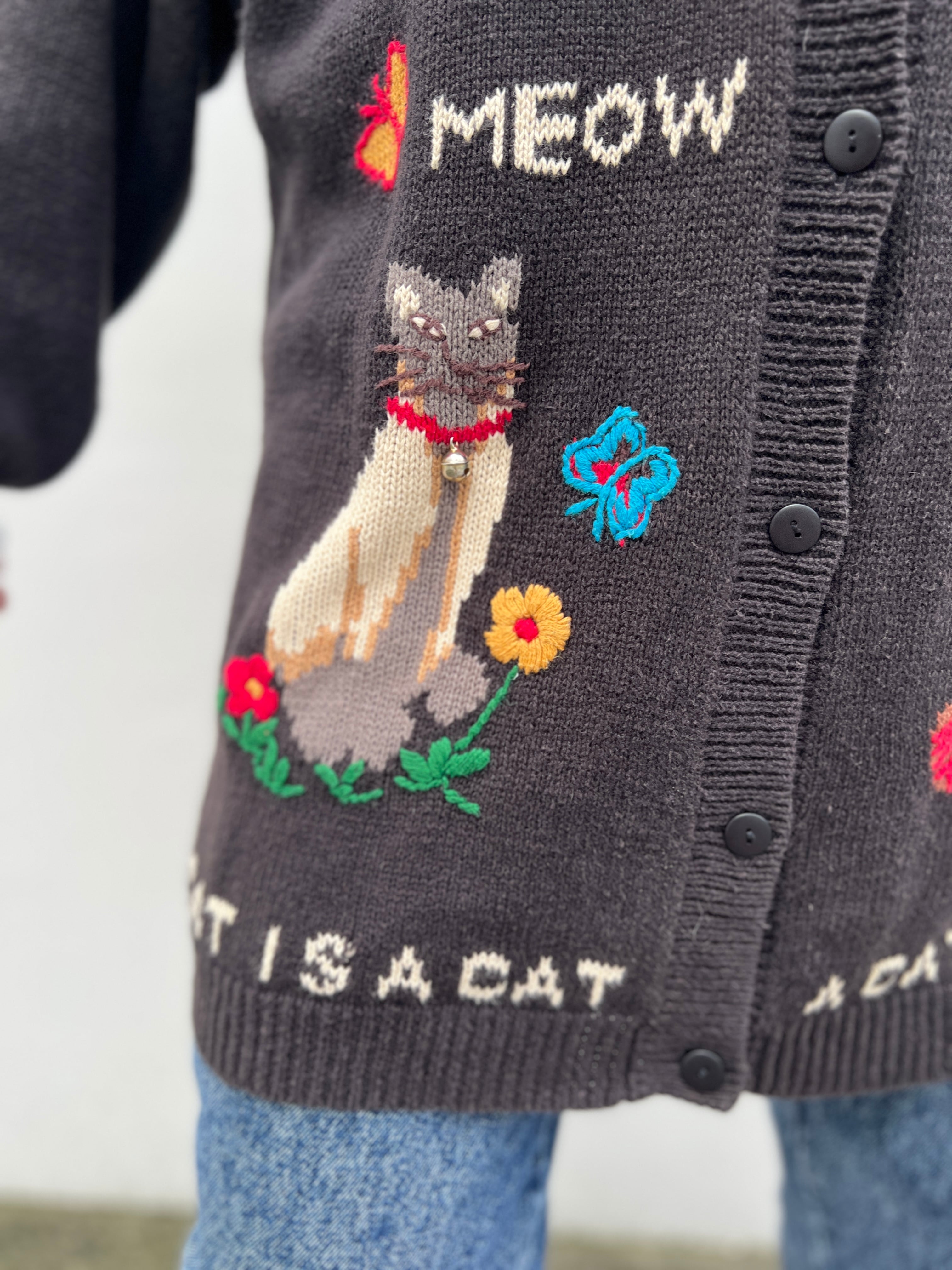 Vintage big size black × ramie cotton cat cardigan