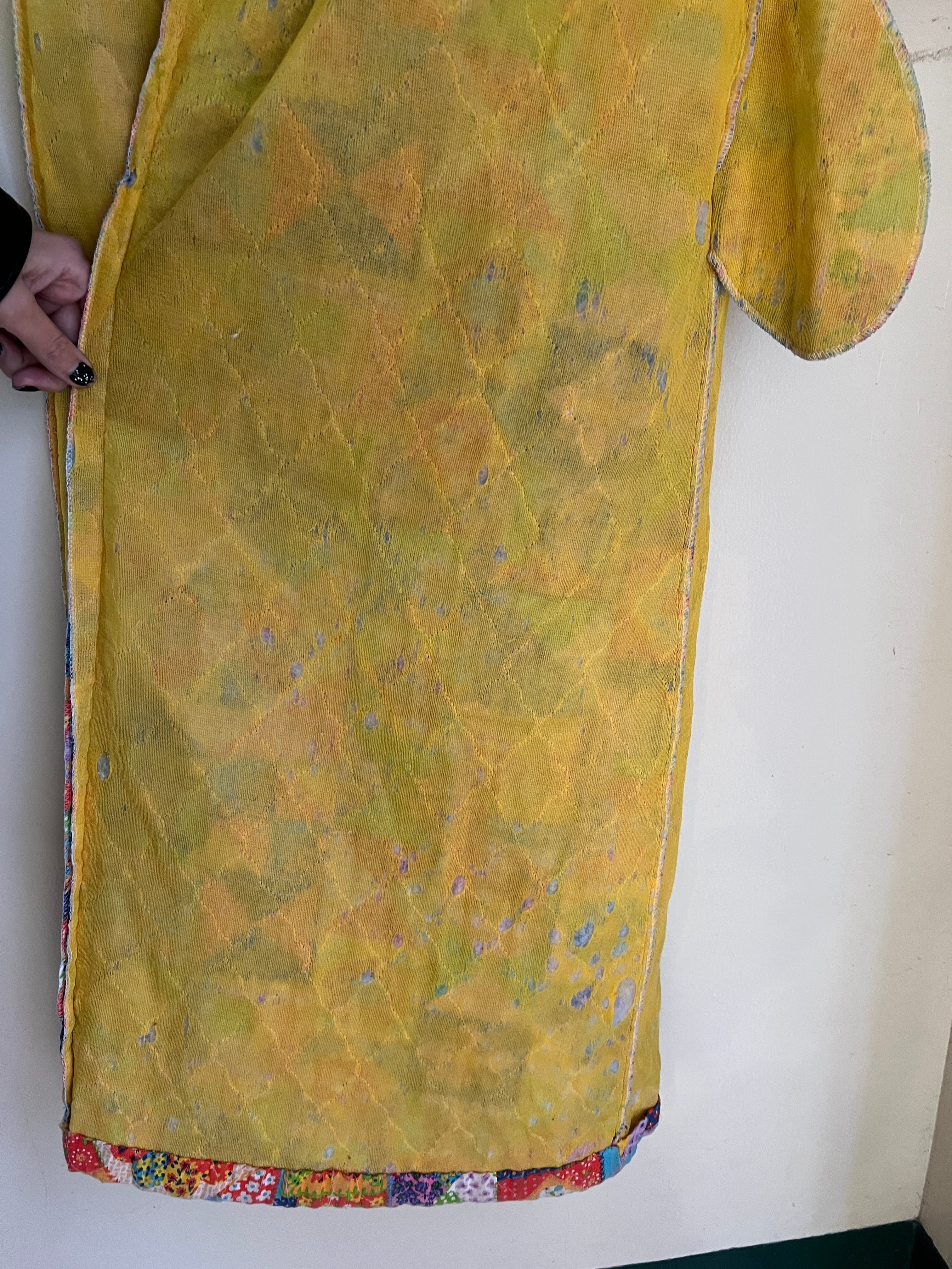 表地にキルティングの糸きれ、二枚仕立ての内側のイエローの生地に全体的に複数箇所の穴がございます。神経質な方はご遠慮ください。