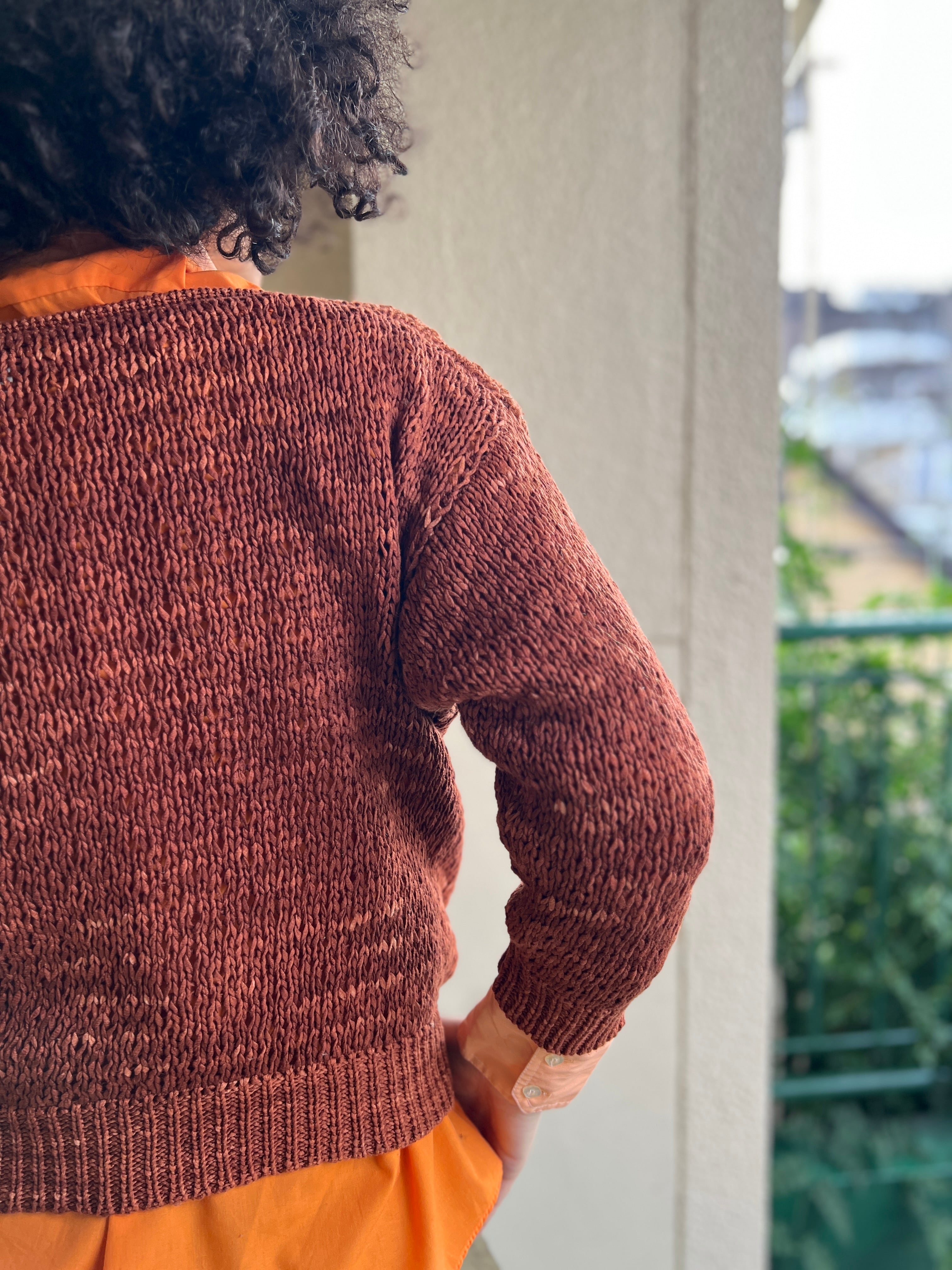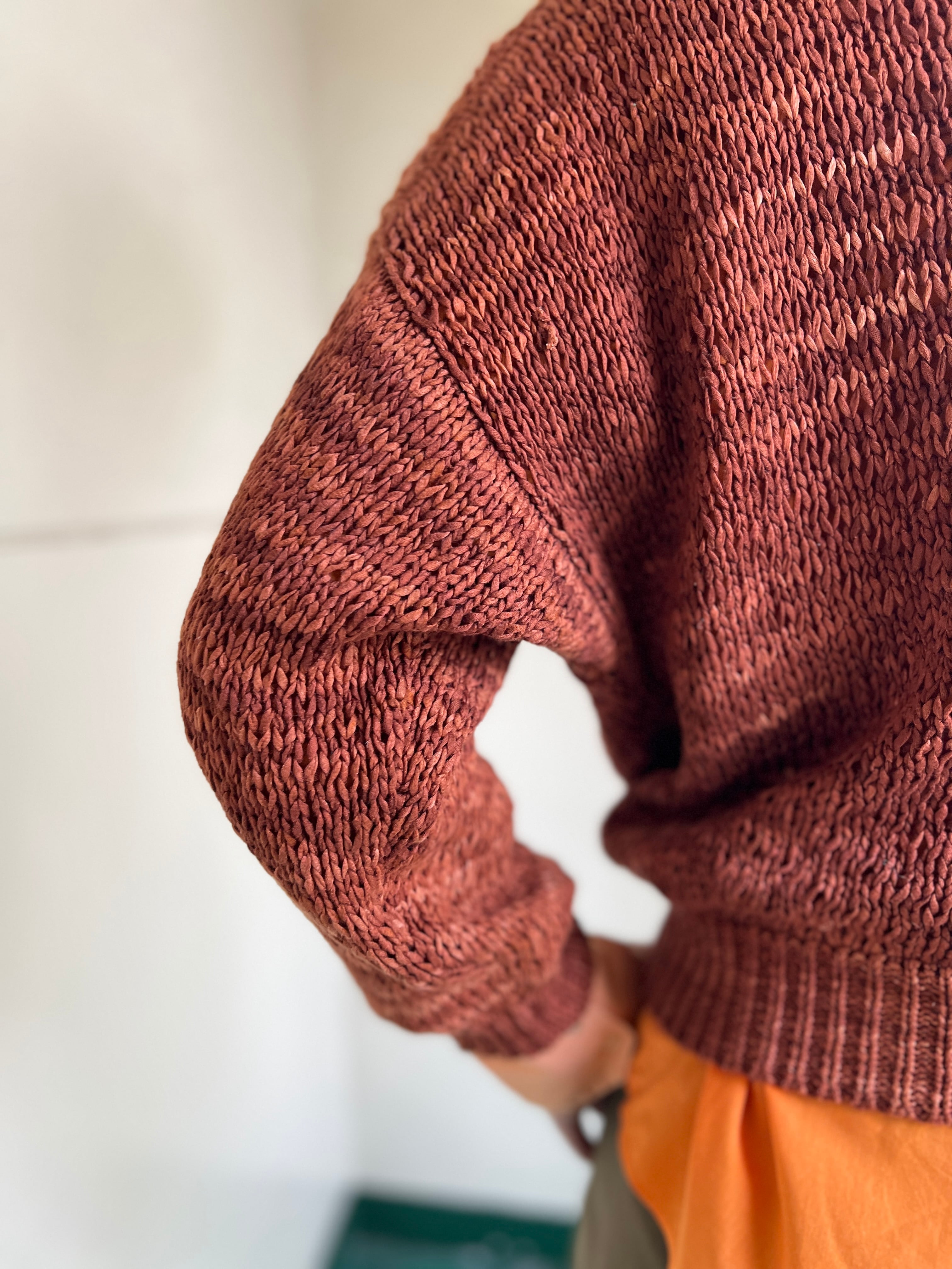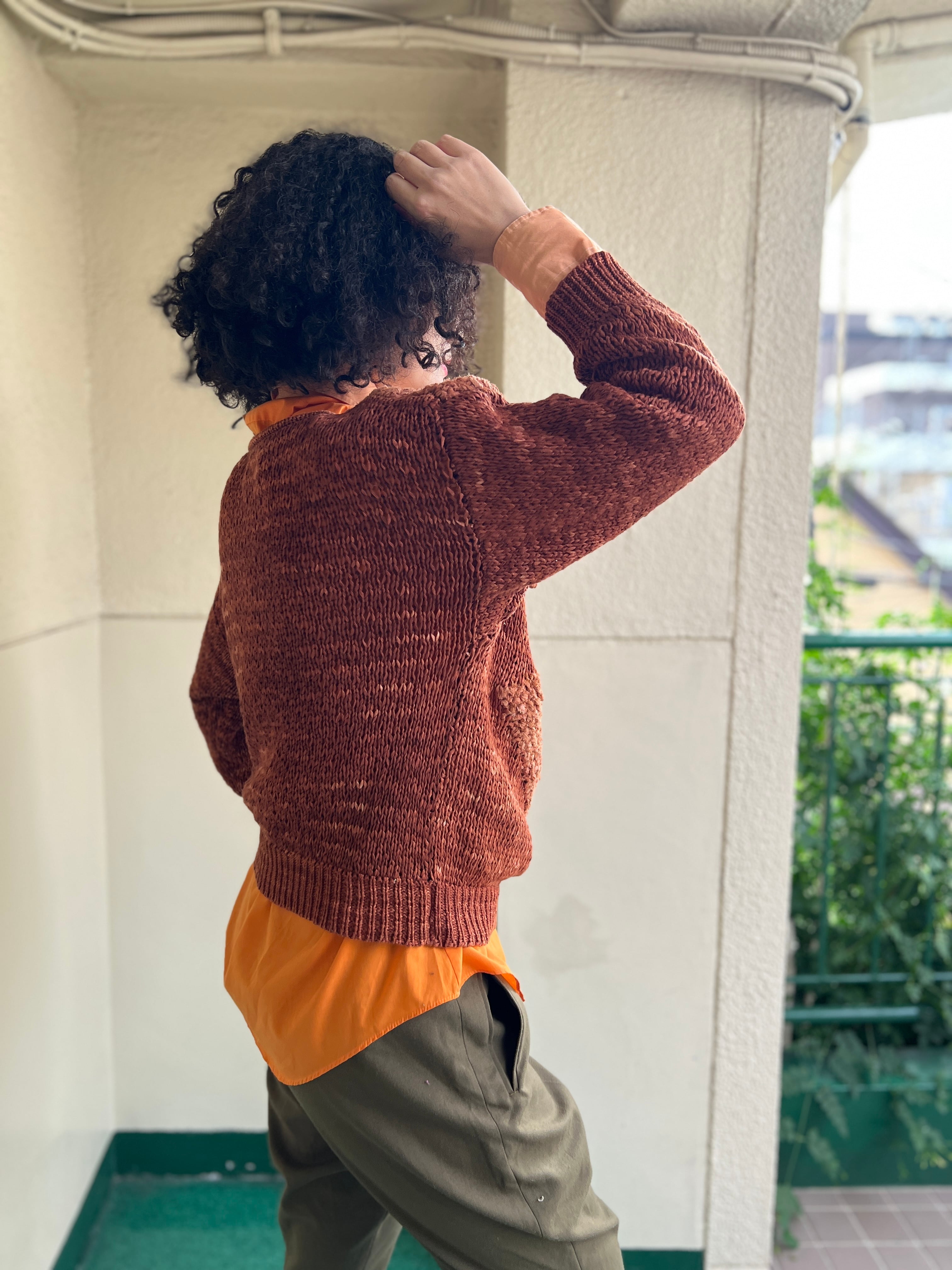 落ち着いたブラウンの濃淡で編まれたバイカラーデザインは、シンプルなニットとは一線を画す印象です。