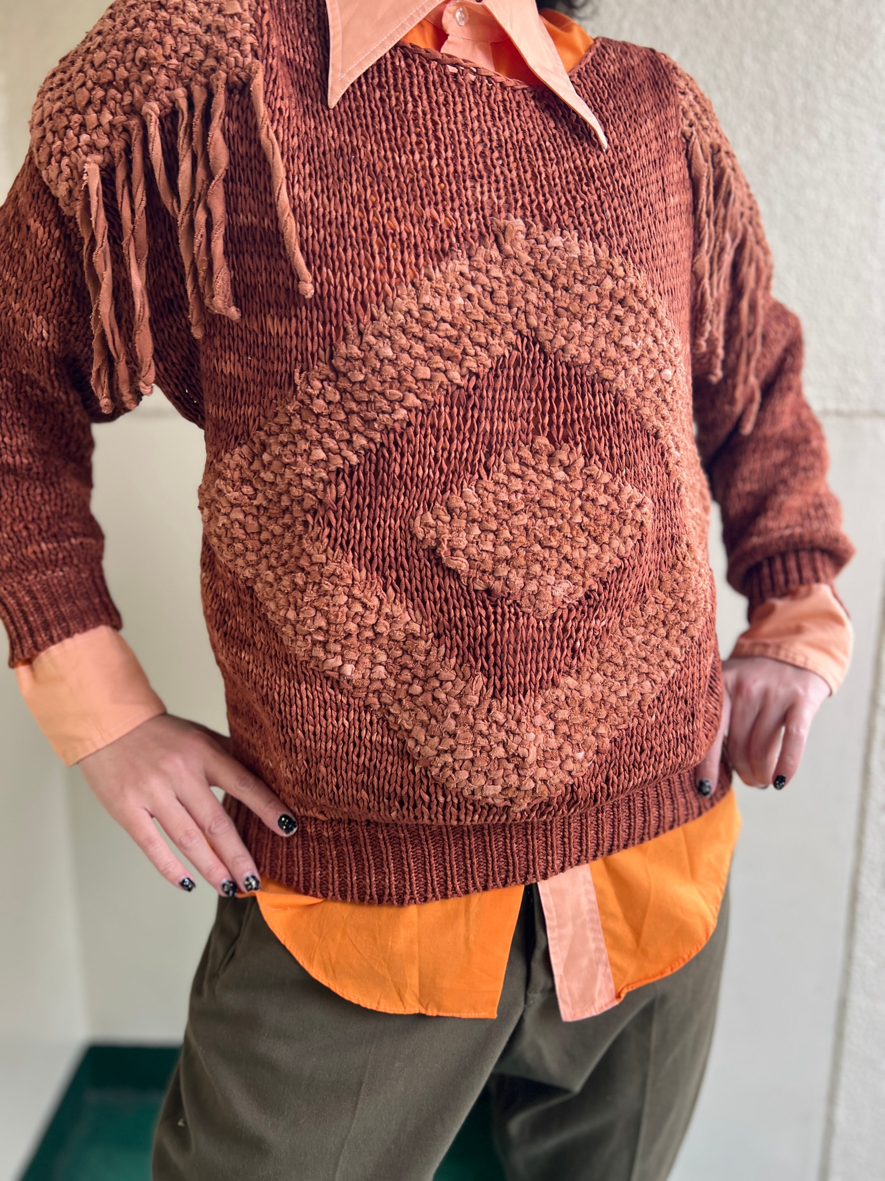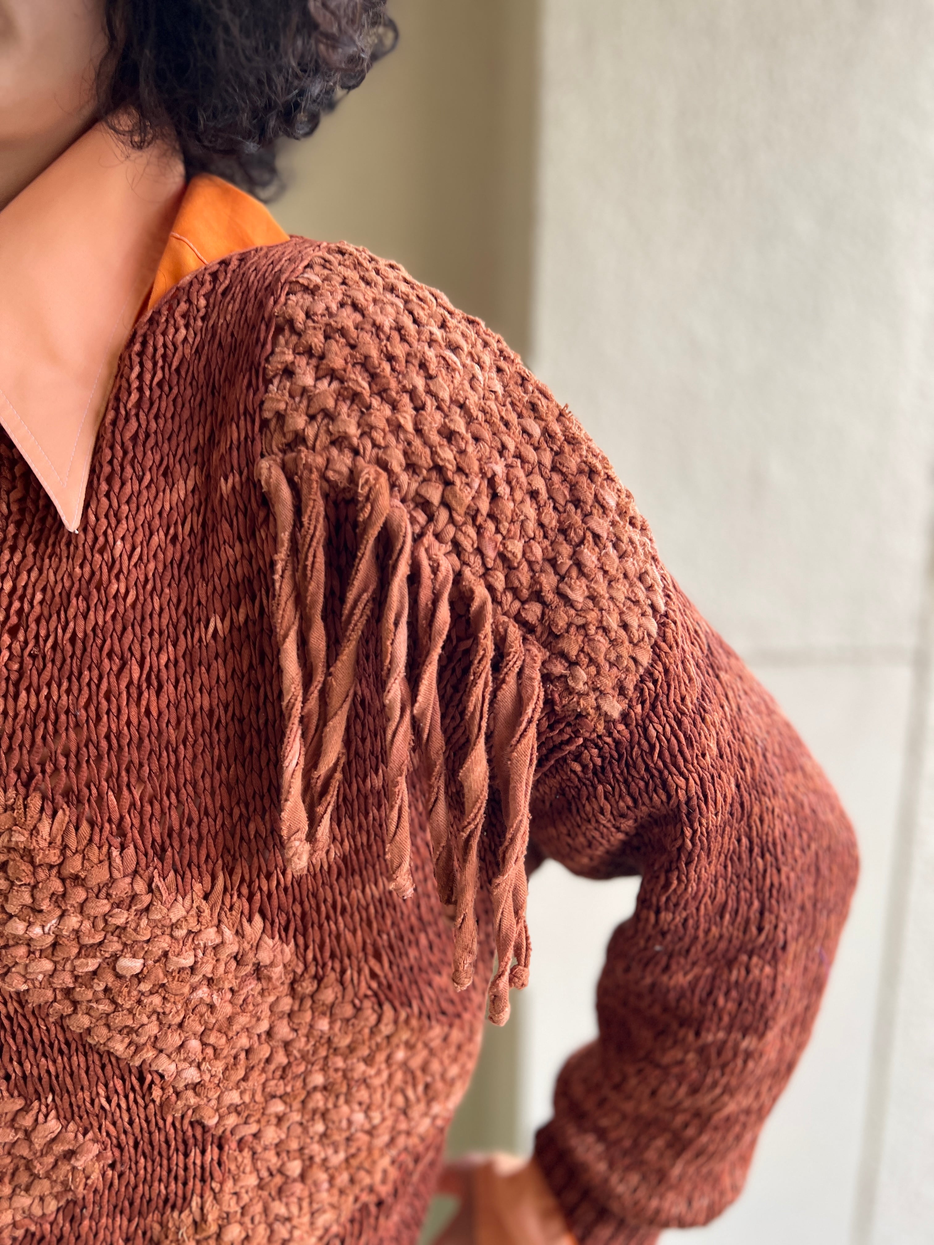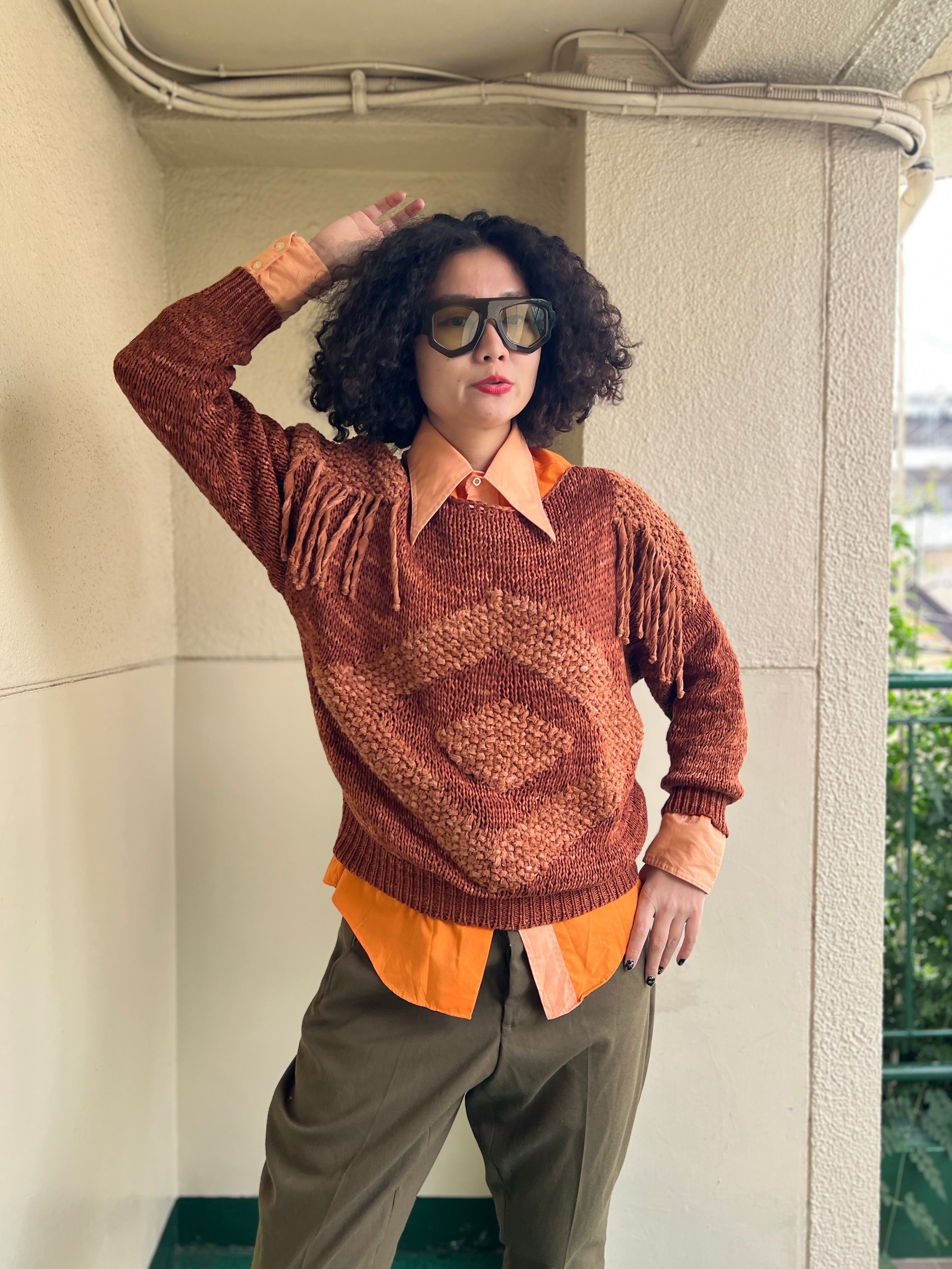 80年代イタリア製の、存在感たっぷりなテラコッタカラーのフリンジコットンニット。