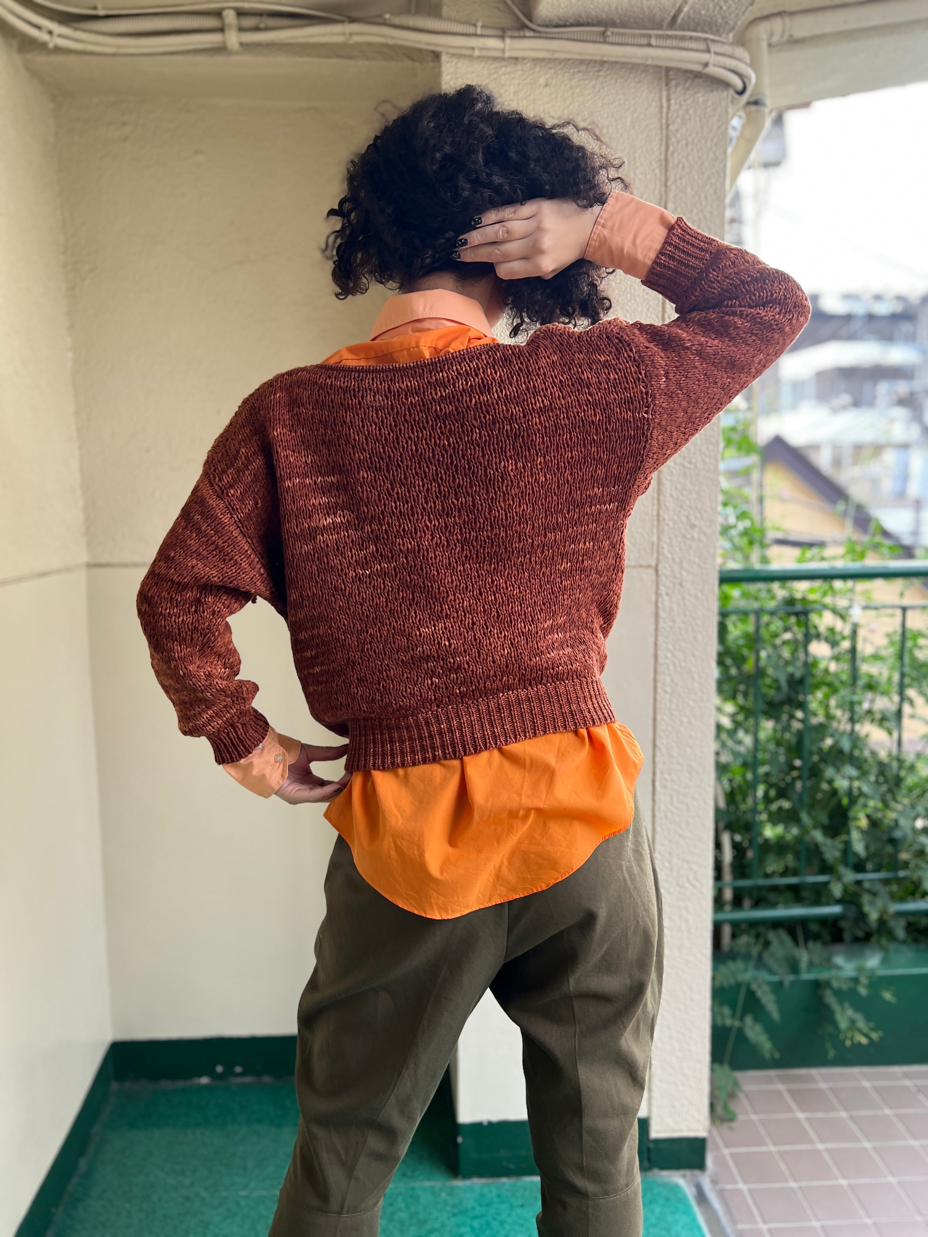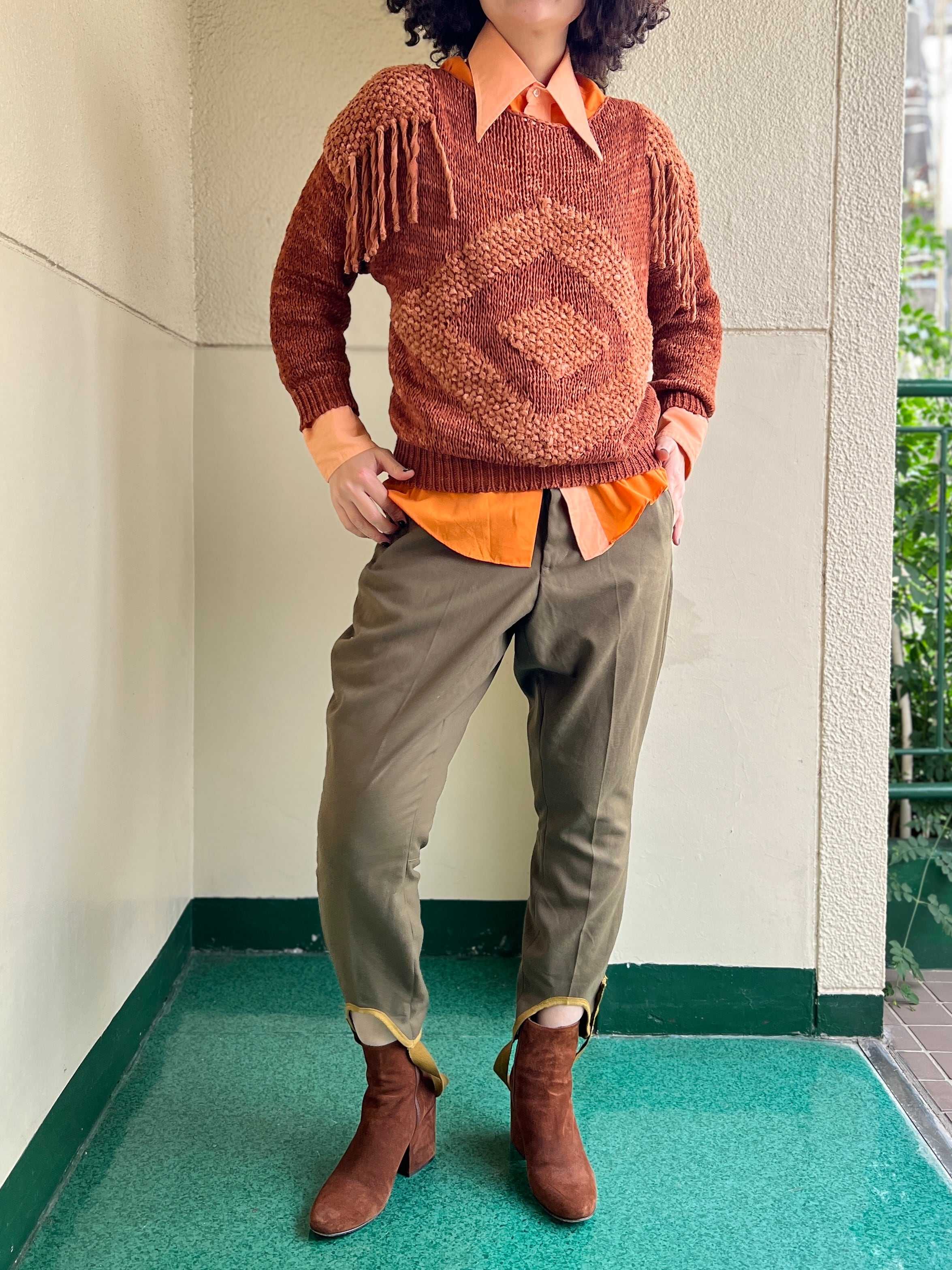 80s ITALY × terracotta fringe cotton knit tops ( ヴィンテージ イタリア テラコッタ フリンジ ニット トップス )