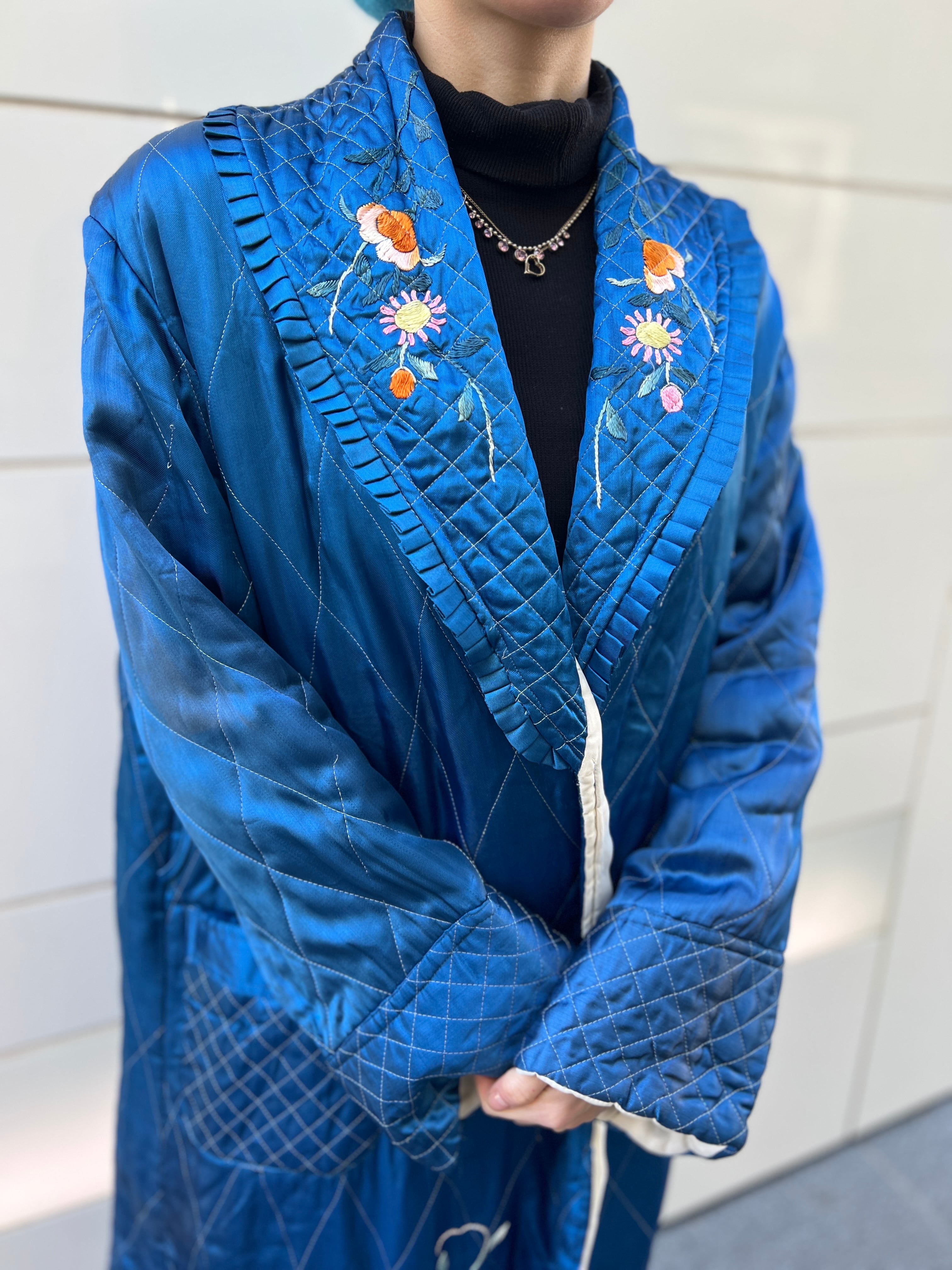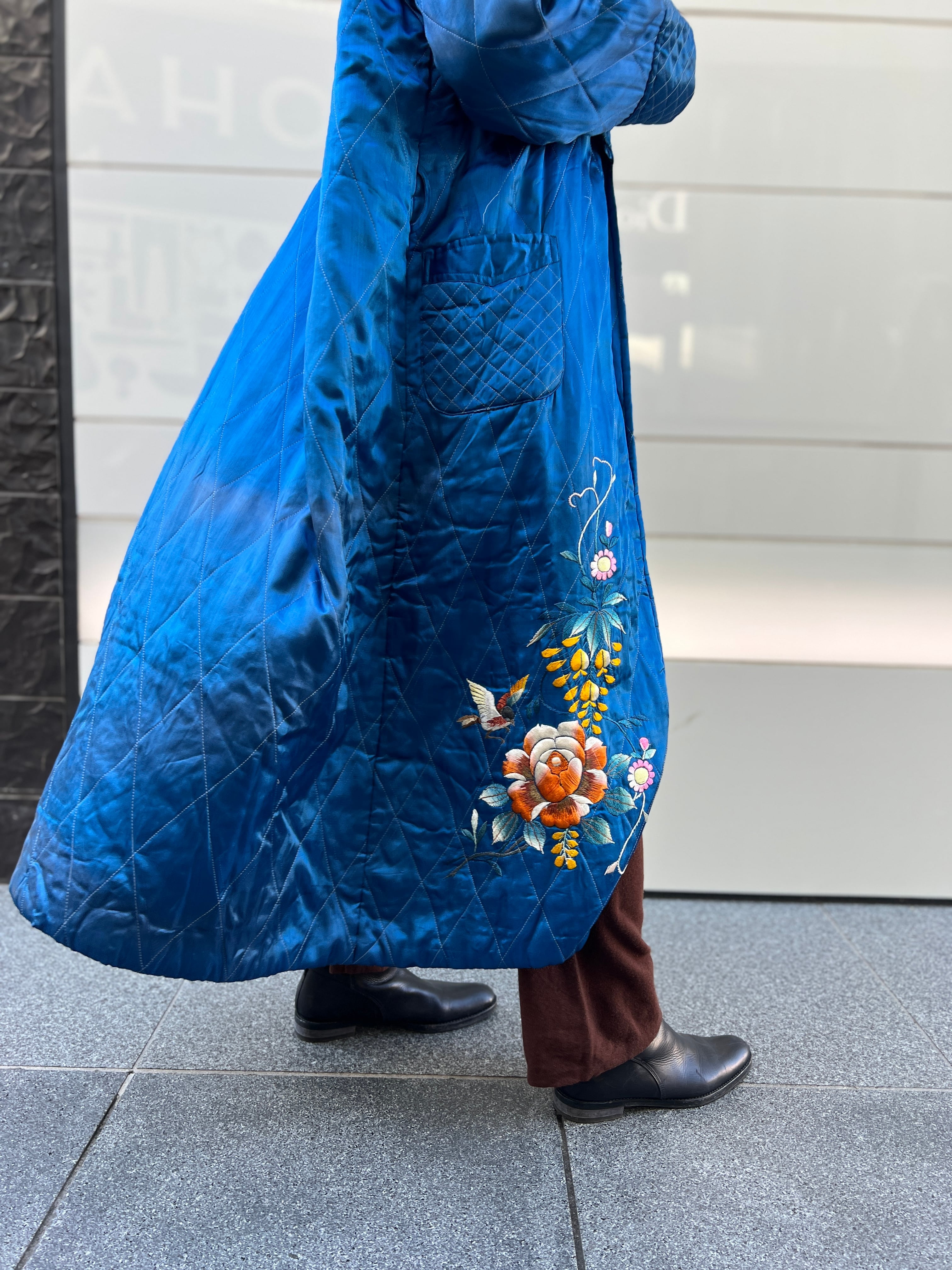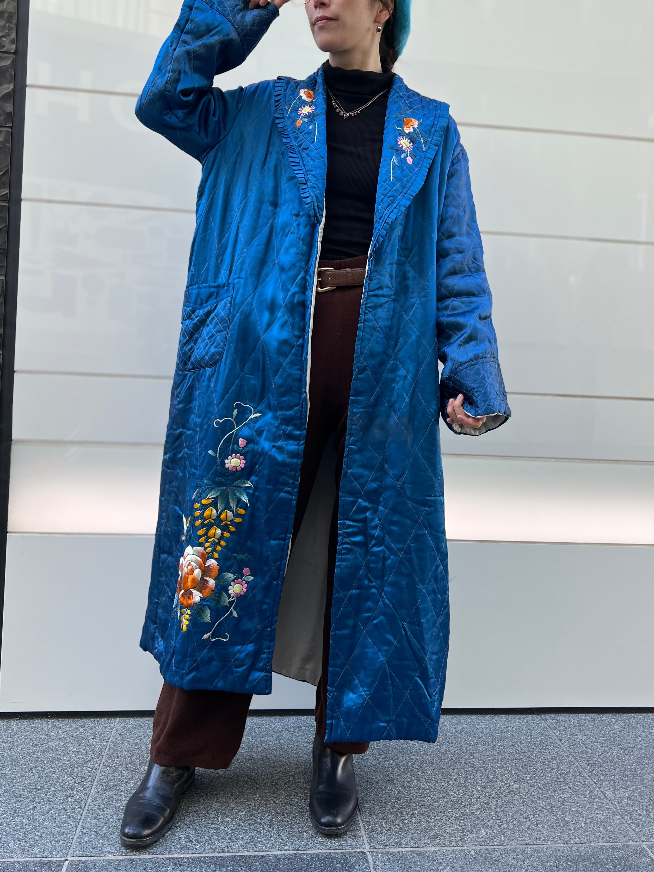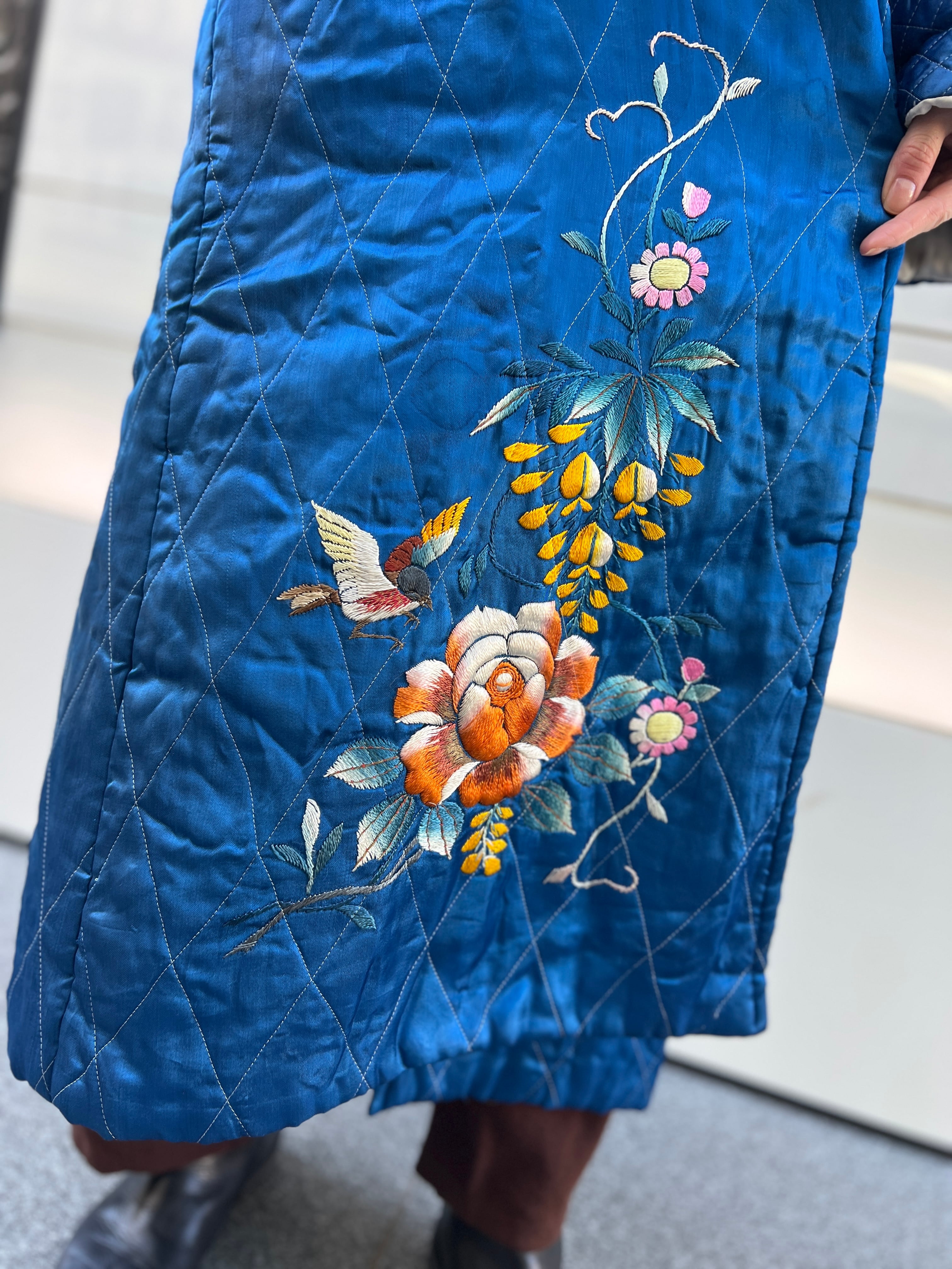 鮮やかなメタリックブルーが目を惹く、ヴィンテージチャイナのキルティングガウン。