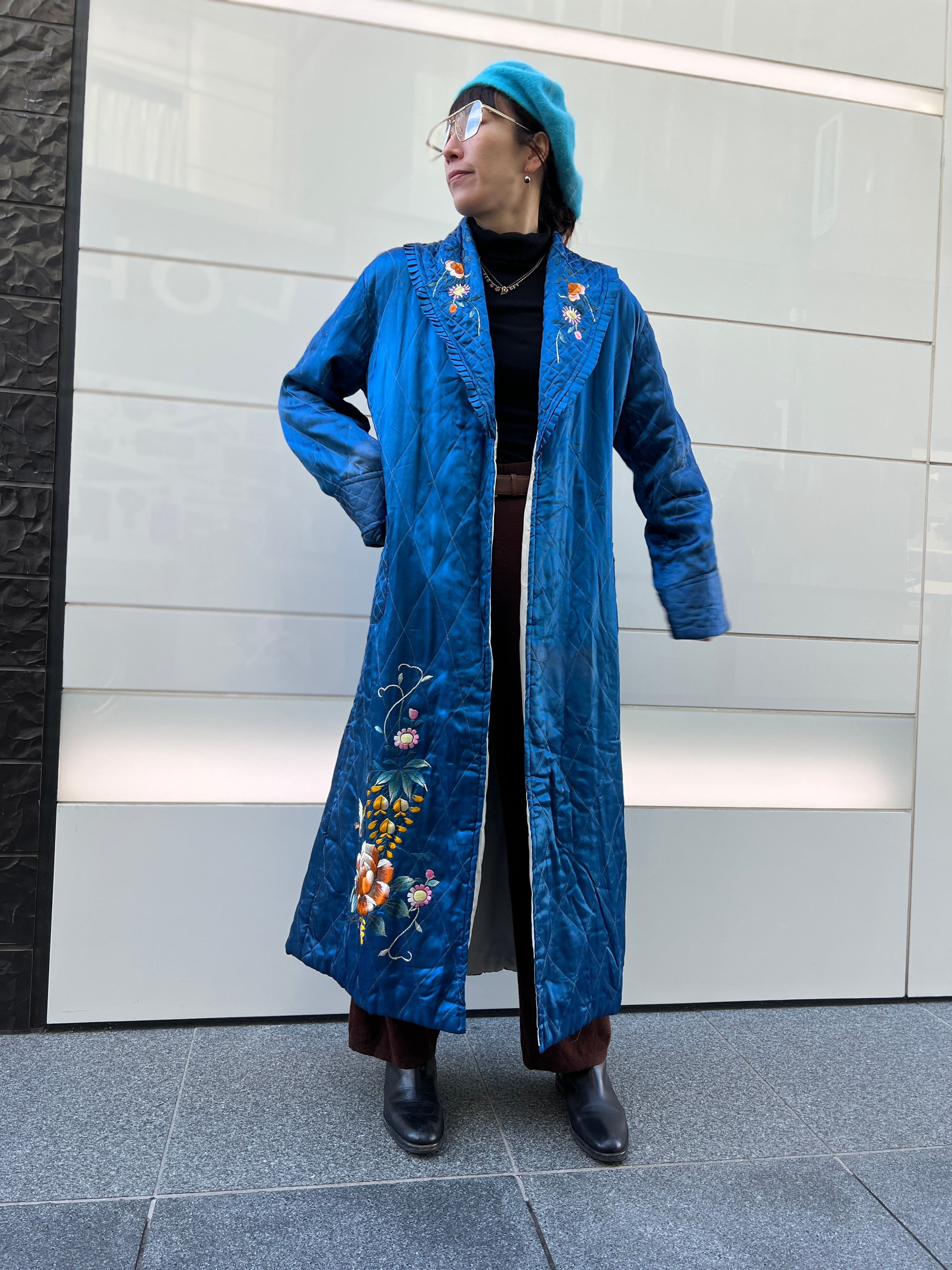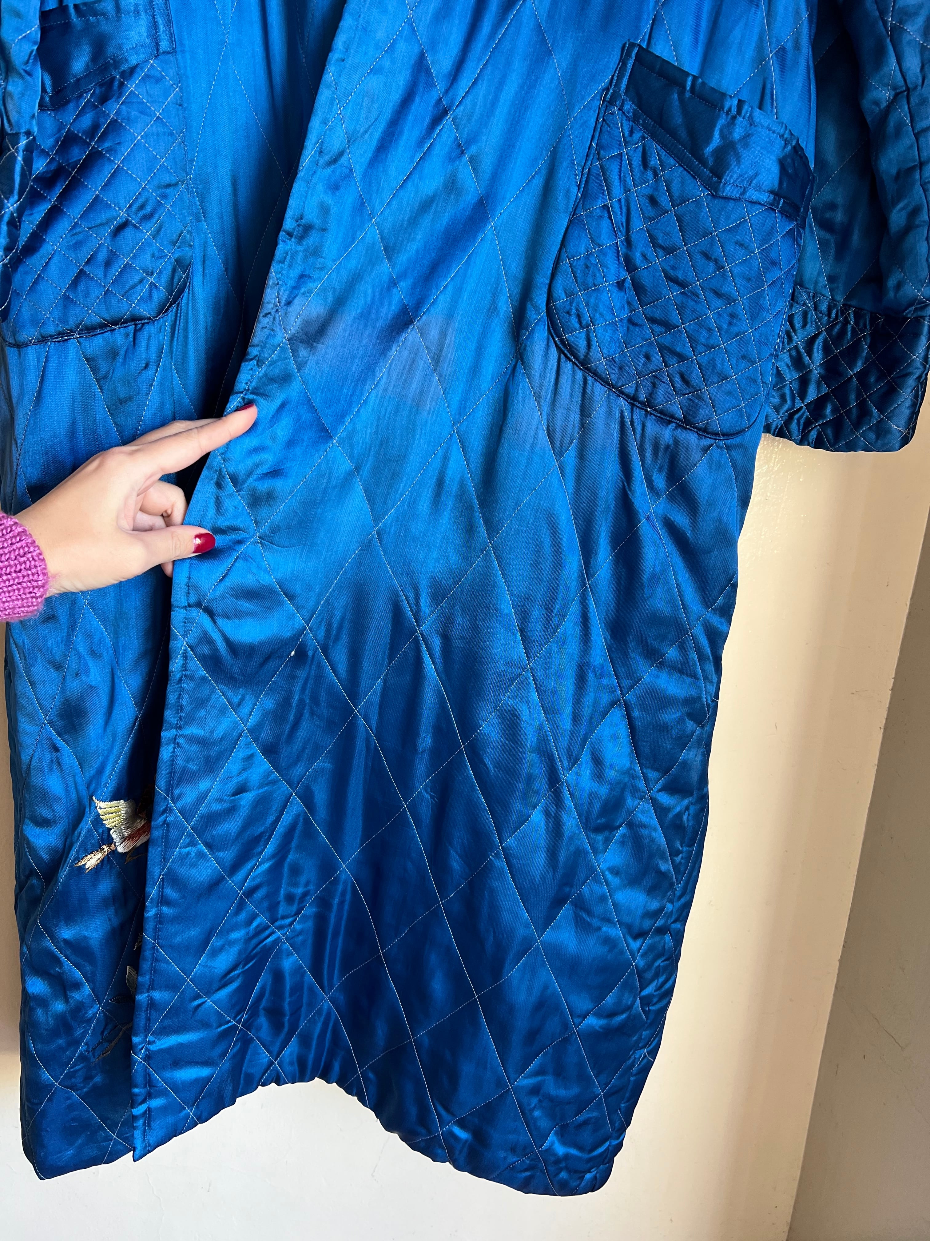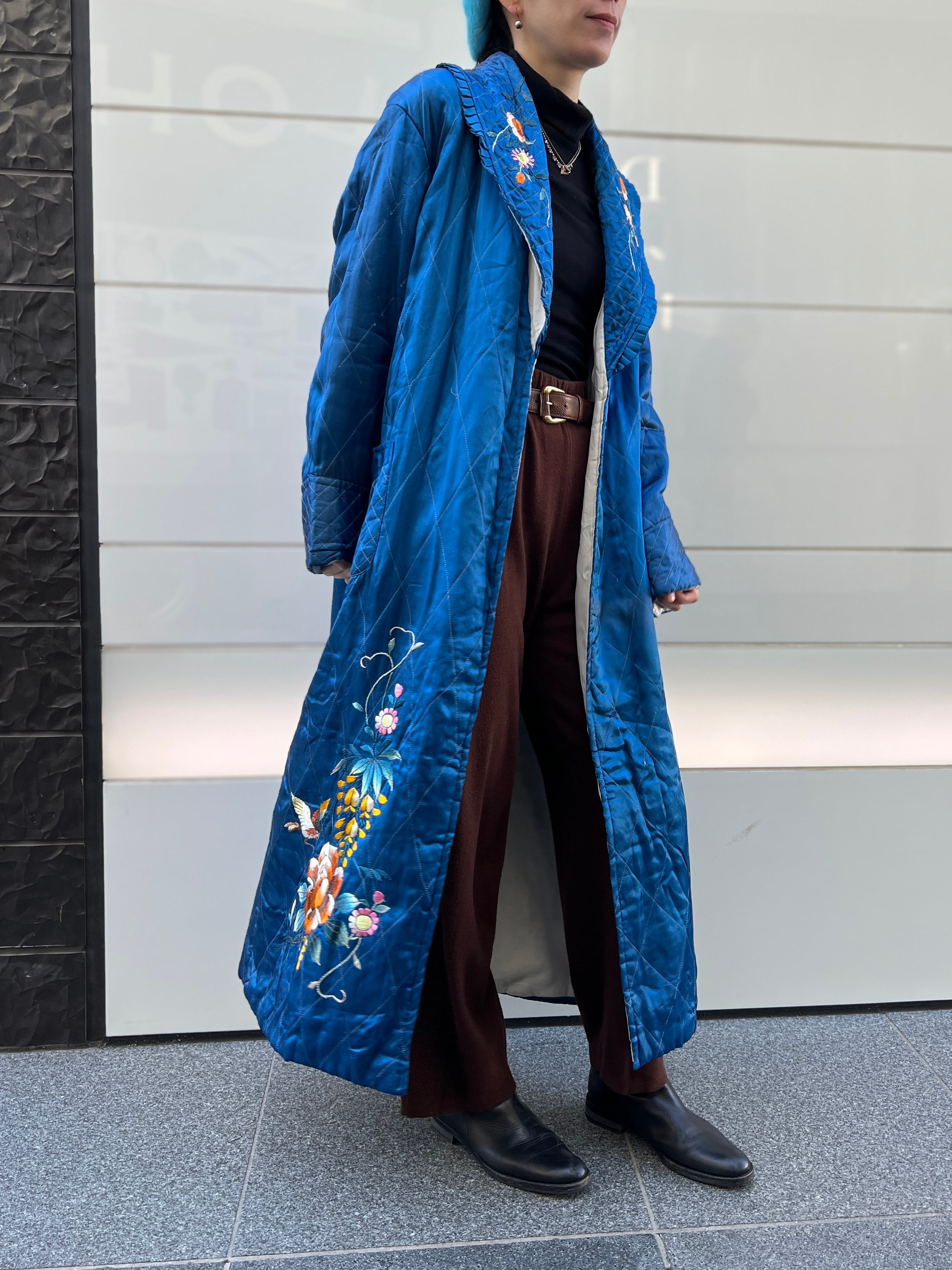 鮮やかなメタリックブルーが目を惹く、ヴィンテージチャイナのキルティングガウン。