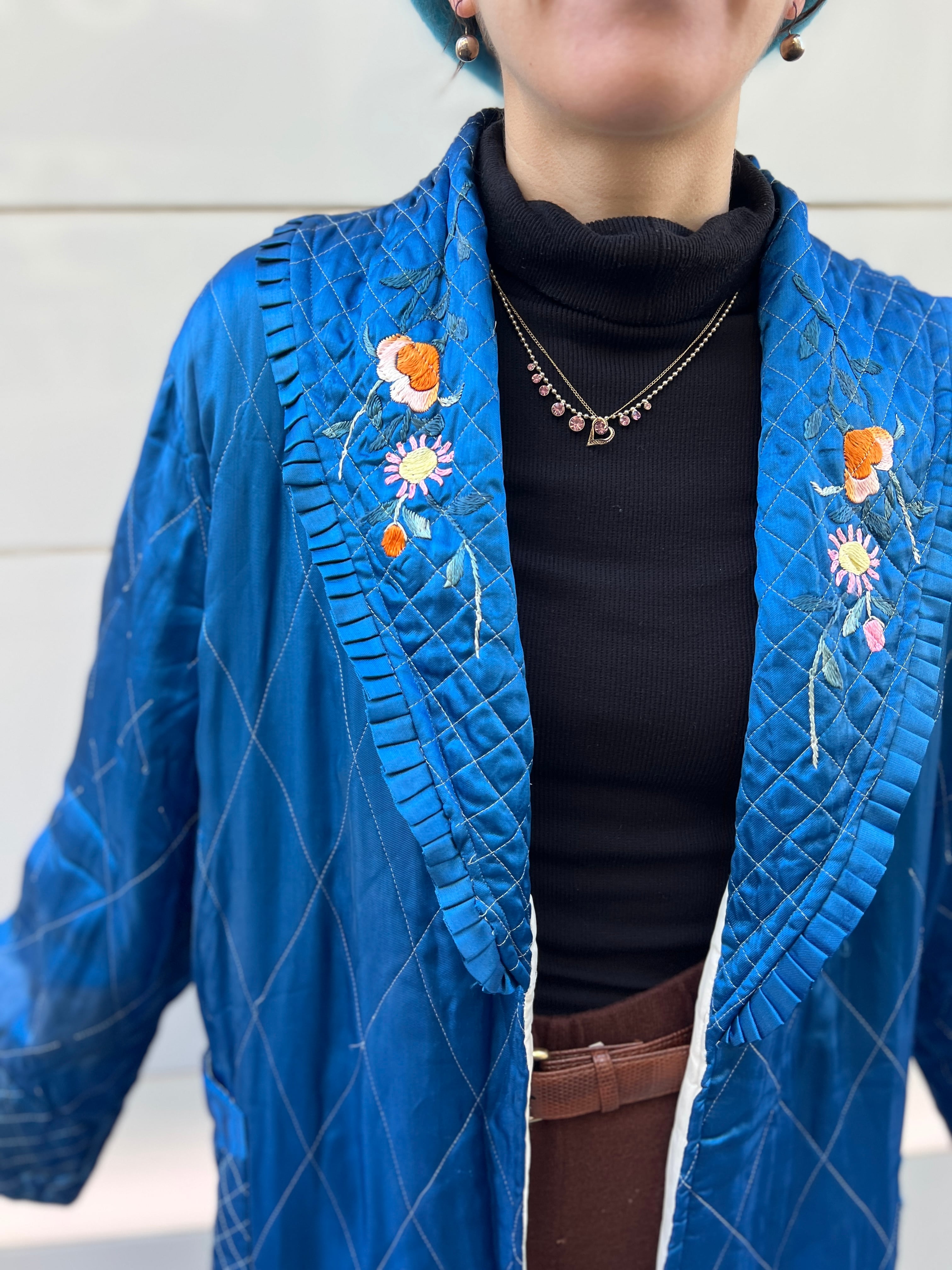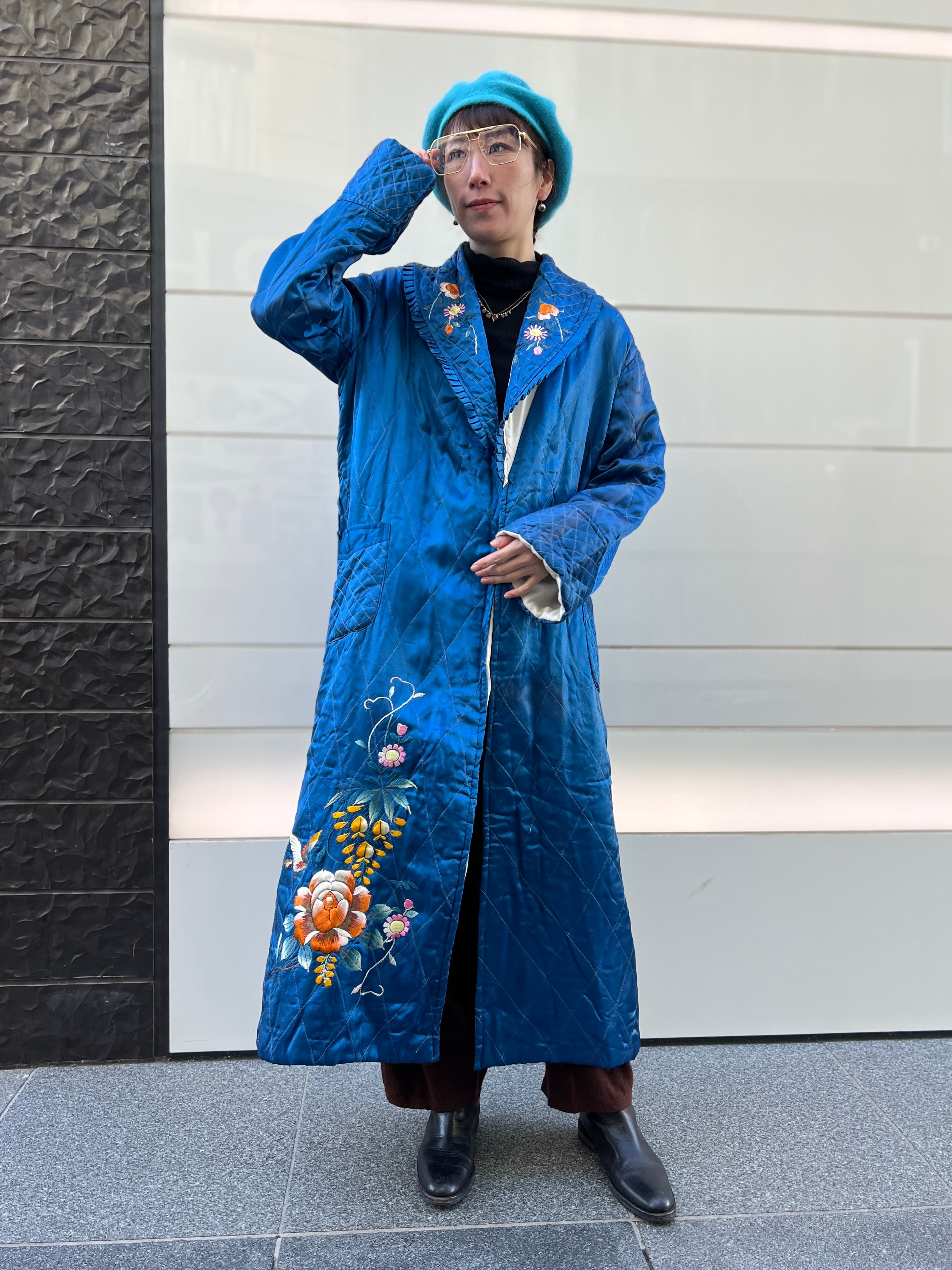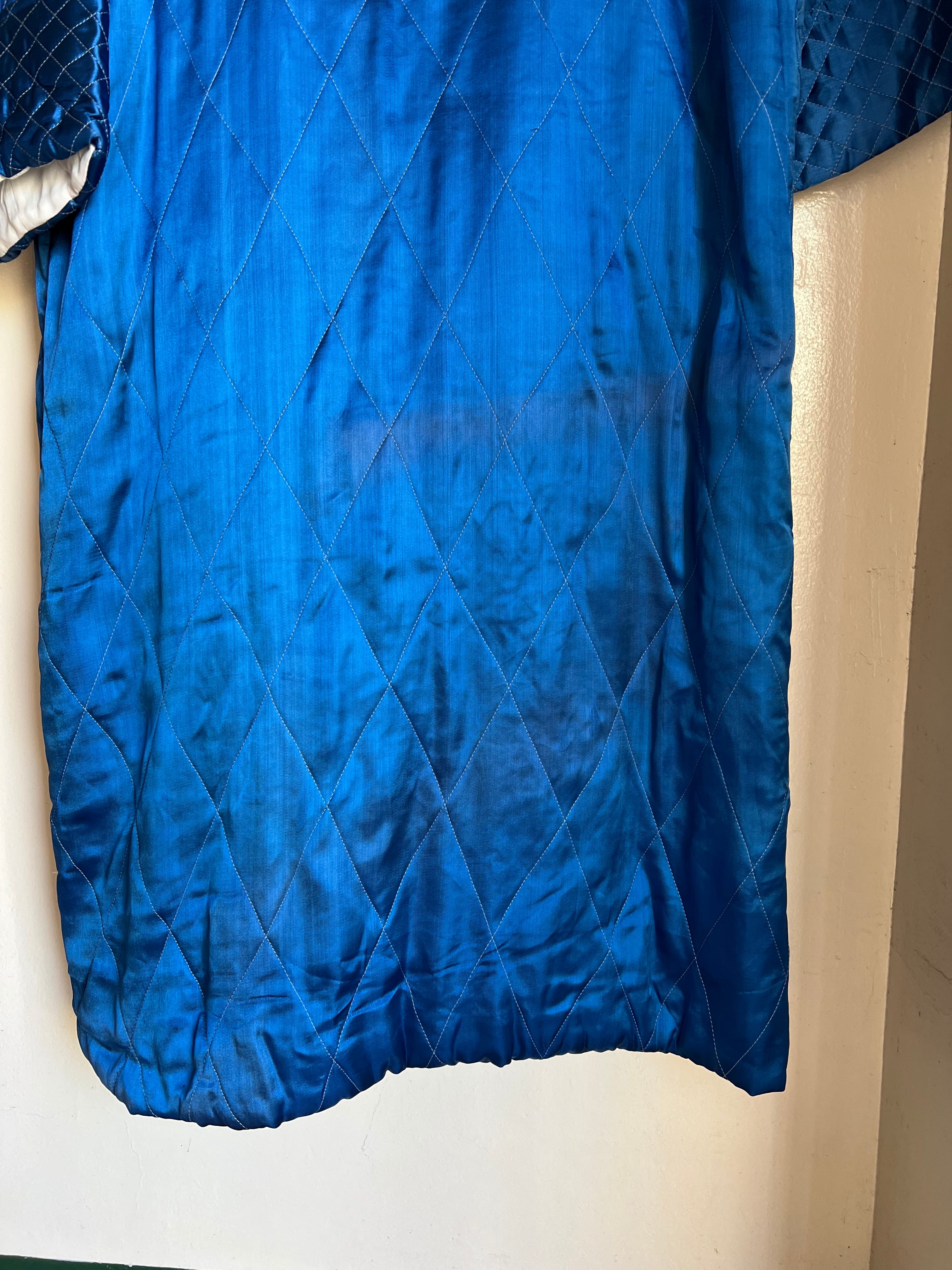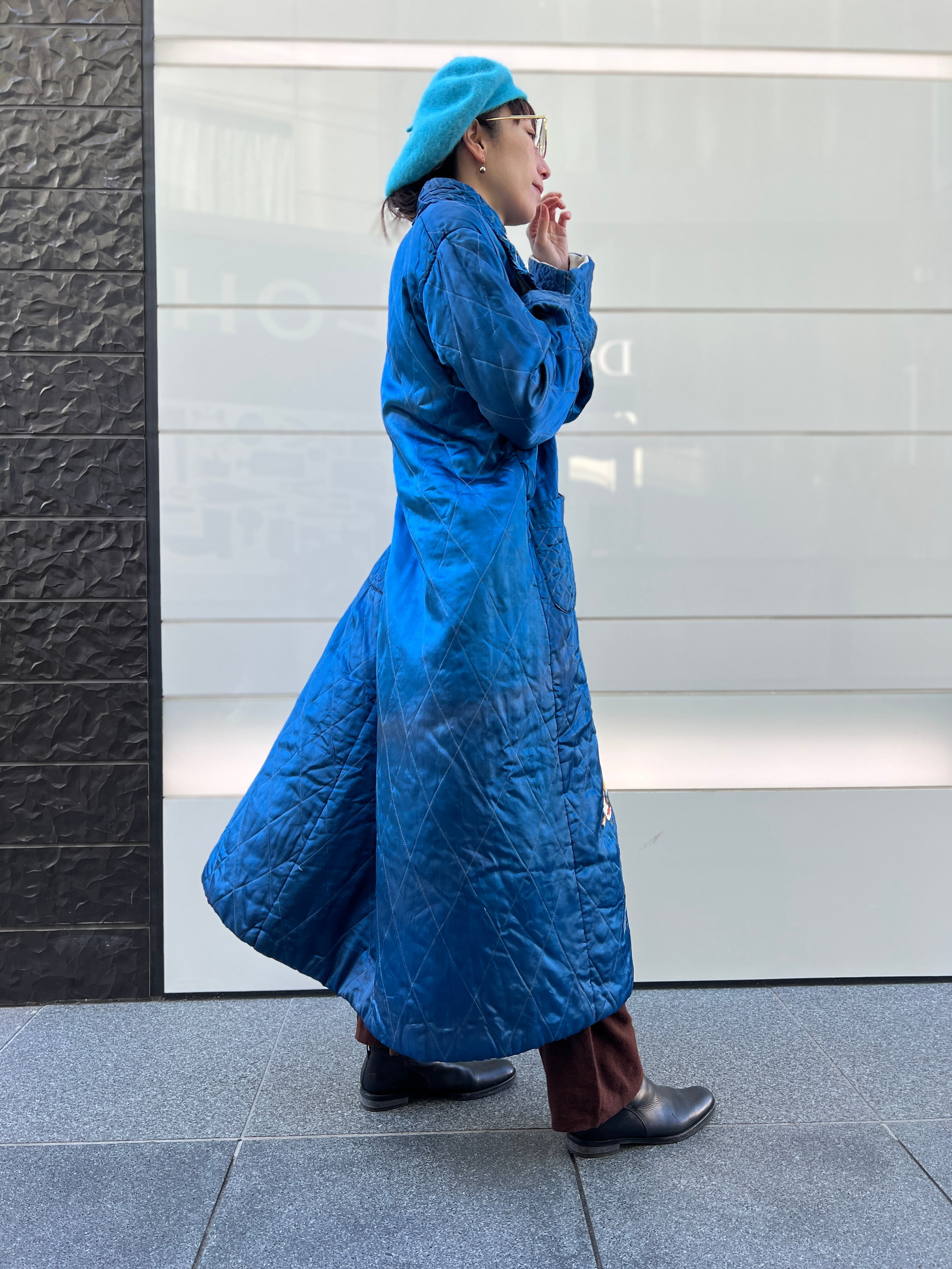 鮮やかなメタリックブルーが目を惹く、ヴィンテージチャイナのキルティングガウン。
