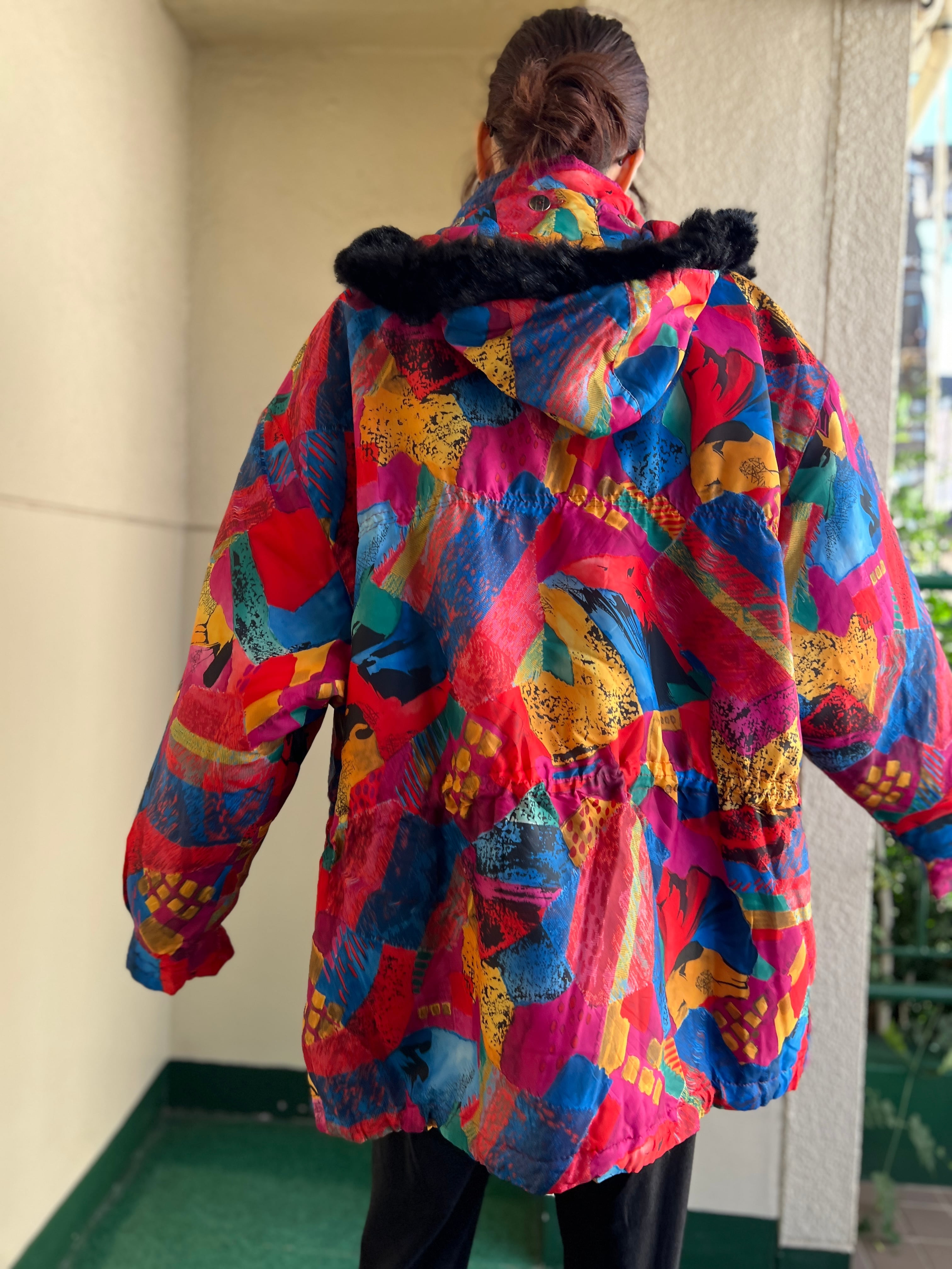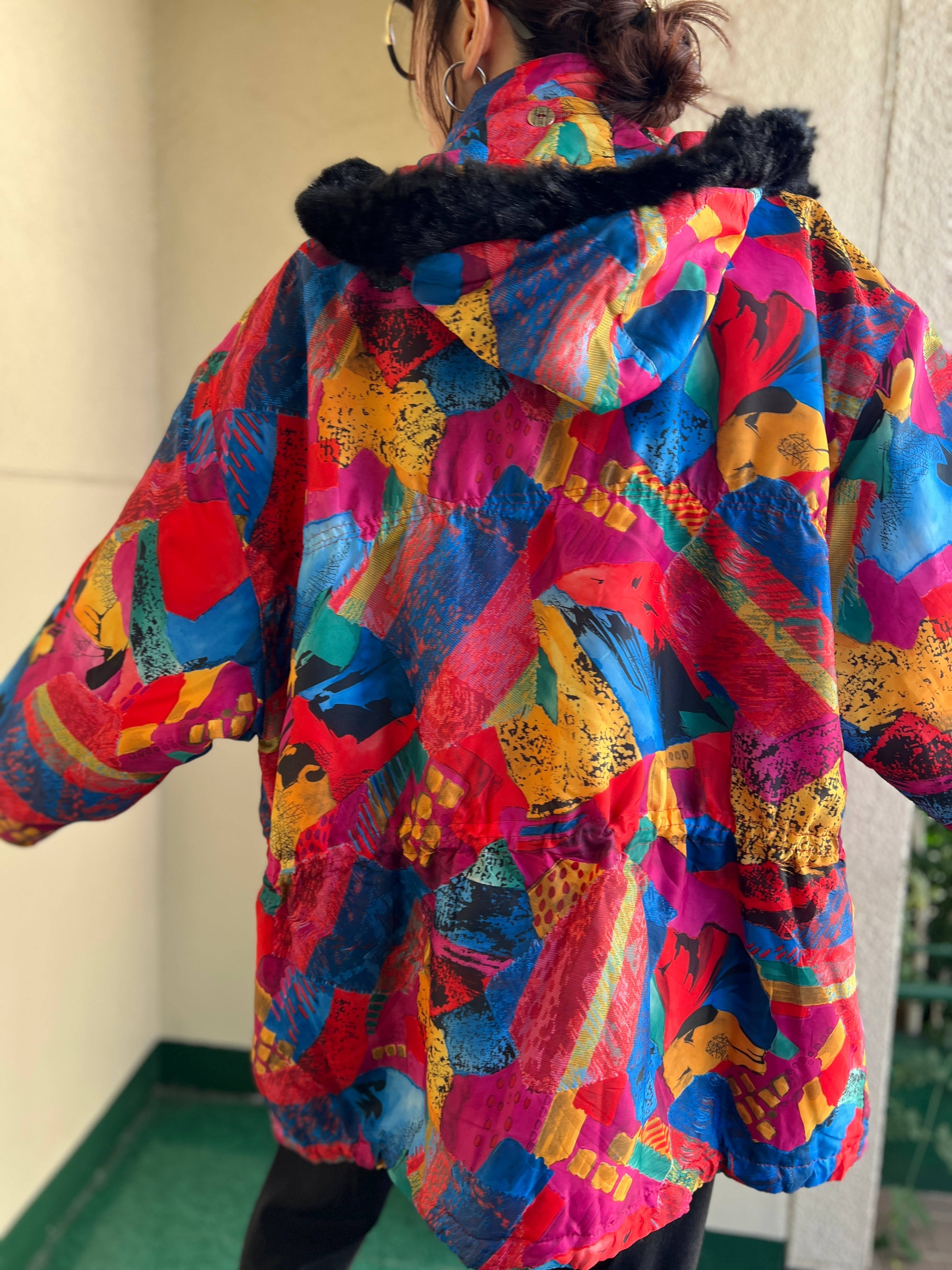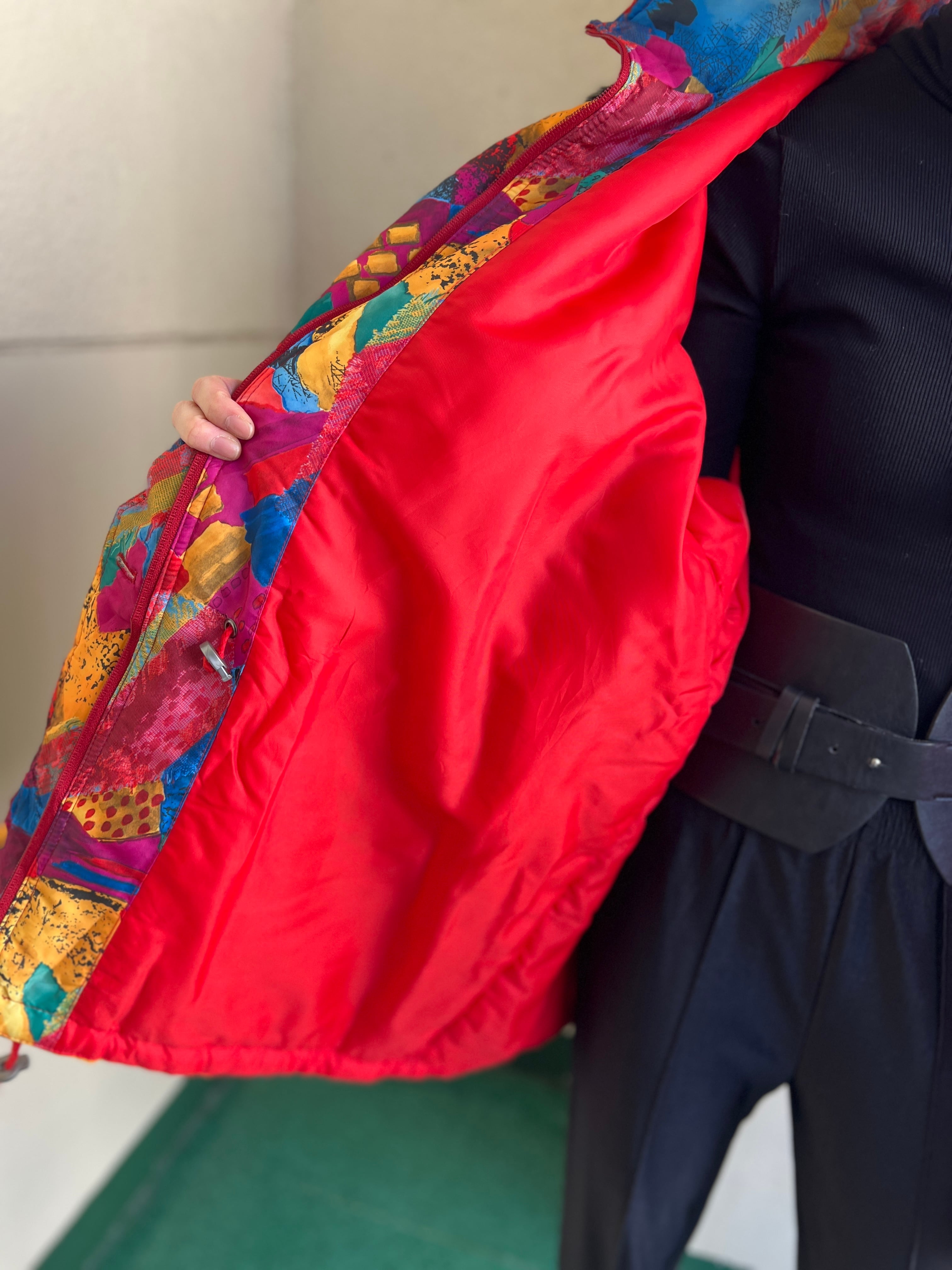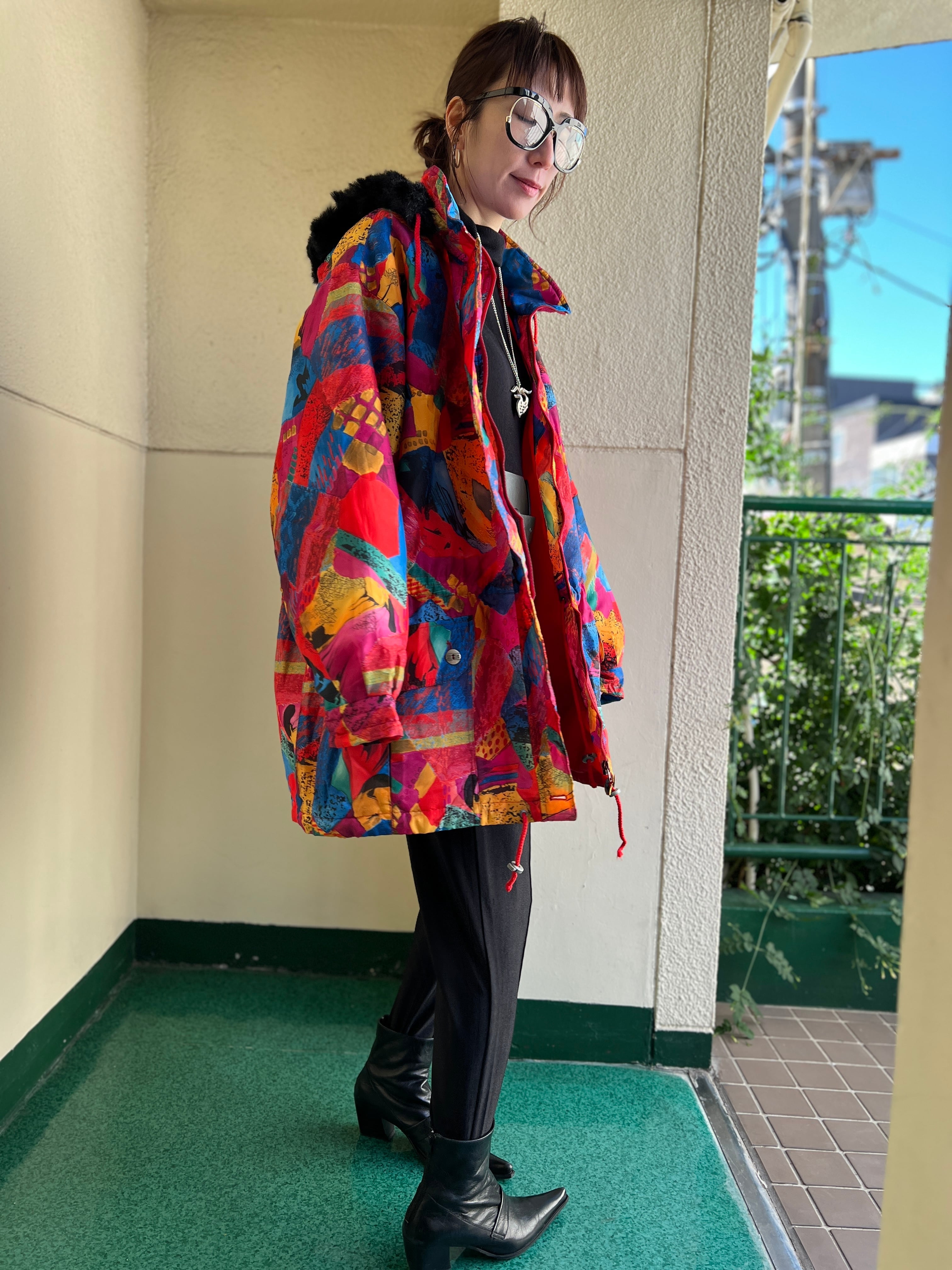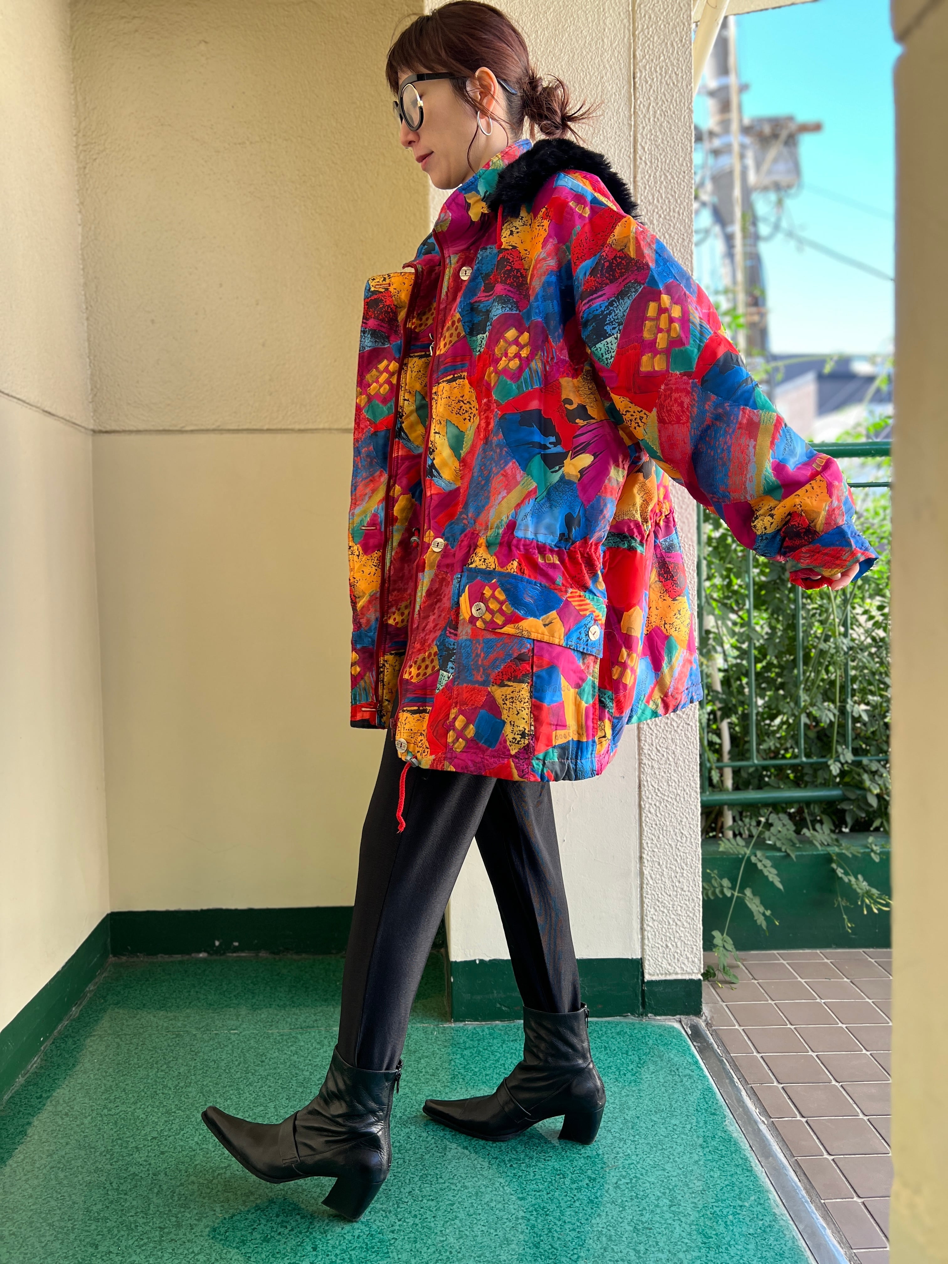 Vintage EUR multicolored foodie blouson ( ヴィンテージ ヨーロッパ マルチカラー フード つき 中綿入り ブルゾン )