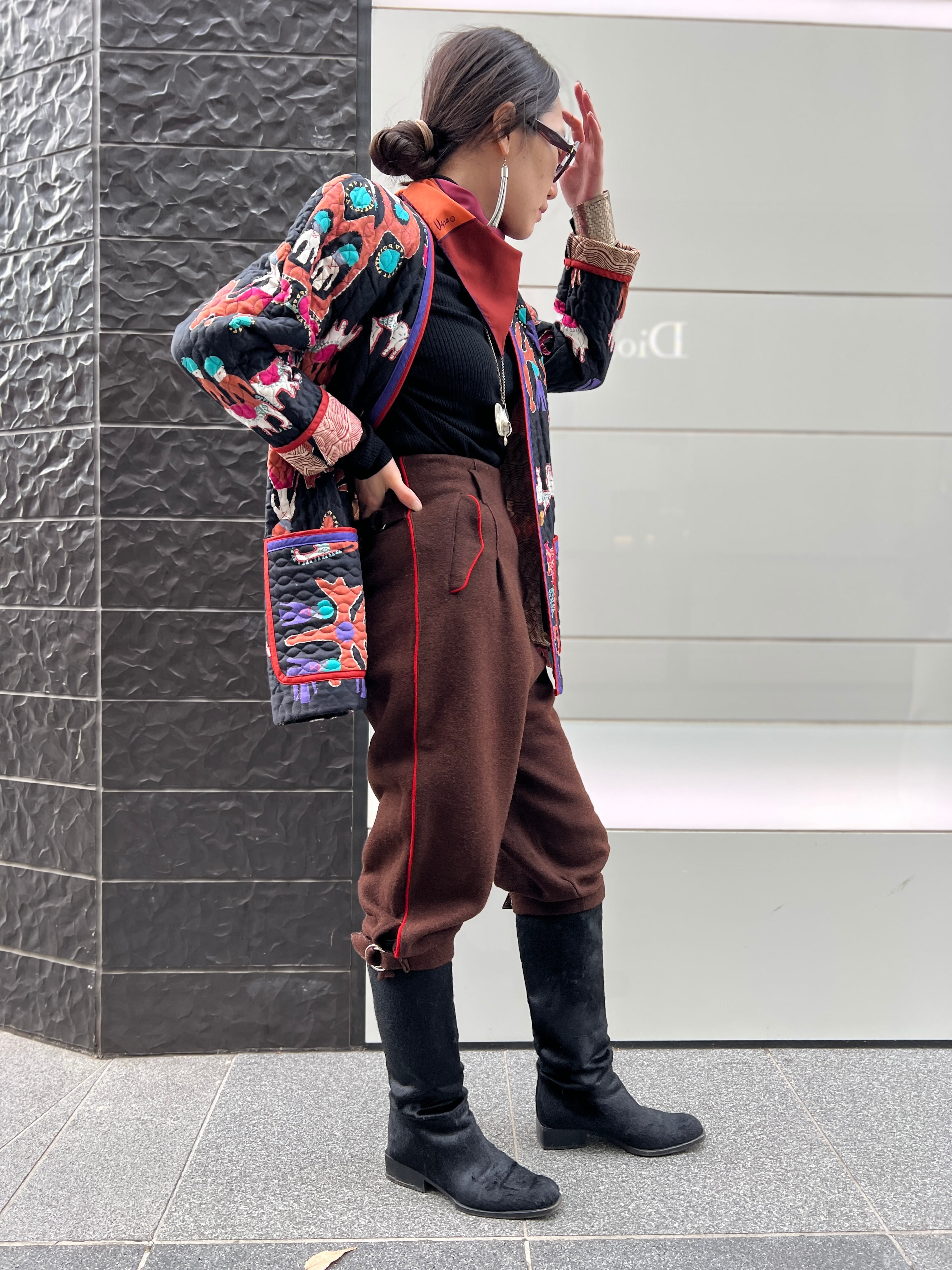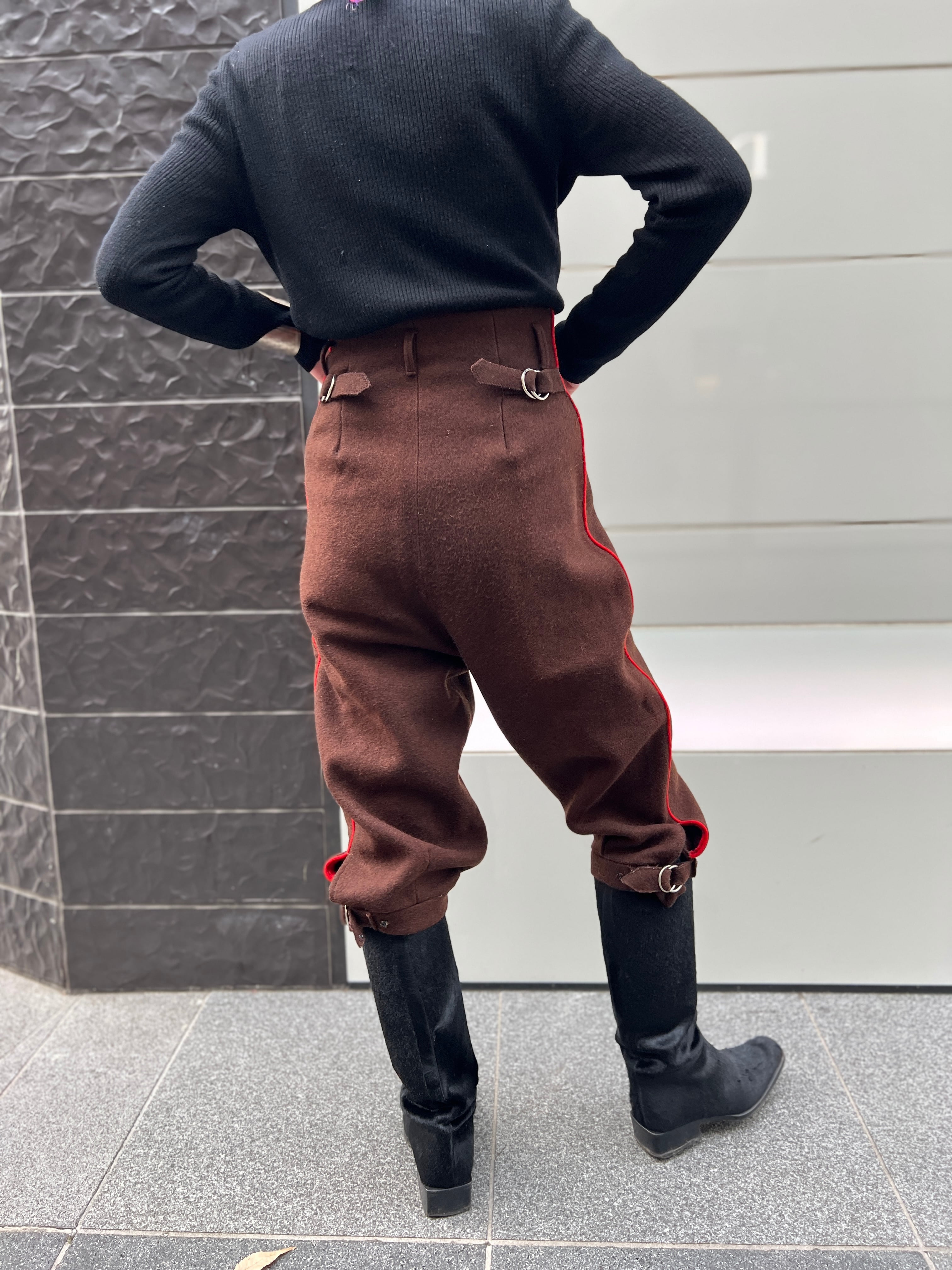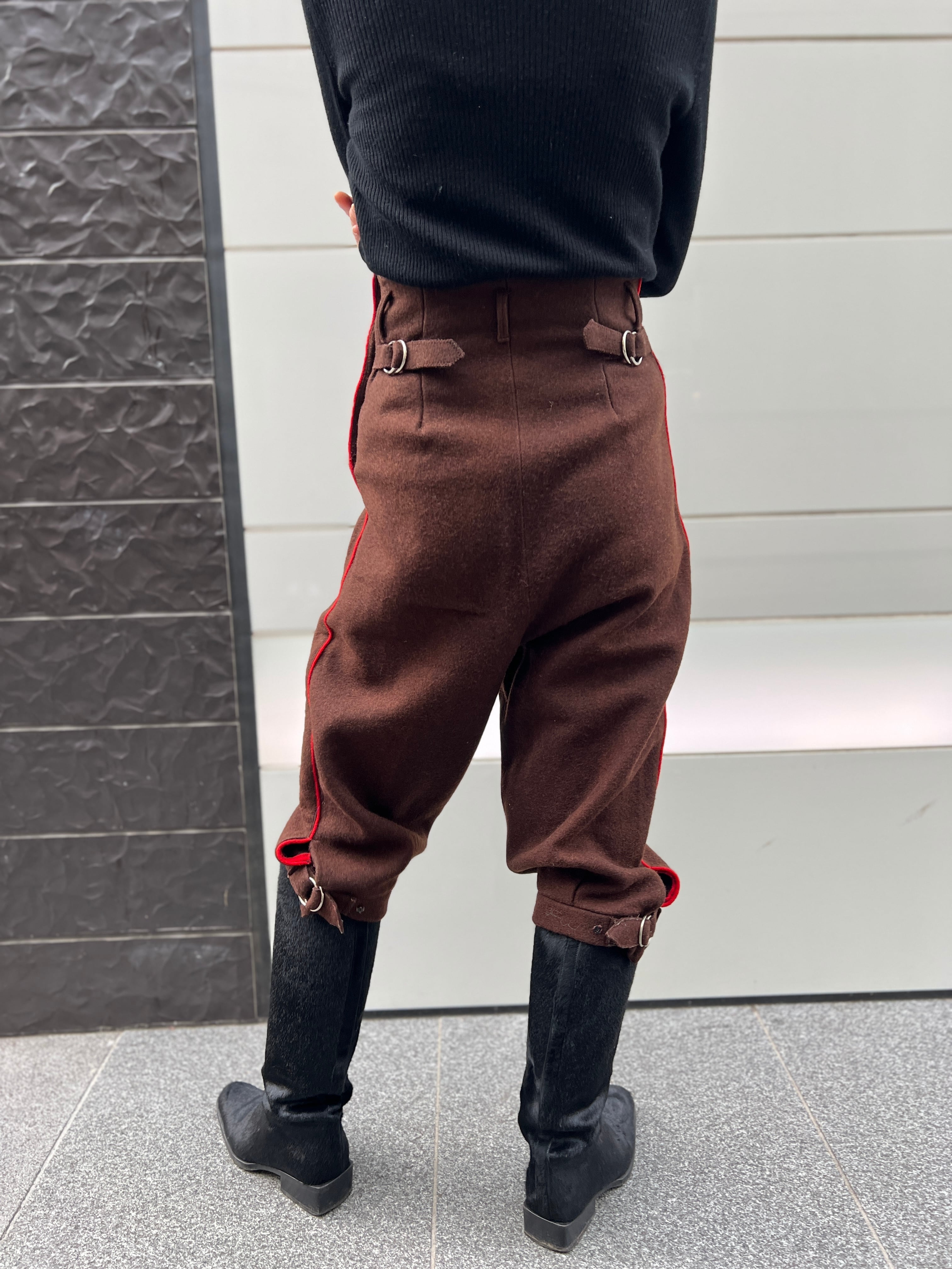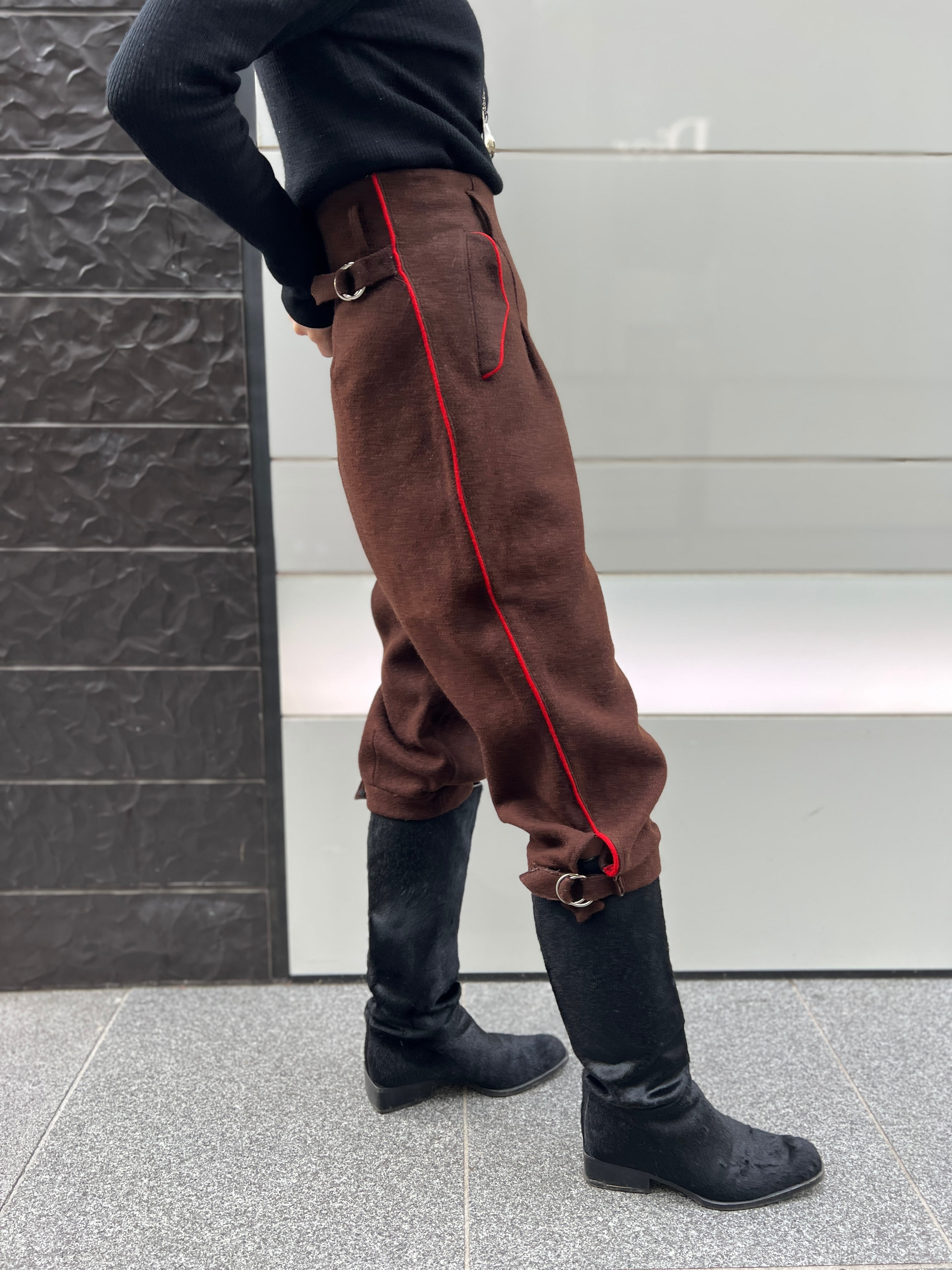 ダークブラウンに鮮やかな朱赤ラインが走る、存在感抜群のヴィンテージパンツ。