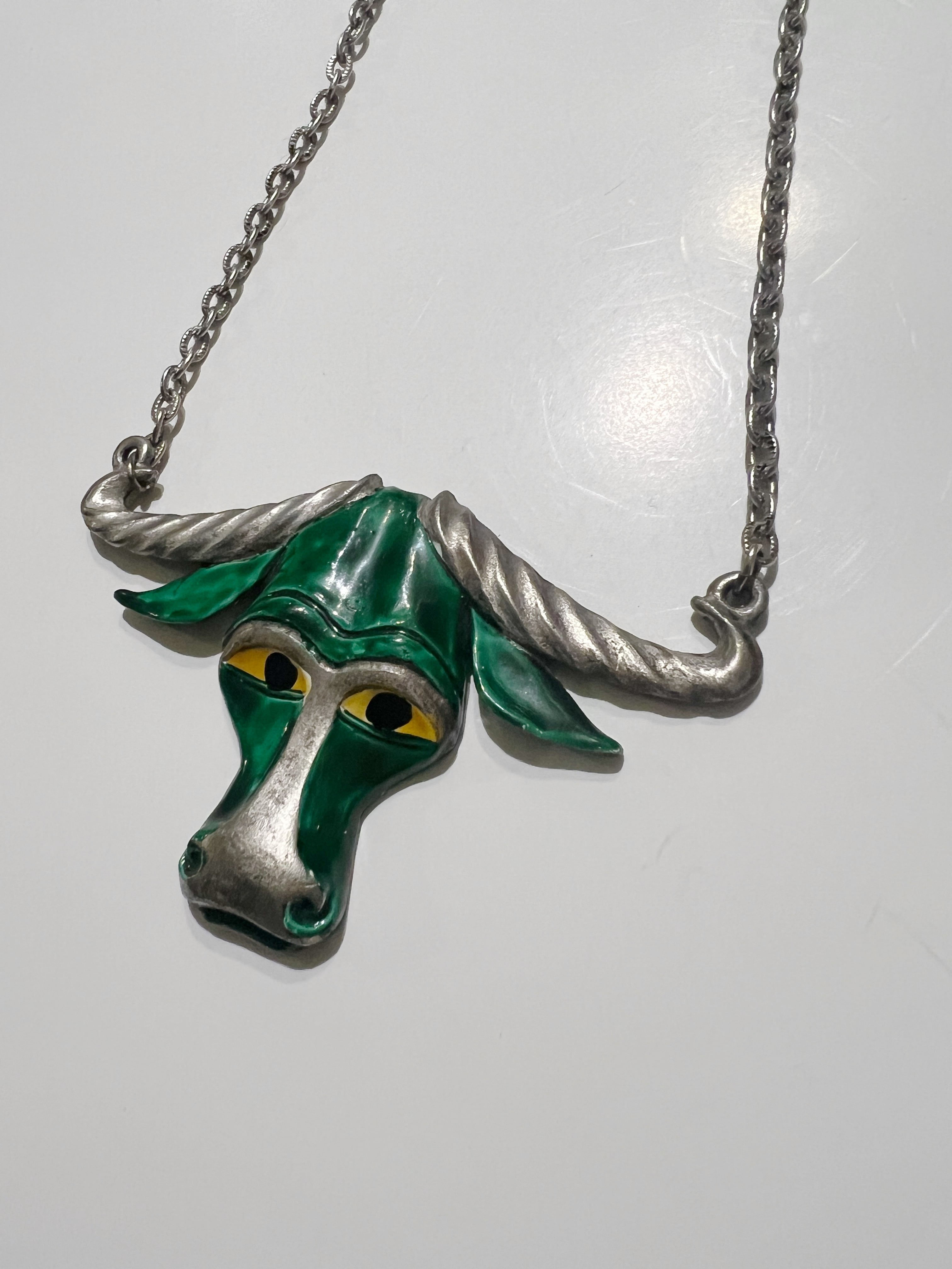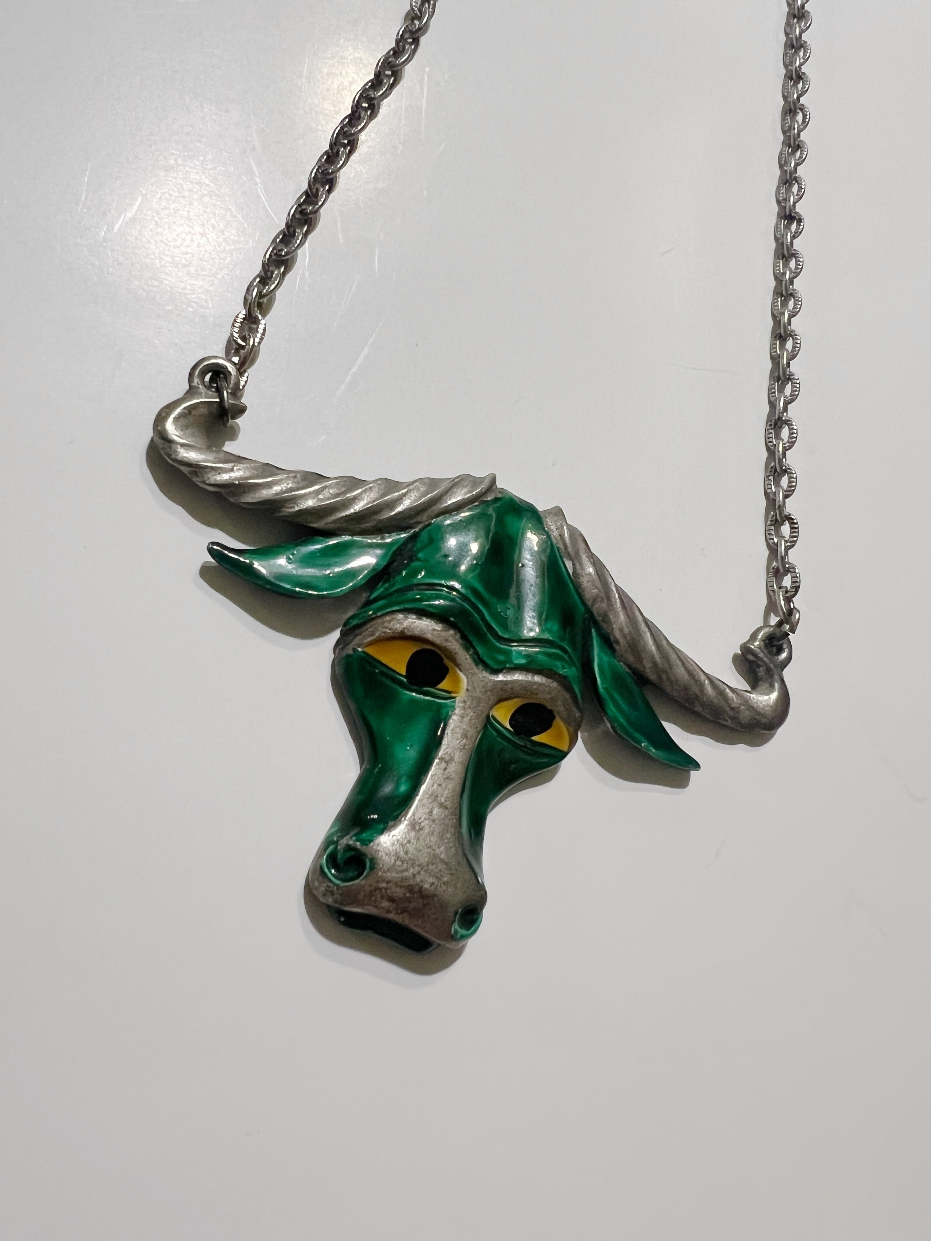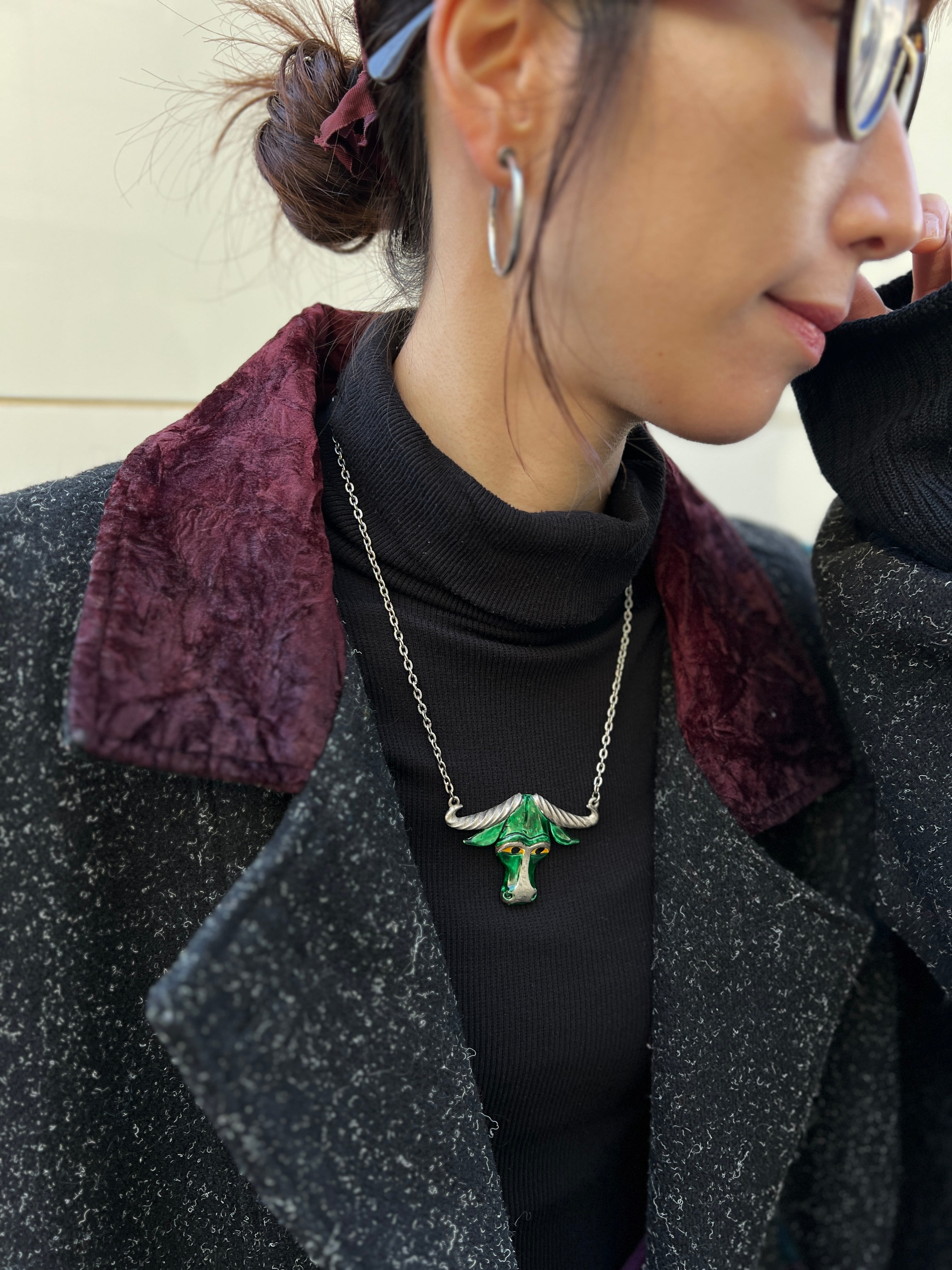 アウターの色や質感に負けない存在感のあるアートネックレス。
