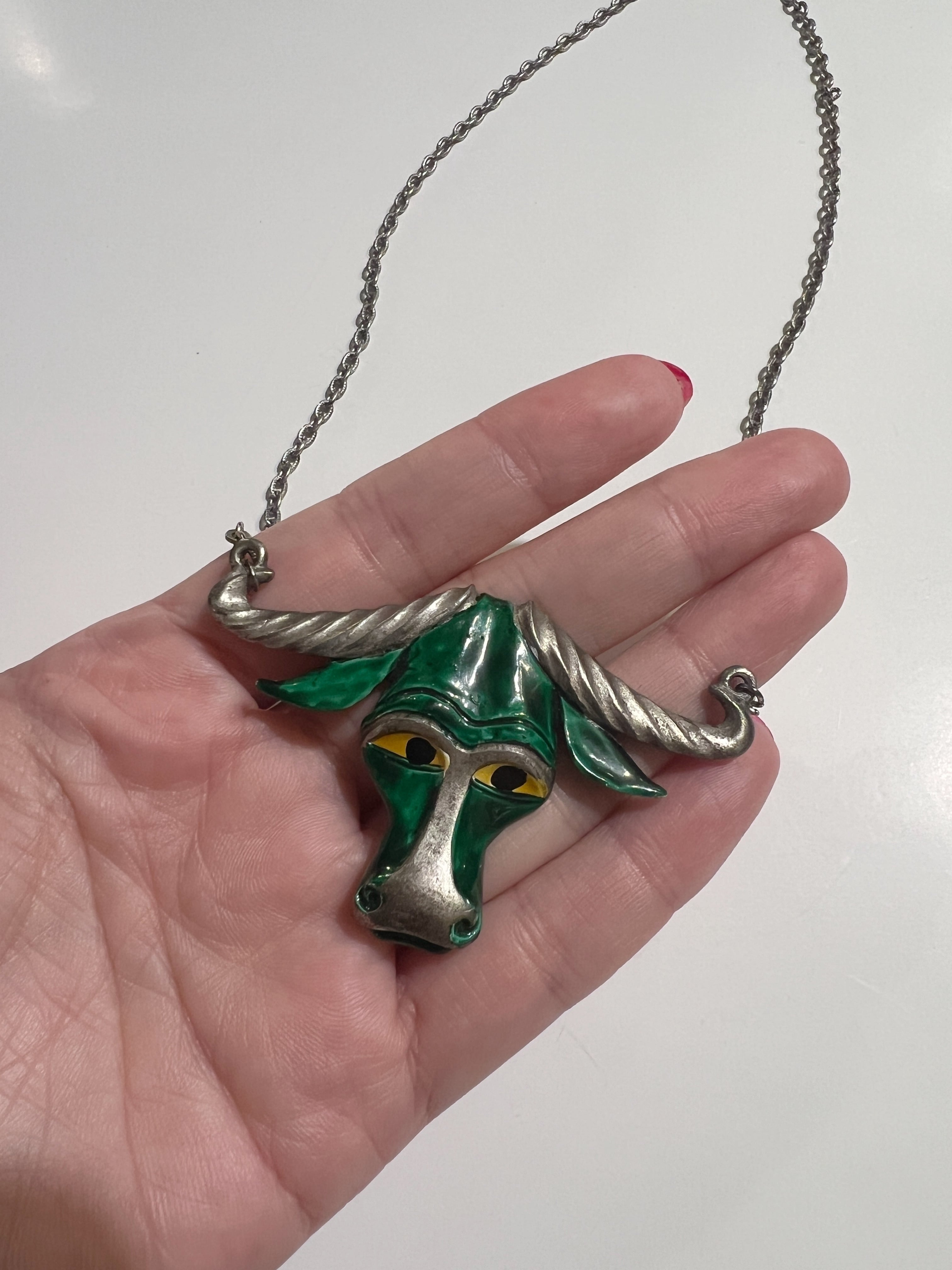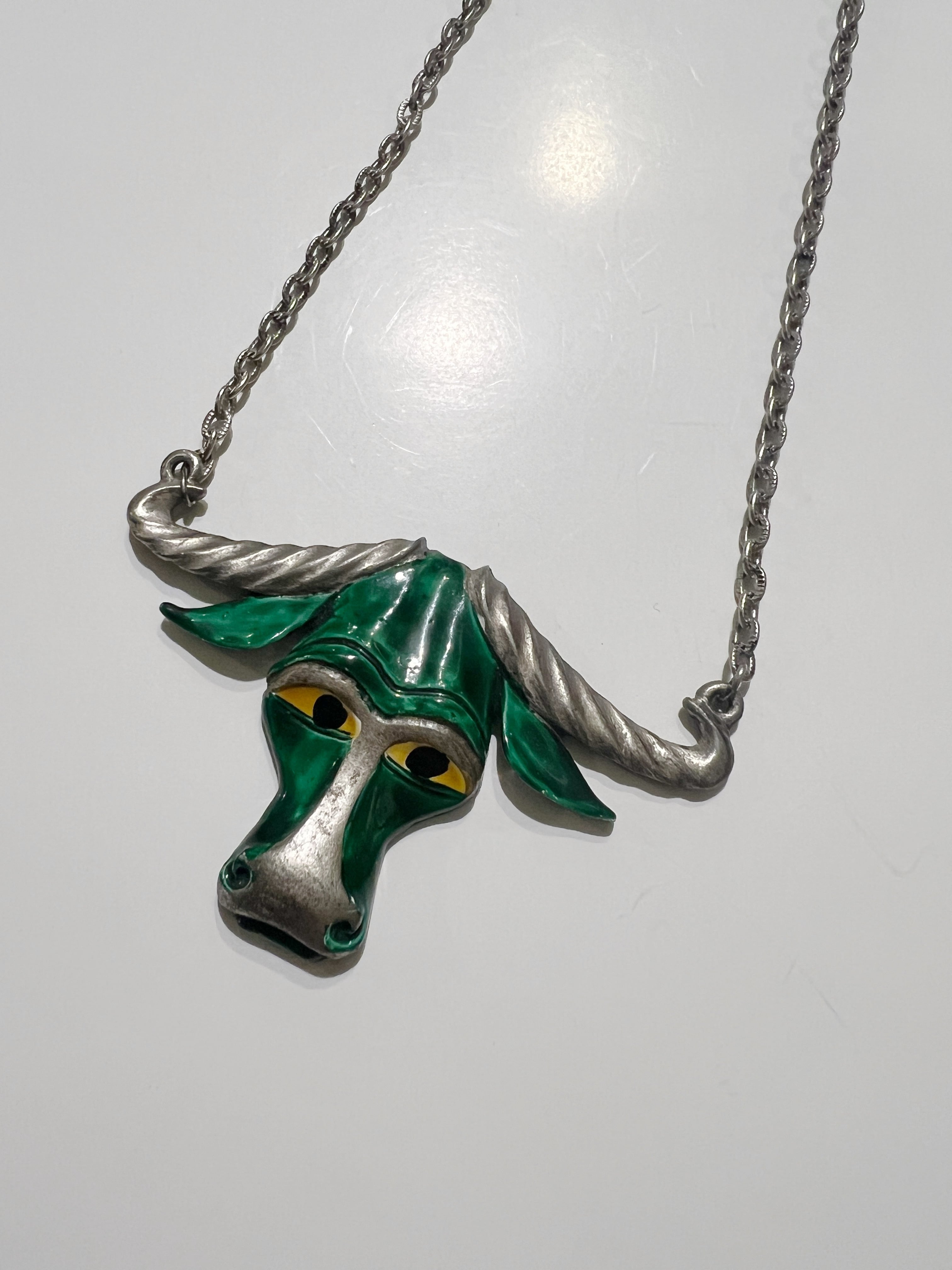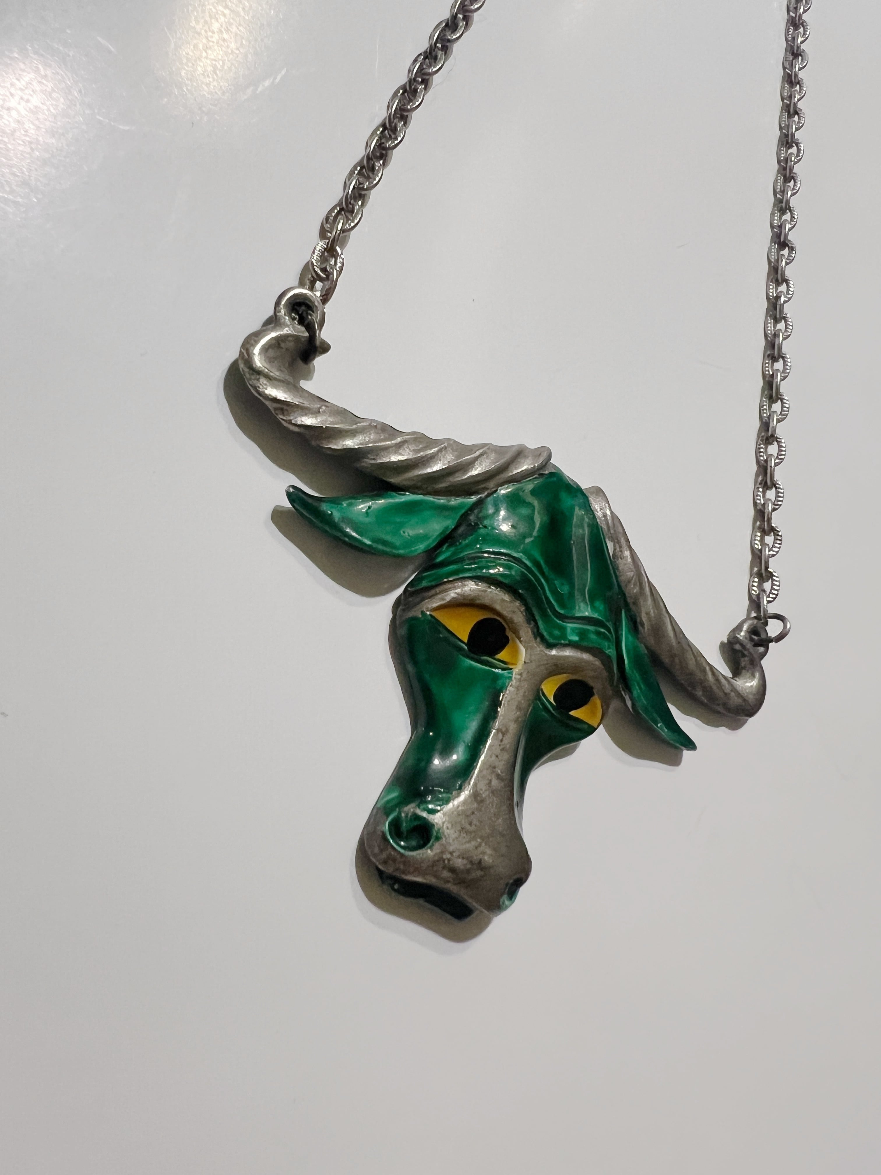 アウターの色や質感に負けない存在感のあるアートネックレス。