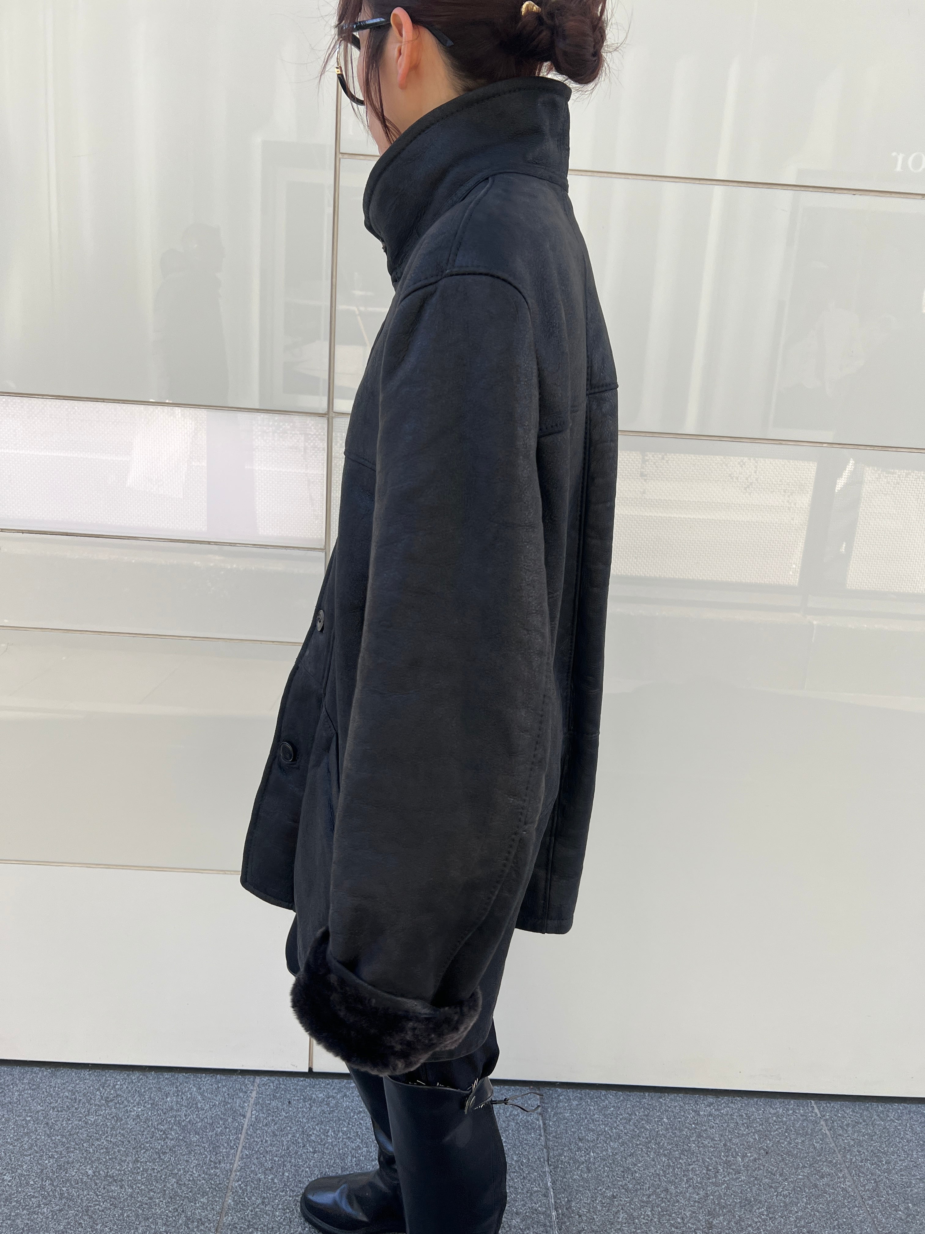 直線的なカッティングとスタンドカラーが印象的な、シックなブラックムートン。