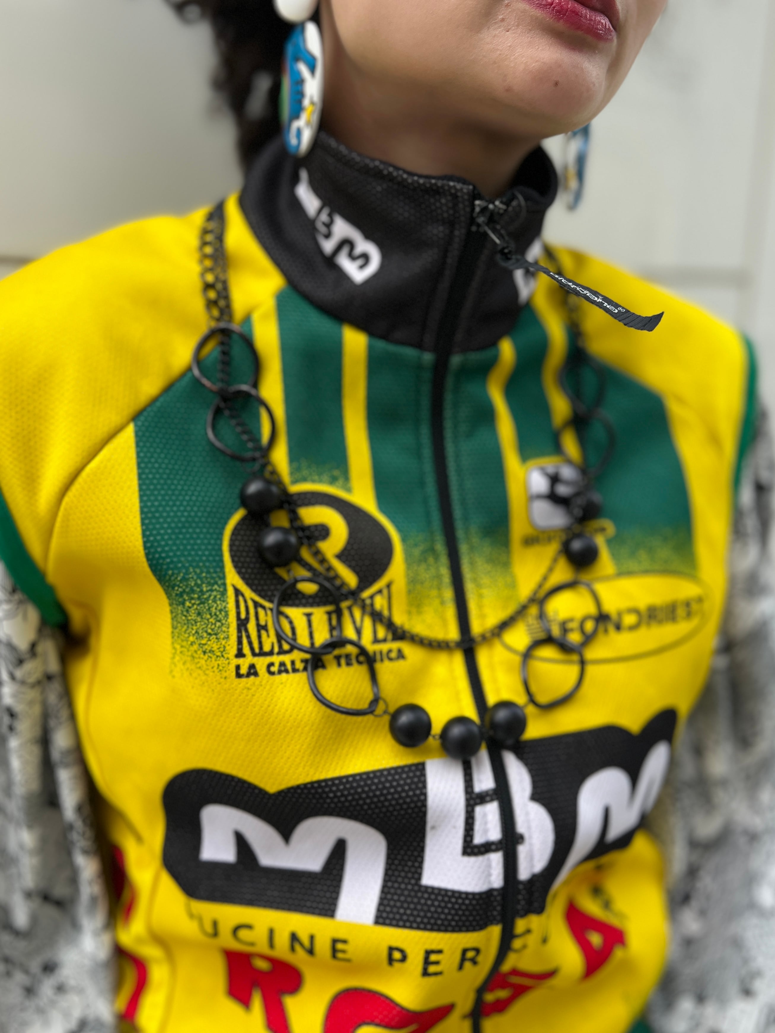 チェーン、オーバルリング、マットなブラックボールをリズミカルに組み合わせた、彫刻的な存在感が魅力の一点です。