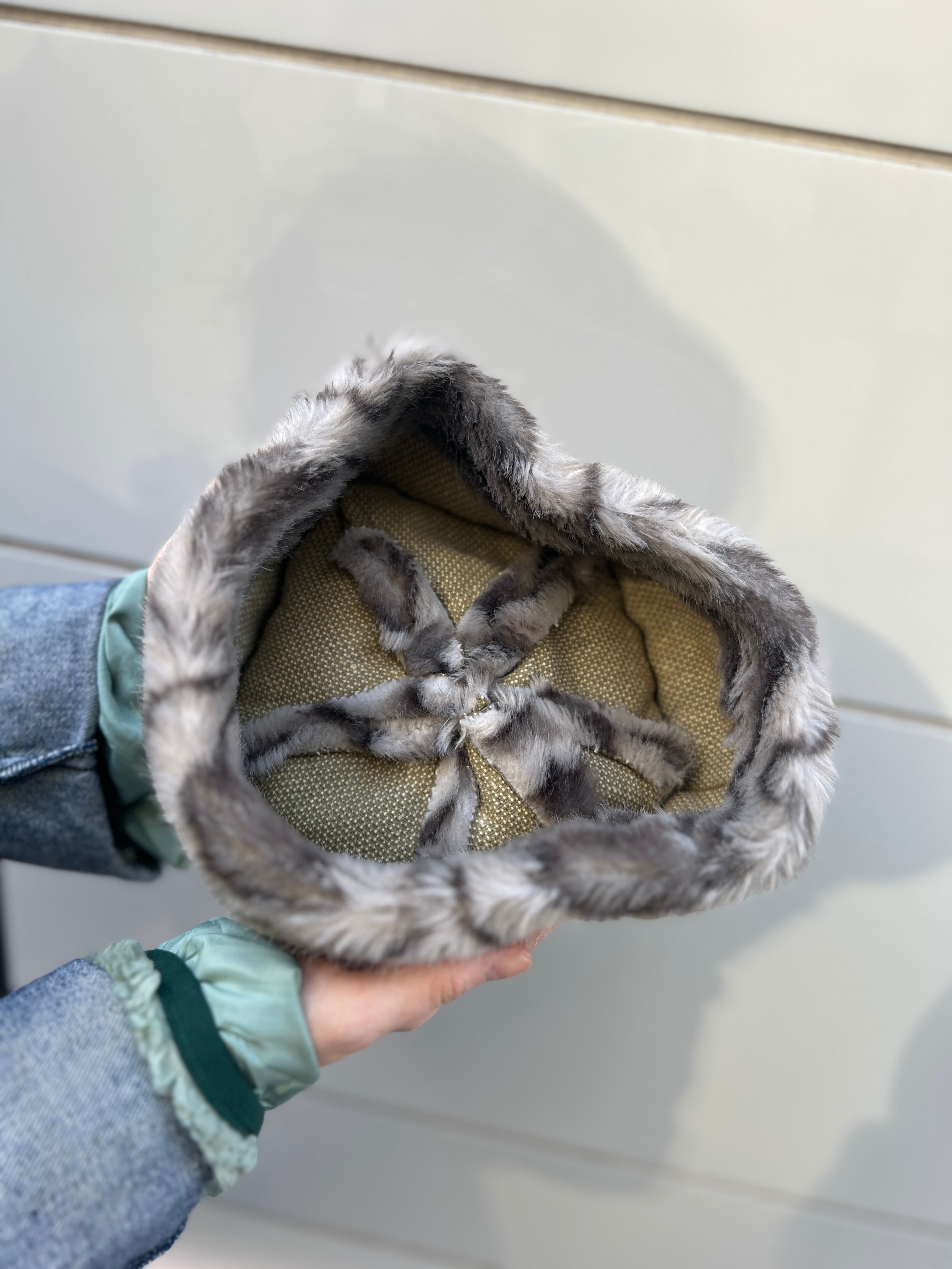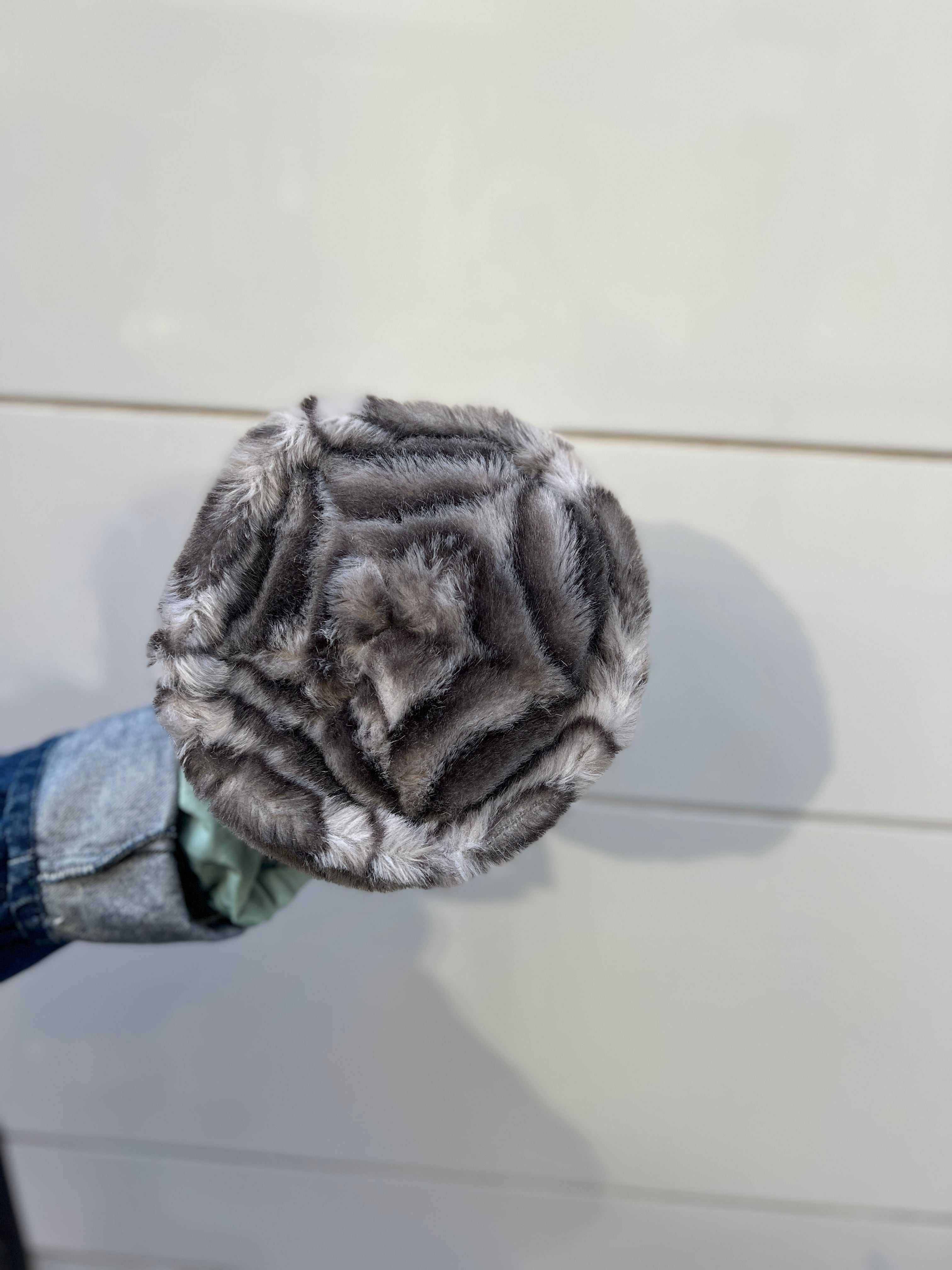 毛並みの流れを切り替えた放射状パネルが、光の当たり方で立体感を生み、