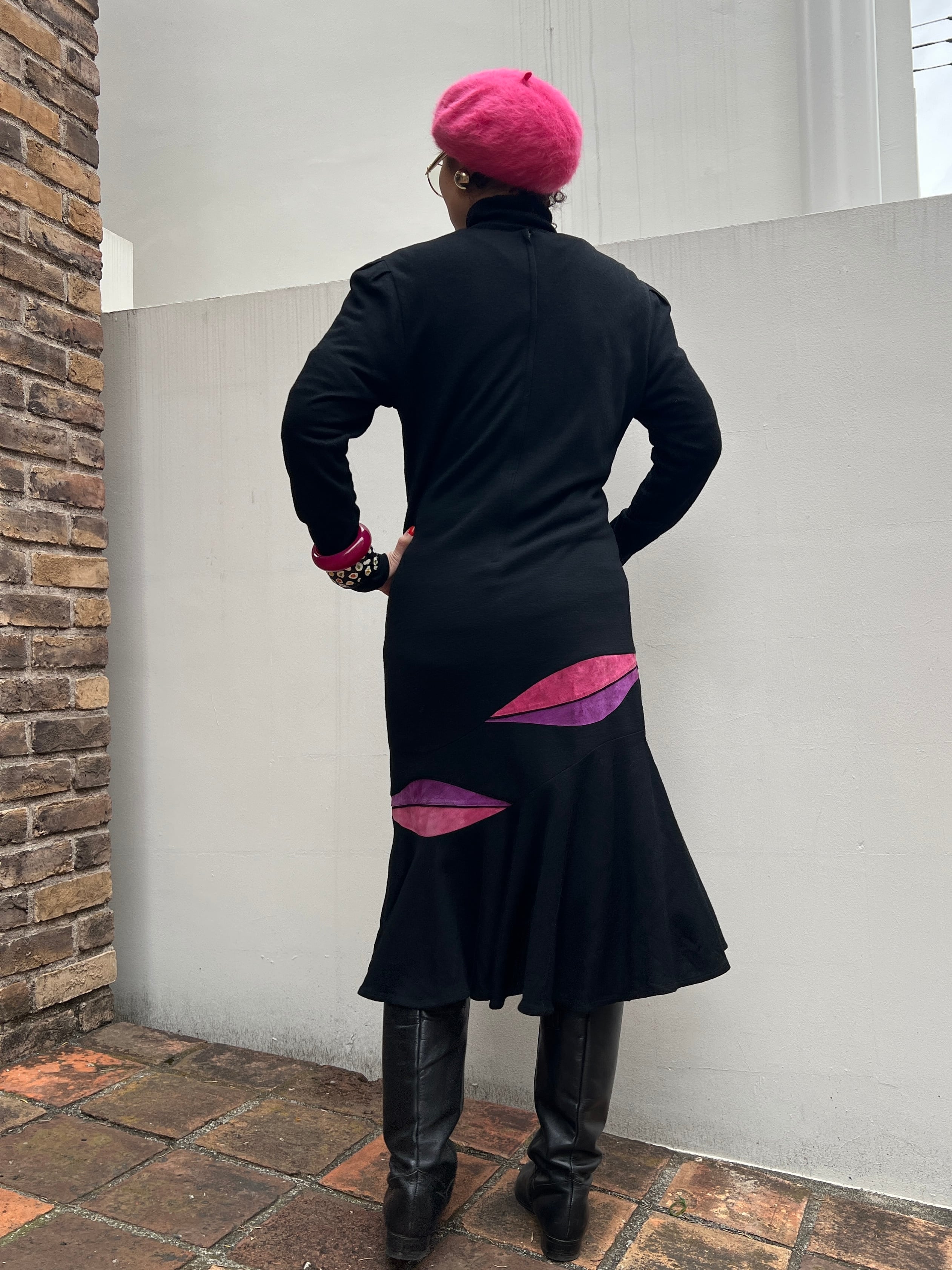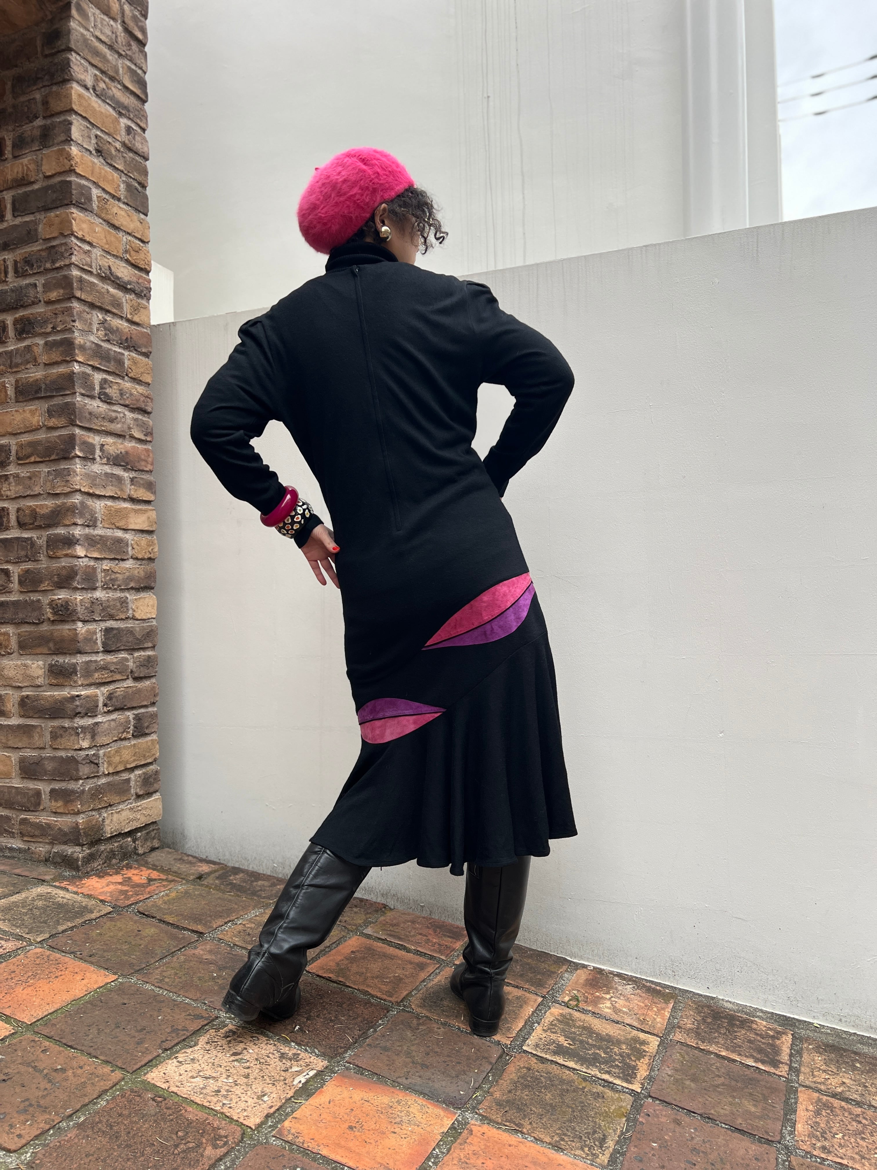 80s black wool × pink purple leaf wool knit dress ( ヴィンテージ ブラック ウール × ピンク パープル ニット ウール ワンピース )