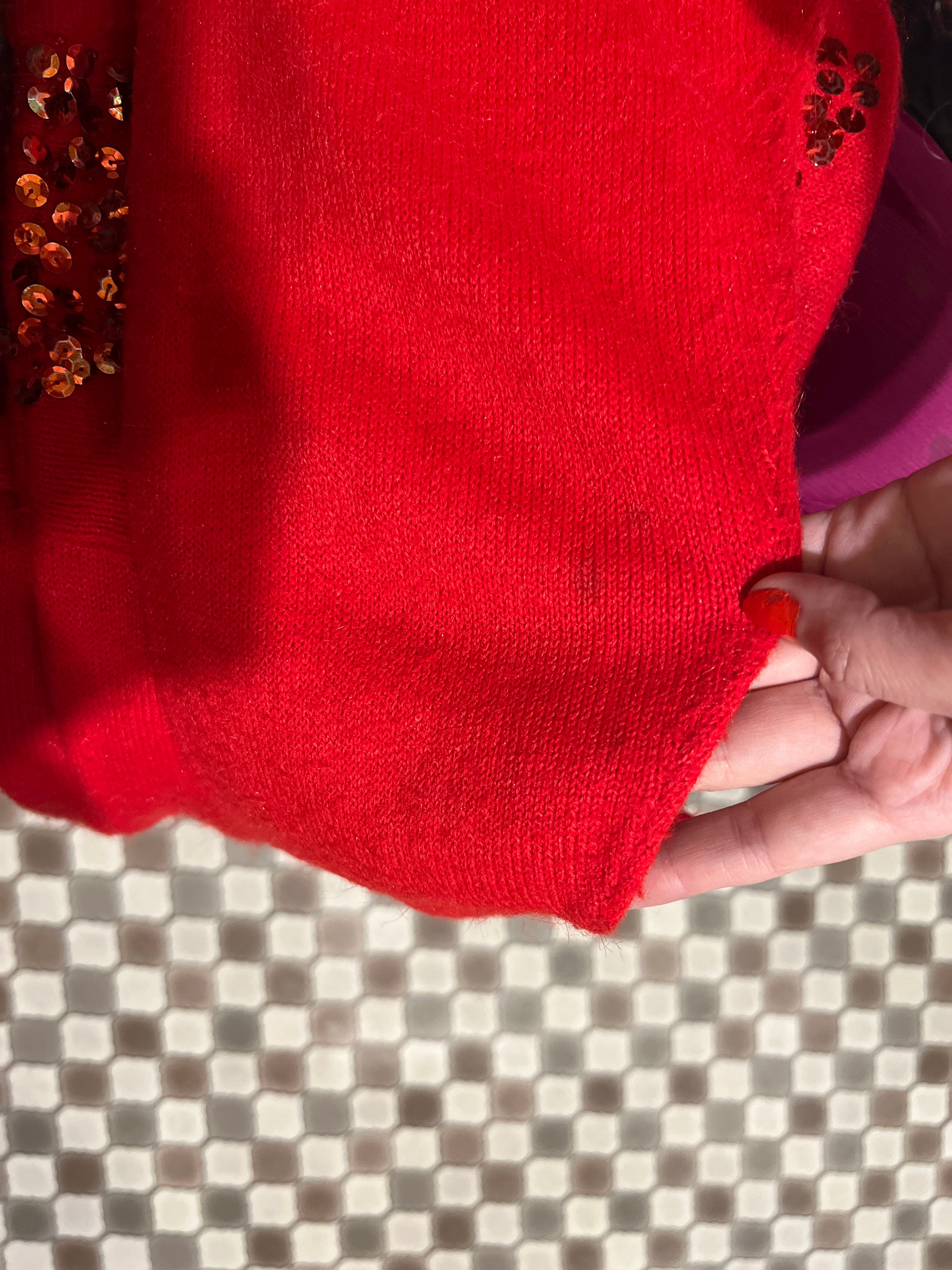 年代物のため、お袖にシミ、赤いスパンコールのコーティングが一部薄れ、シルバーっぽく見える箇所がございます。