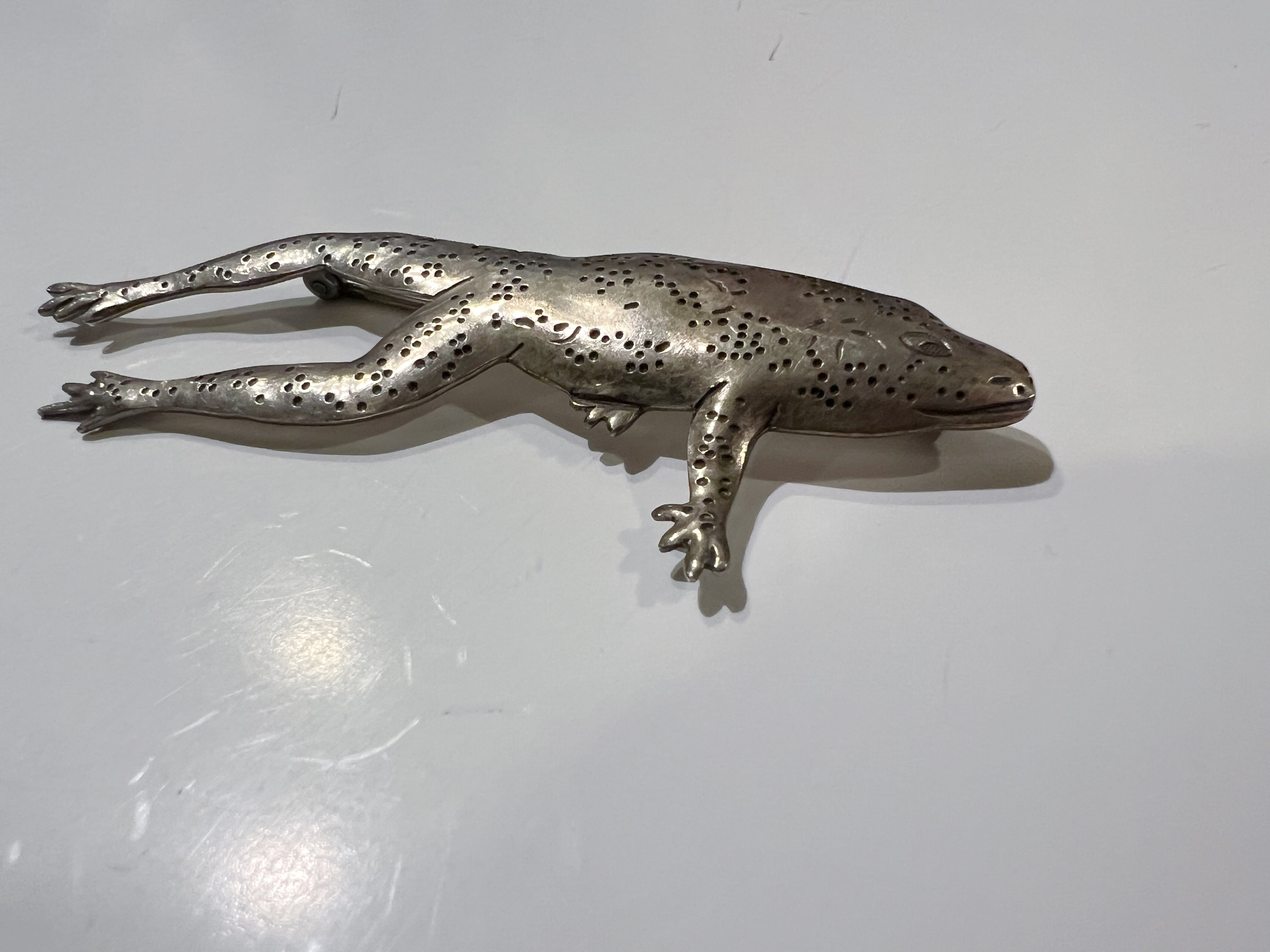 「HAND WROUGHT(手作り)」刻印入りのフロッグモチーフブローチ。