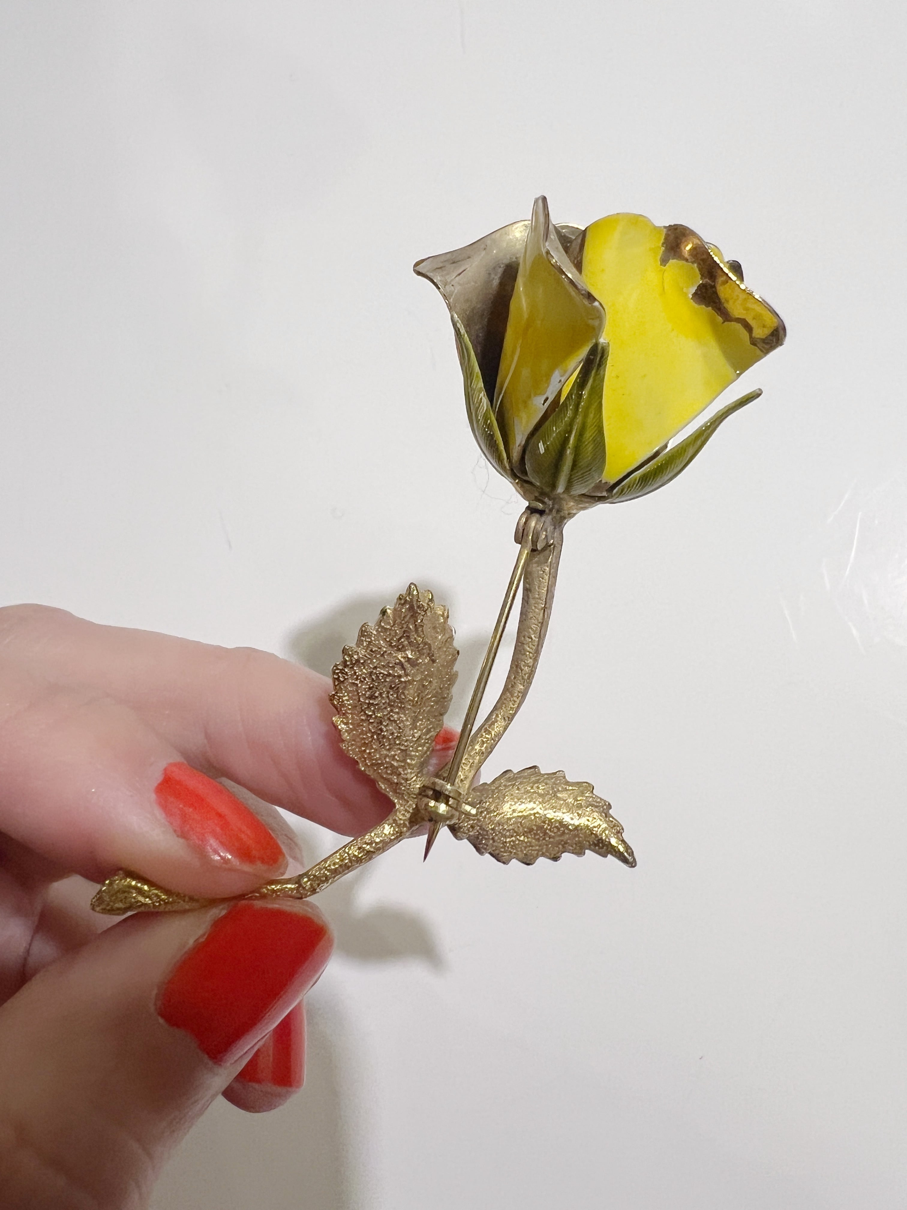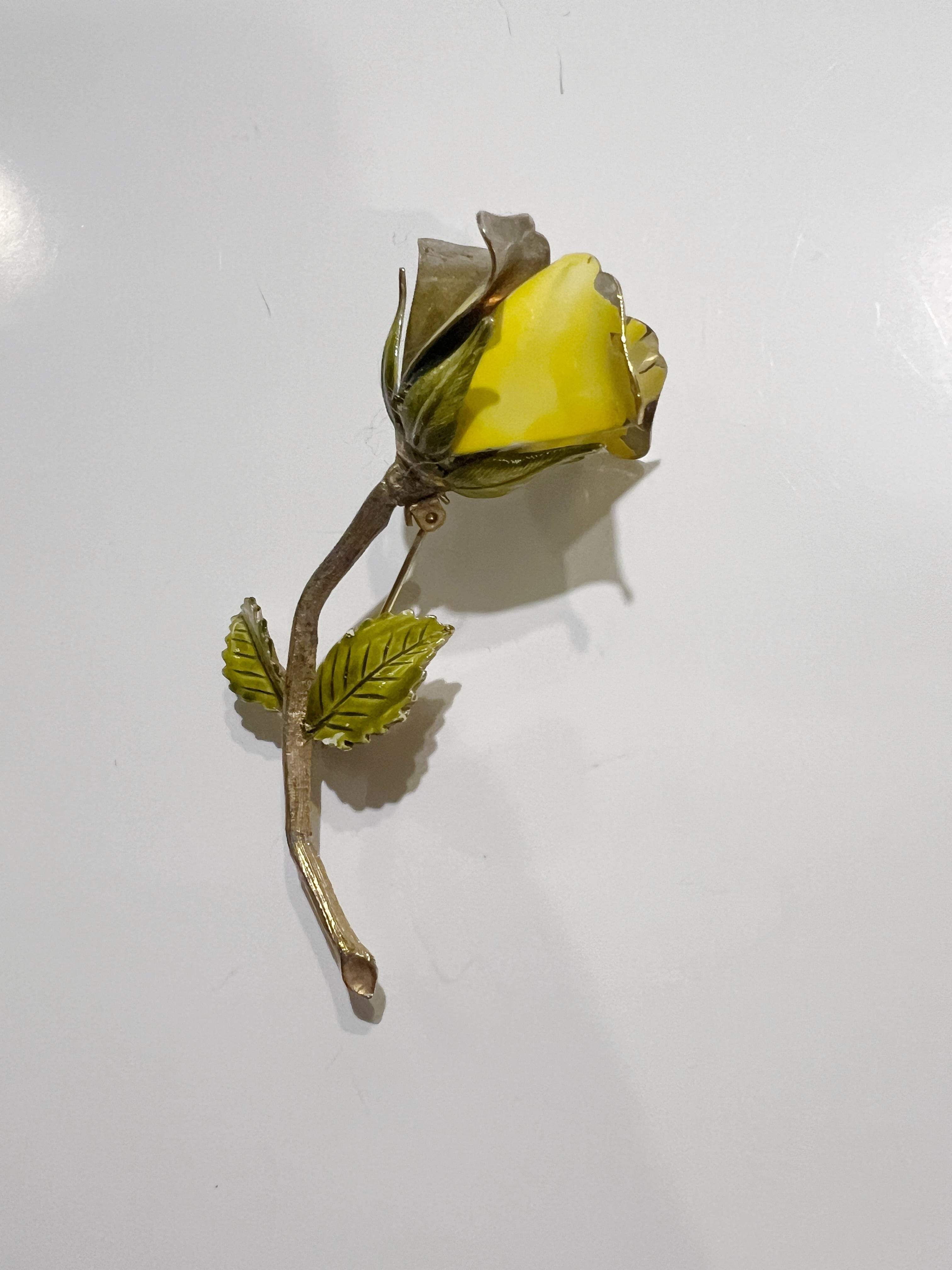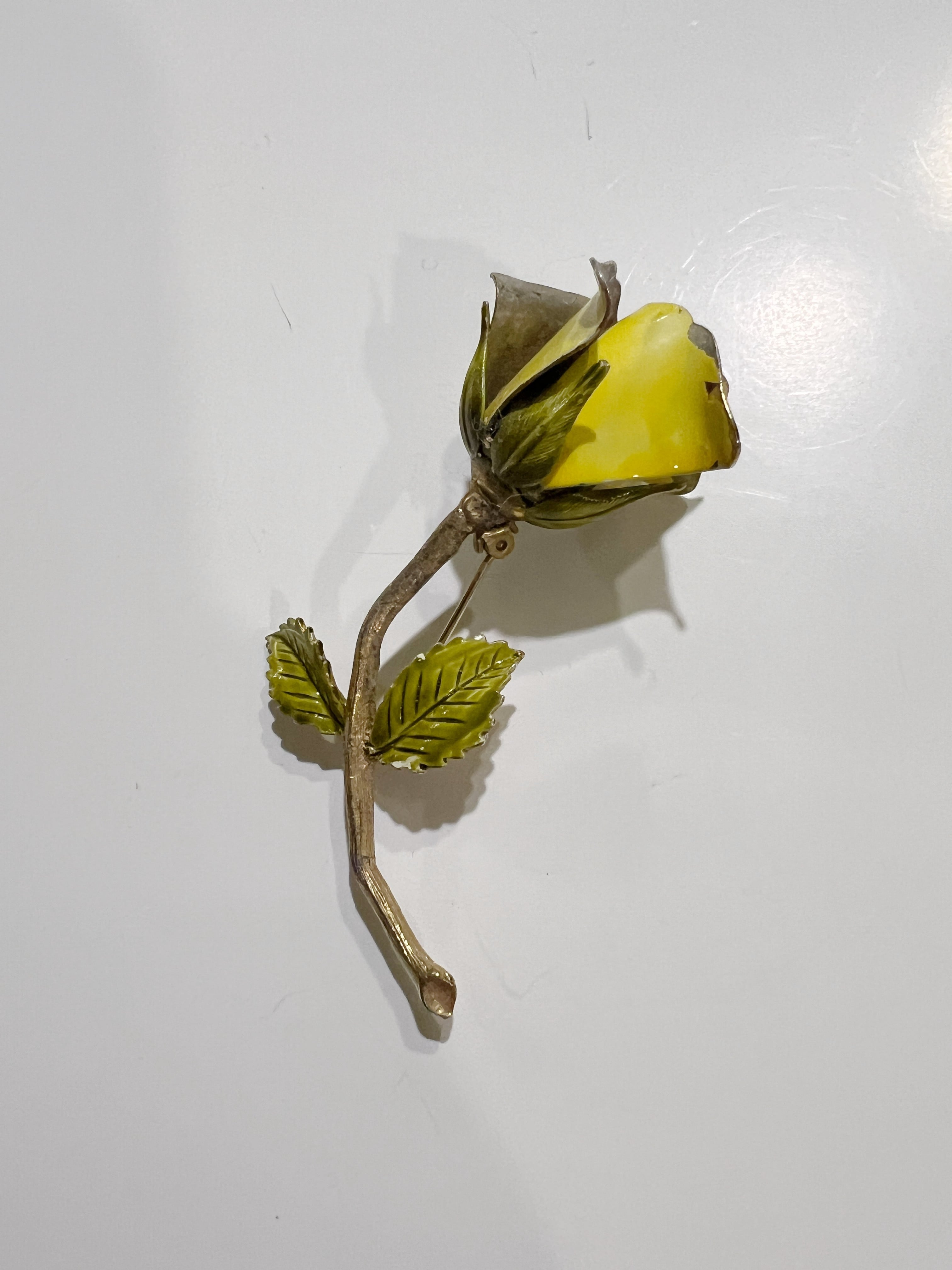 イエローエナメルで表現されたバラの蕾と、茎・葉まで立体的に造形されたデザインが印象的な一本です。