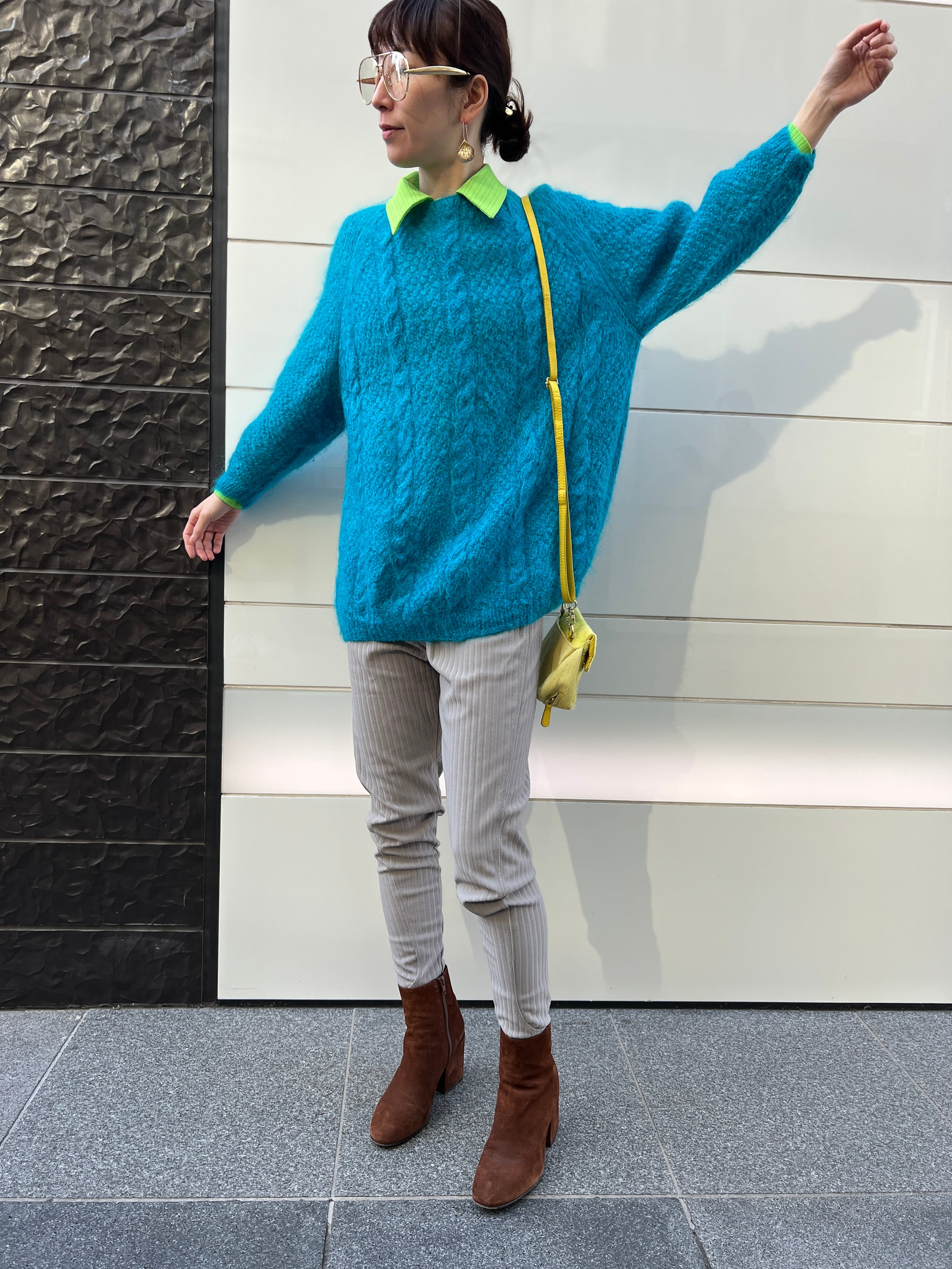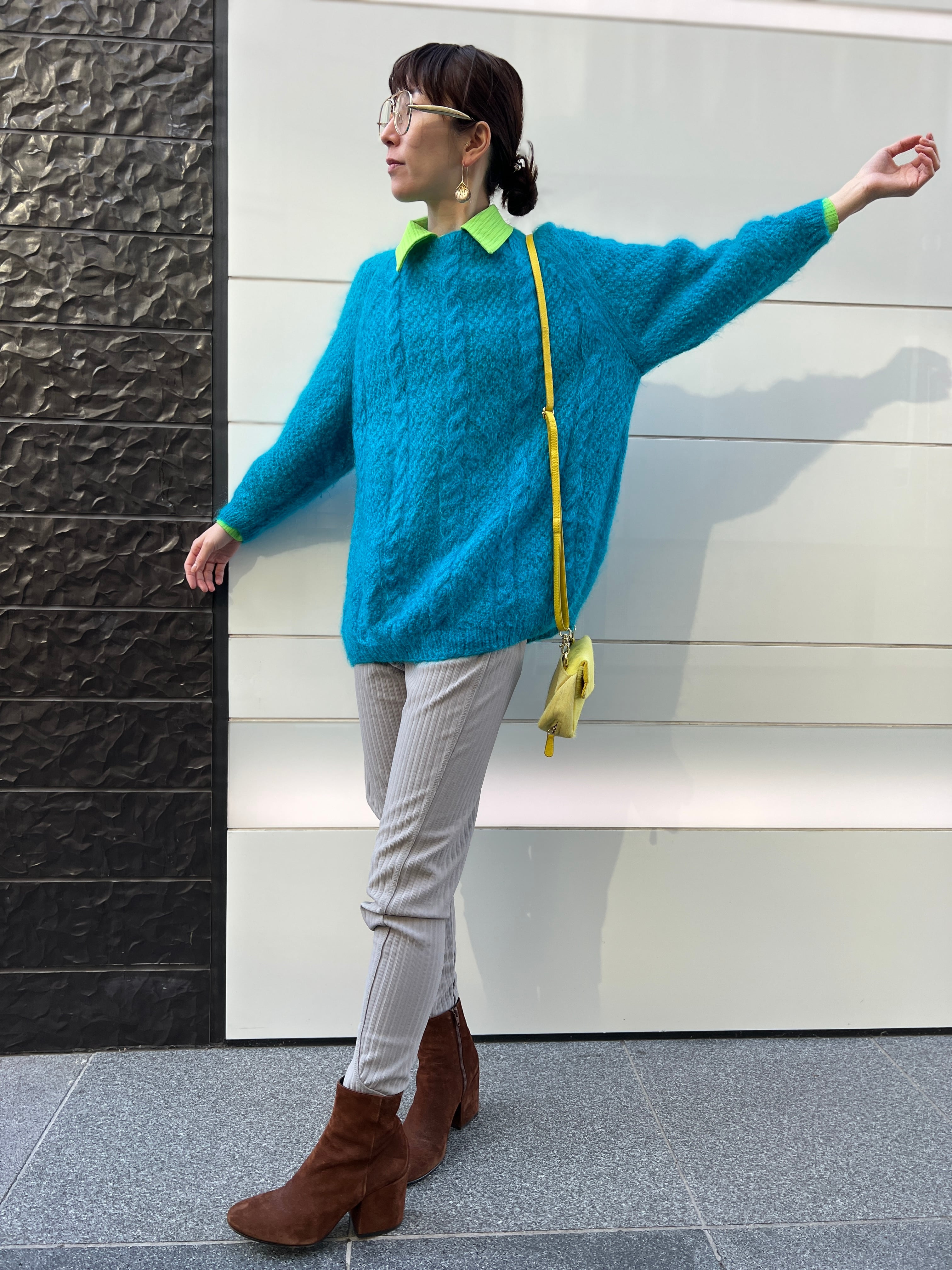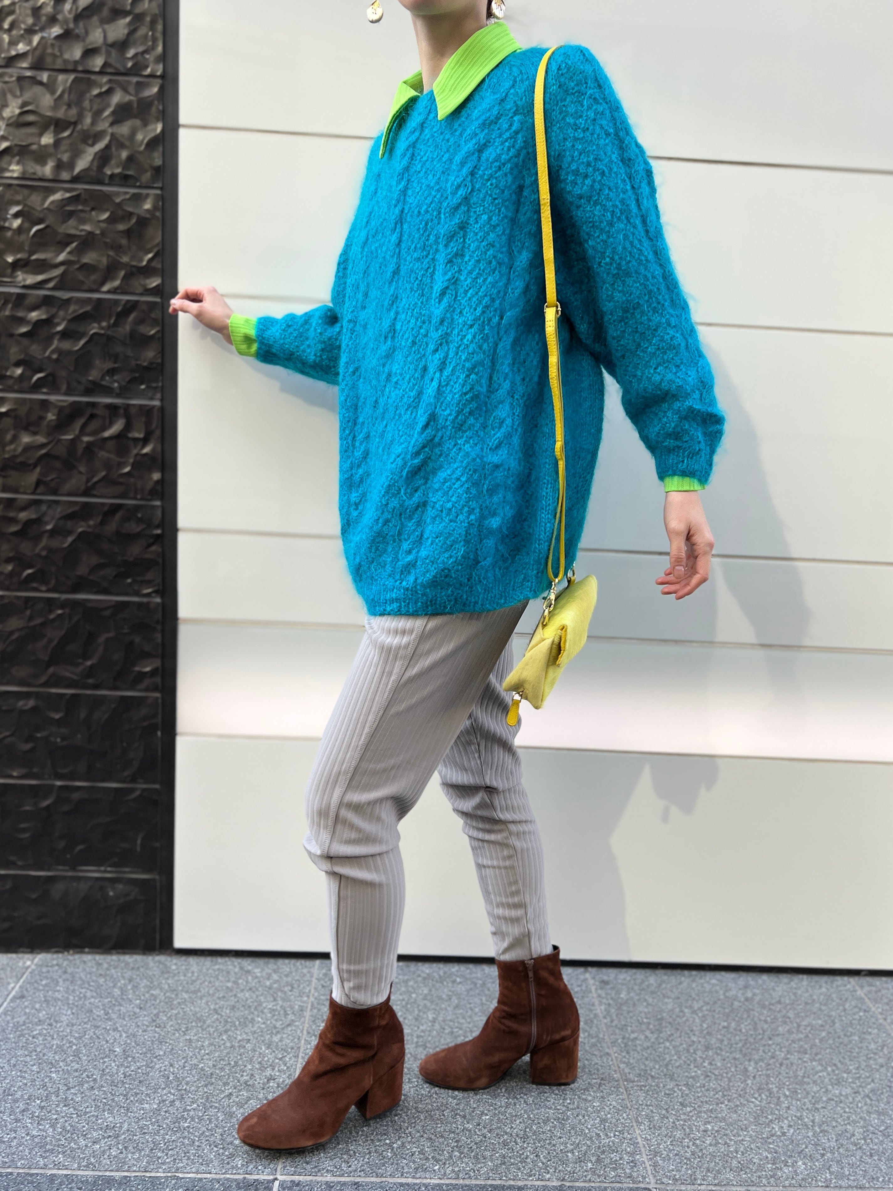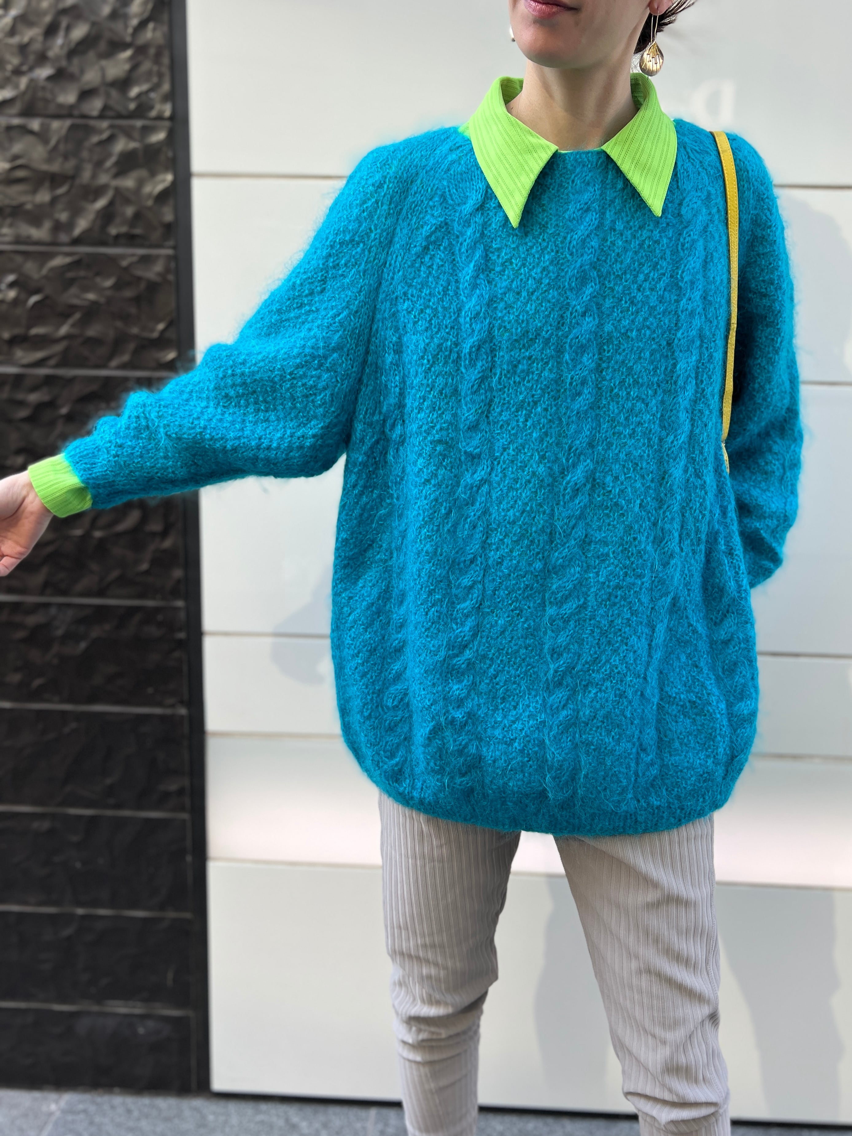モヘア特有のふんわりとした毛足がありながら、発色はクリアで、スタイリングの主役になる一枚です。