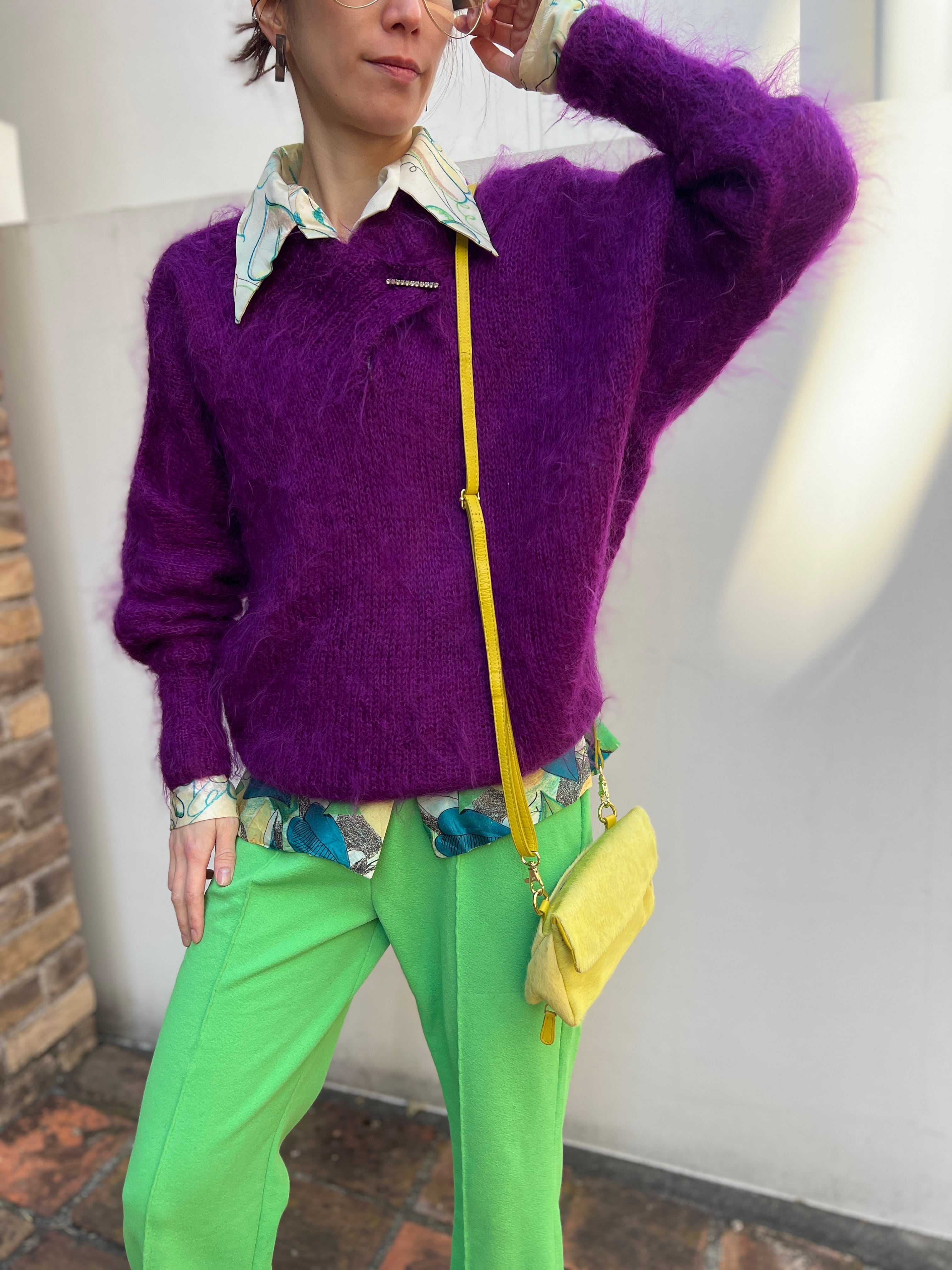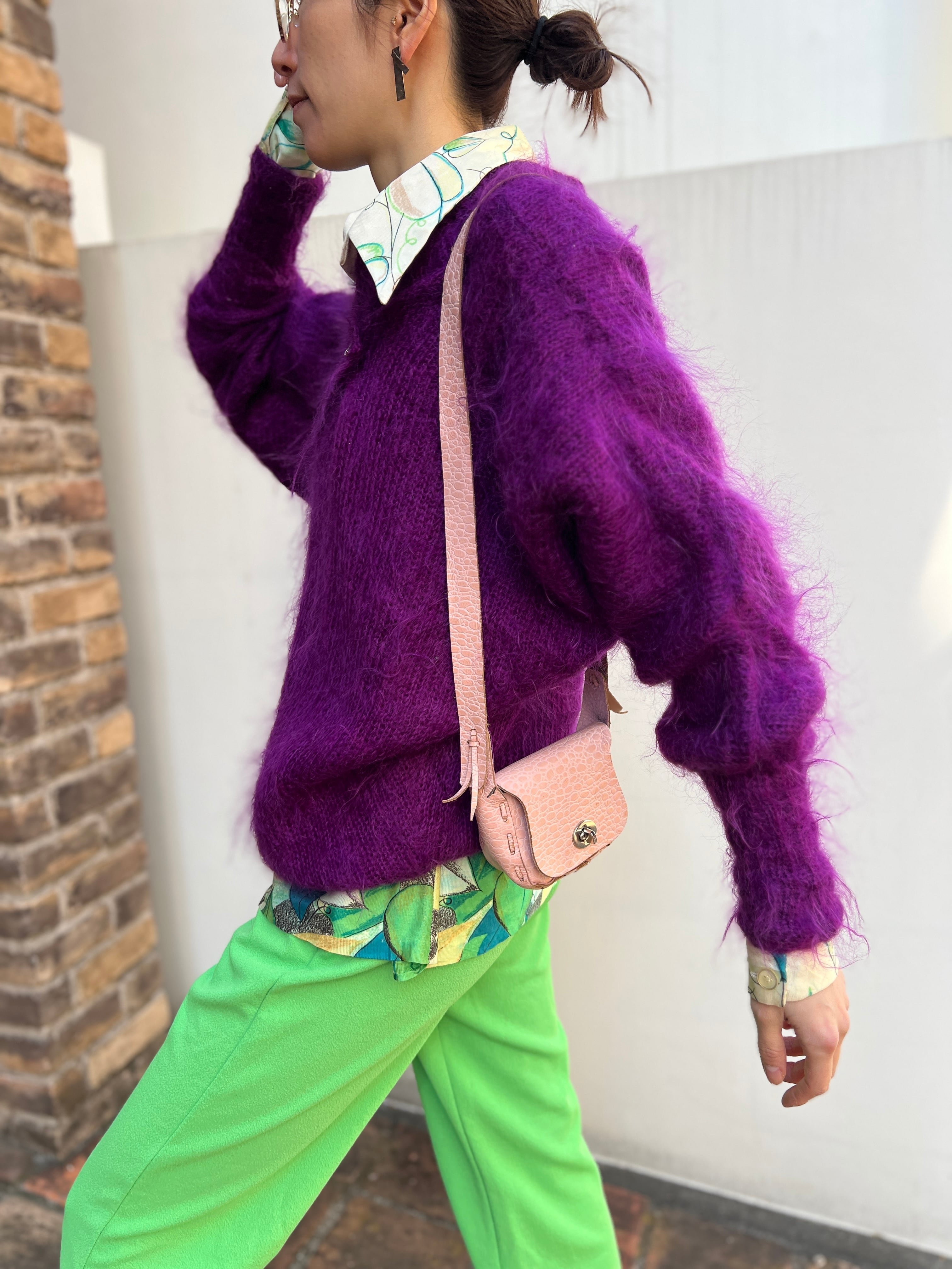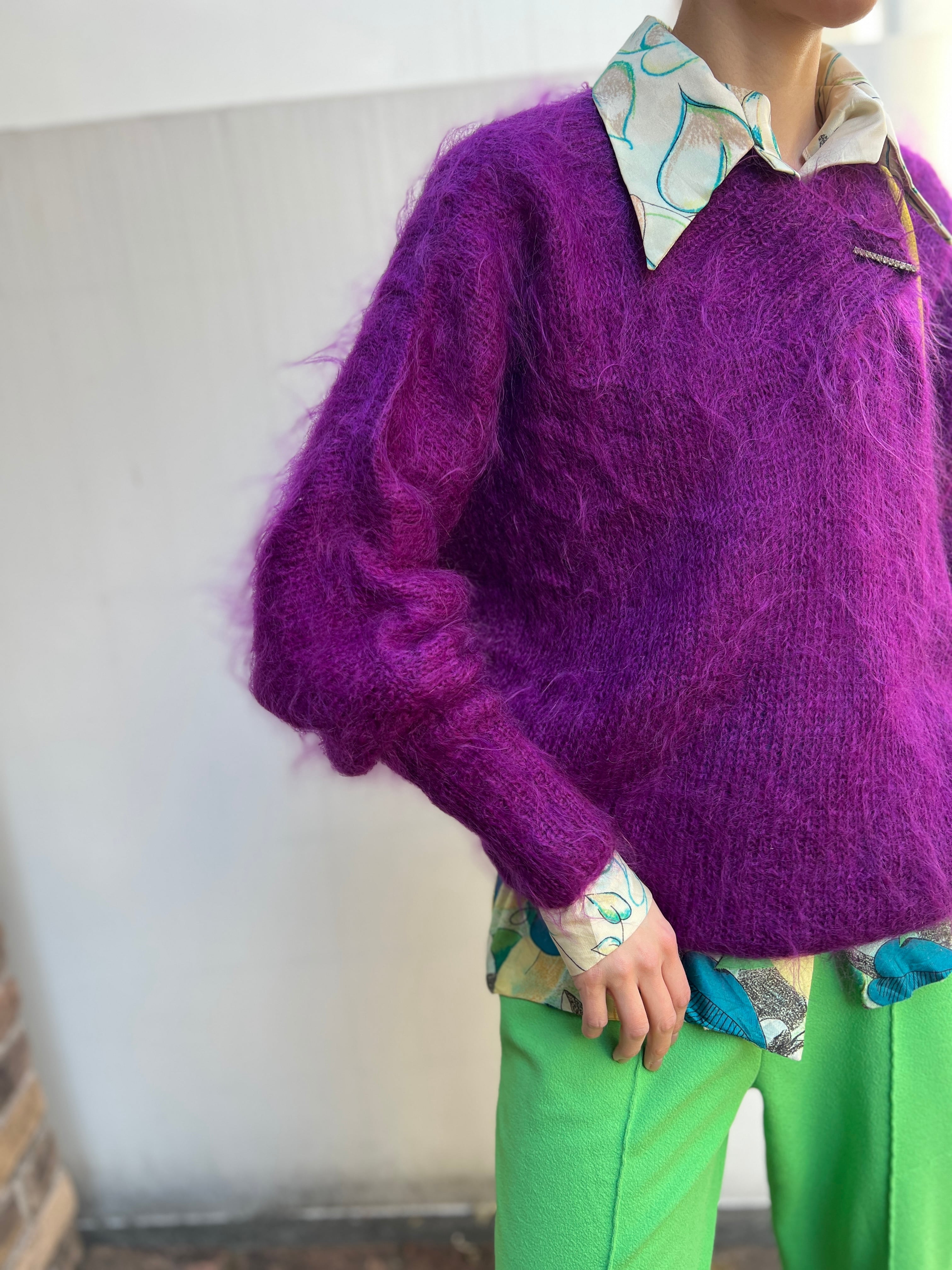 鮮やかで深みのあるパープルカラーが目を惹く、ヴィンテージのモヘア混ニットトップス。