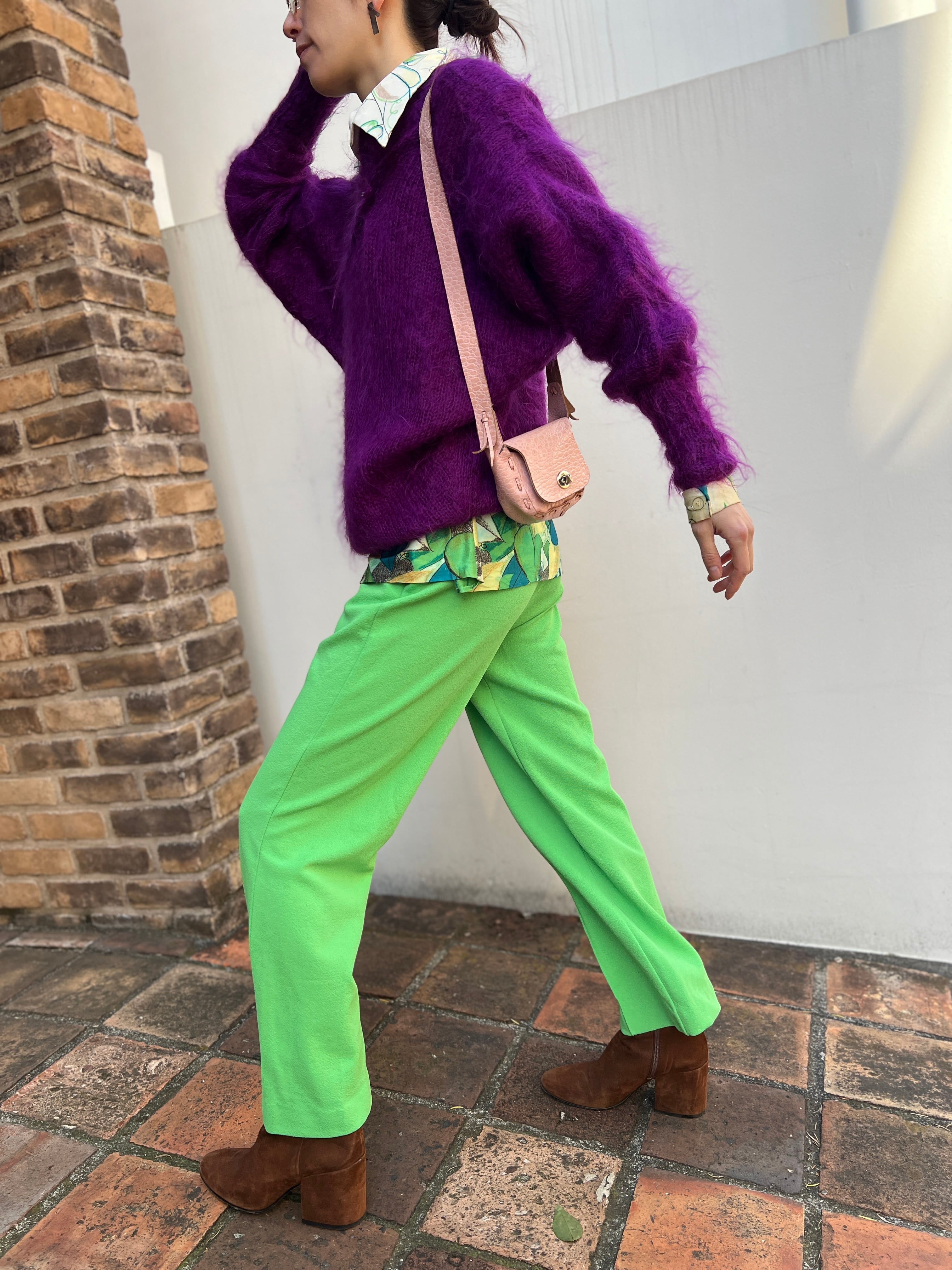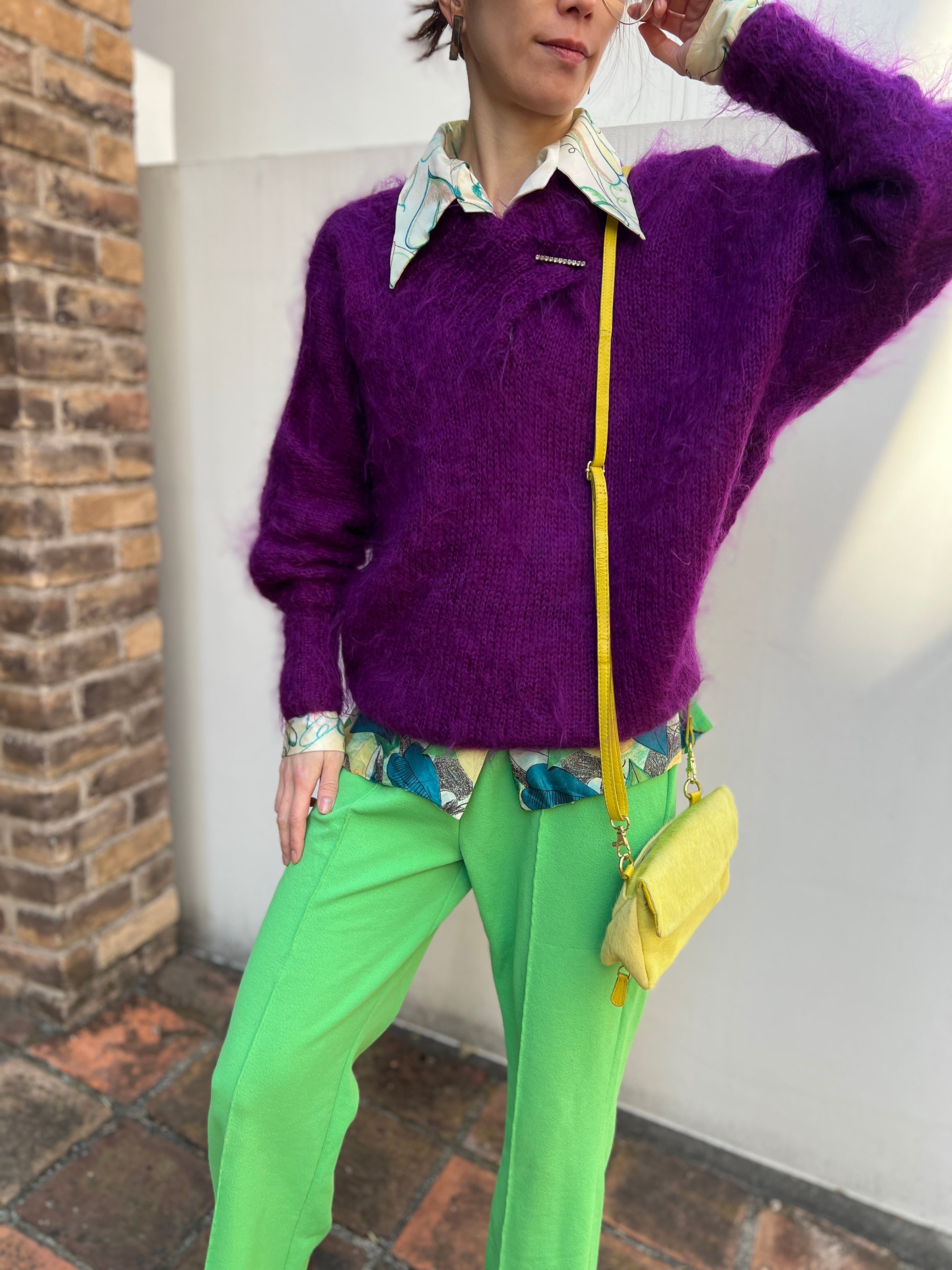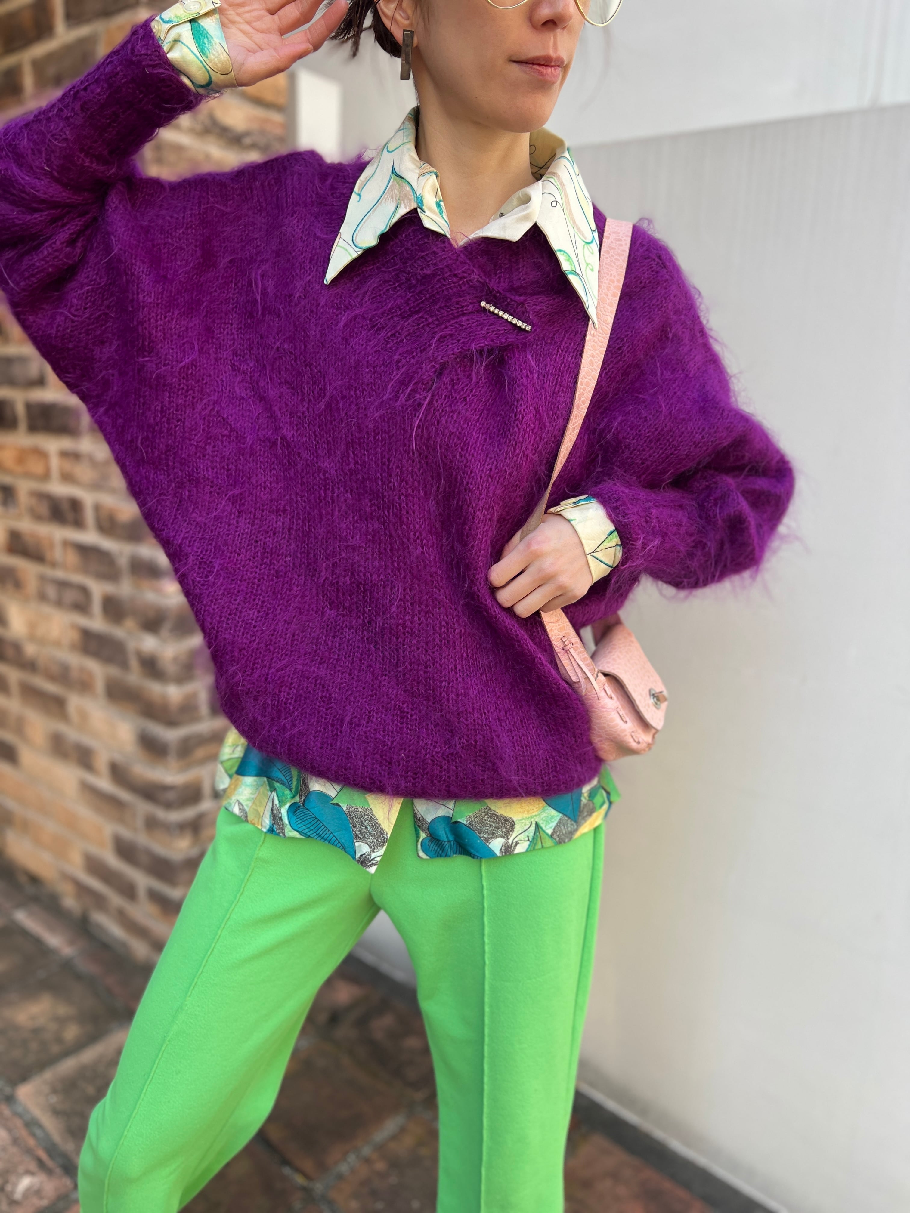 鮮やかで深みのあるパープルカラーが目を惹く、ヴィンテージのモヘア混ニットトップス。