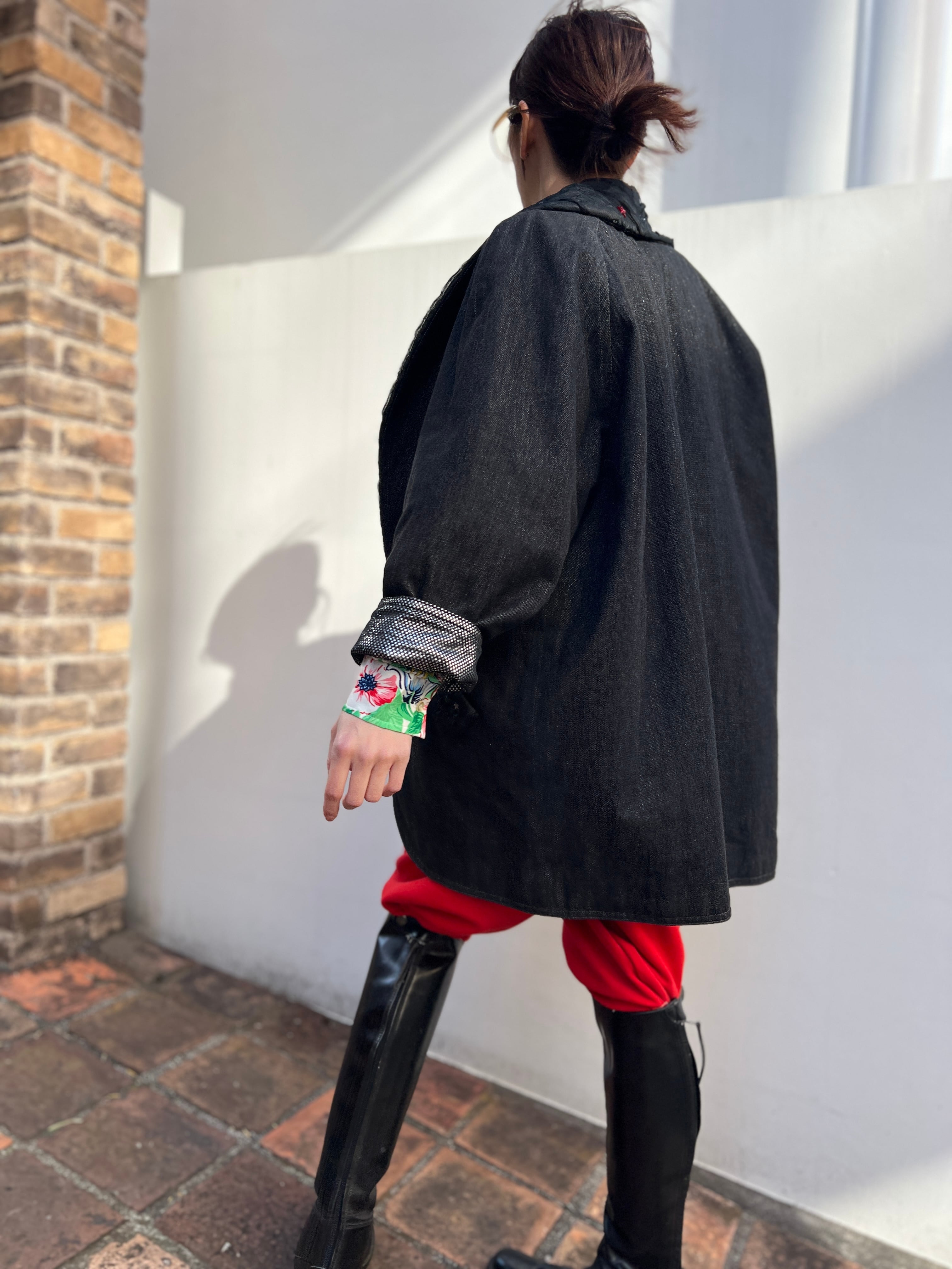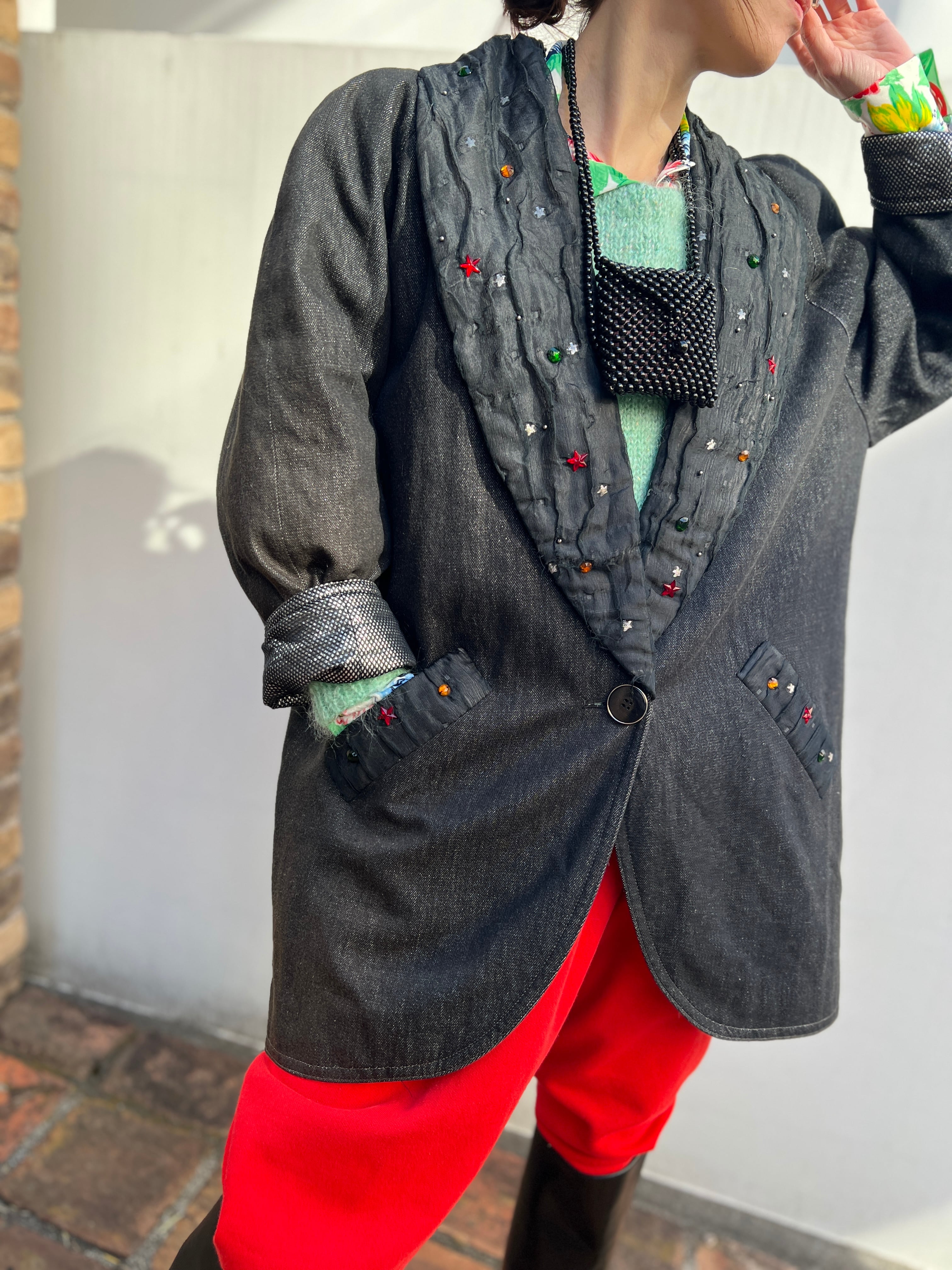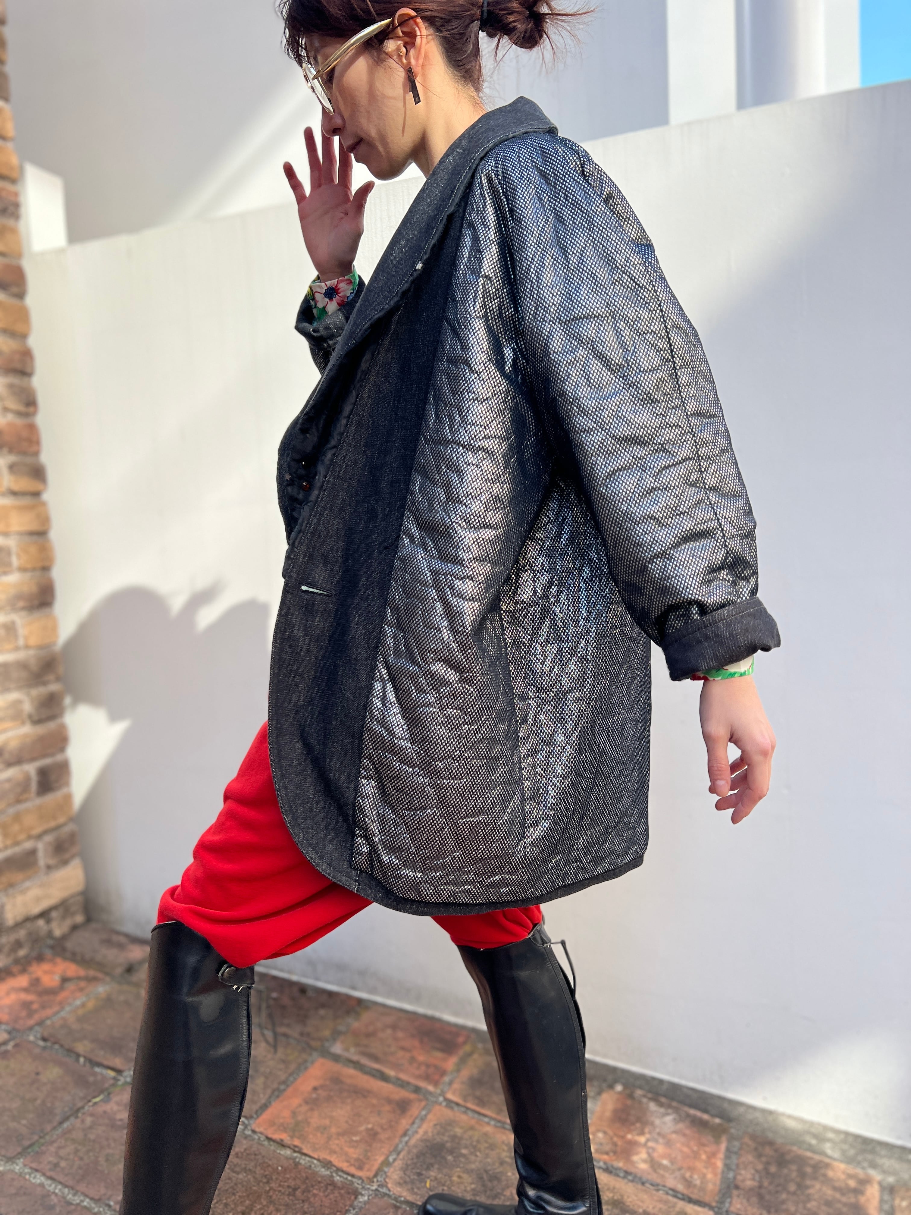 ブラックと裏地のシルバー、異なる質感を重ねたアートピースのような存在感を放つデザインジャケット。