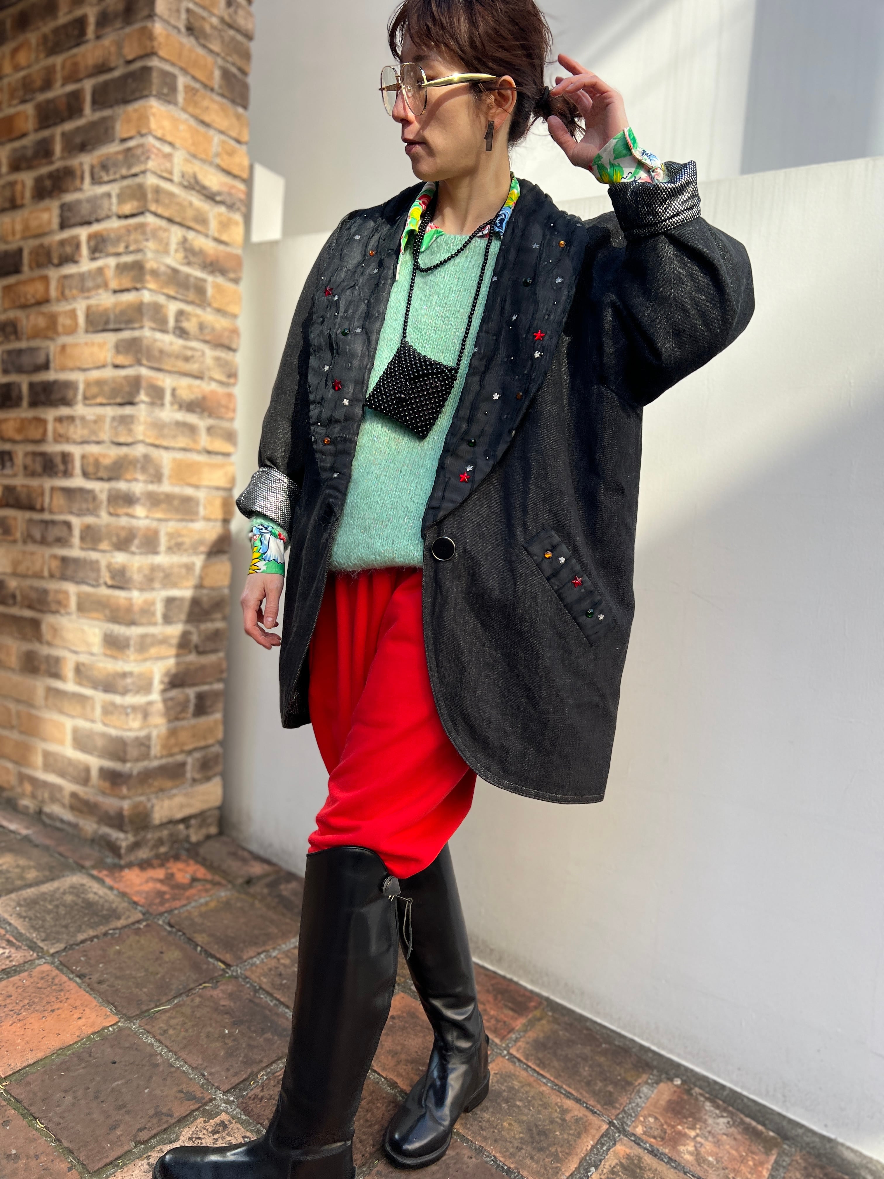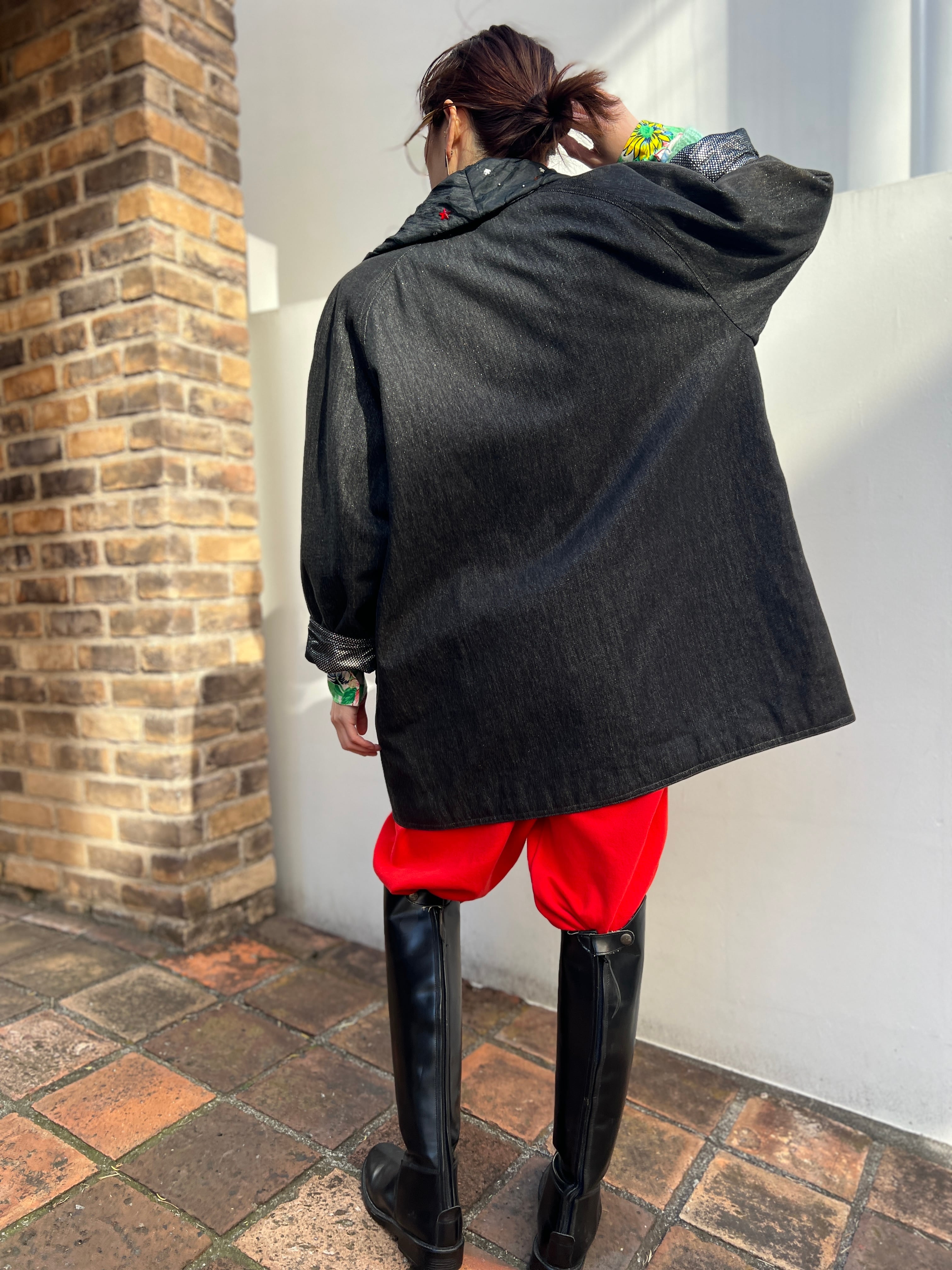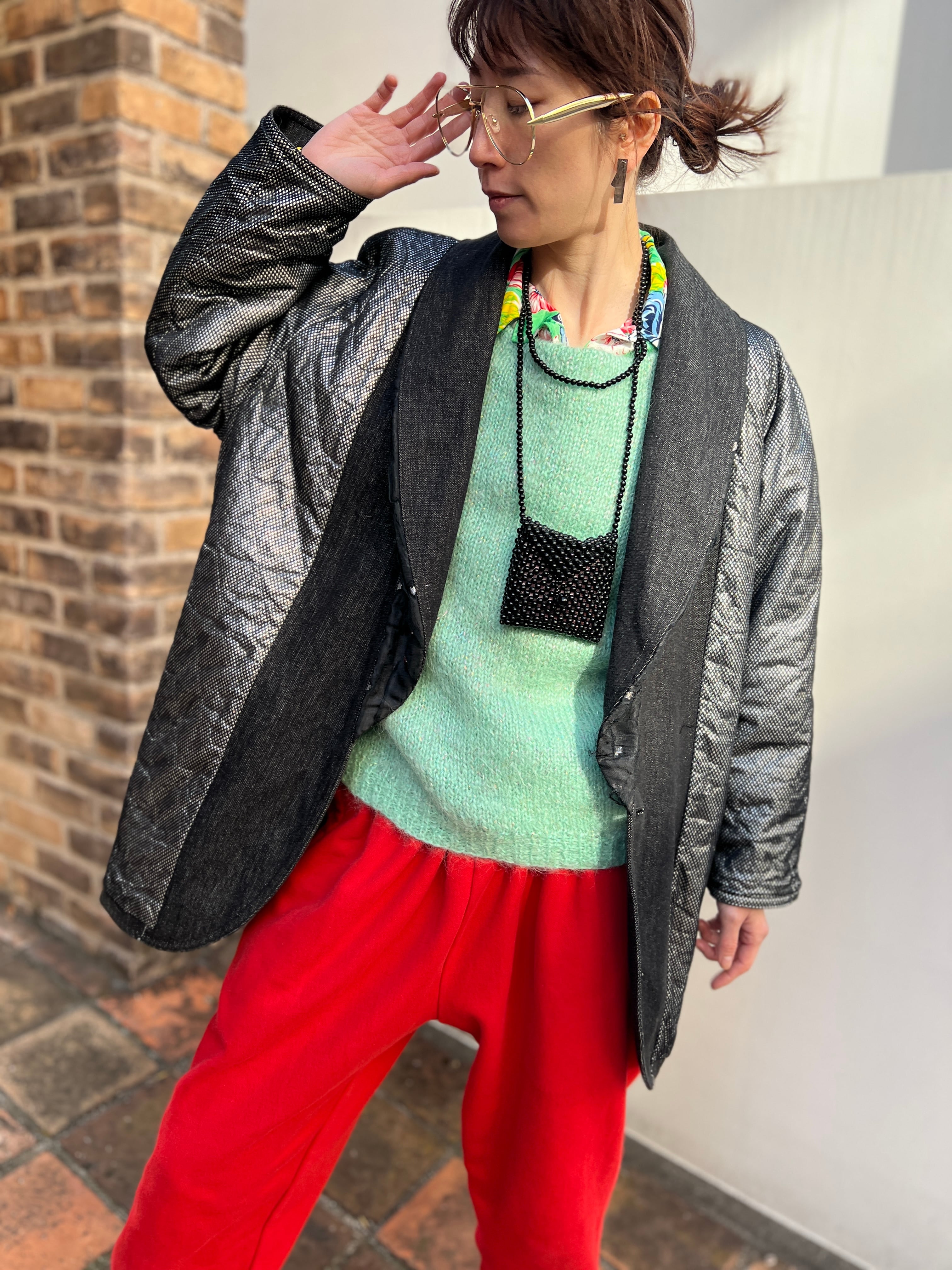 ブラックと裏地のシルバー、異なる質感を重ねたアートピースのような存在感を放つデザインジャケット。