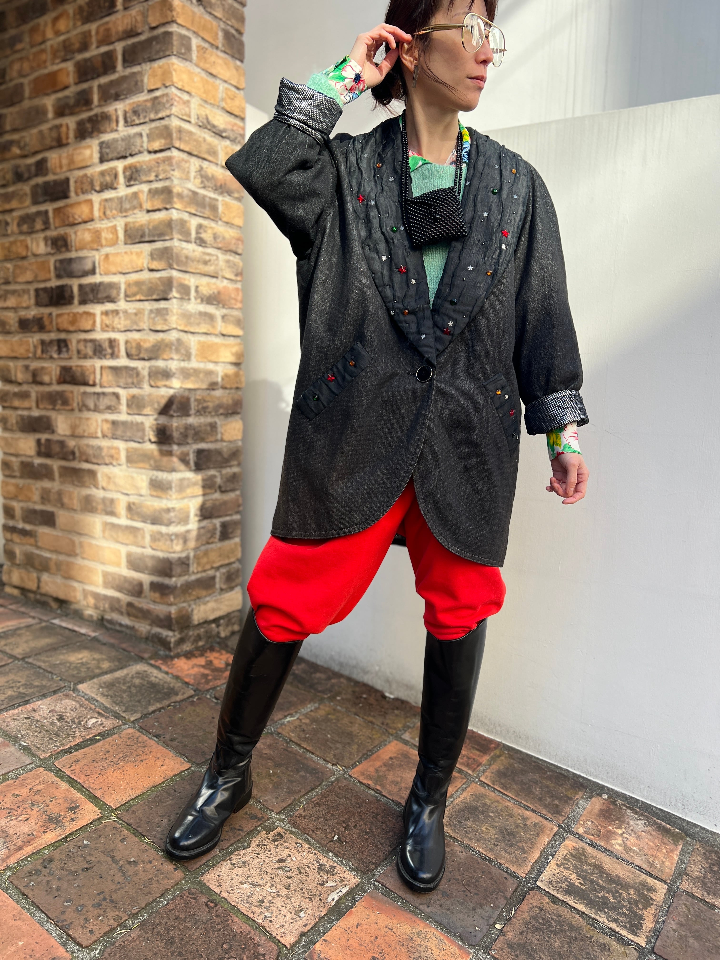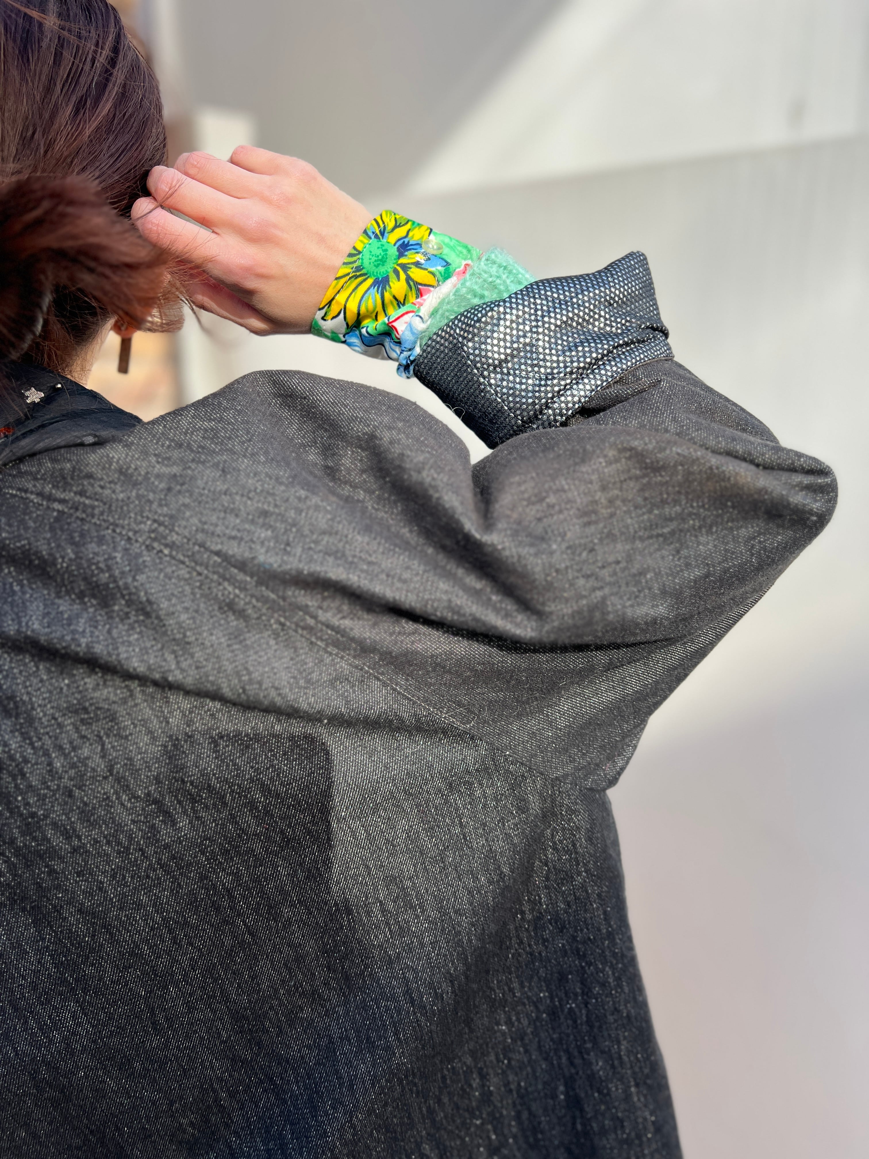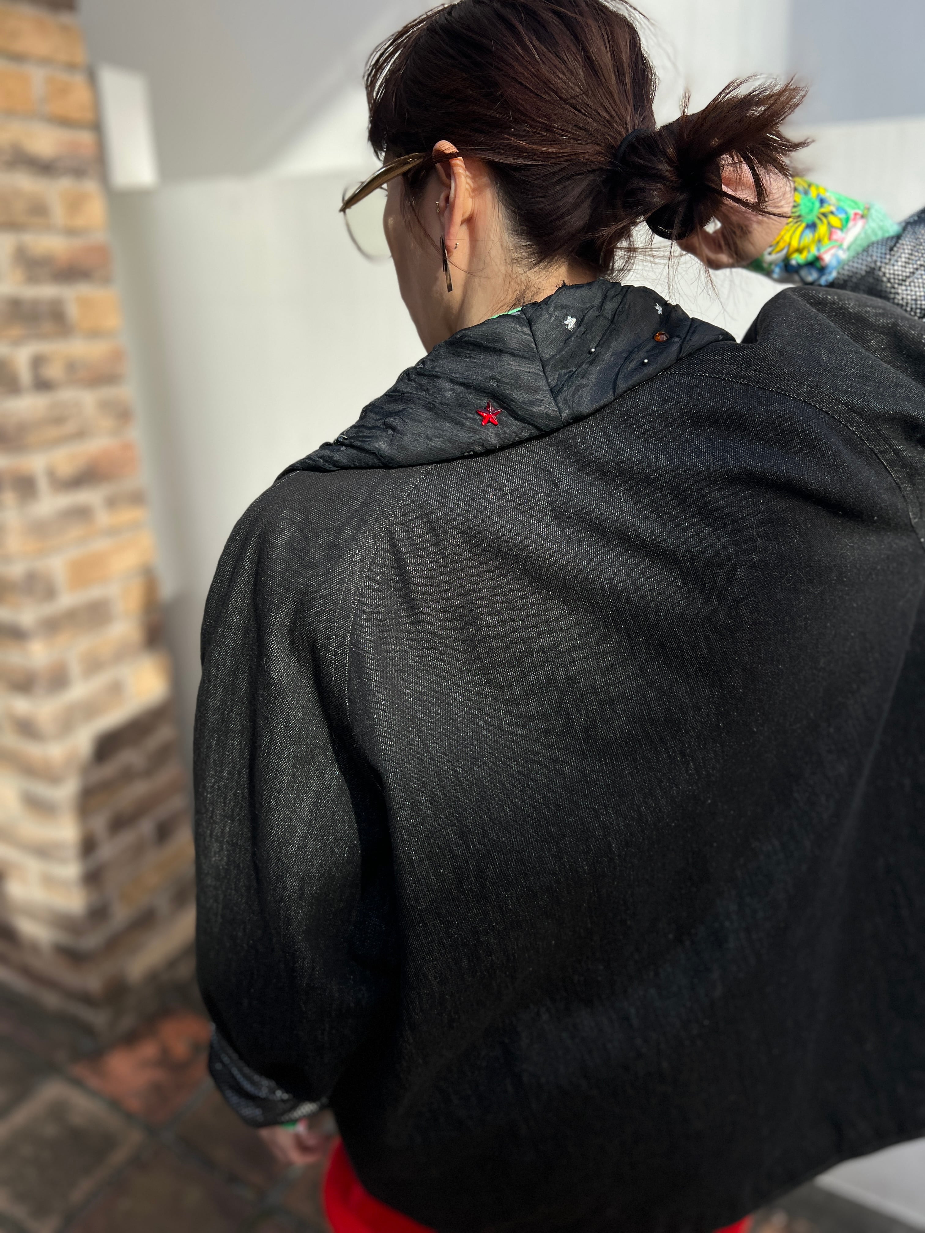 表地はマットブラックデニム生地の少しラメ入り、裏地にはメタリックシルバーのキルティング×オーガンジー素材を使用し、
