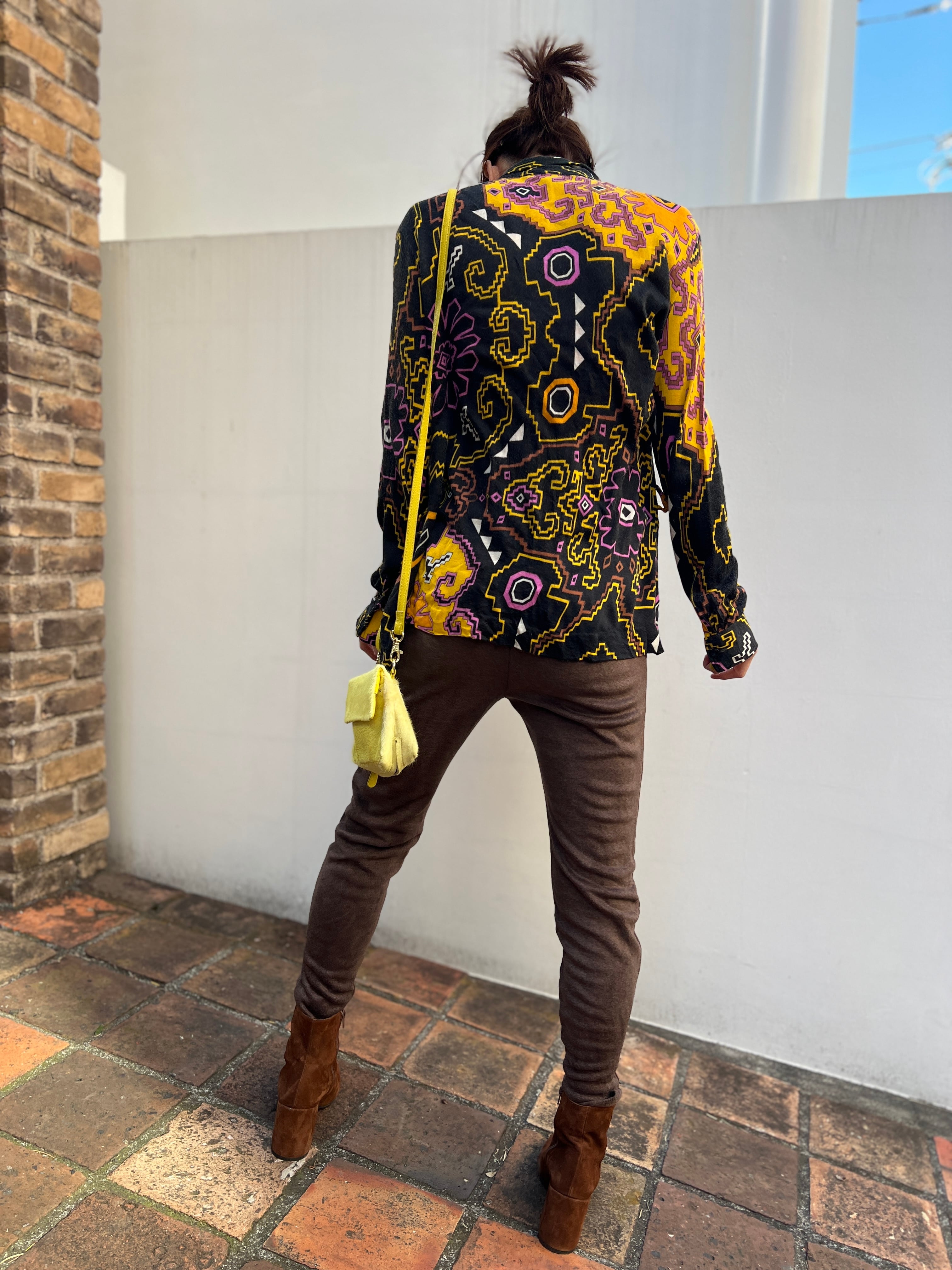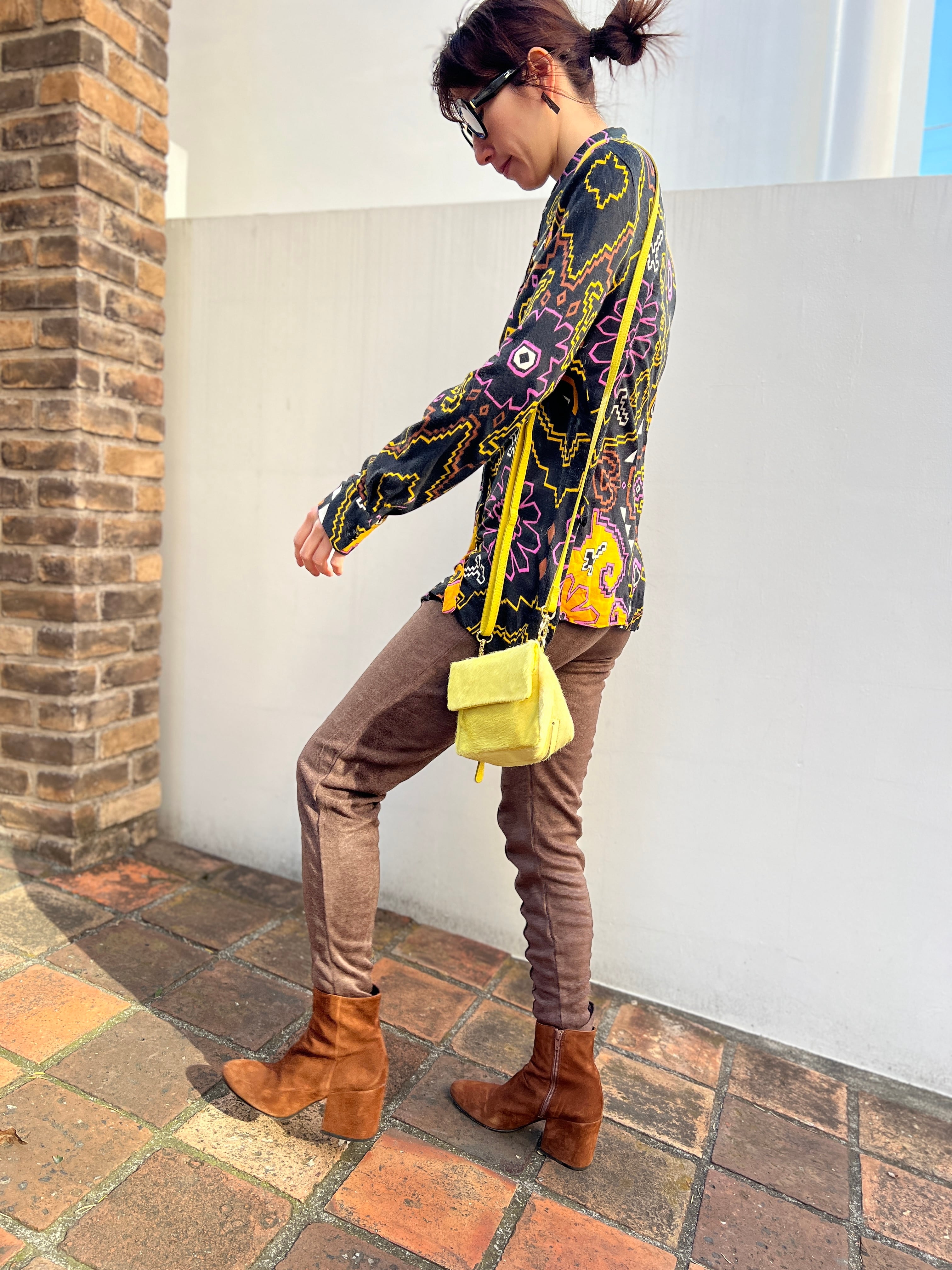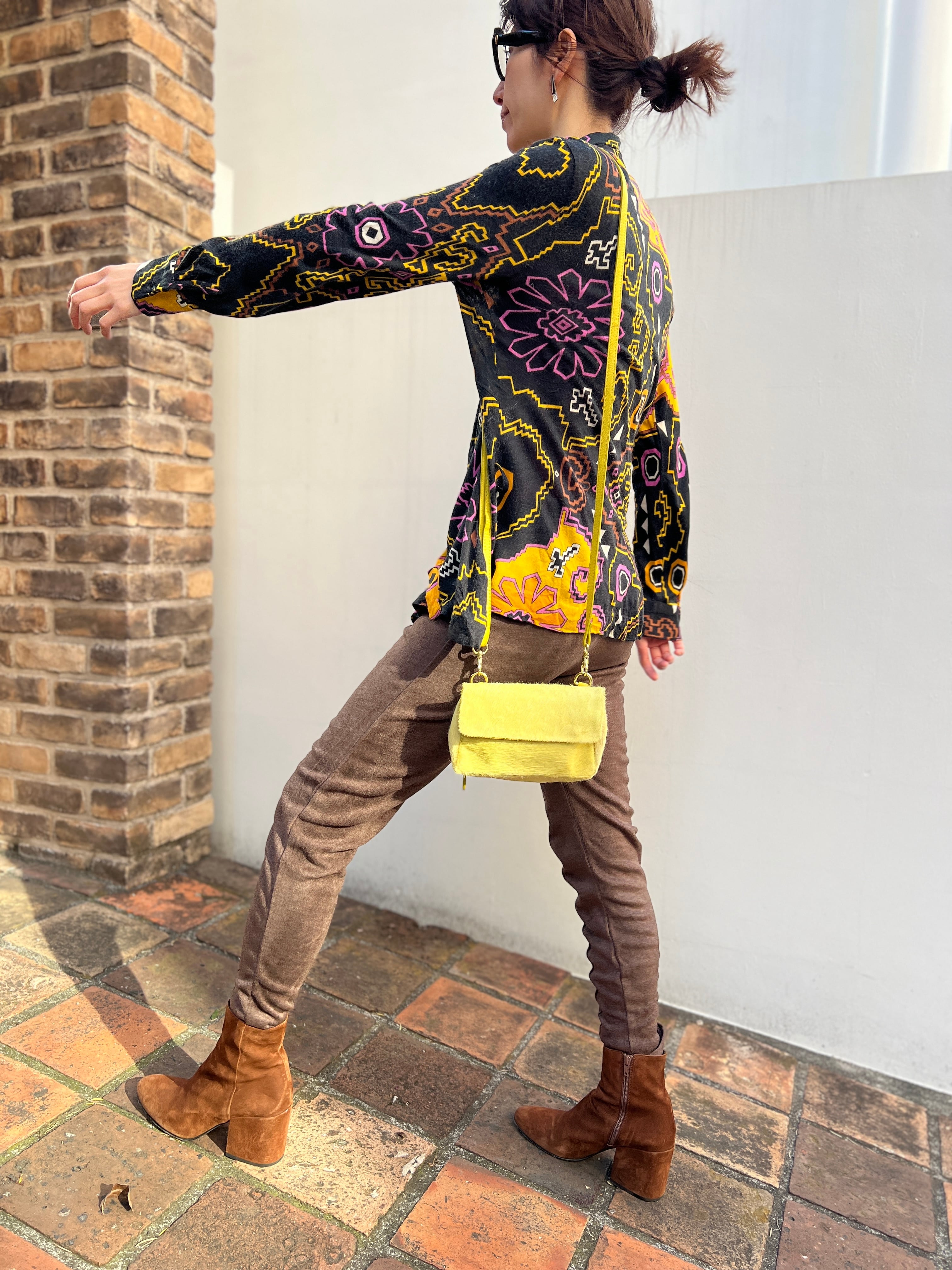 マスタードイエローをベースに、ブラック・ピンク・ブラウンが重なった
