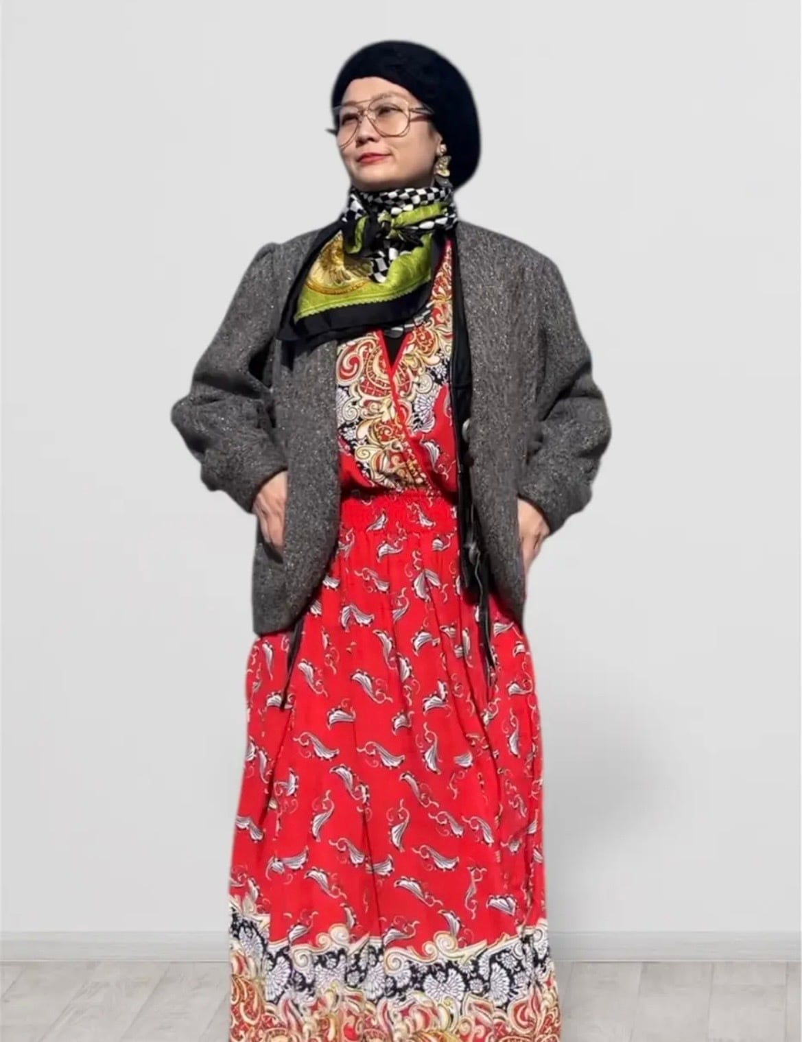 ワンピース、パンツスタイルどちらにも合わせやすい万能さがあります。