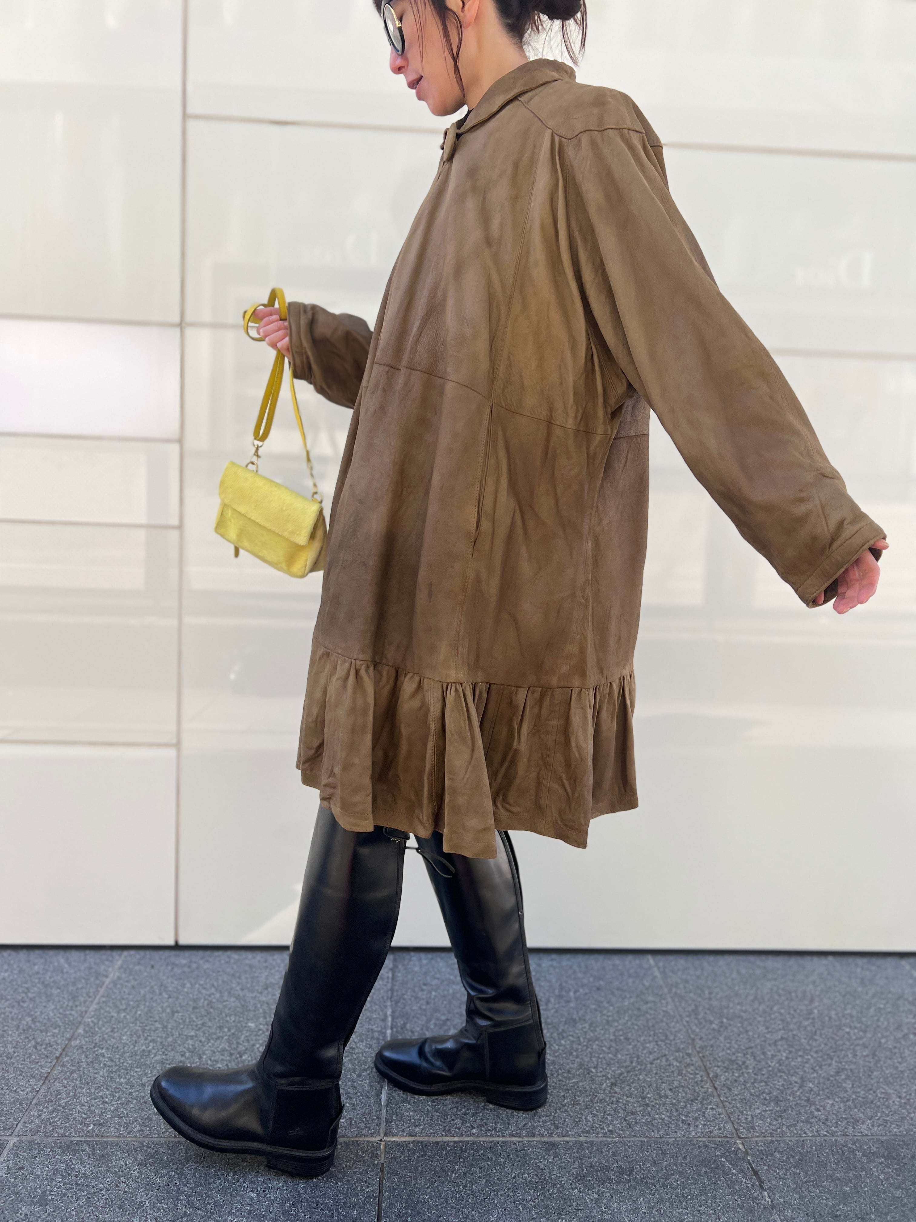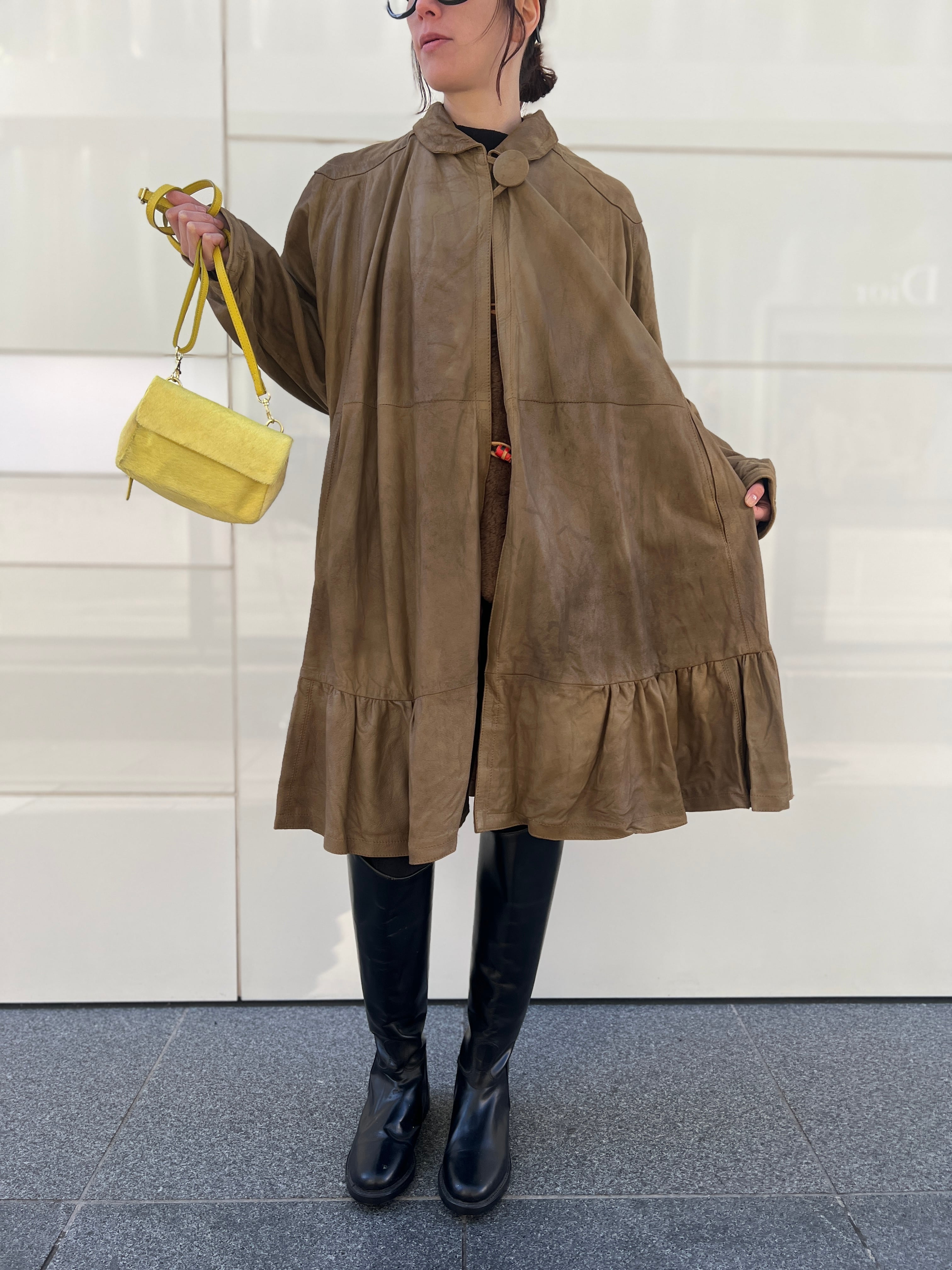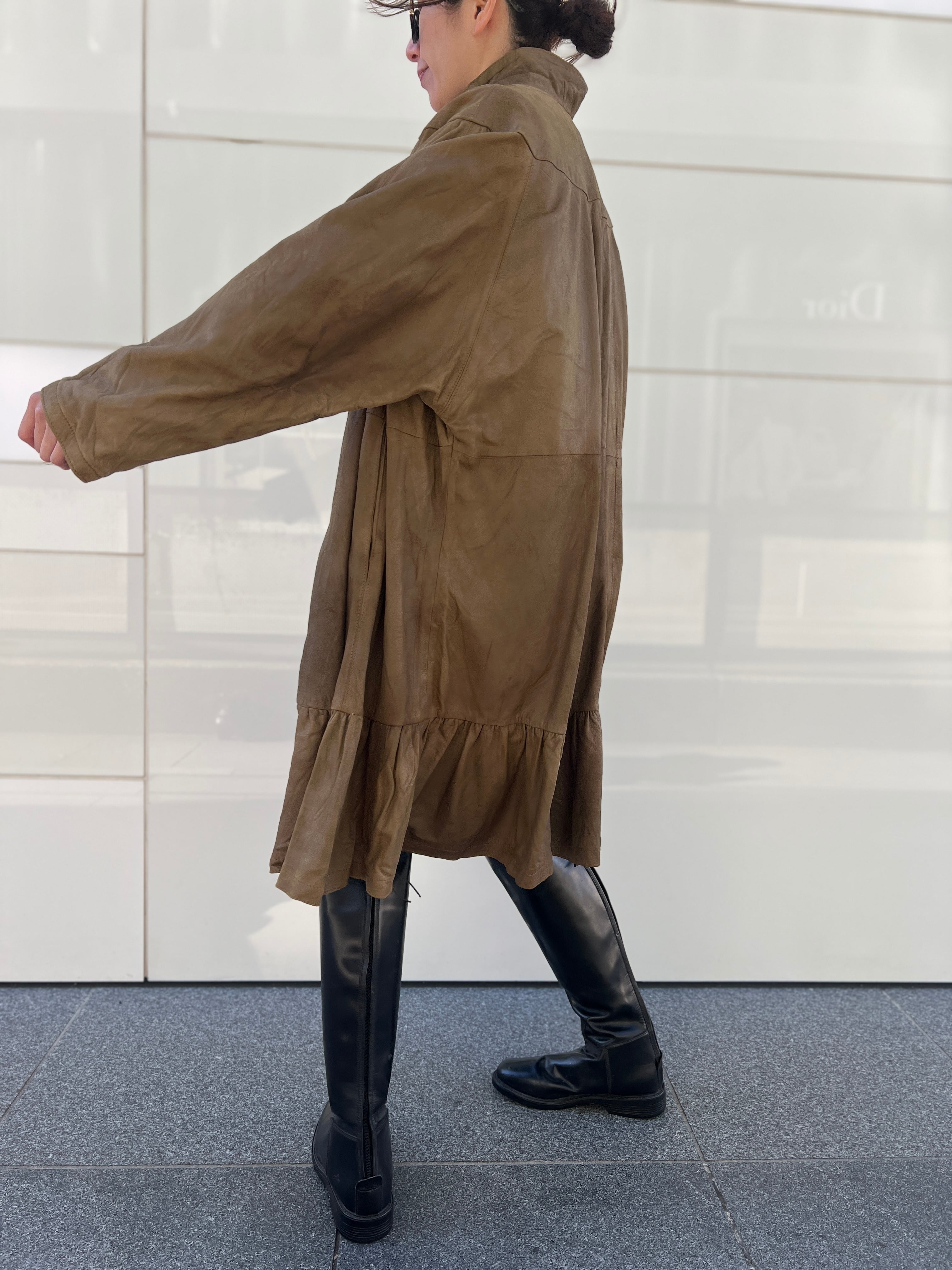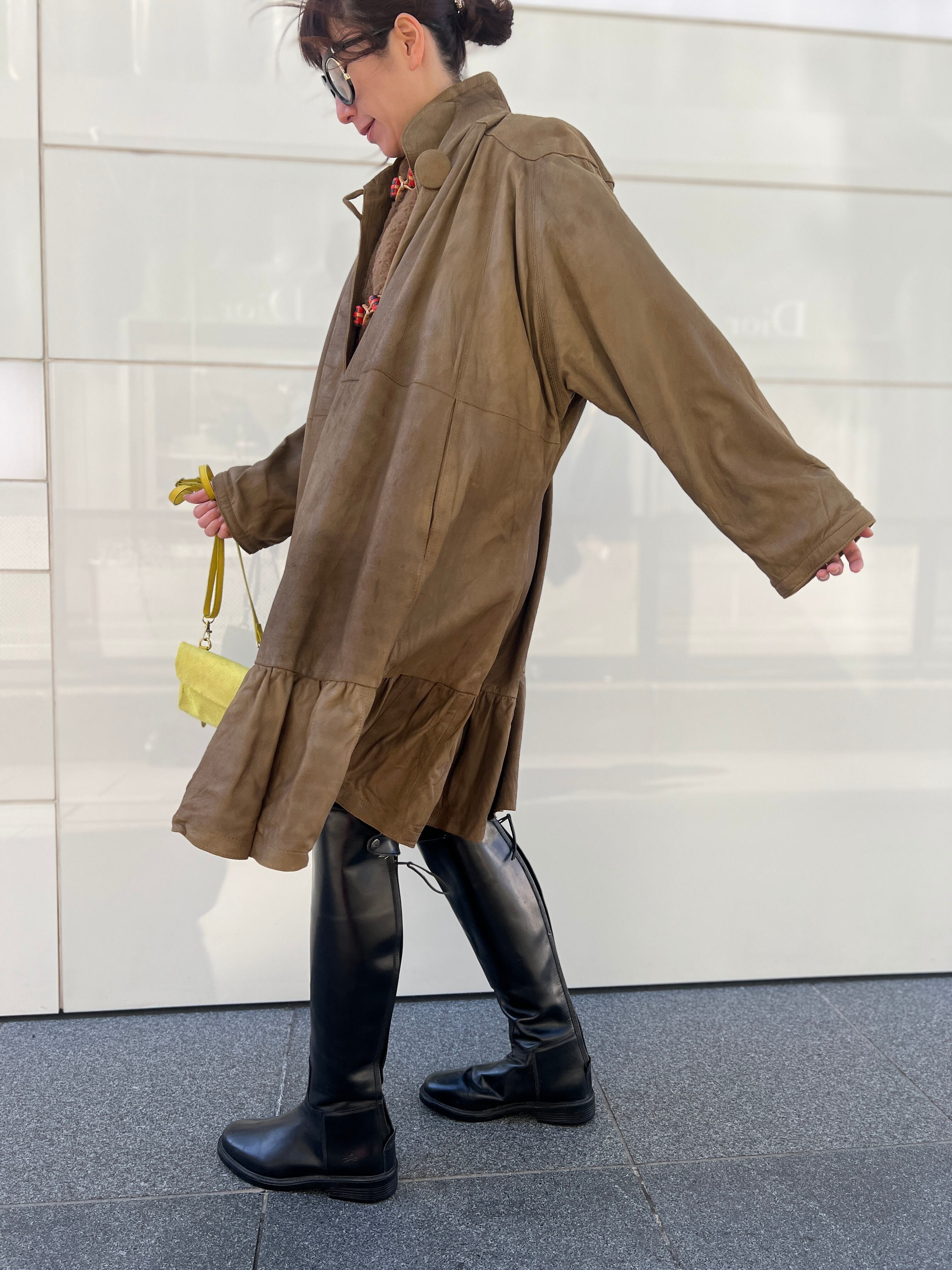 軽やかに揺れるレザーフレアコート。